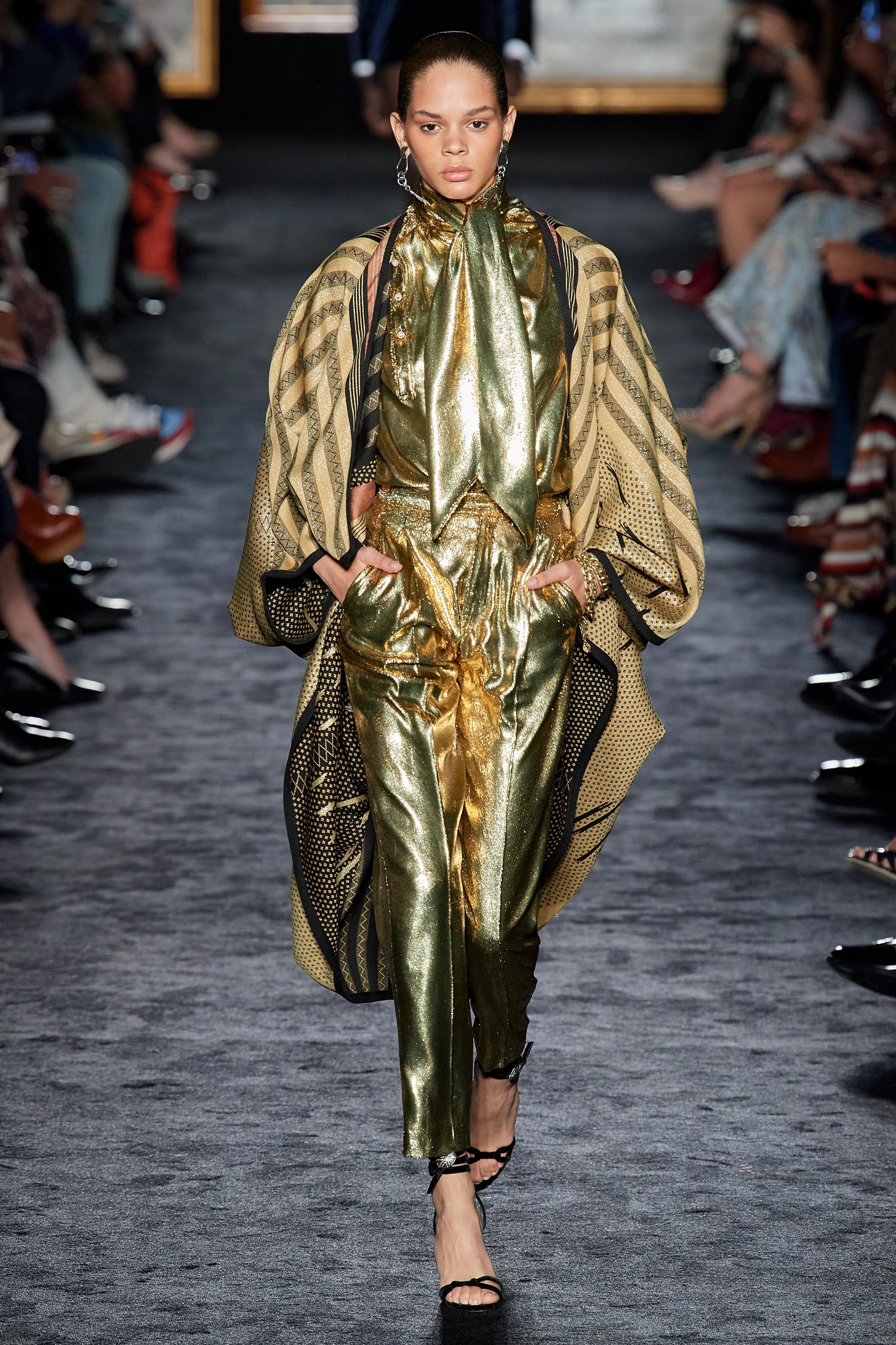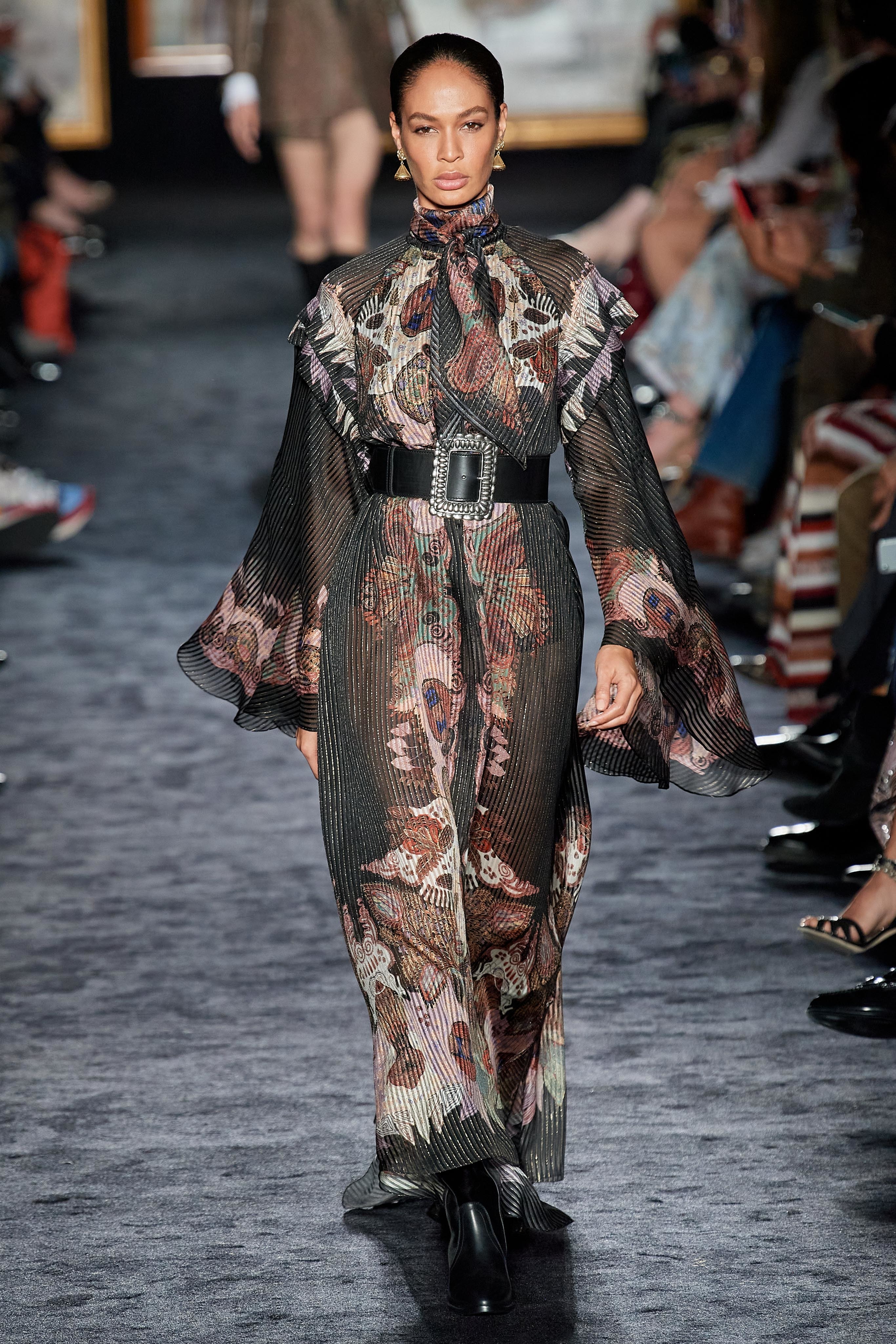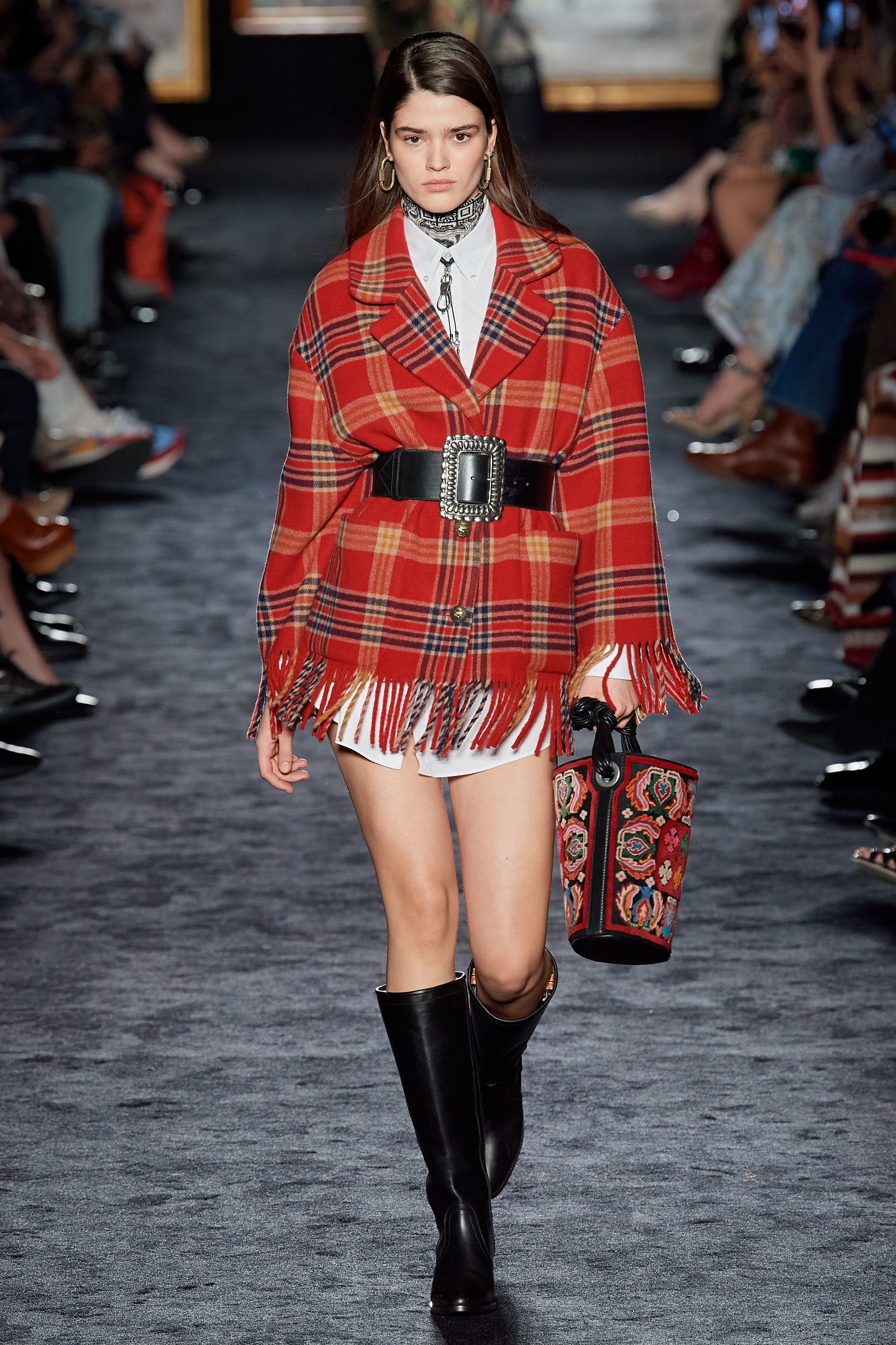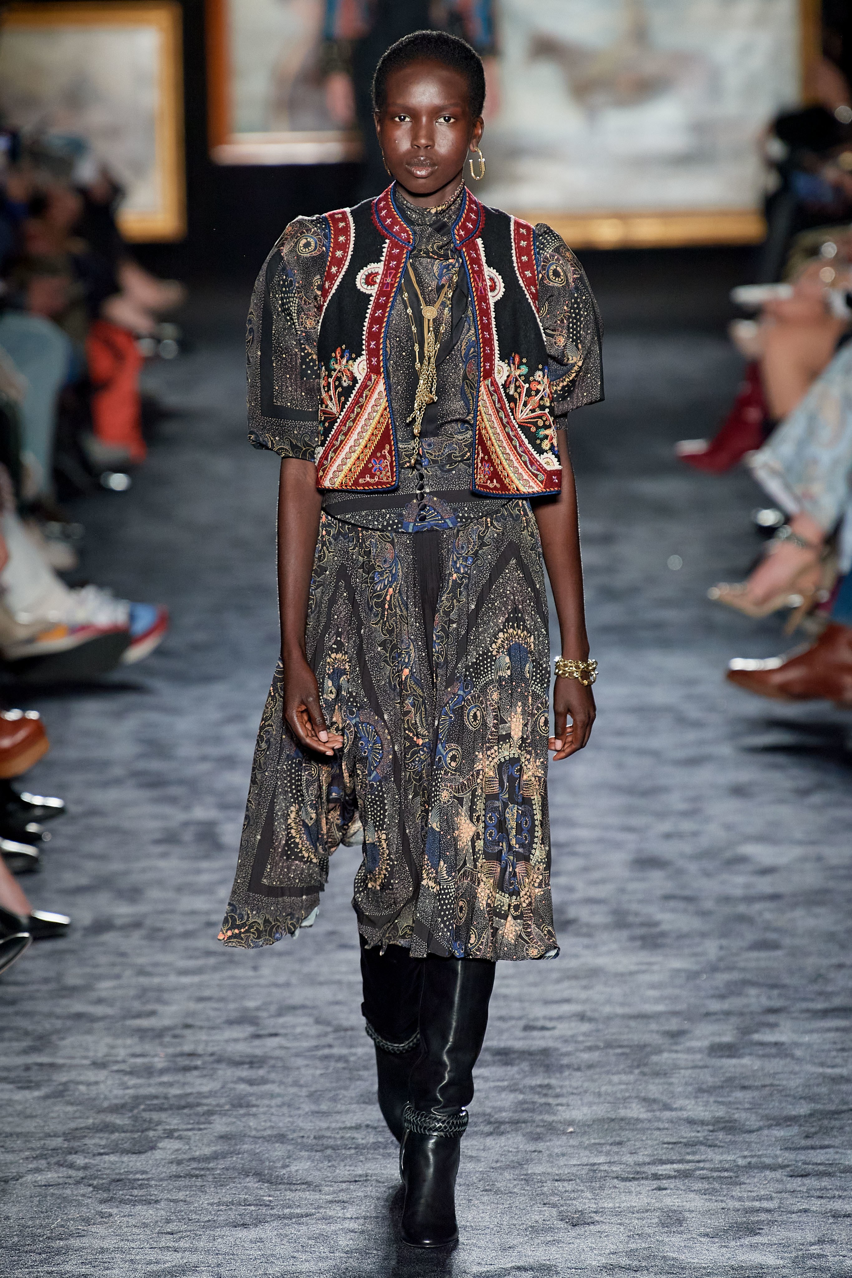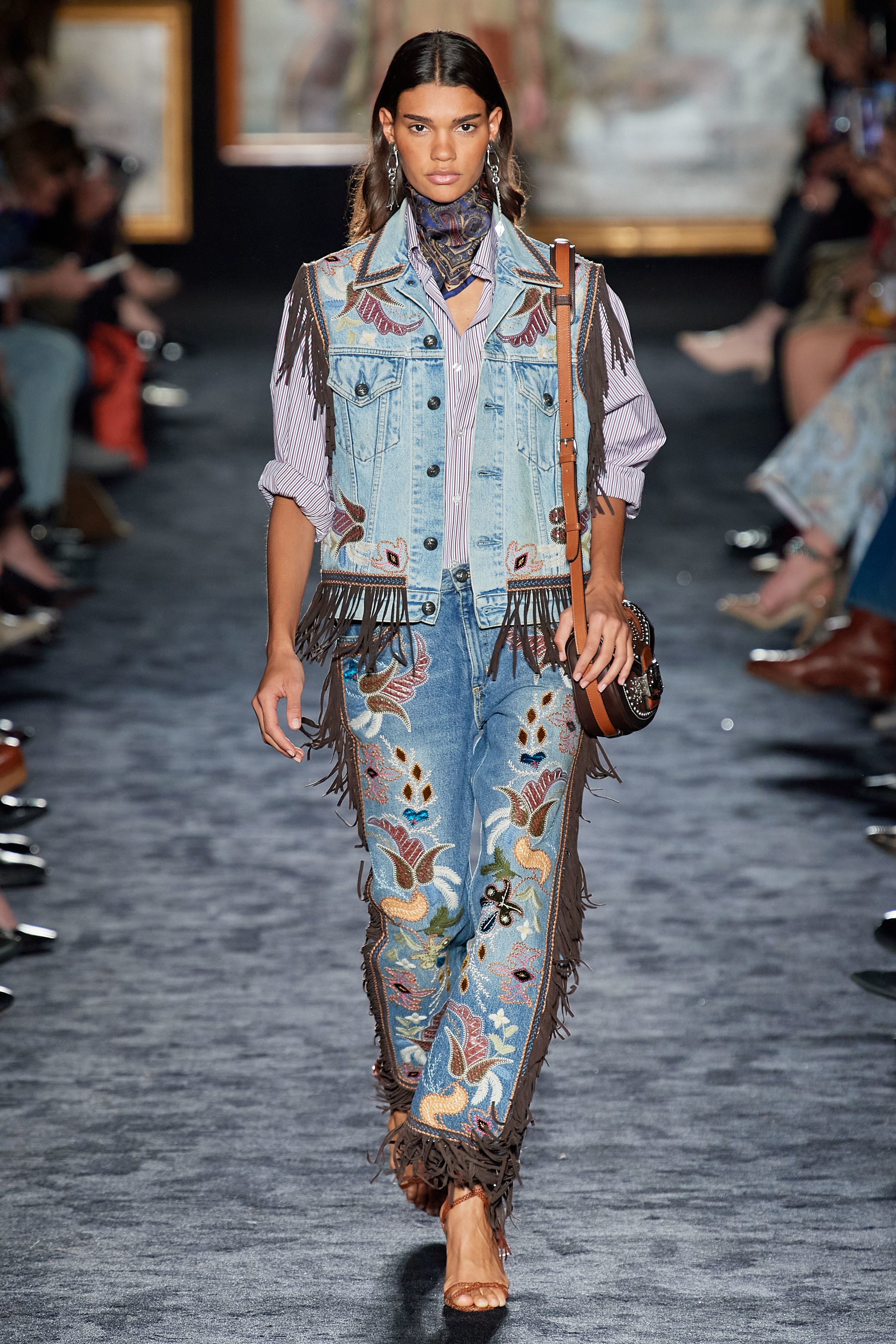 Креативный директор бренда Вероника Этро представила осеннюю коллекцию. Шоу прошло в консерватории Джузеппе Верди. Осень от Etro - это эффектные платья в мексиканском стиле с богатой вышивкой, уютные пончо и элегантные костюмы на манер жокейских. Нежные шёлковые блузы со стойками-бантами можно носить с вязаными жилетами, как показала дизайнер, а брючные костюмы в клетку вместе с нарядным плащом.