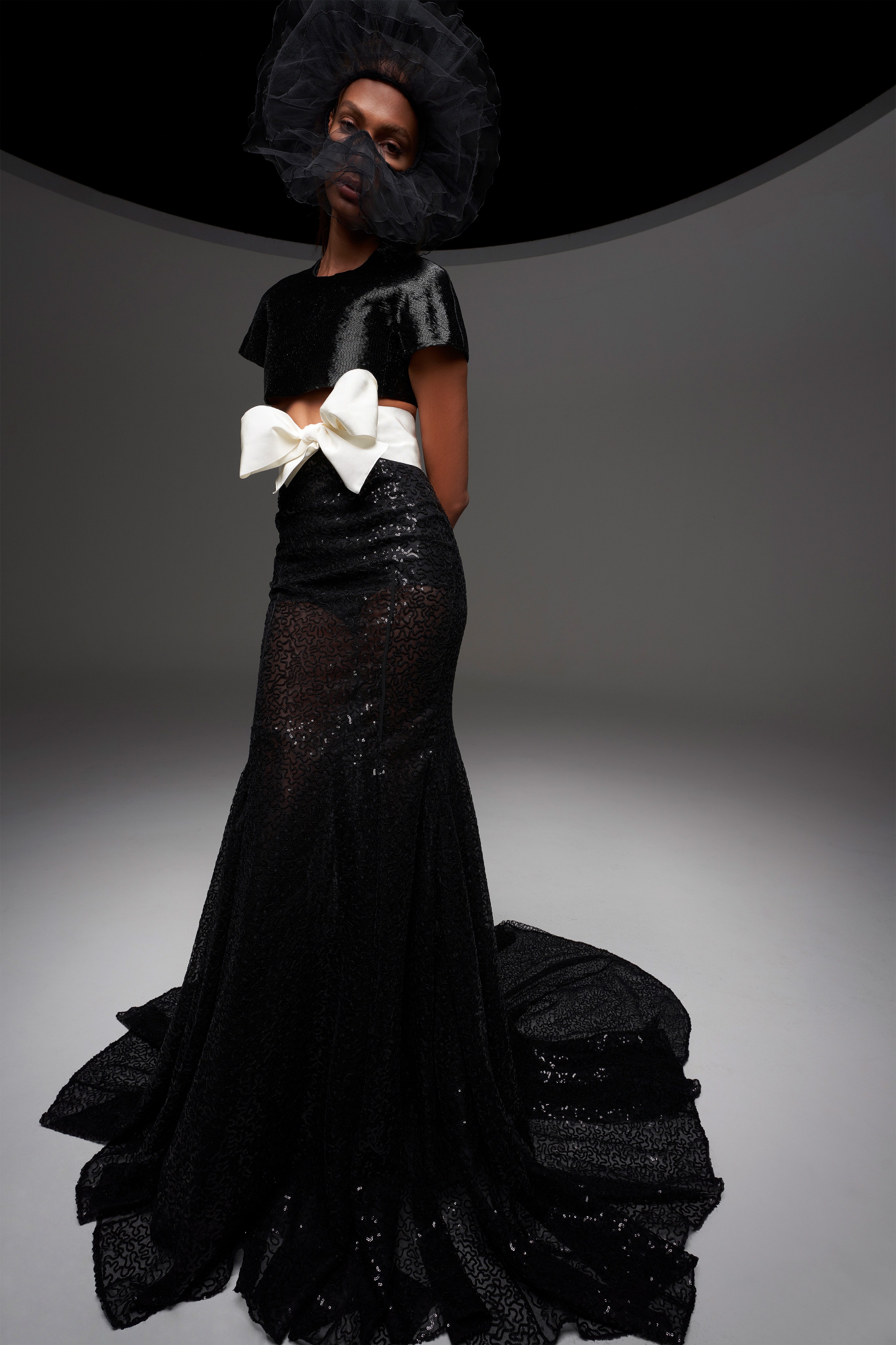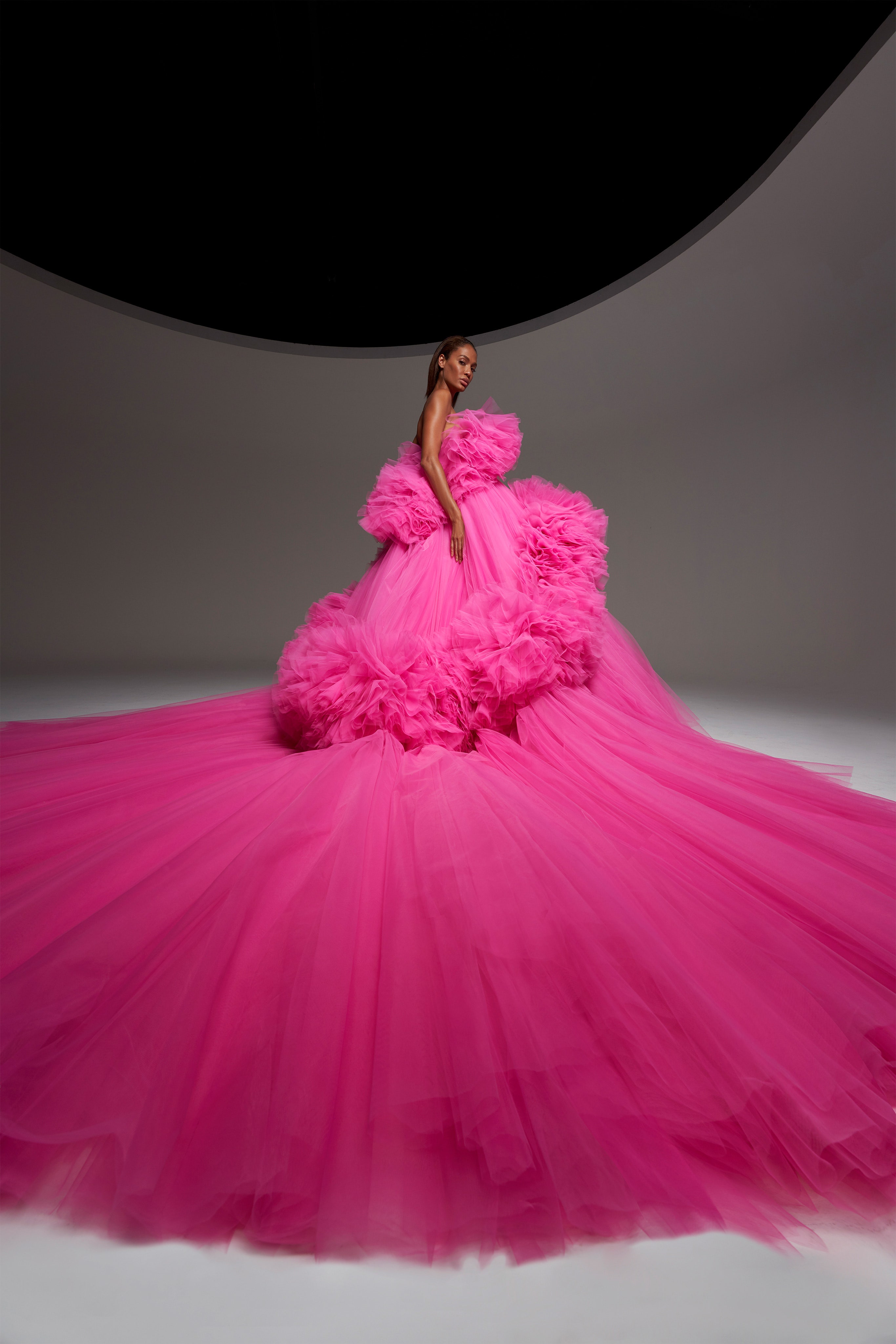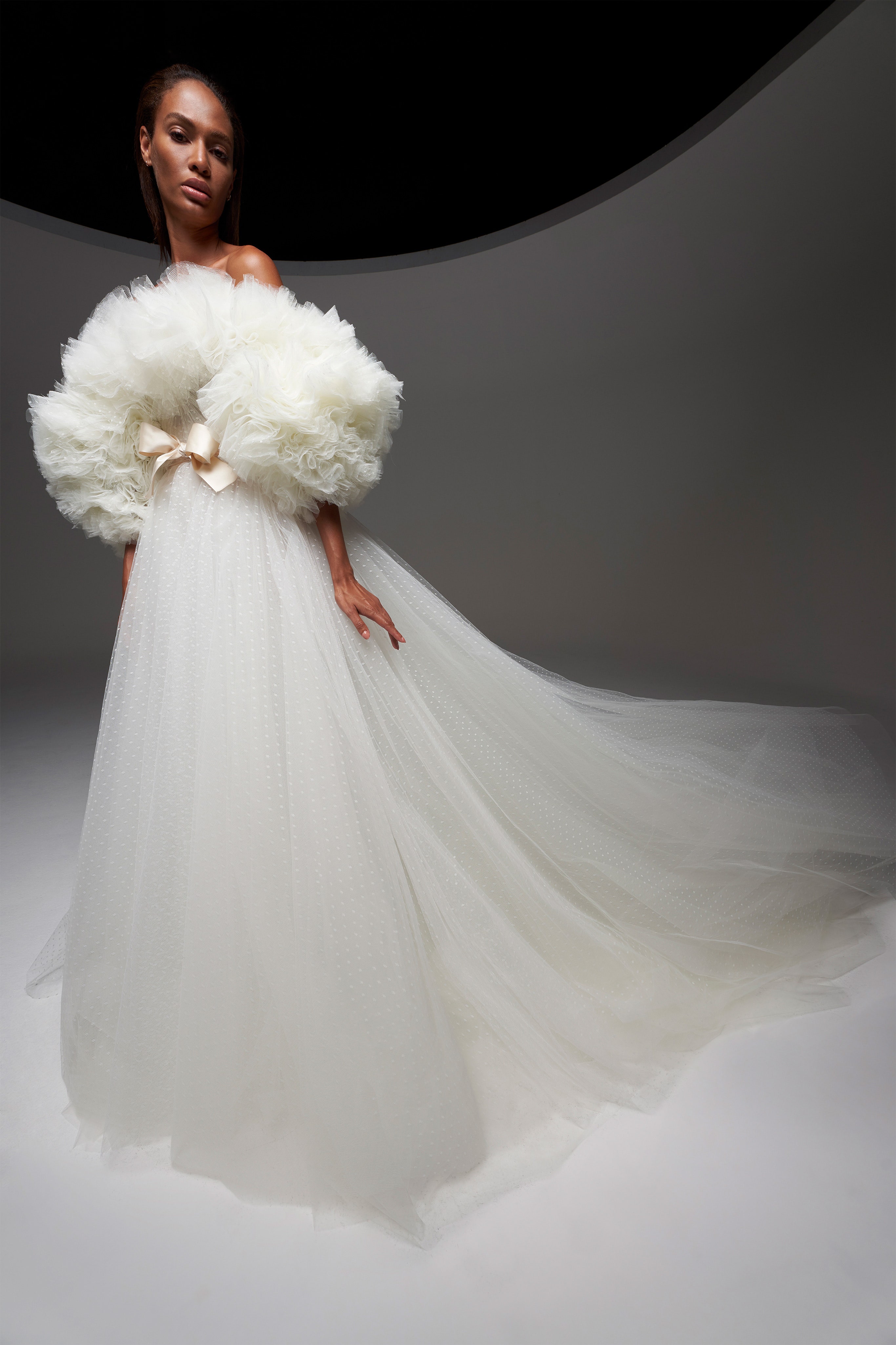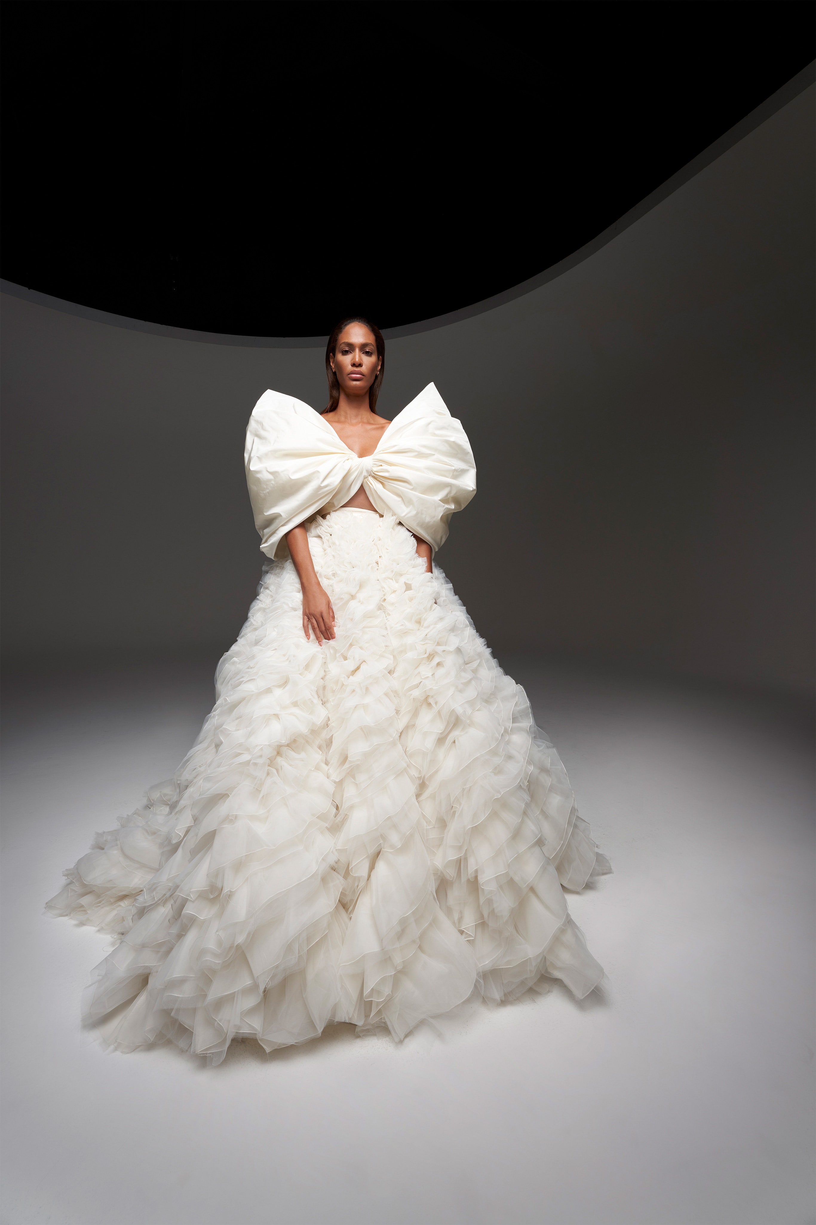 Дизайнер остался верен себе и эстетике бренда: наряды декорированы крупными бантами, шлейфами и элегантными басками.