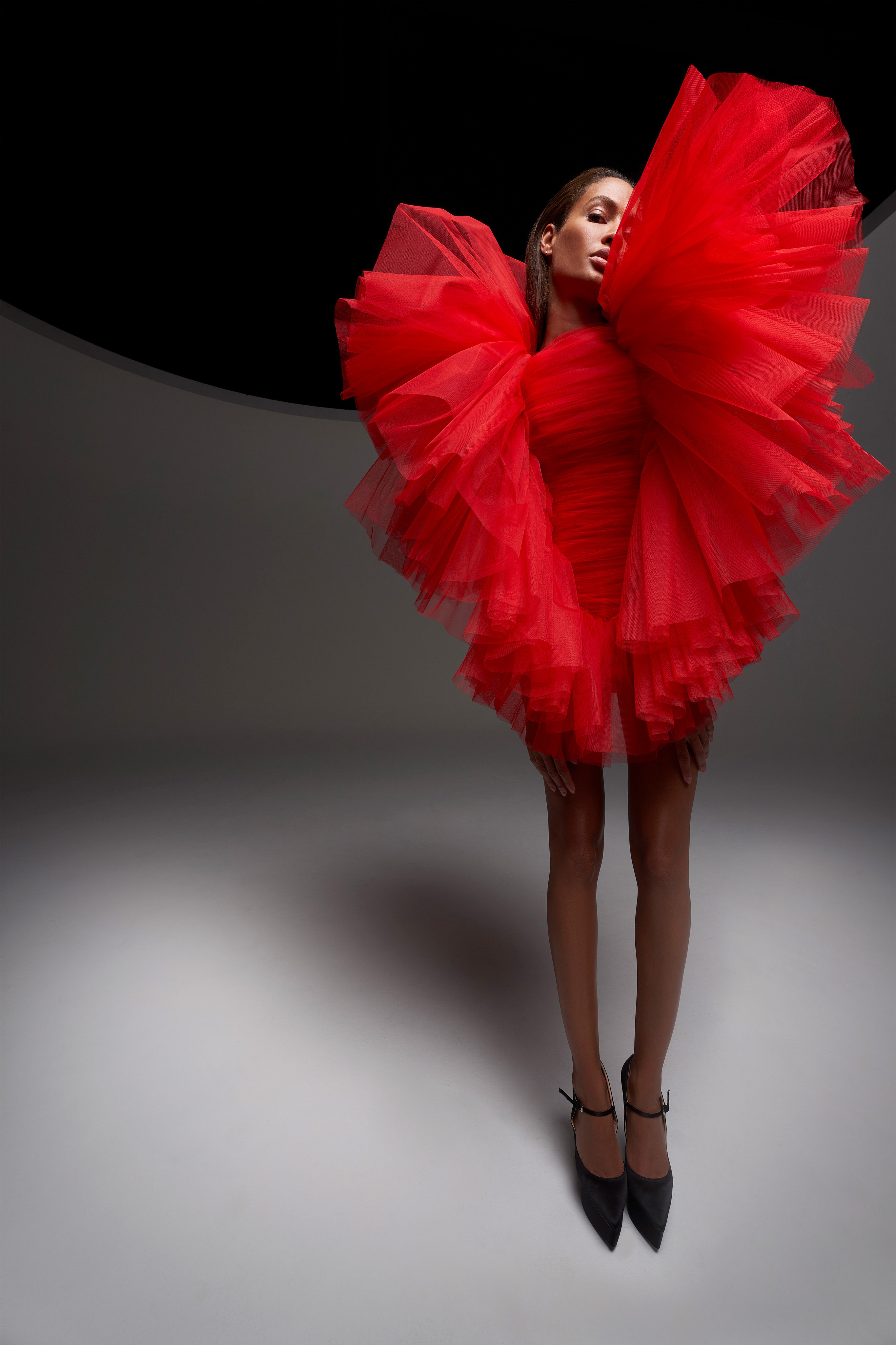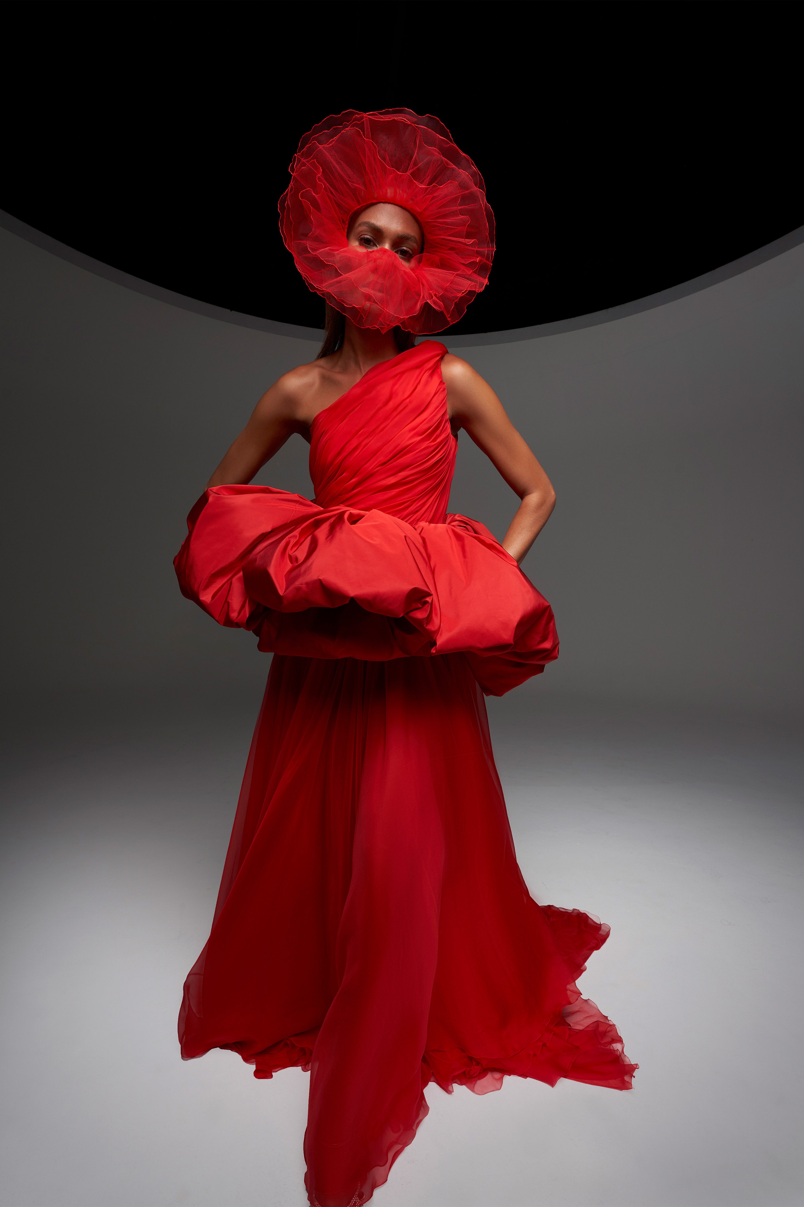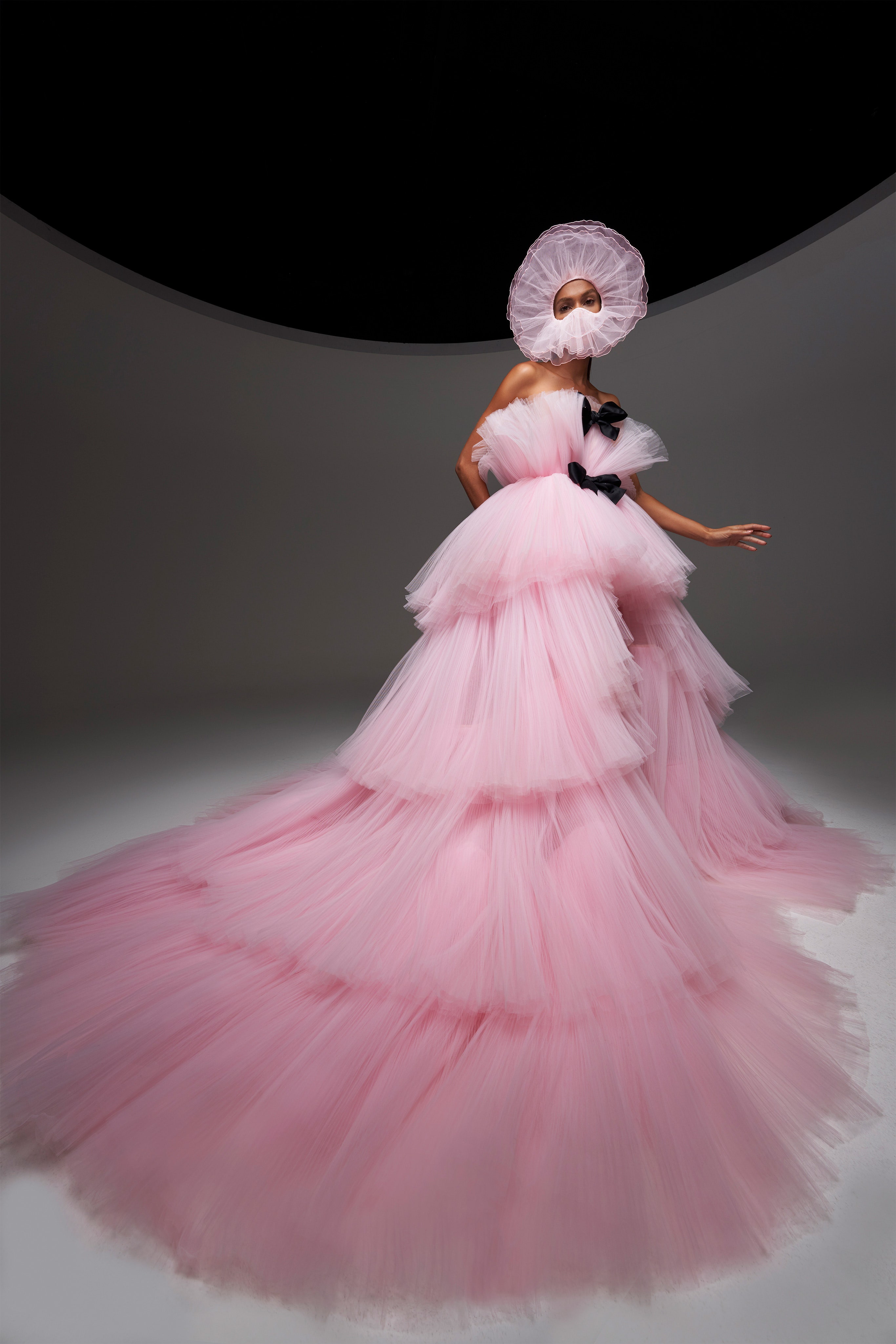 Первый день кутюрной недели закрыл показ дома Giambattista Valli. Демонстрация знаковых для бренда пышных платьев бандо, выполненных в розовых, красных, черном и белом цветах, была дополнена видеорядом с культовыми местами Парижа.