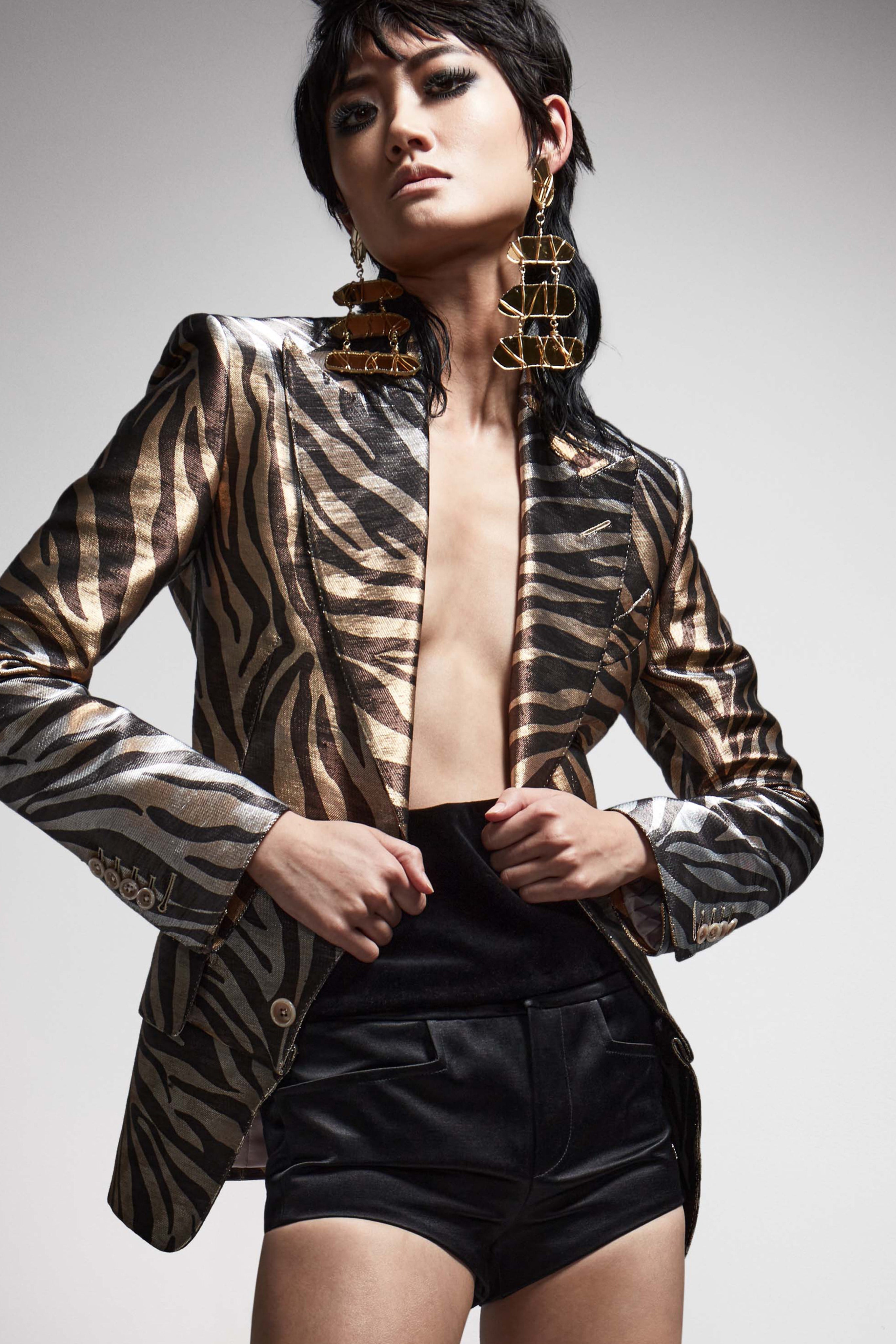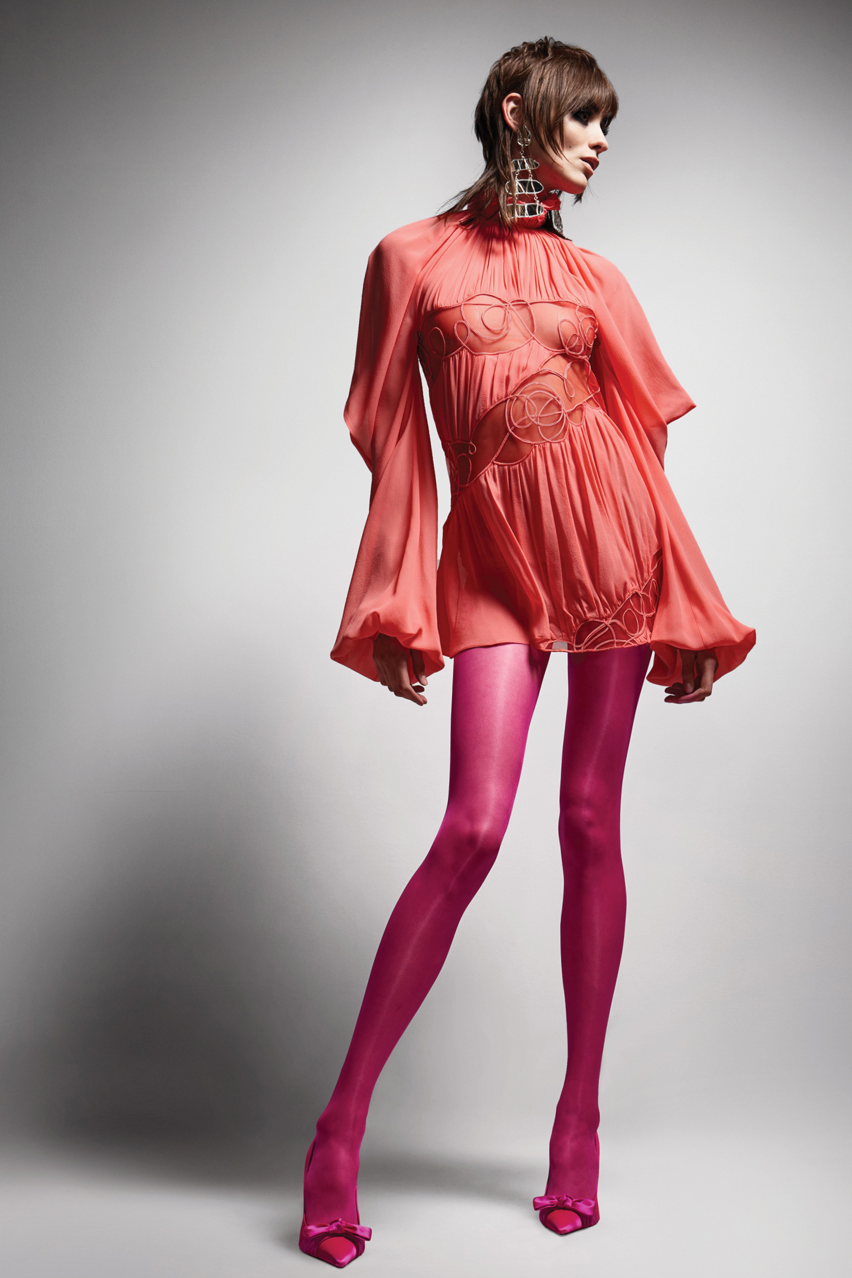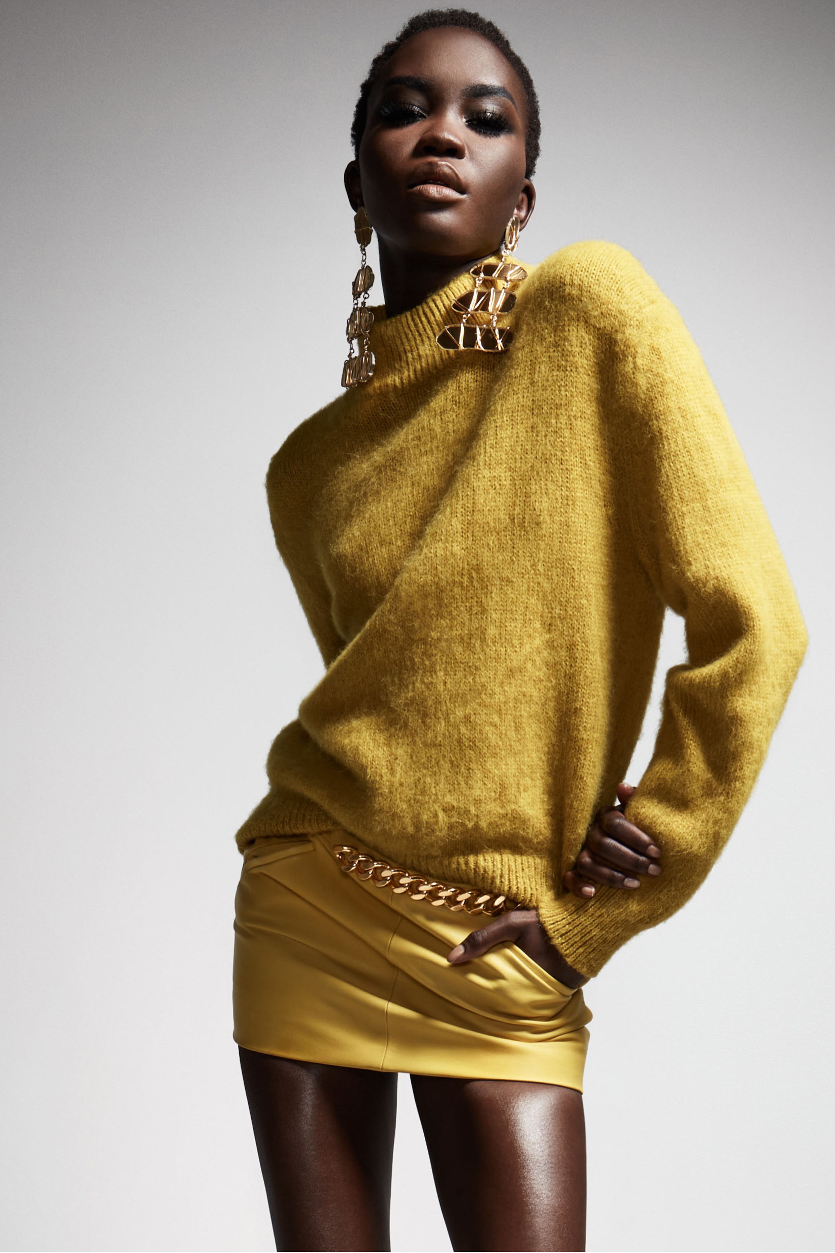 В лукбуке коллекции модели позируют в объемных бархатных пуховиках, эфемерных блузах из гипюра и дерзких "вареных" джинсах, кожаных микрошортах и спортивных дубленках. Форд выдержал тонкую грань между причудливым и раскованным стилем конца 60-х и гламурными 2000-ми. Золотые цепи, блестящий атлас, мягкие фактуры велюра, кашемира и шерсти сочетаются с силуэтами, приближенными к городской классике, и ненавязчивой авангардной эксцентрикой. К примеру, большие очки с желтыми стеклами дополняют простой черный джемпер, а остроносые сапоги — оверсайз платье-худи.