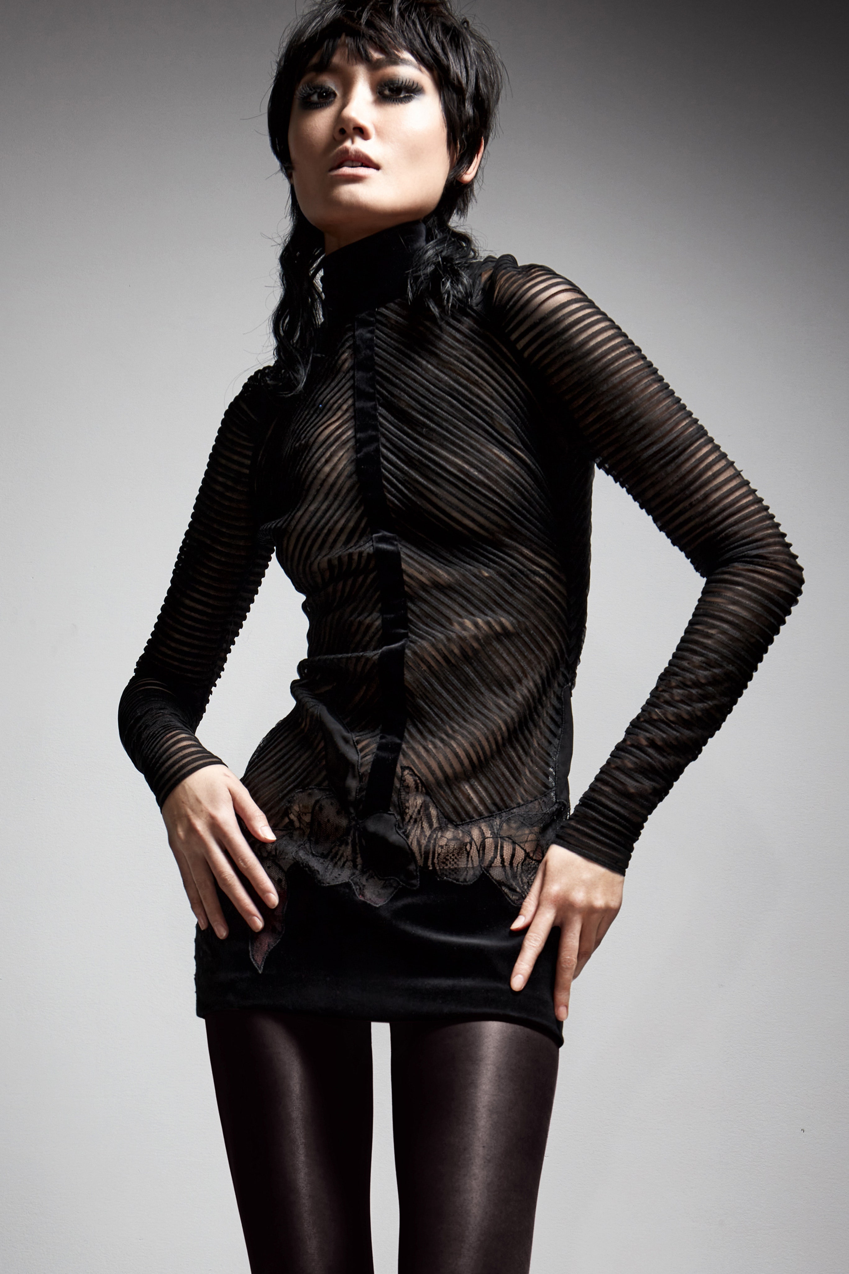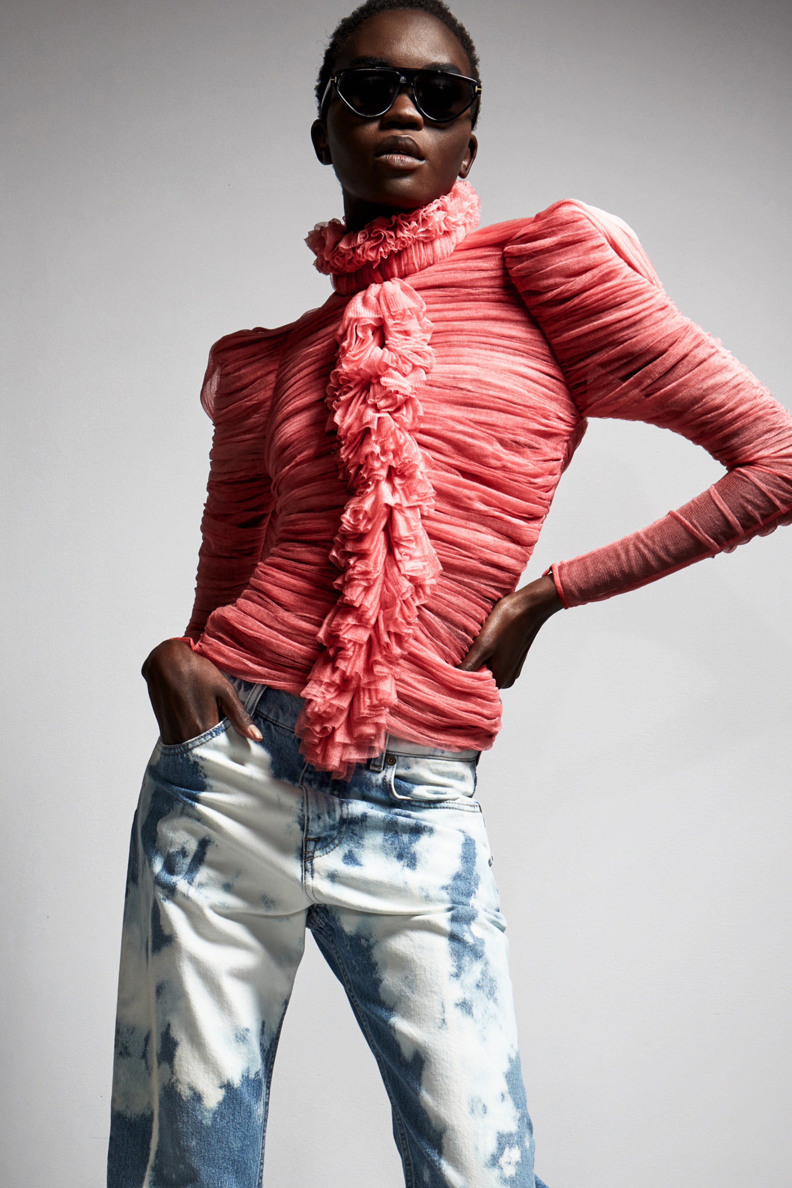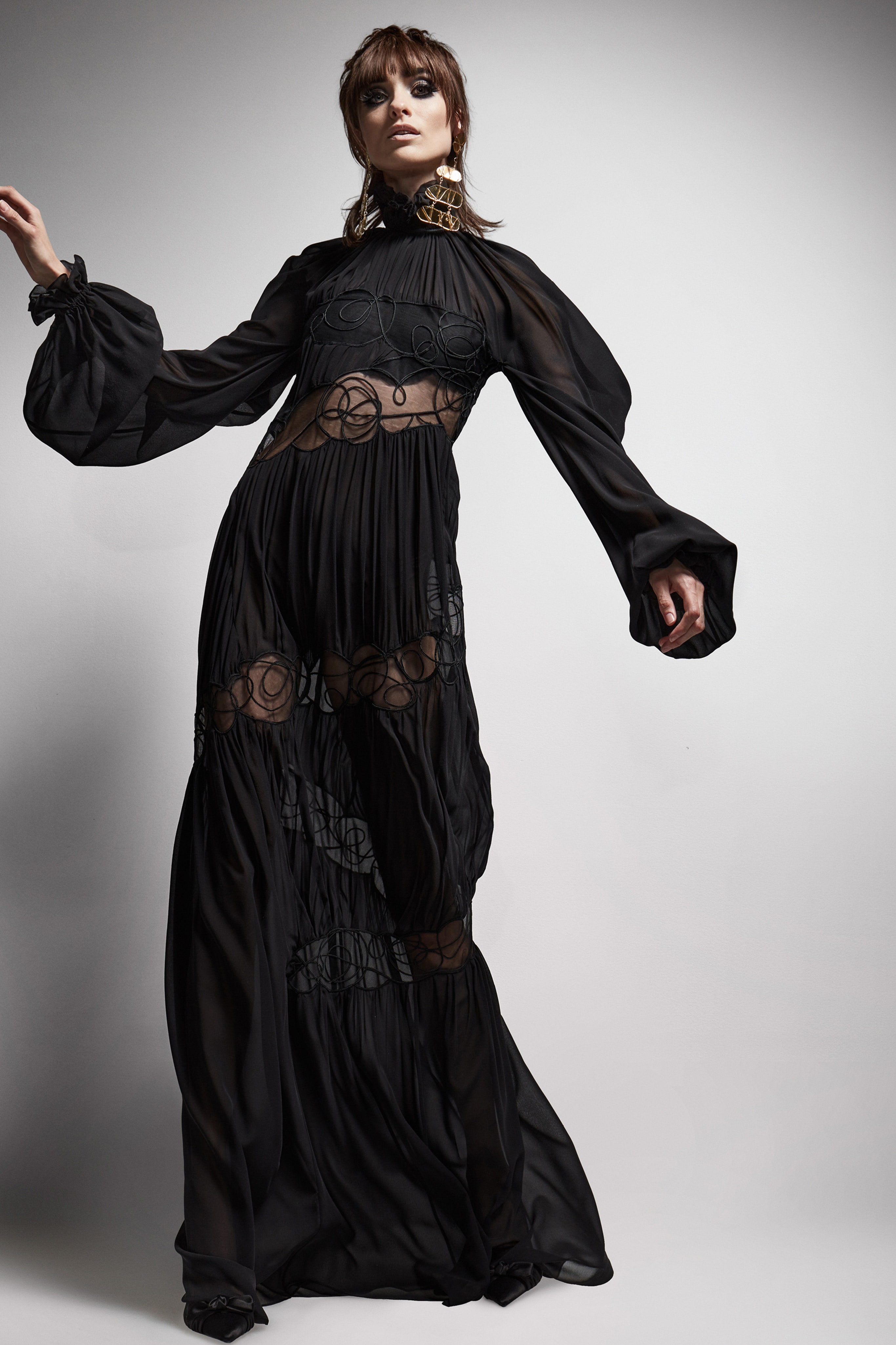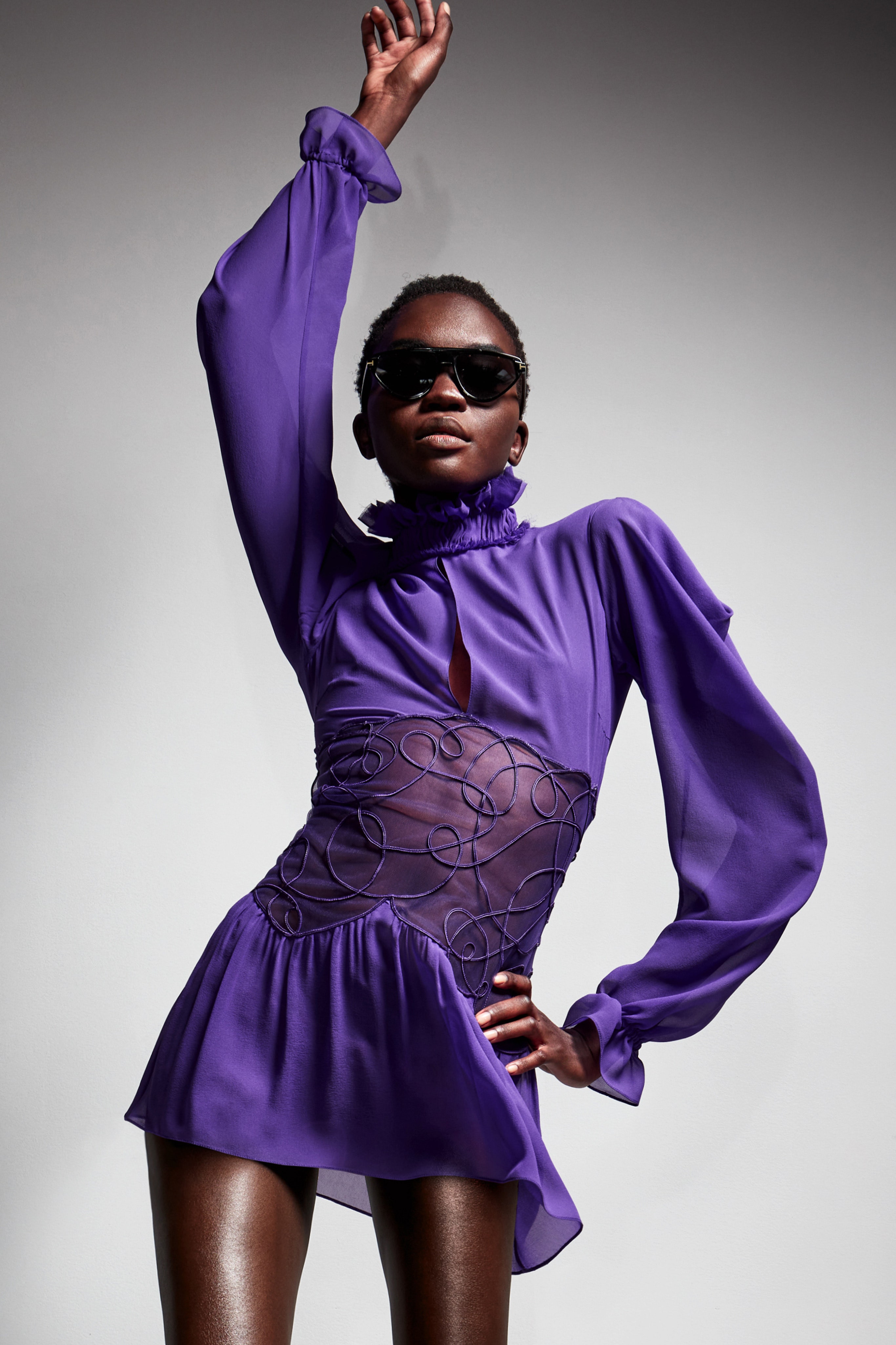 В лукбуке коллекции модели позируют в объемных бархатных пуховиках, эфемерных блузах из гипюра и дерзких "вареных" джинсах, кожаных микрошортах и спортивных дубленках. Форд выдержал тонкую грань между причудливым и раскованным стилем конца 60-х и гламурными 2000-ми. Золотые цепи, блестящий атлас, мягкие фактуры велюра, кашемира и шерсти сочетаются с силуэтами, приближенными к городской классике, и ненавязчивой авангардной эксцентрикой. К примеру, большие очки с желтыми стеклами дополняют простой черный джемпер, а остроносые сапоги — оверсайз платье-худи.