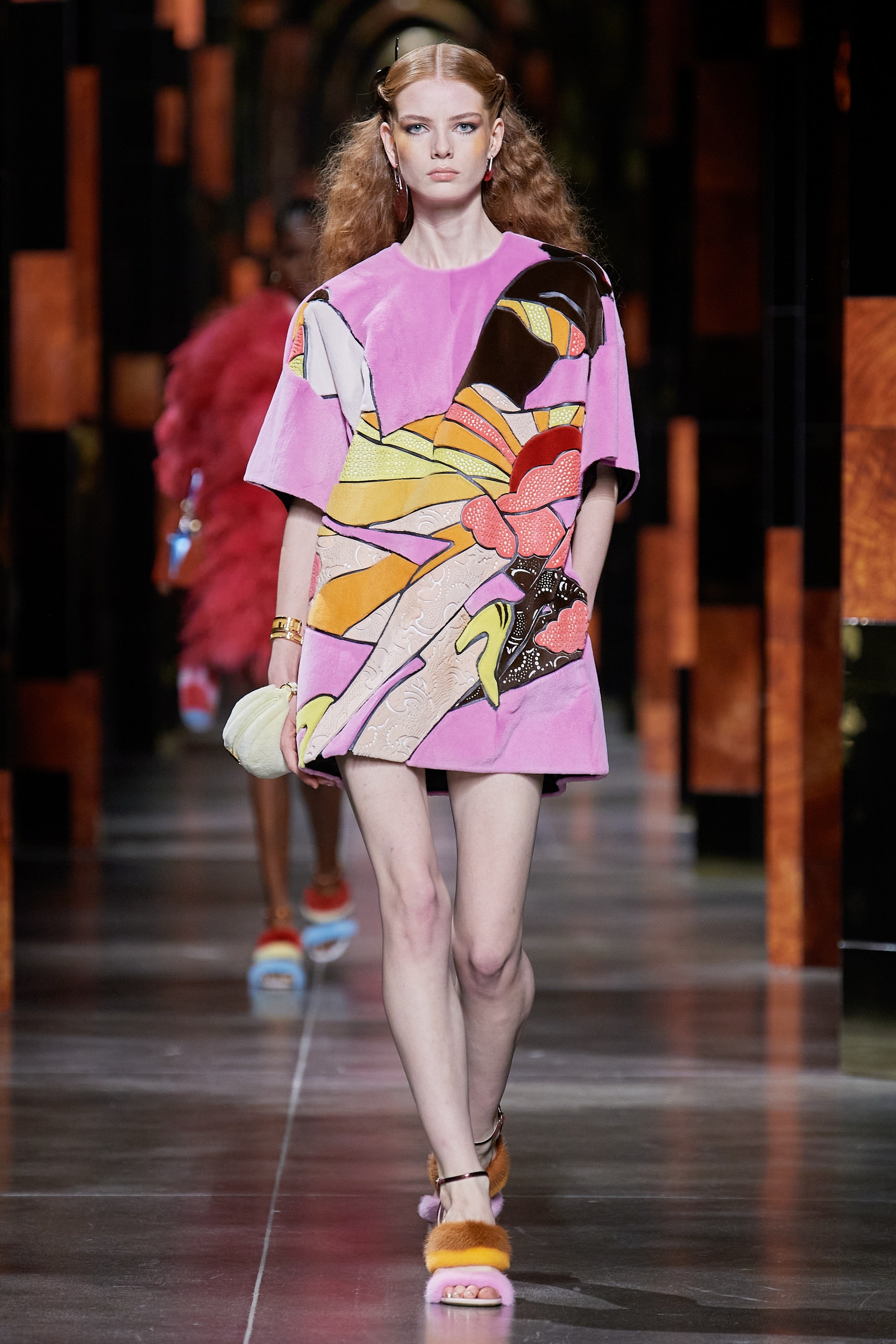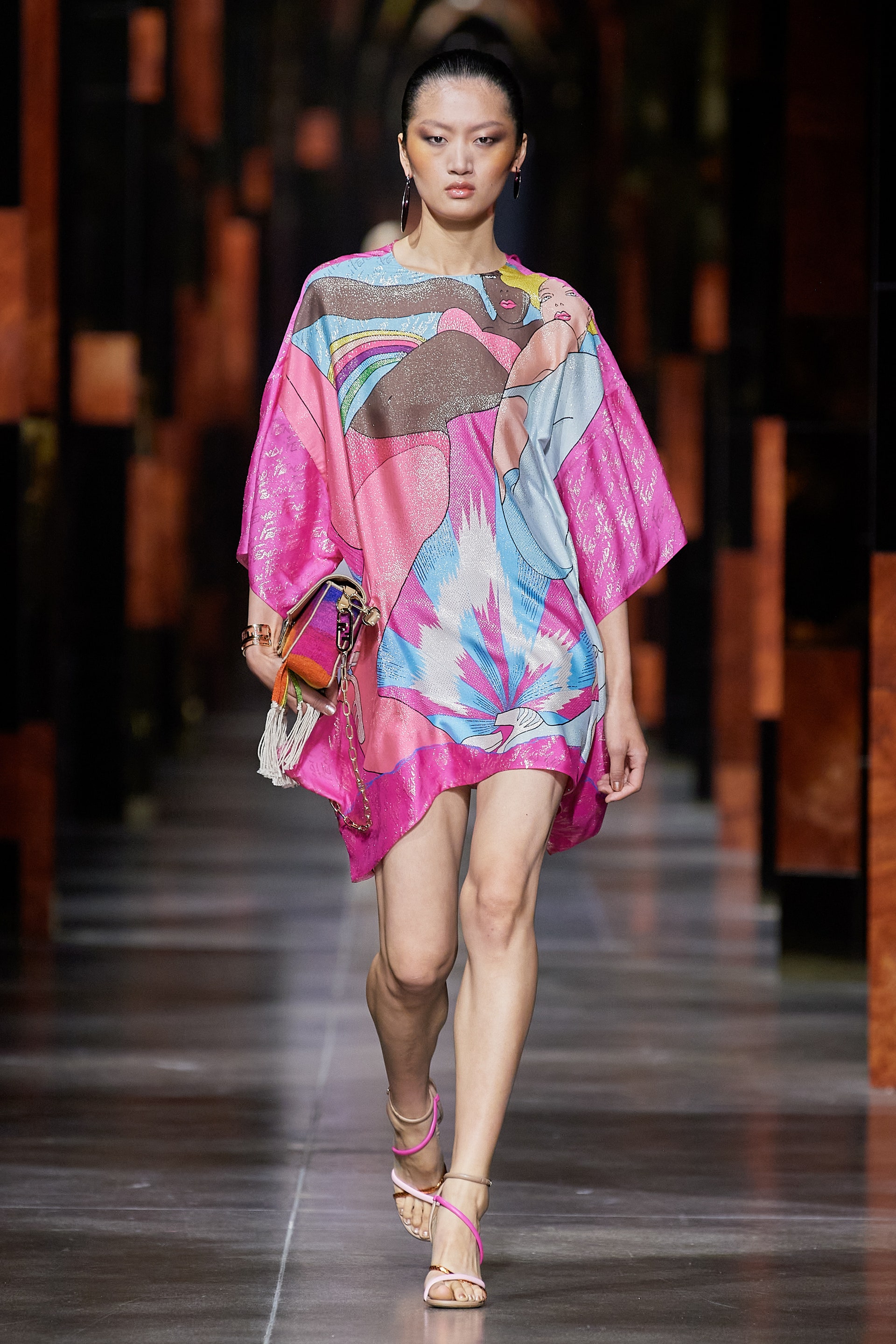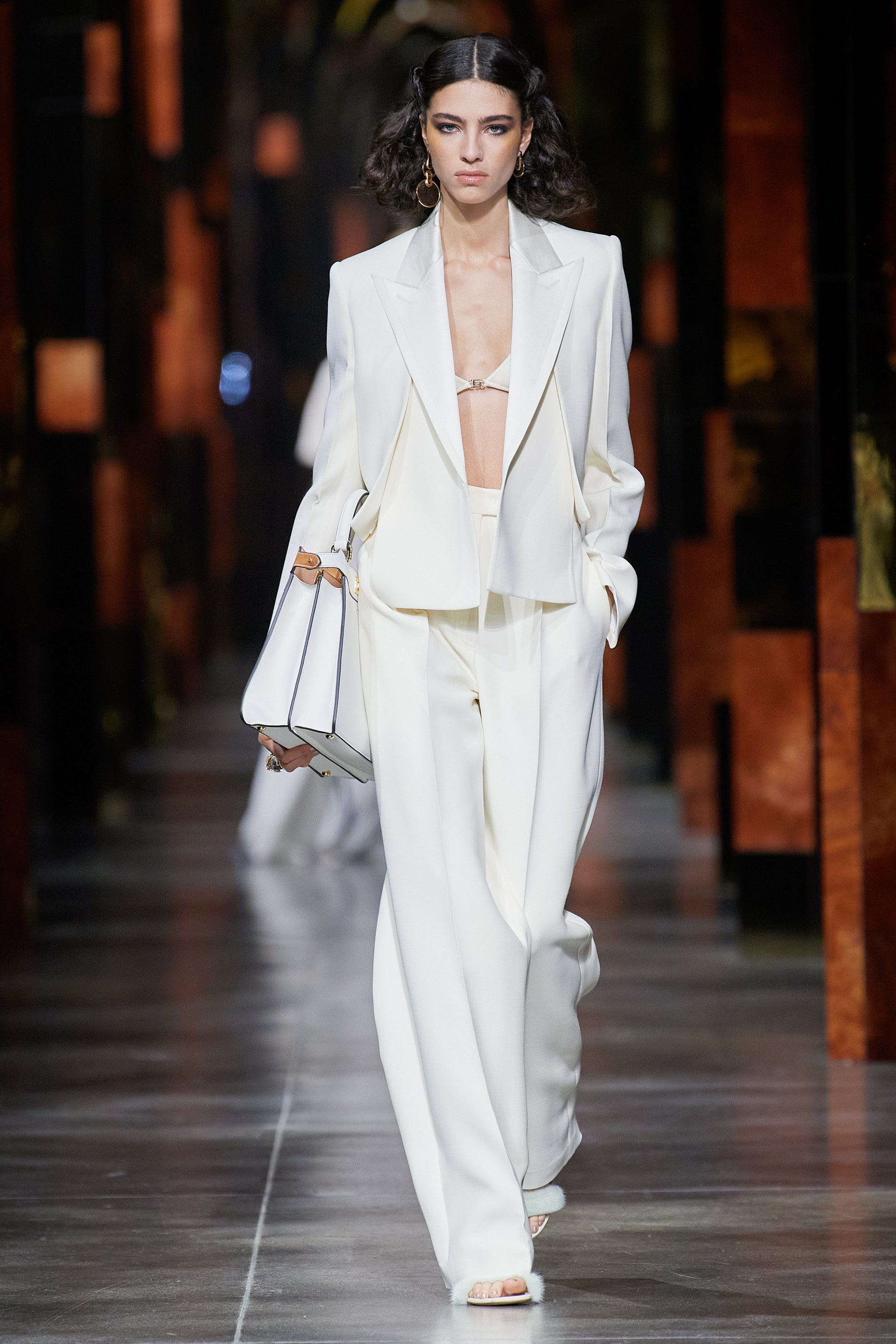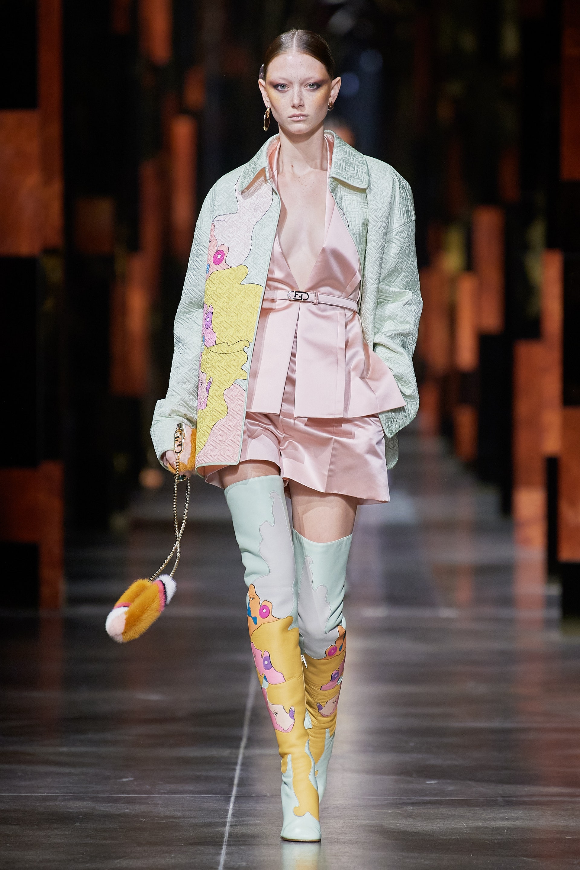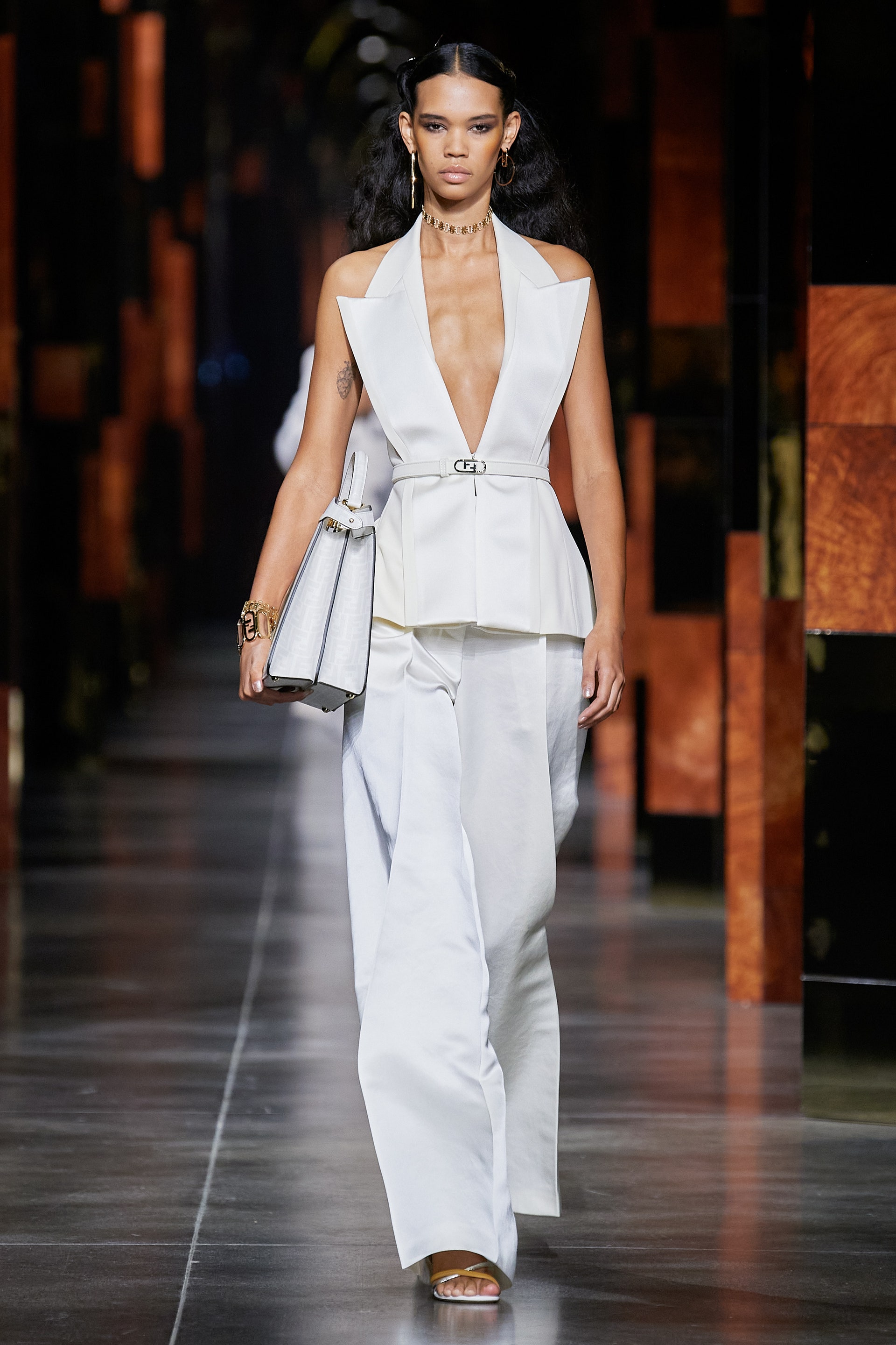 Форт была одной из суперзвезд фабрики грез Энди Уорхола и музой Лопеса на рубеже 60-70-х. Логотип для дома Fendi, который Лопес создавал, сотрудничая с Карлом Лагерфельдом, Джонс возродил в виде принта для колгот и "разлетных" платьев, которые модели носили поверх брюк, а разноцветные сюжеты в психоделическом стиле, с атлетическими женскими фигурами, радужными пейзажами и стилизованными портретами, расположились на роскошных нарядах в духе гламурной эпохи 70-х. Ключевыми образами коллекции стали белые брючные костюмы и силуэтные пальто, интерпретирующие наследие дома и творчество Сильвии Вентурини-Фенди. Некоторые из них также украшали образцы ранней графики Антонио Лопеса — контрастные черные мазки и росчерки. Украшения традиционно были созданы Дельфиной Делеттре-Фенди.