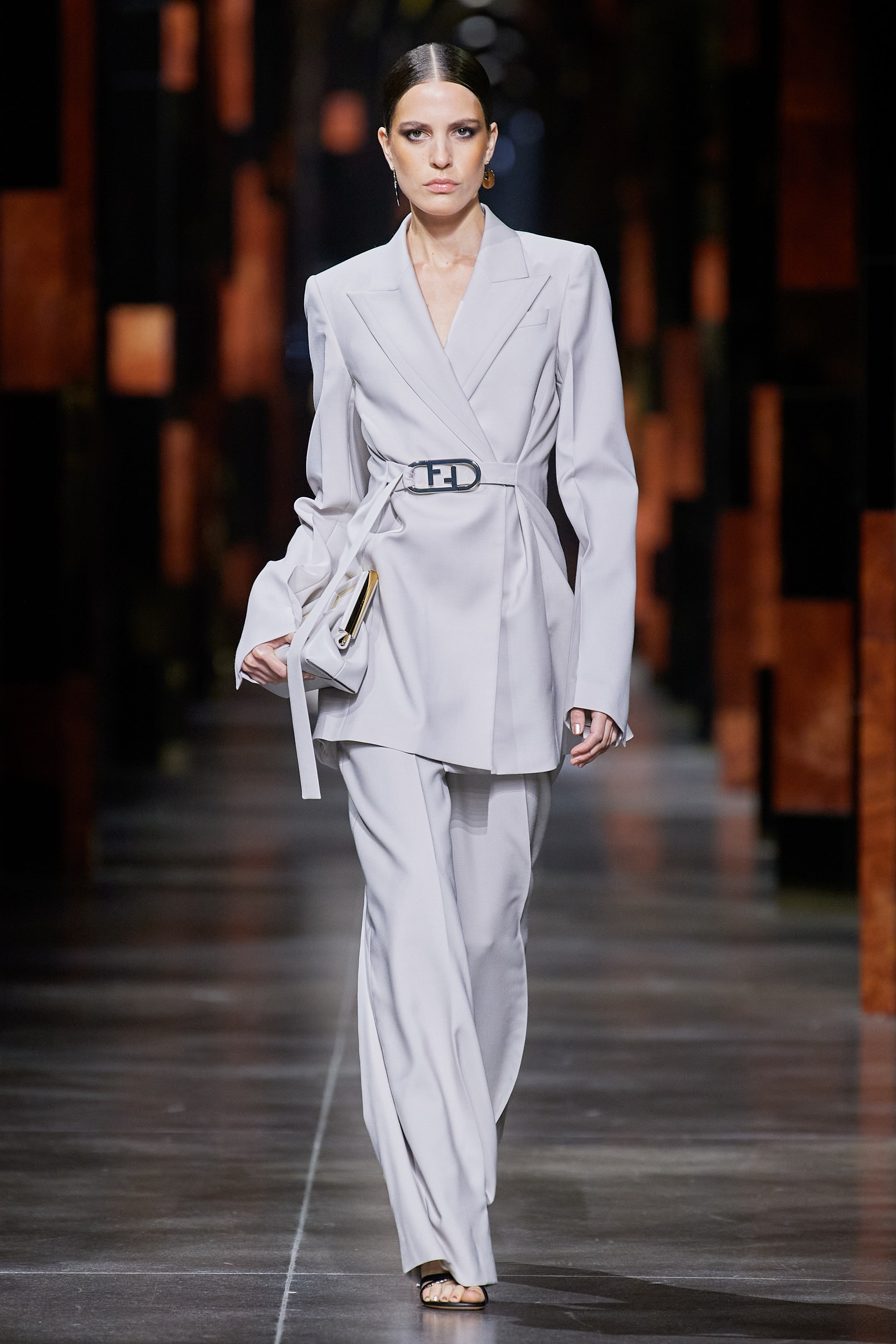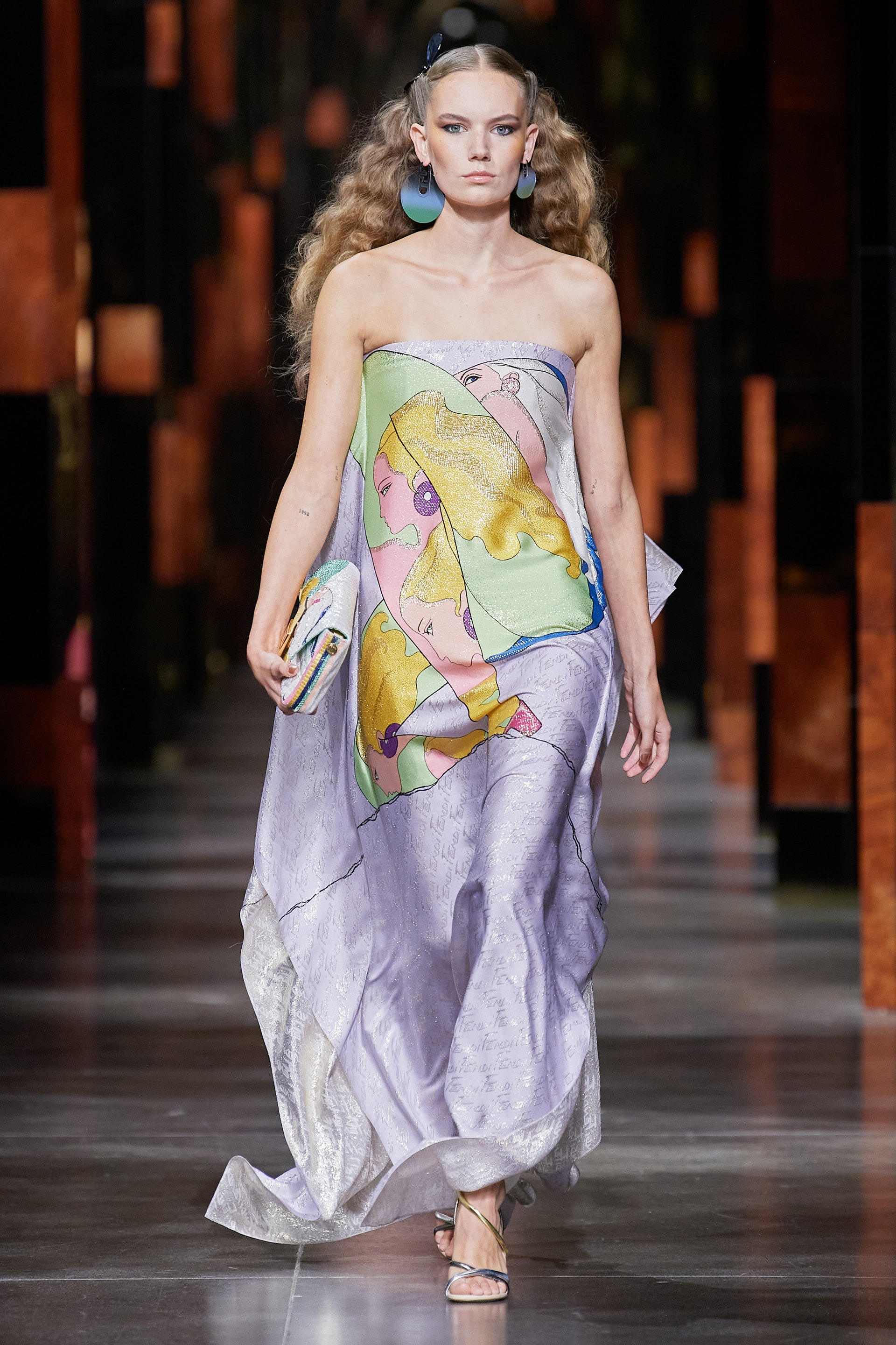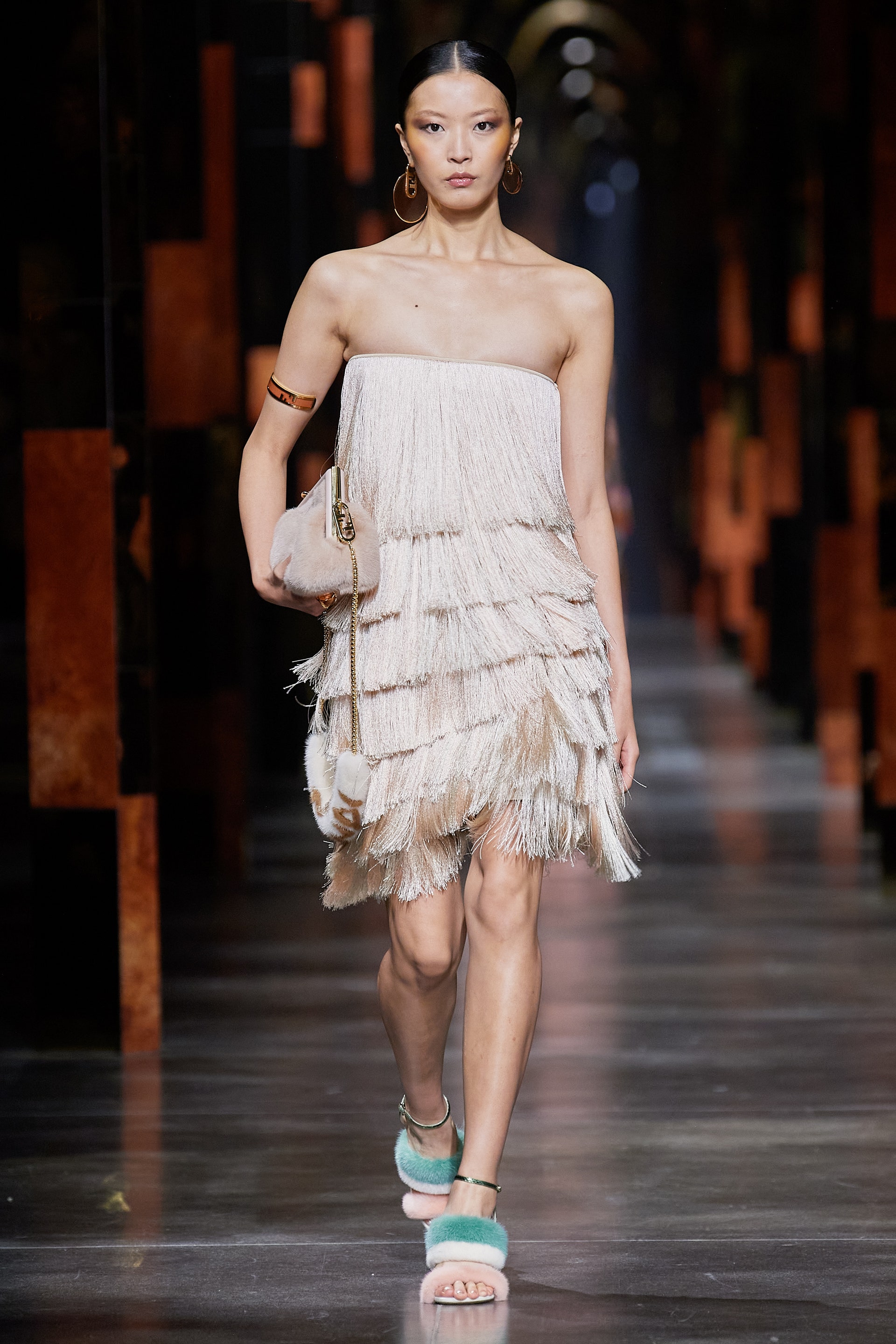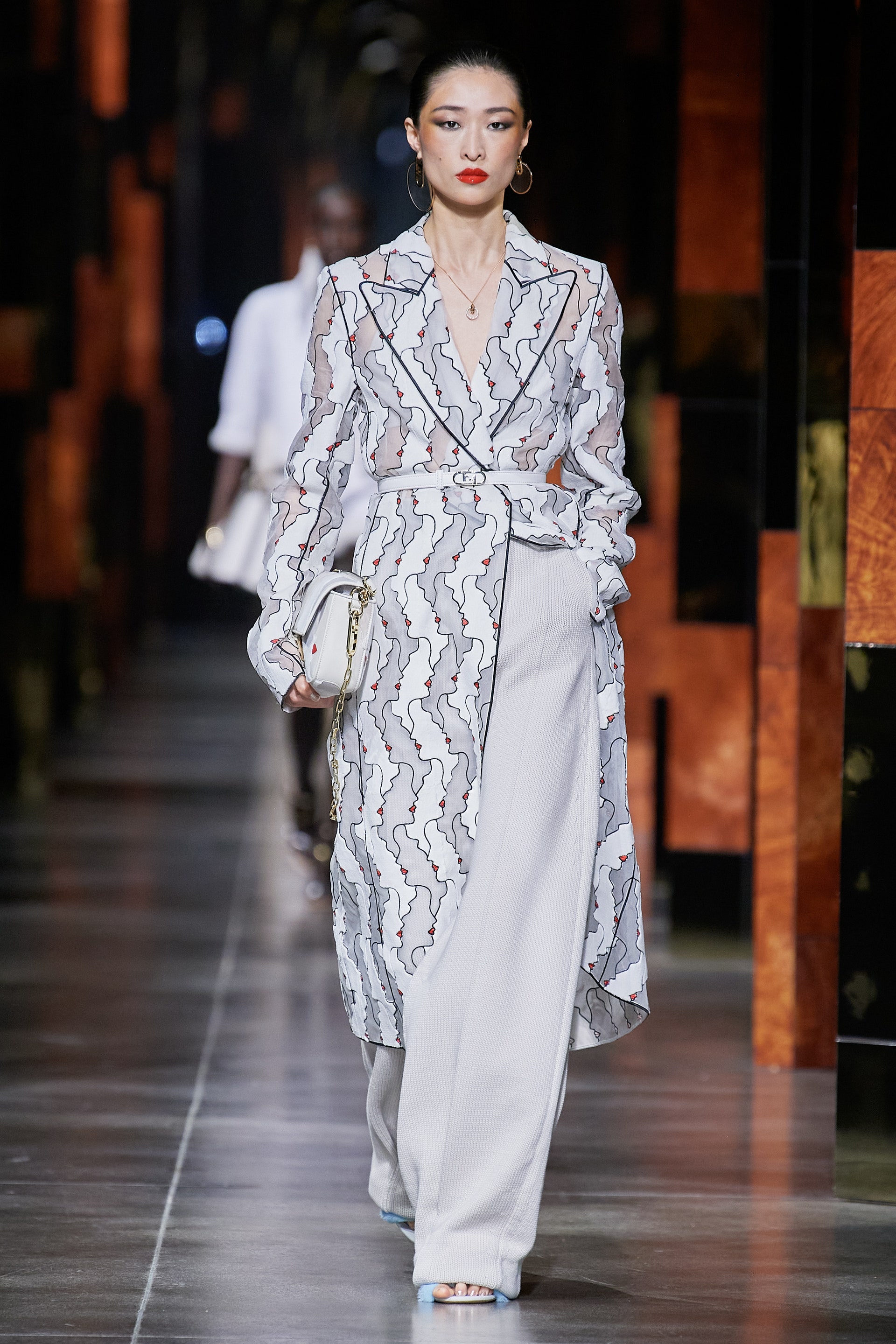 Форт была одной из суперзвезд фабрики грез Энди Уорхола и музой Лопеса на рубеже 60-70-х. Логотип для дома Fendi, который Лопес создавал, сотрудничая с Карлом Лагерфельдом, Джонс возродил в виде принта для колгот и "разлетных" платьев, которые модели носили поверх брюк, а разноцветные сюжеты в психоделическом стиле, с атлетическими женскими фигурами, радужными пейзажами и стилизованными портретами, расположились на роскошных нарядах в духе гламурной эпохи 70-х. Ключевыми образами коллекции стали белые брючные костюмы и силуэтные пальто, интерпретирующие наследие дома и творчество Сильвии Вентурини-Фенди. Некоторые из них также украшали образцы ранней графики Антонио Лопеса — контрастные черные мазки и росчерки. Украшения традиционно были созданы Дельфиной Делеттре-Фенди.