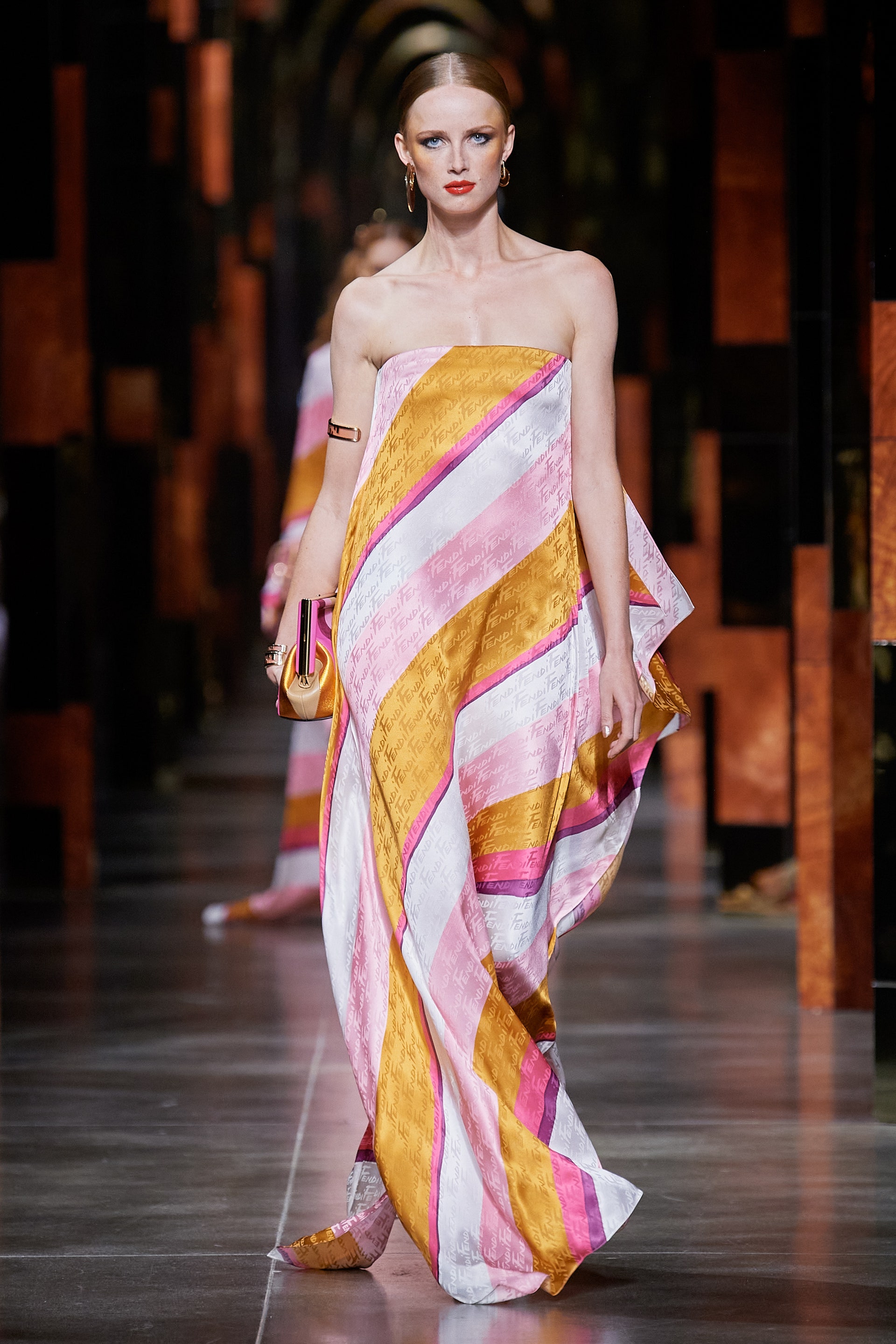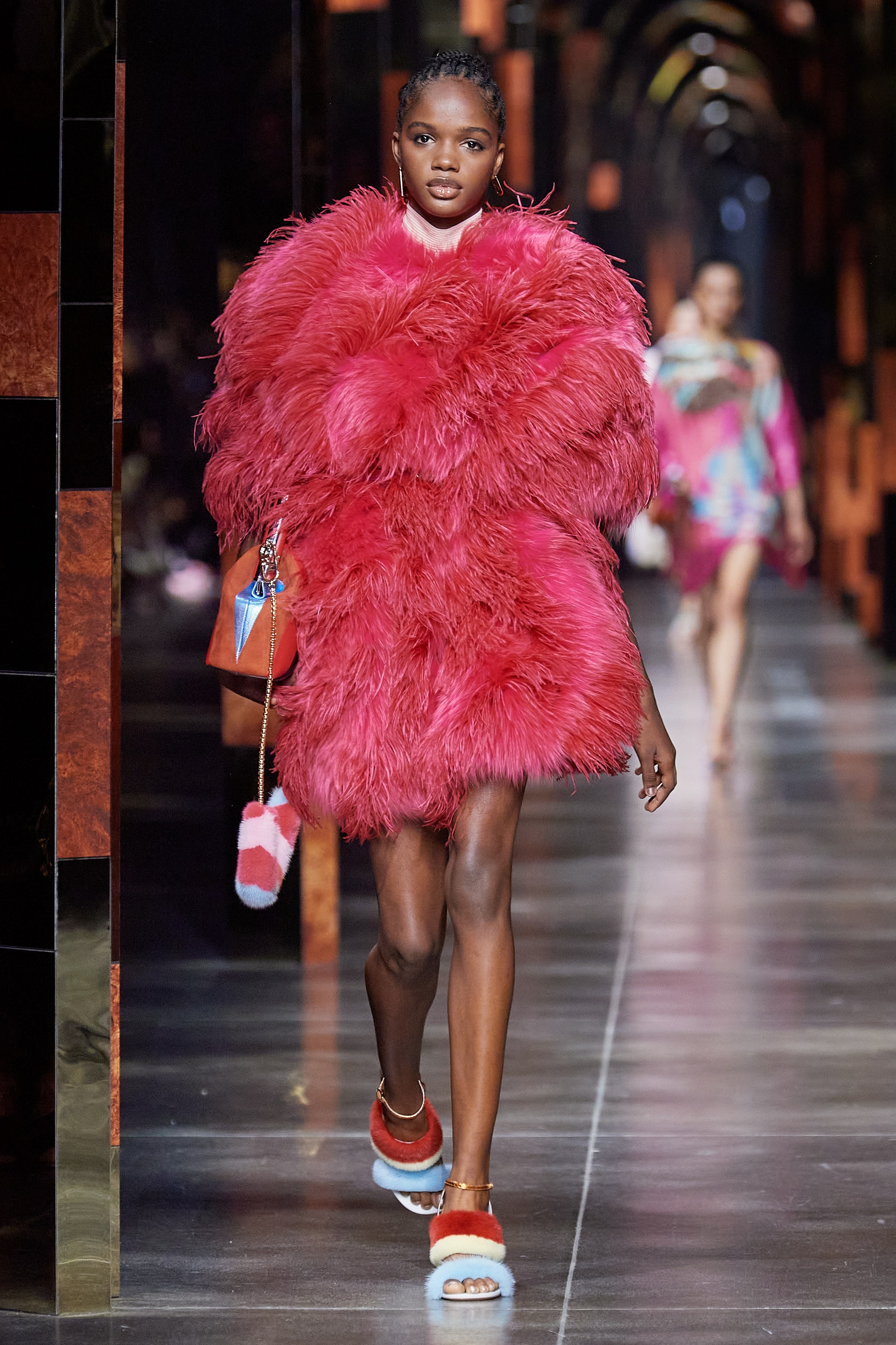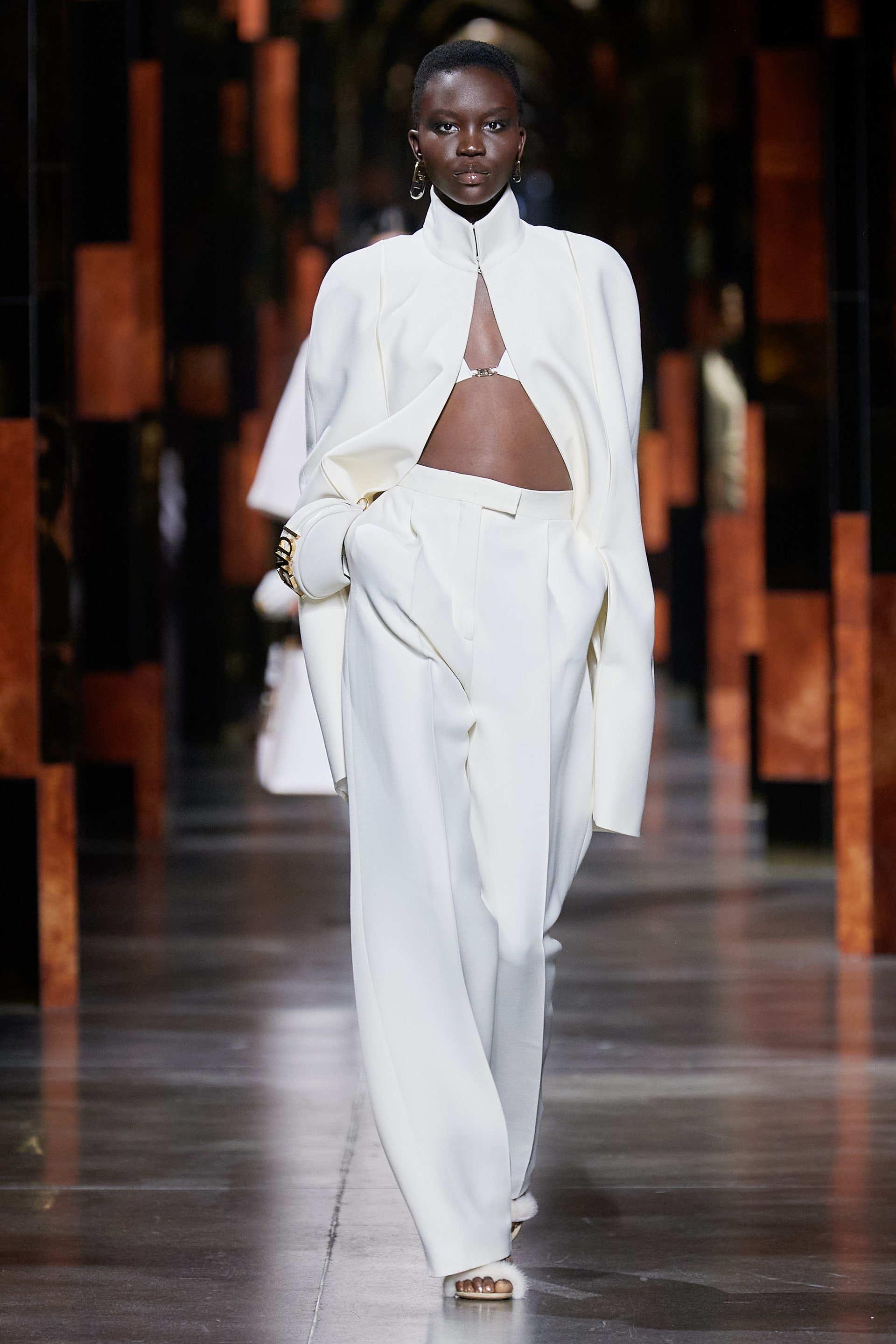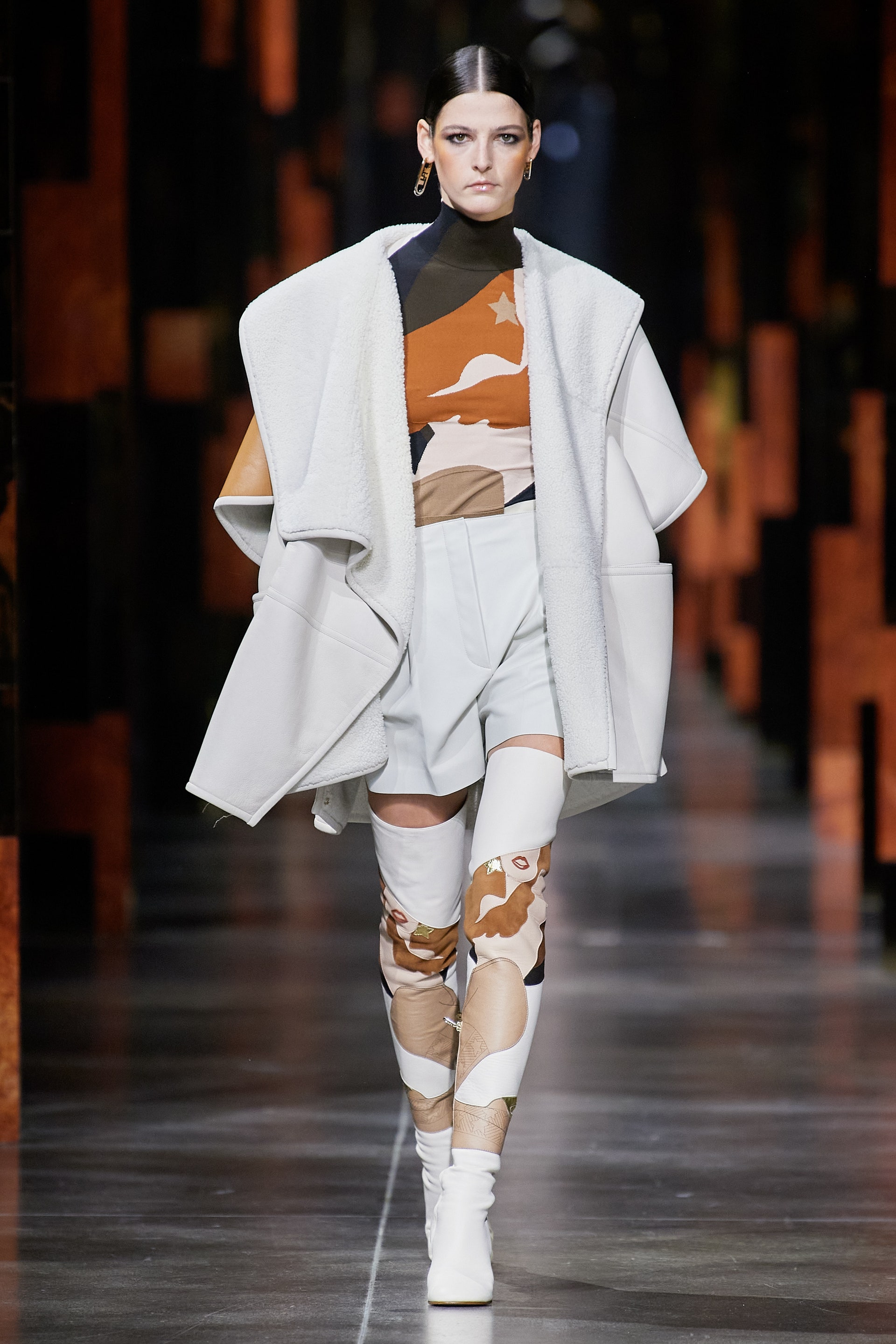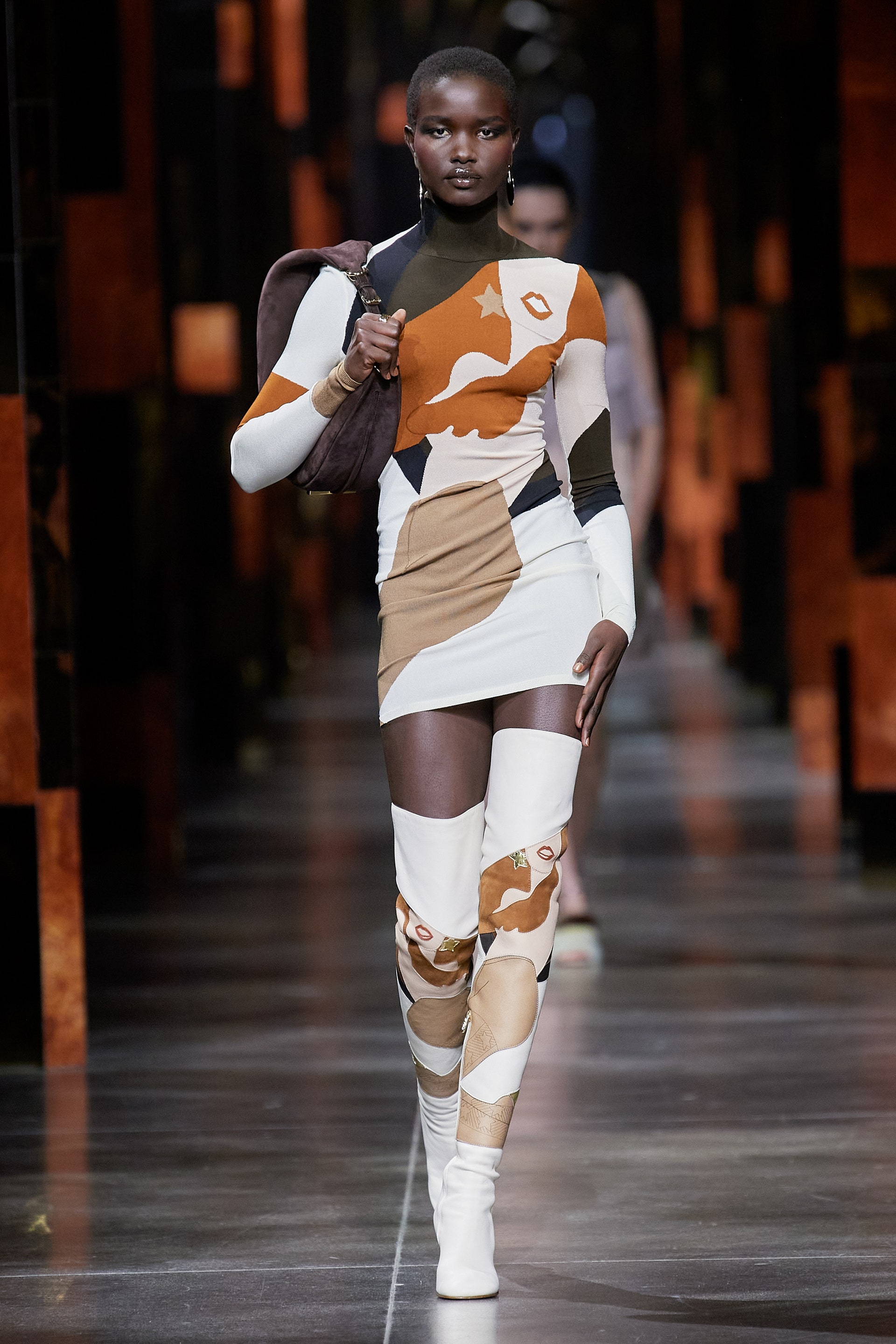 Форт была одной из суперзвезд фабрики грез Энди Уорхола и музой Лопеса на рубеже 60-70-х. Логотип для дома Fendi, который Лопес создавал, сотрудничая с Карлом Лагерфельдом, Джонс возродил в виде принта для колгот и "разлетных" платьев, которые модели носили поверх брюк, а разноцветные сюжеты в психоделическом стиле, с атлетическими женскими фигурами, радужными пейзажами и стилизованными портретами, расположились на роскошных нарядах в духе гламурной эпохи 70-х. Ключевыми образами коллекции стали белые брючные костюмы и силуэтные пальто, интерпретирующие наследие дома и творчество Сильвии Вентурини-Фенди. Некоторые из них также украшали образцы ранней графики Антонио Лопеса — контрастные черные мазки и росчерки. Украшения традиционно были созданы Дельфиной Делеттре-Фенди.