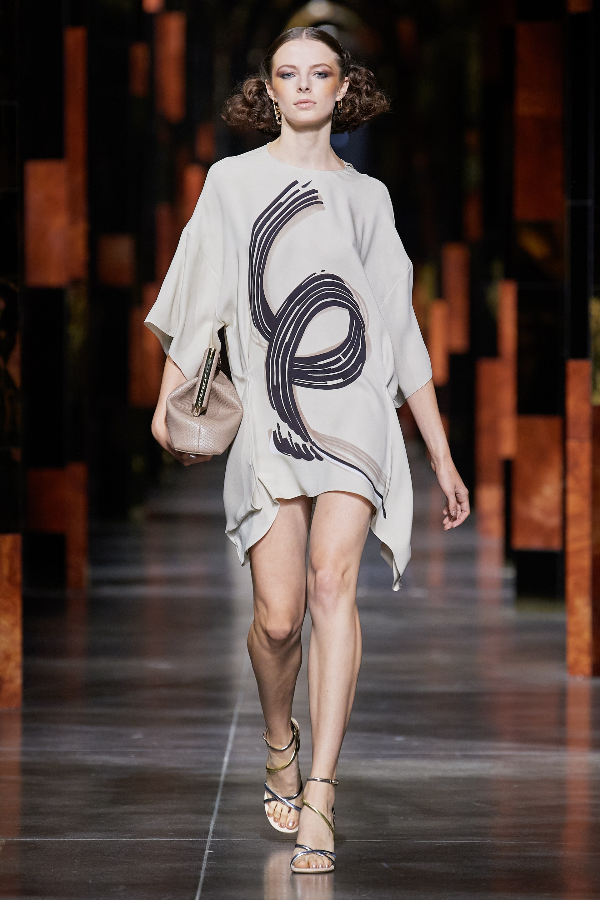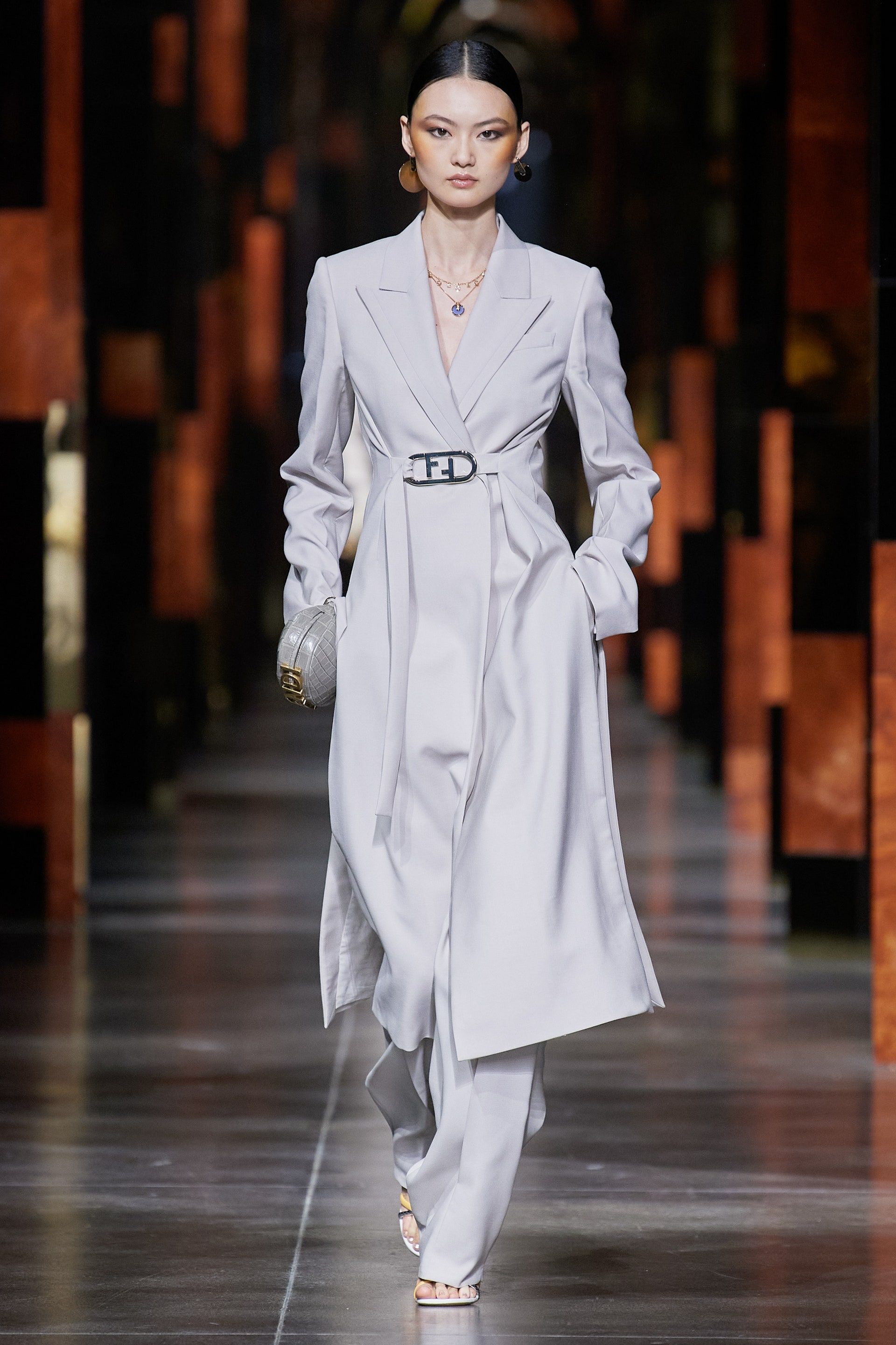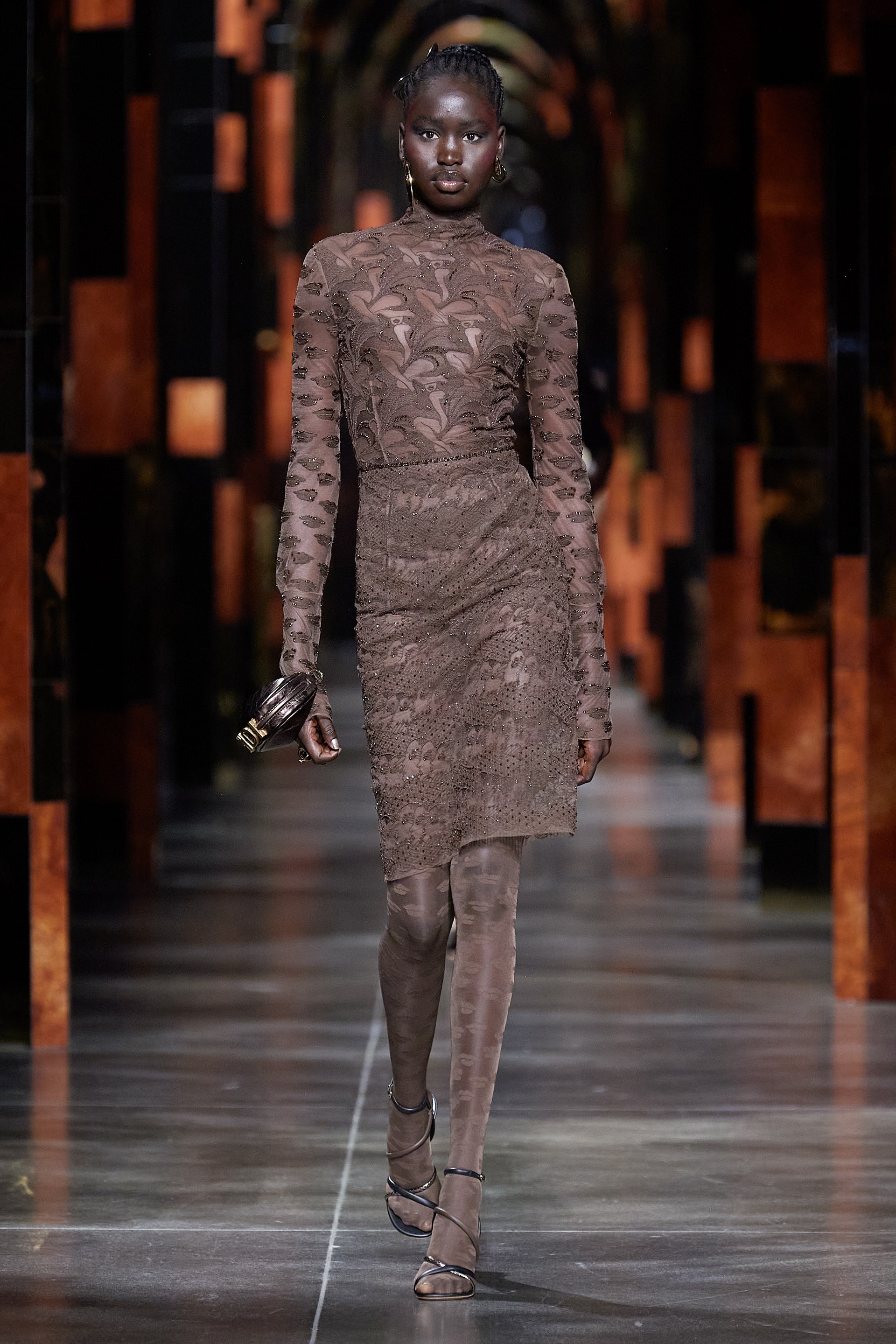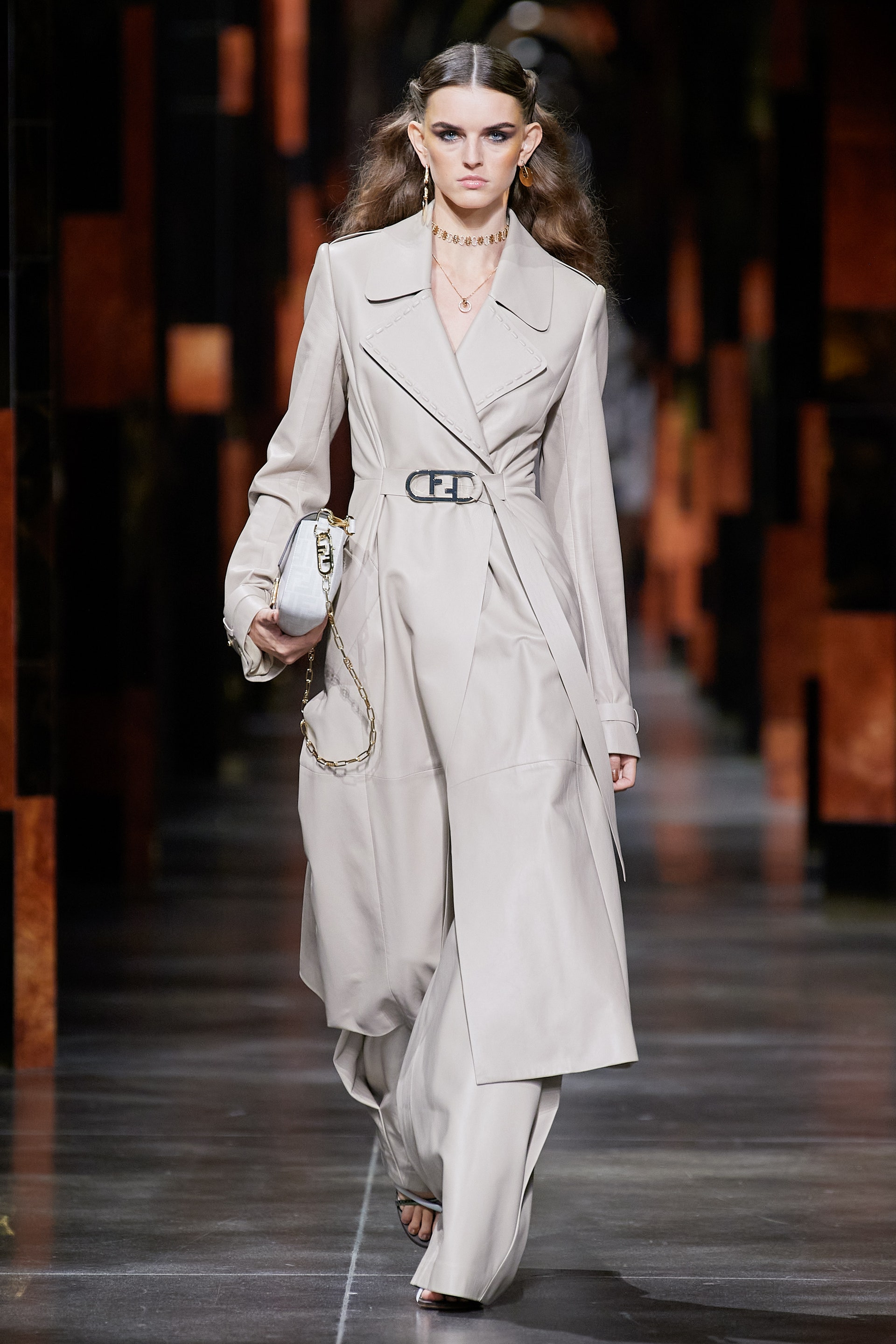 Форт была одной из суперзвезд фабрики грез Энди Уорхола и музой Лопеса на рубеже 60-70-х. Логотип для дома Fendi, который Лопес создавал, сотрудничая с Карлом Лагерфельдом, Джонс возродил в виде принта для колгот и "разлетных" платьев, которые модели носили поверх брюк, а разноцветные сюжеты в психоделическом стиле, с атлетическими женскими фигурами, радужными пейзажами и стилизованными портретами, расположились на роскошных нарядах в духе гламурной эпохи 70-х. Ключевыми образами коллекции стали белые брючные костюмы и силуэтные пальто, интерпретирующие наследие дома и творчество Сильвии Вентурини-Фенди. Некоторые из них также украшали образцы ранней графики Антонио Лопеса — контрастные черные мазки и росчерки. Украшения традиционно были созданы Дельфиной Делеттре-Фенди.