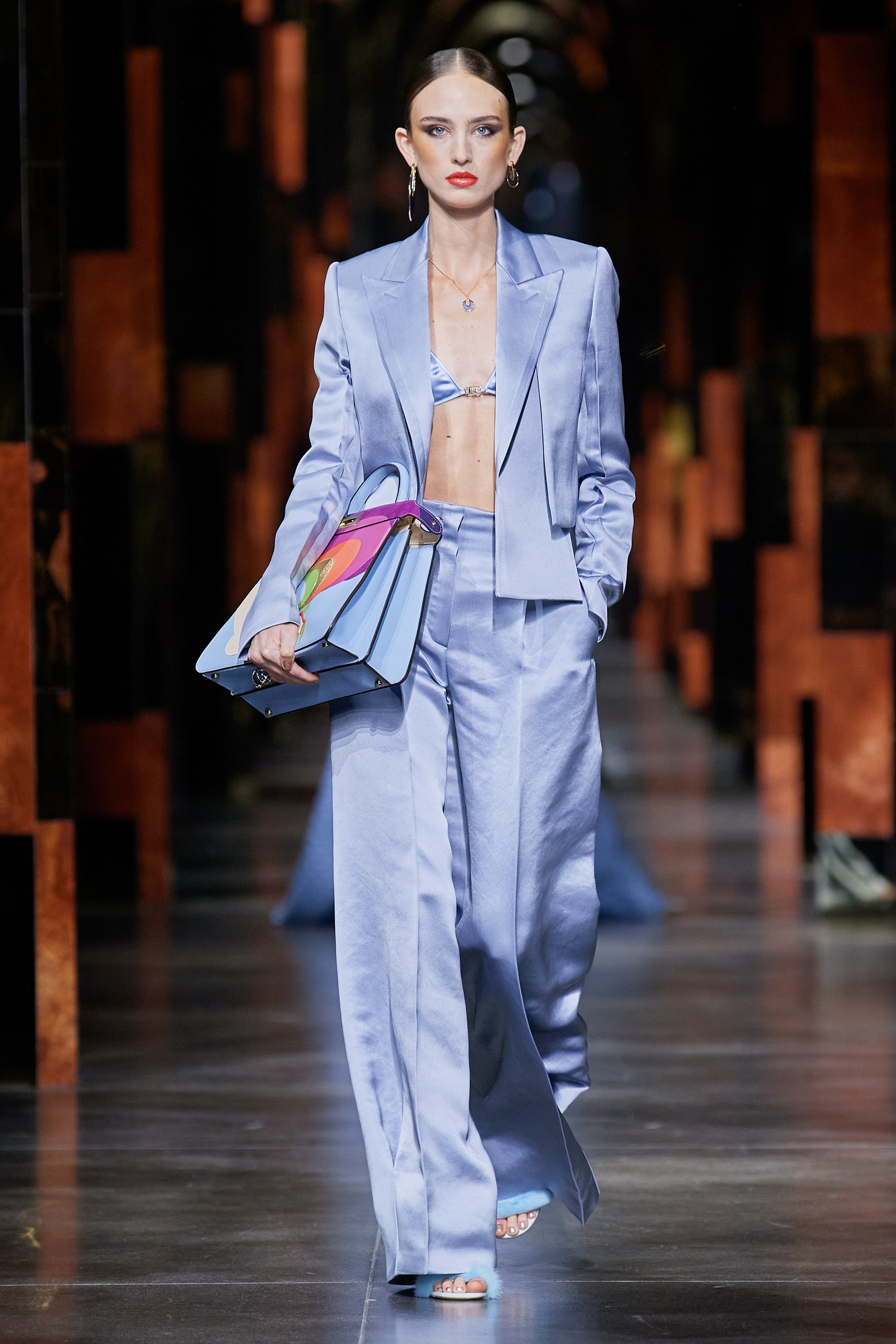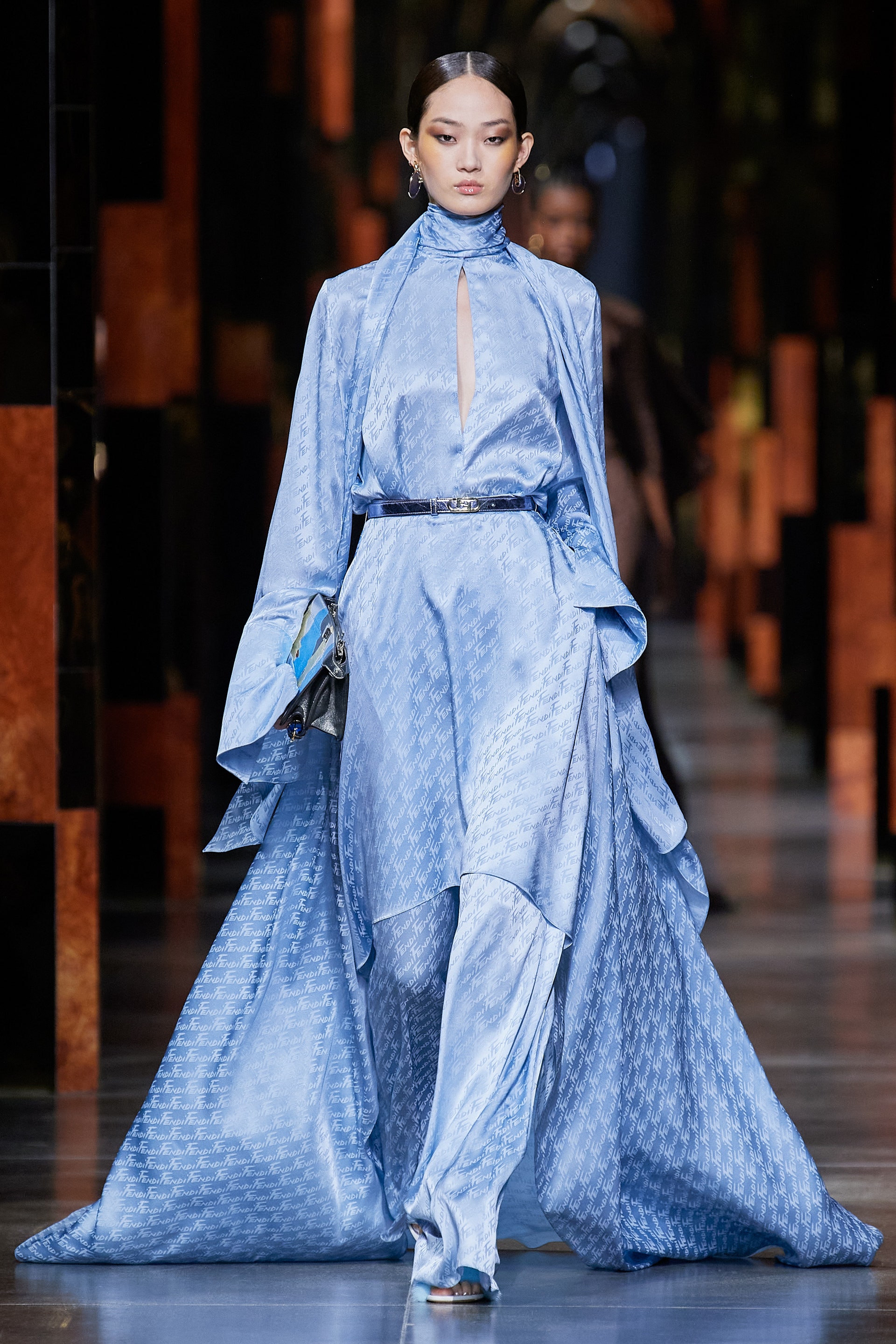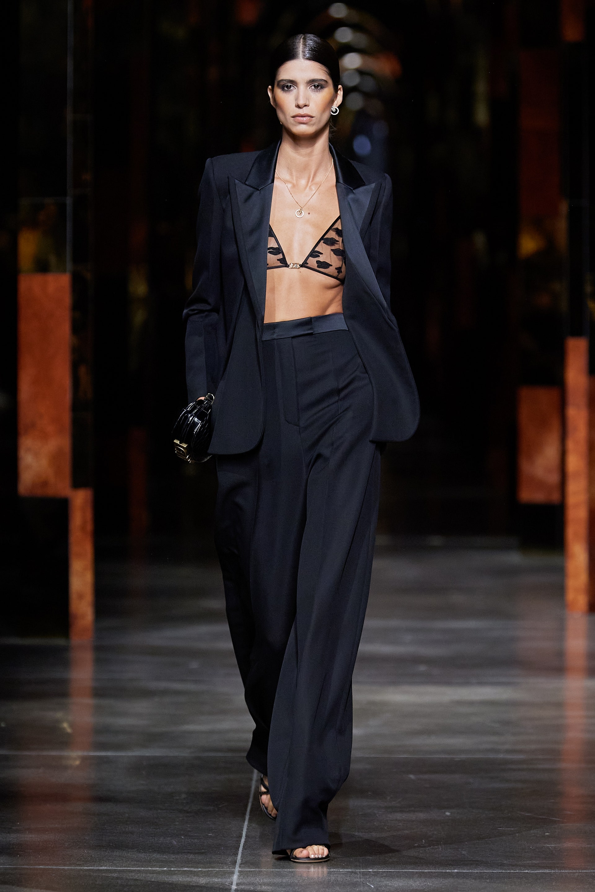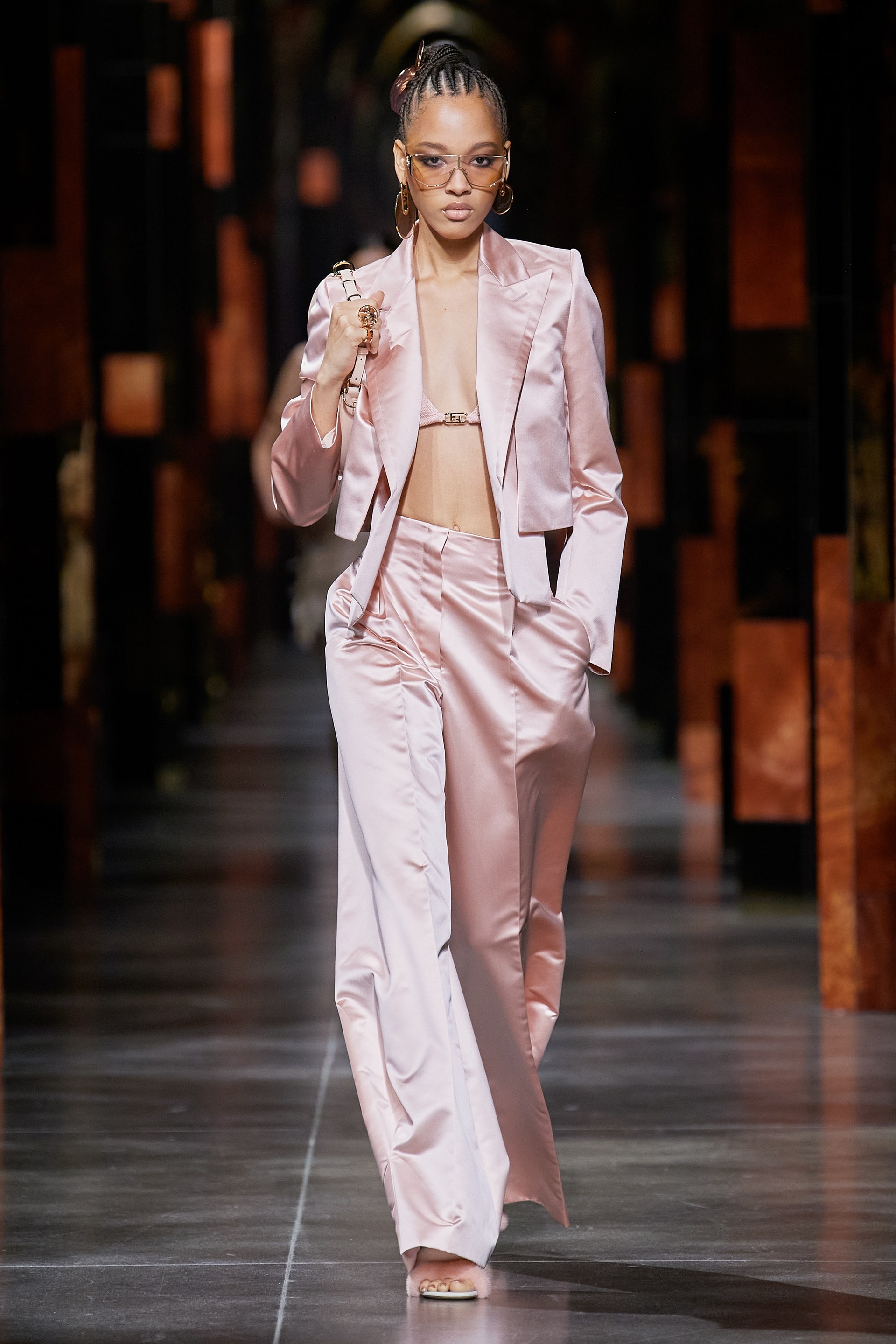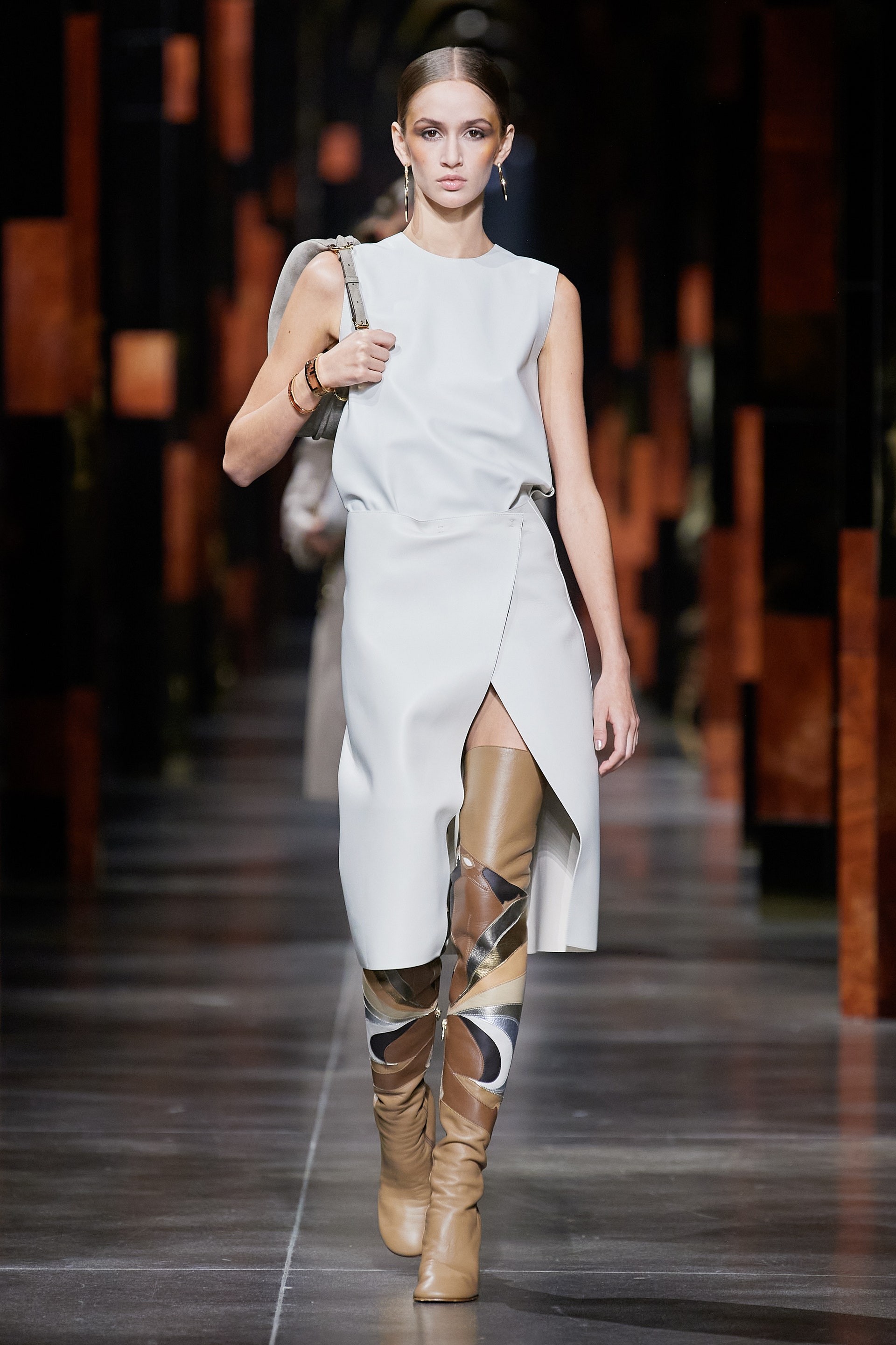 Форт была одной из суперзвезд фабрики грез Энди Уорхола и музой Лопеса на рубеже 60-70-х. Логотип для дома Fendi, который Лопес создавал, сотрудничая с Карлом Лагерфельдом, Джонс возродил в виде принта для колгот и "разлетных" платьев, которые модели носили поверх брюк, а разноцветные сюжеты в психоделическом стиле, с атлетическими женскими фигурами, радужными пейзажами и стилизованными портретами, расположились на роскошных нарядах в духе гламурной эпохи 70-х. Ключевыми образами коллекции стали белые брючные костюмы и силуэтные пальто, интерпретирующие наследие дома и творчество Сильвии Вентурини-Фенди. Некоторые из них также украшали образцы ранней графики Антонио Лопеса — контрастные черные мазки и росчерки. Украшения традиционно были созданы Дельфиной Делеттре-Фенди.