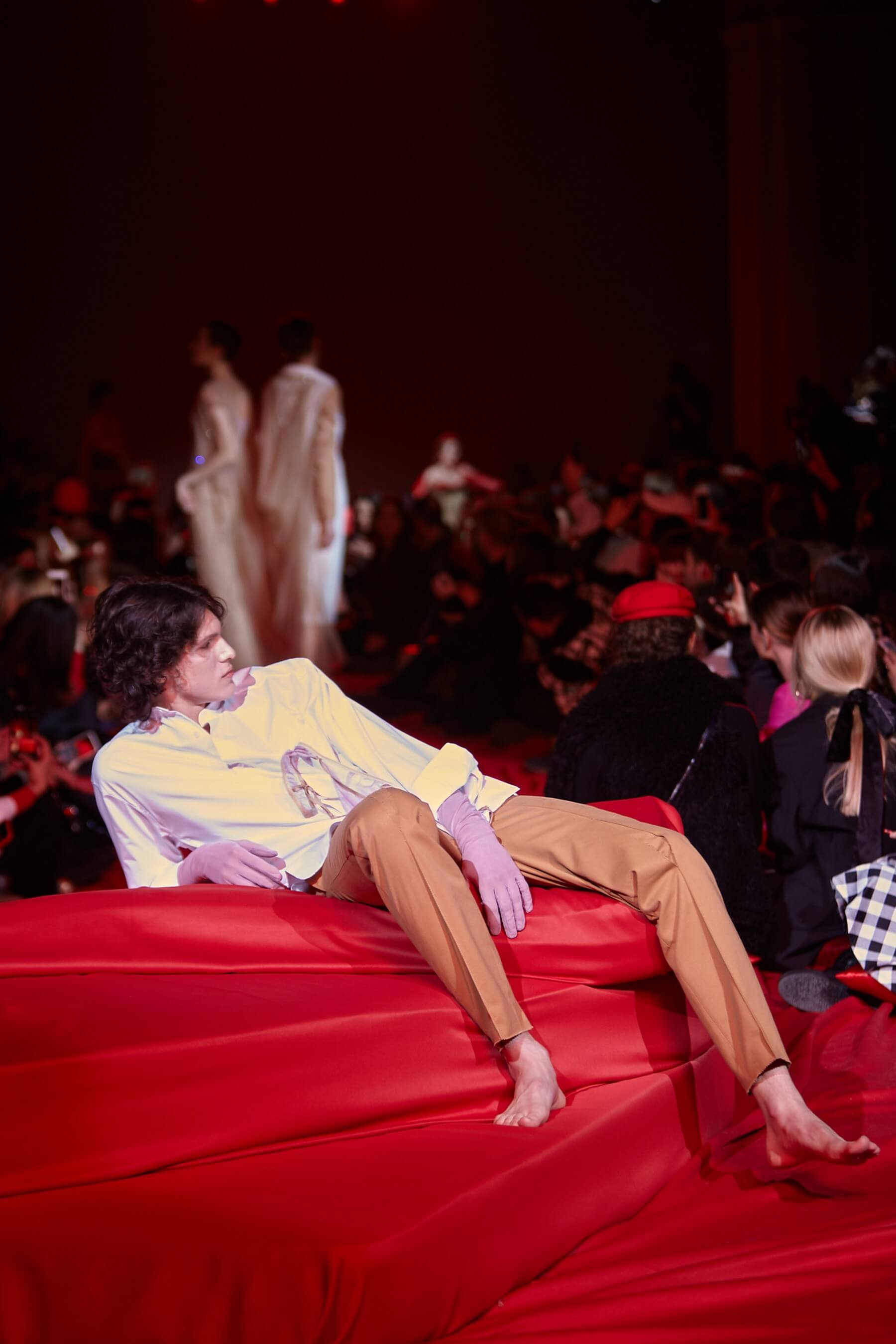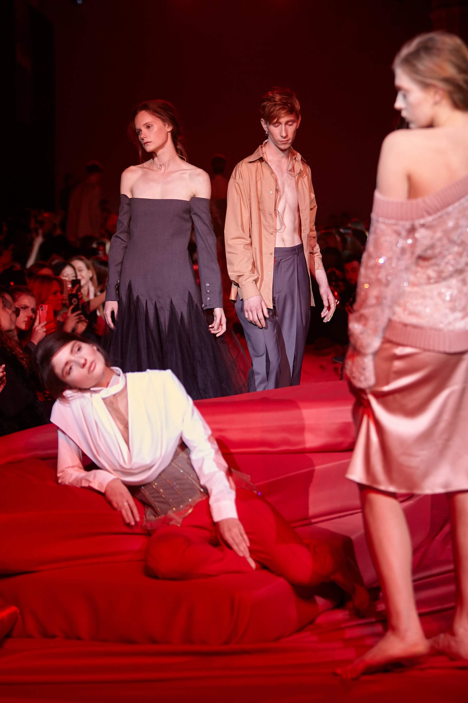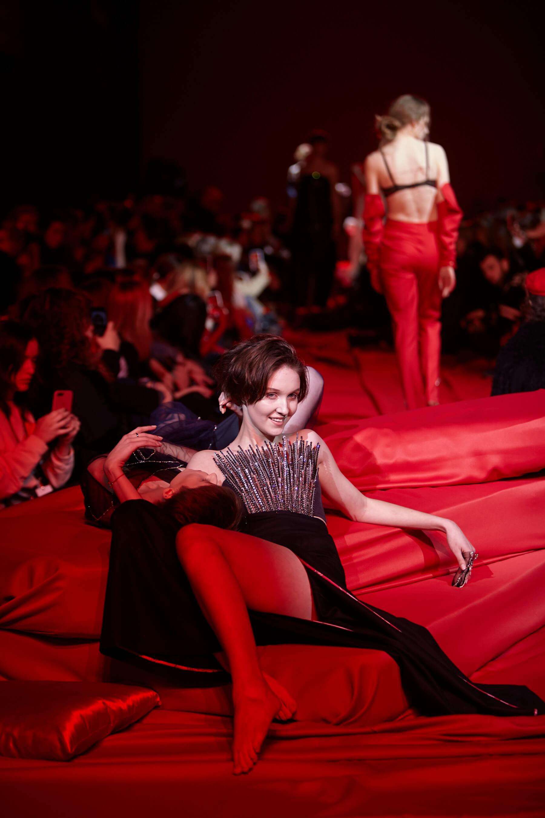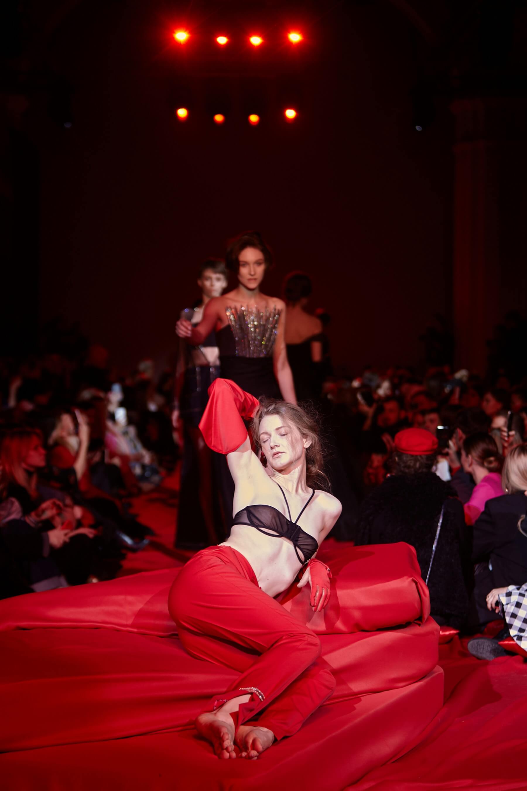 В соблазнительных платьях из десятков метров тюля, шелка и россыпи кристаллов девушки то царственно и игриво расходились в стороны, взаимодействуя с гостями показа, то извивались, будто в изнеможении прямо по алому подиуму. Модели также выходили парами, бережно опуская друг друга на матрасы, горой возвышающиеся в конце подиума, что выглядело скорее трогательно, чем агрессивно сексуально.