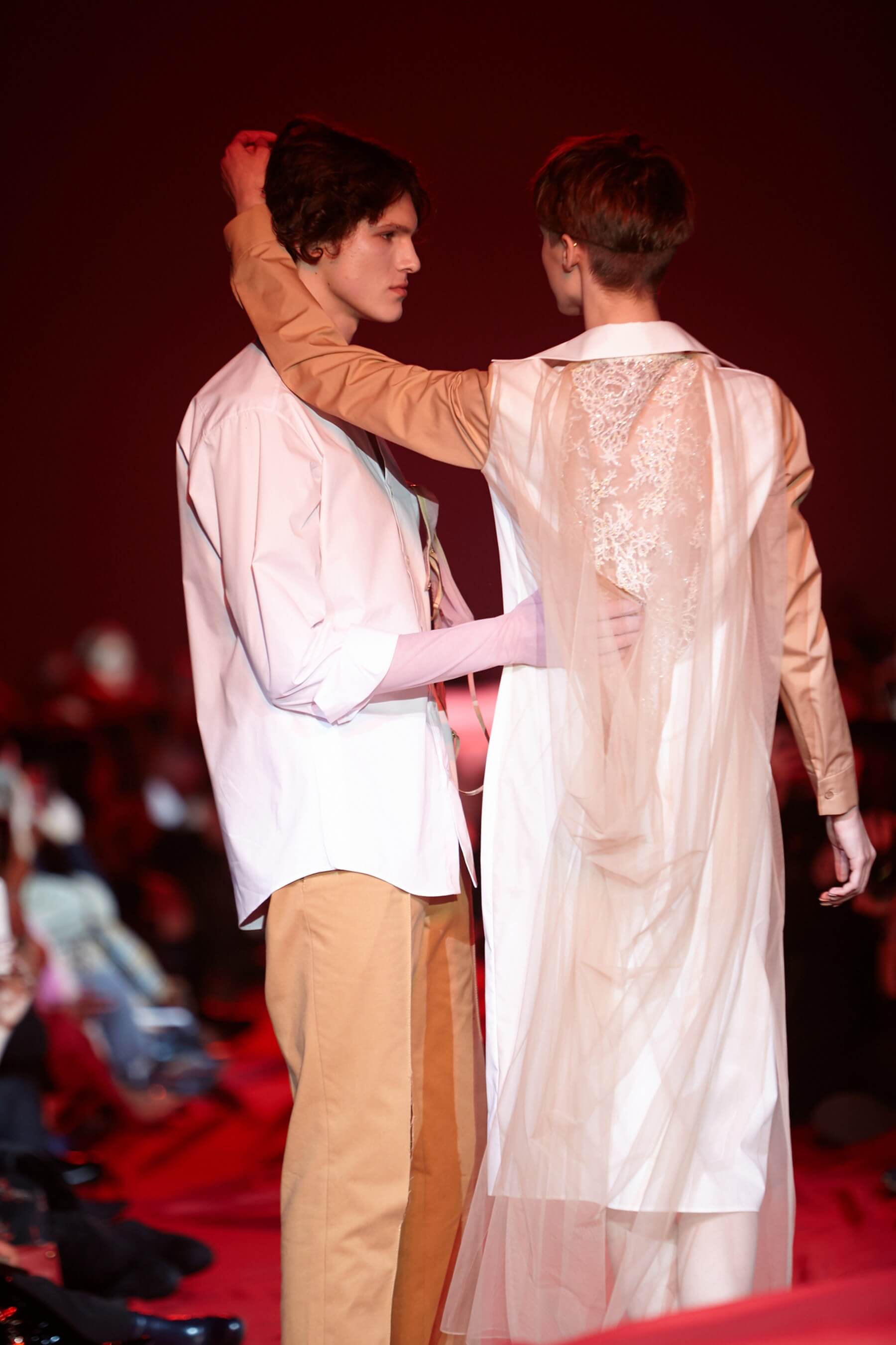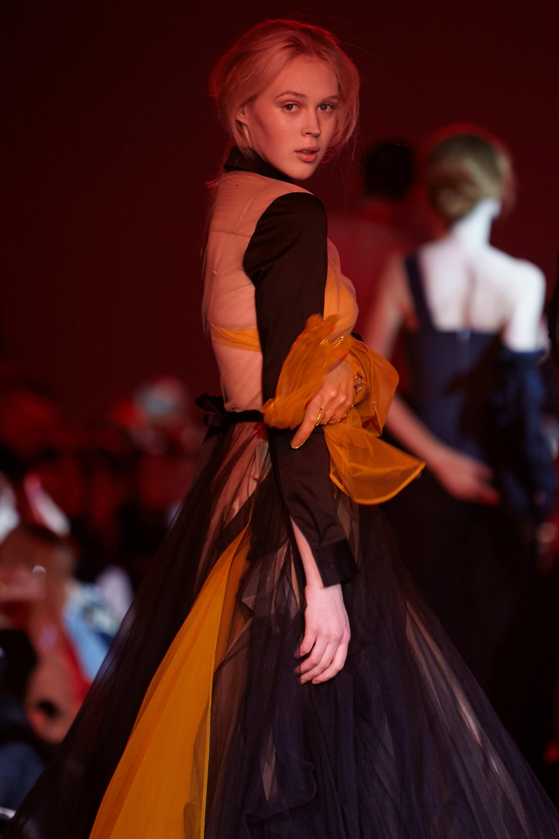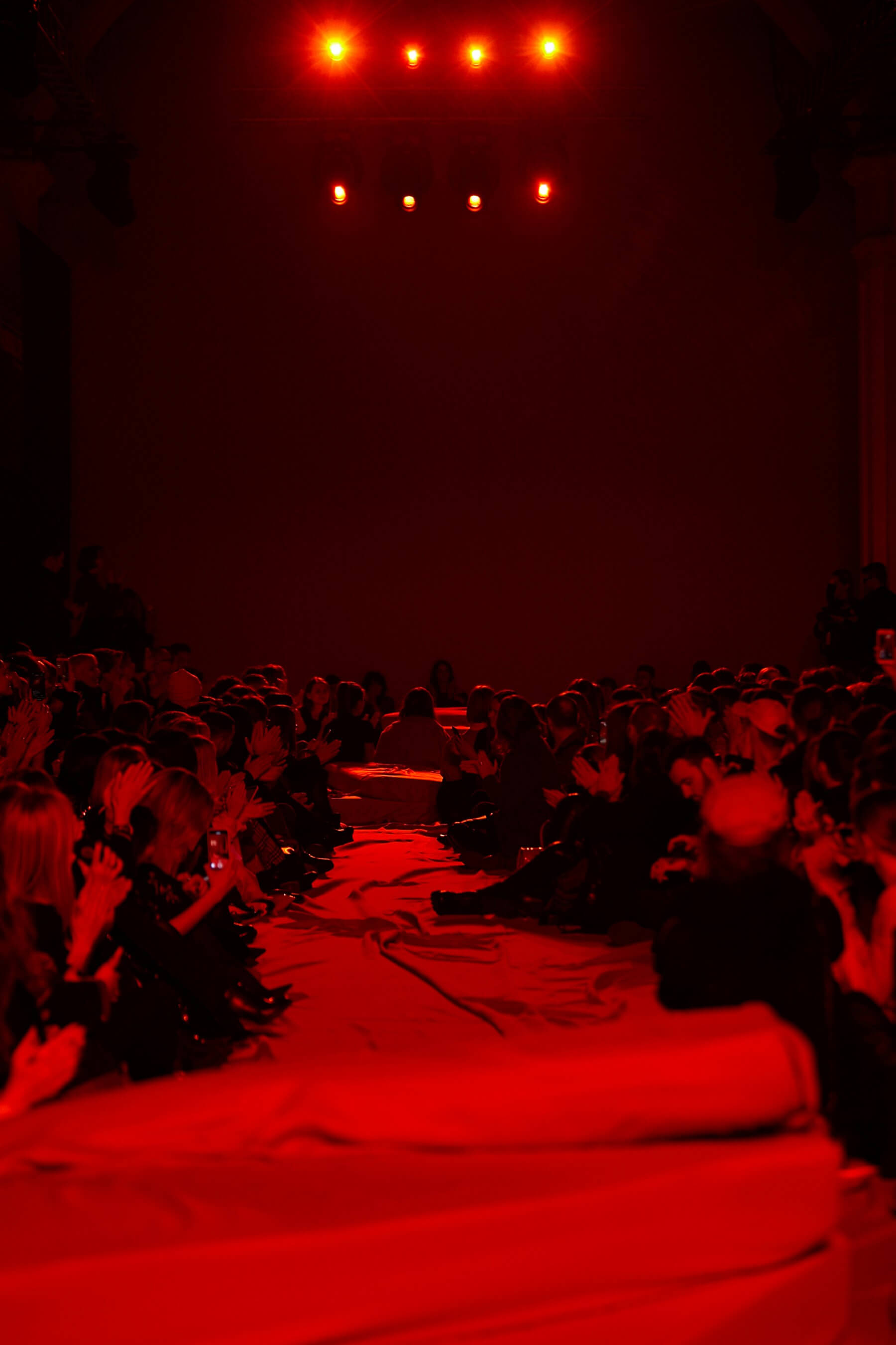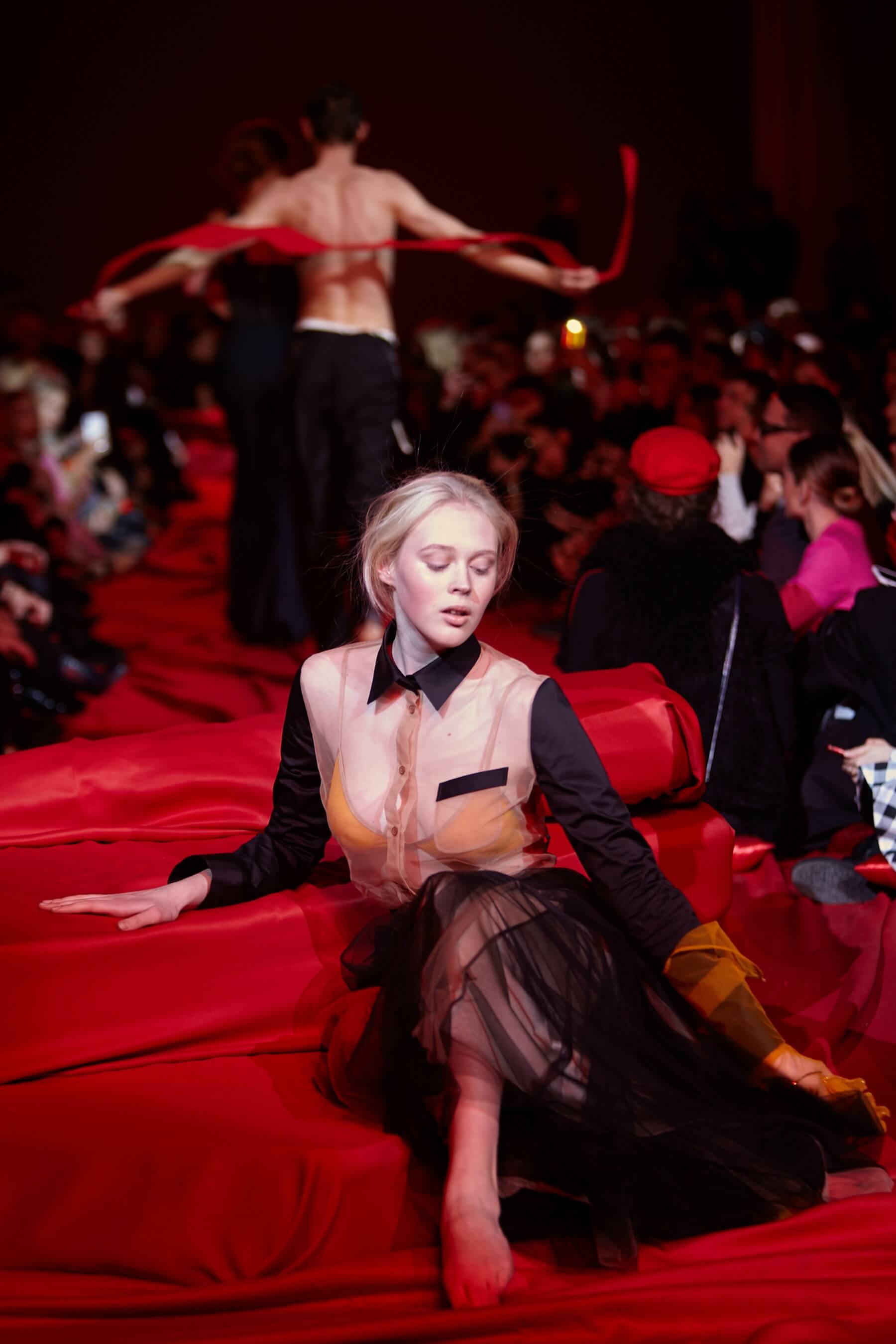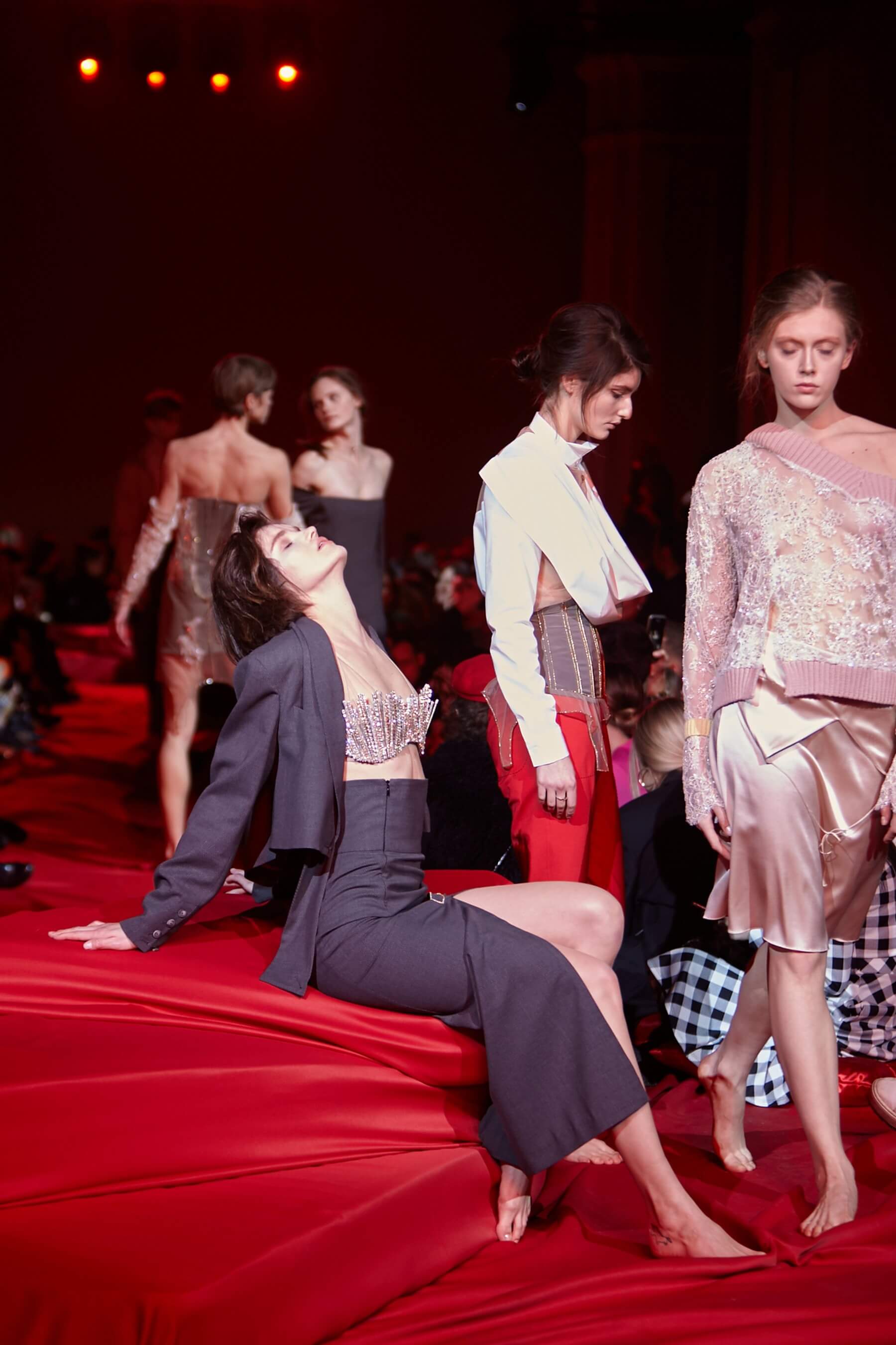 В соблазнительных платьях из десятков метров тюля, шелка и россыпи кристаллов девушки то царственно и игриво расходились в стороны, взаимодействуя с гостями показа, то извивались, будто в изнеможении прямо по алому подиуму. Модели также выходили парами, бережно опуская друг друга на матрасы, горой возвышающиеся в конце подиума, что выглядело скорее трогательно, чем агрессивно сексуально.