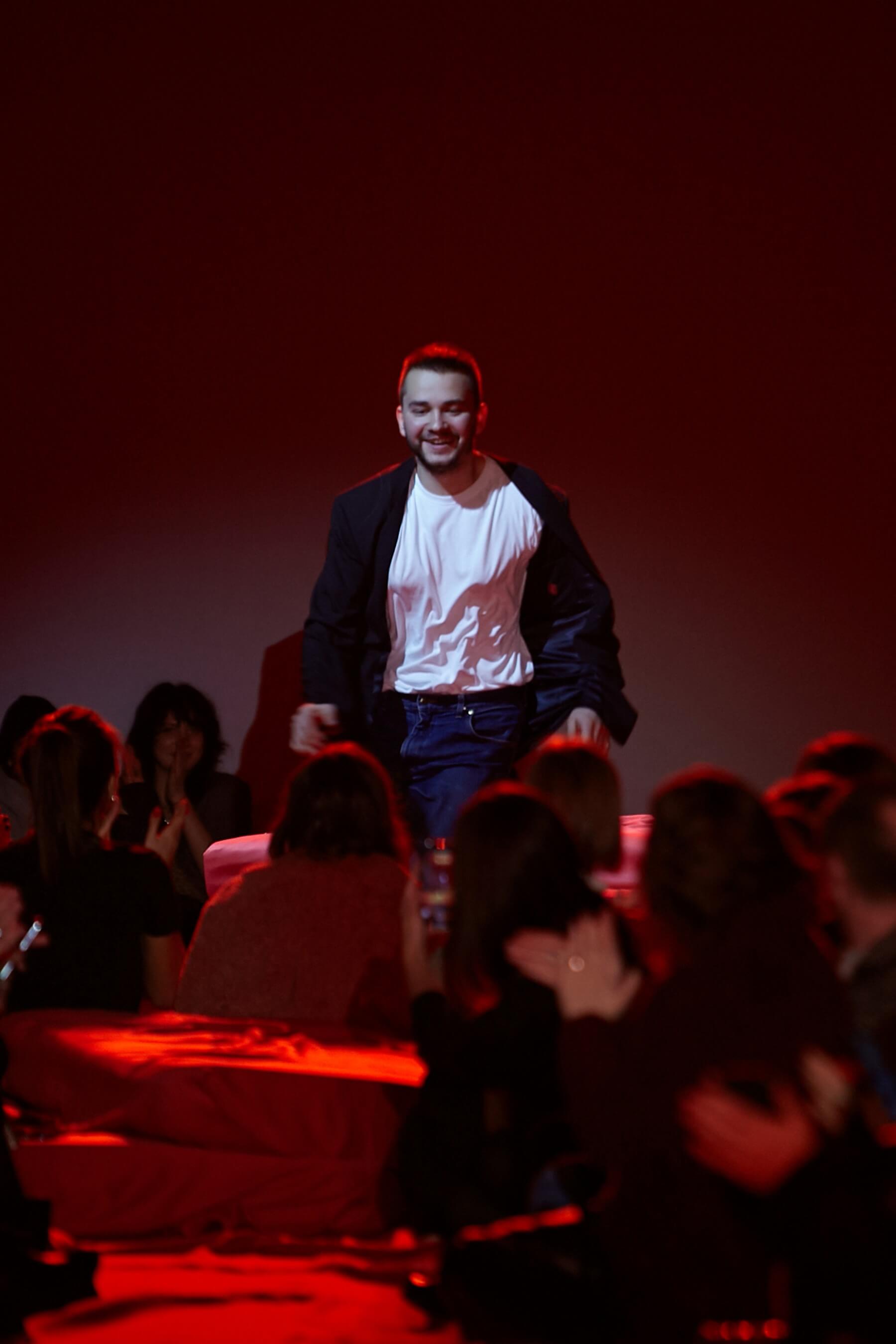 Дизайнер Иван Фролов погрузил гостей показа осенне-зимней коллекции в атмосферу интимной близости и чувственной истомы. Каждому гостю в руки давали алую подушку, на которой можно было удобно разместиться в любой выбранной точке подиума и гостевой зоны. В залитом красным цветом зале звучали чарующие голоса Эми Уайнхаус (Will you still love me tomorrow) и Анатолия Соловьяненко ("Дивлюсь я на небо"), под которые модели выплывали на подиум будто в драматически замедленном марше любви.