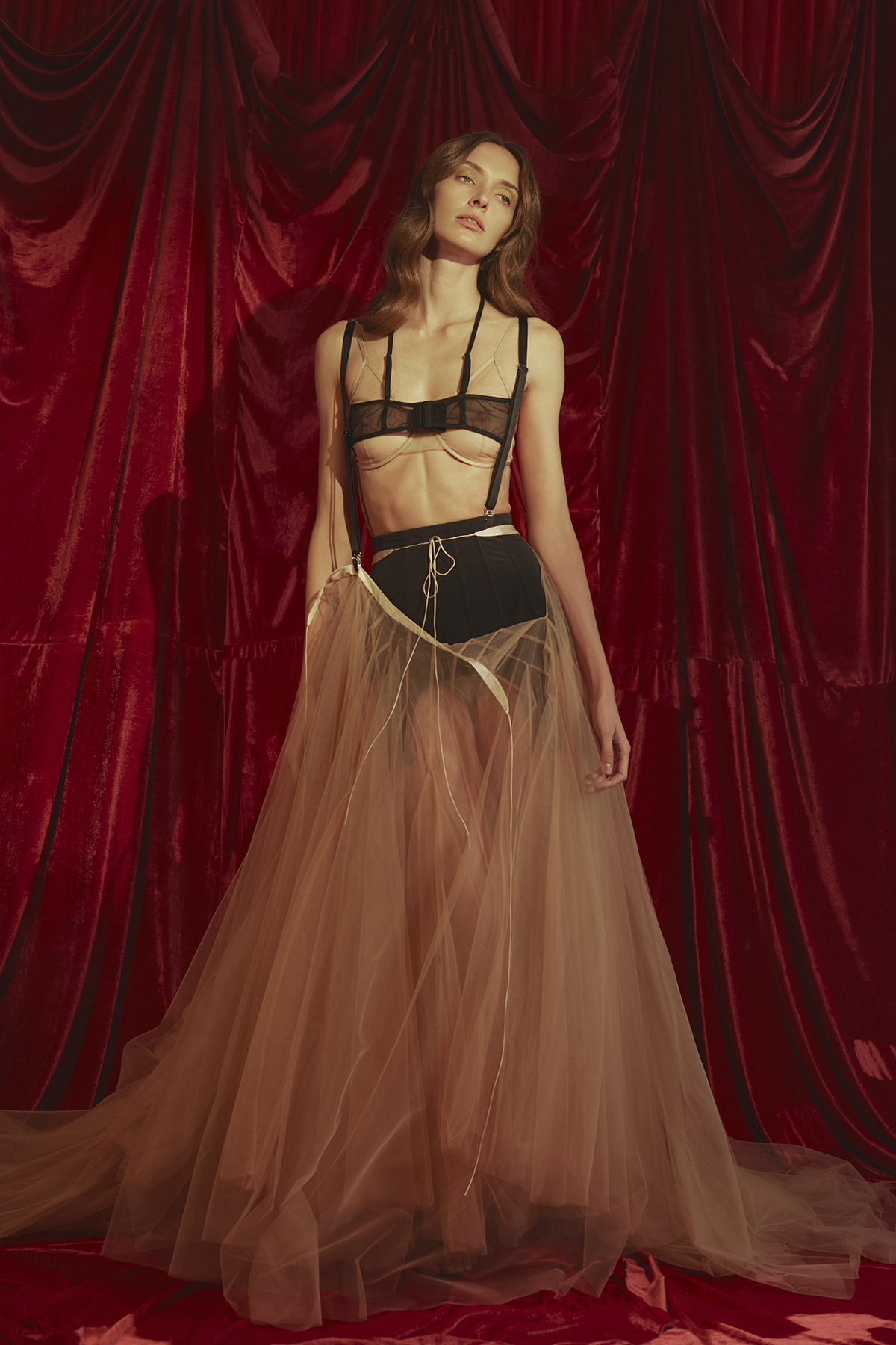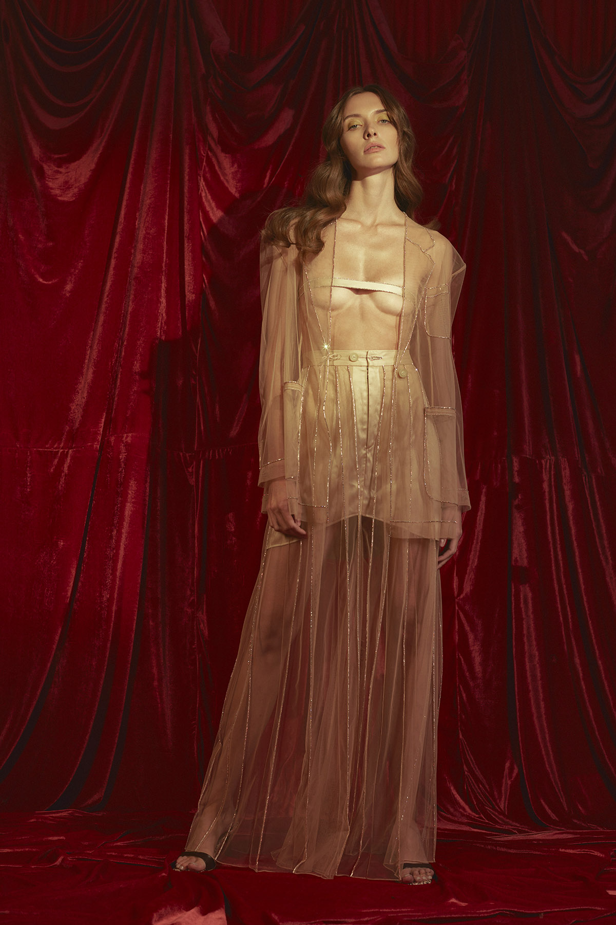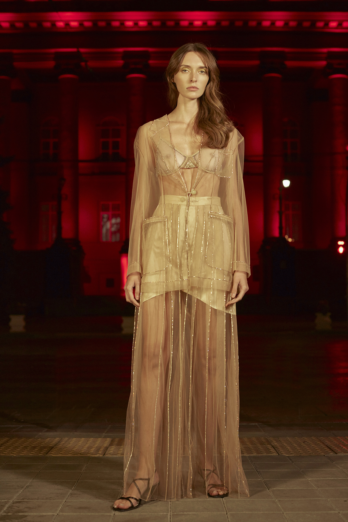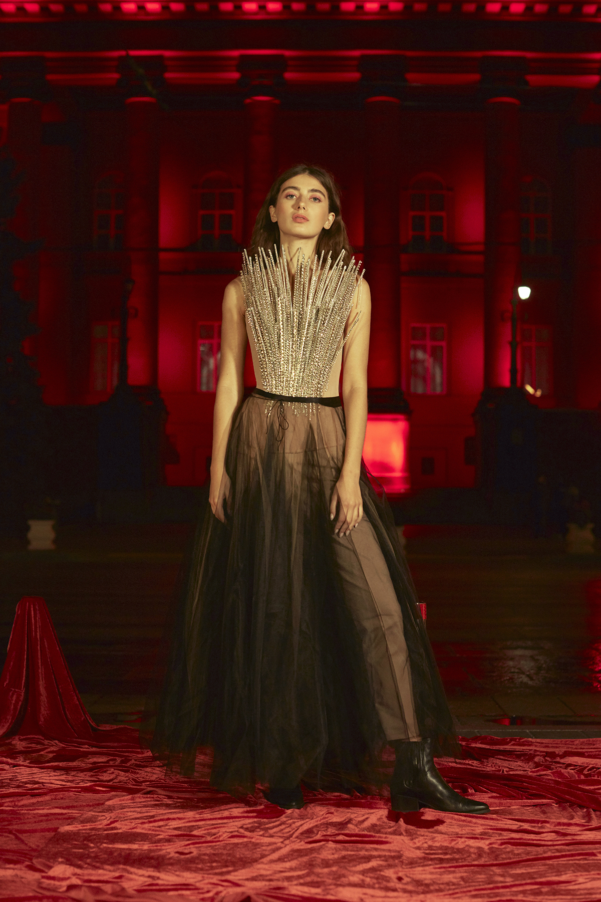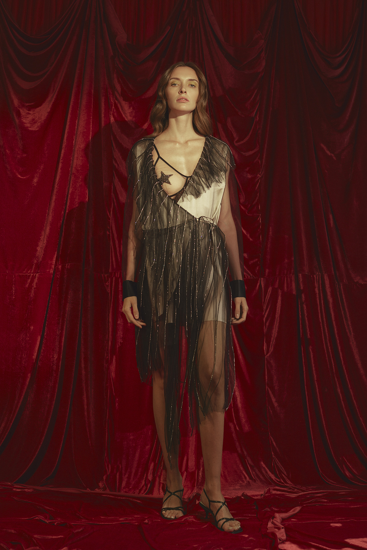 В этом году бренд отпраздновал пятилетие, и во многом это событие определило наполнение коллекции. Она состоит из бестселлеров и знаковых элементов: корсетов, полупрозрачных фактур, масок, поясов для чулок, мини-платьев, мерцающих текстур. Вещи дополнены вышивкой и кристаллами.