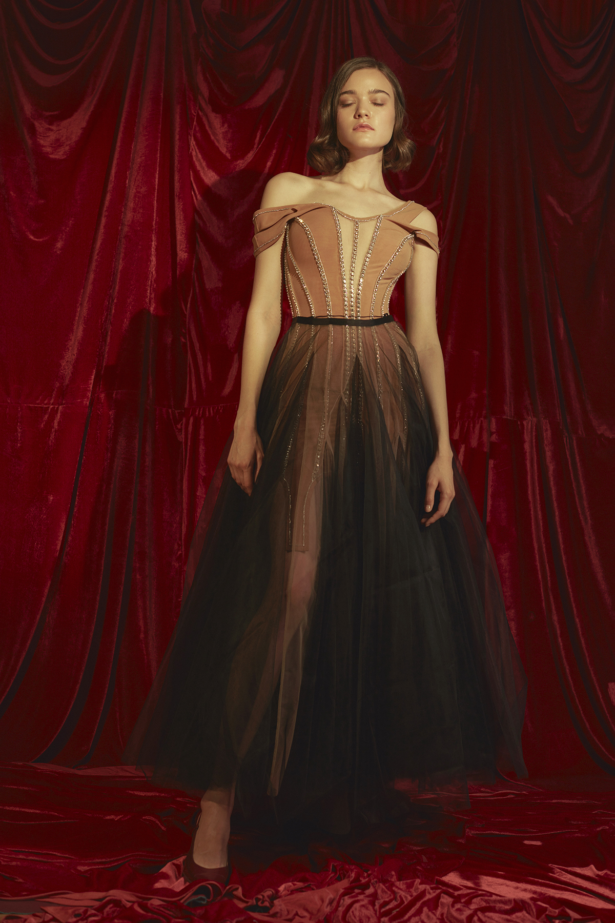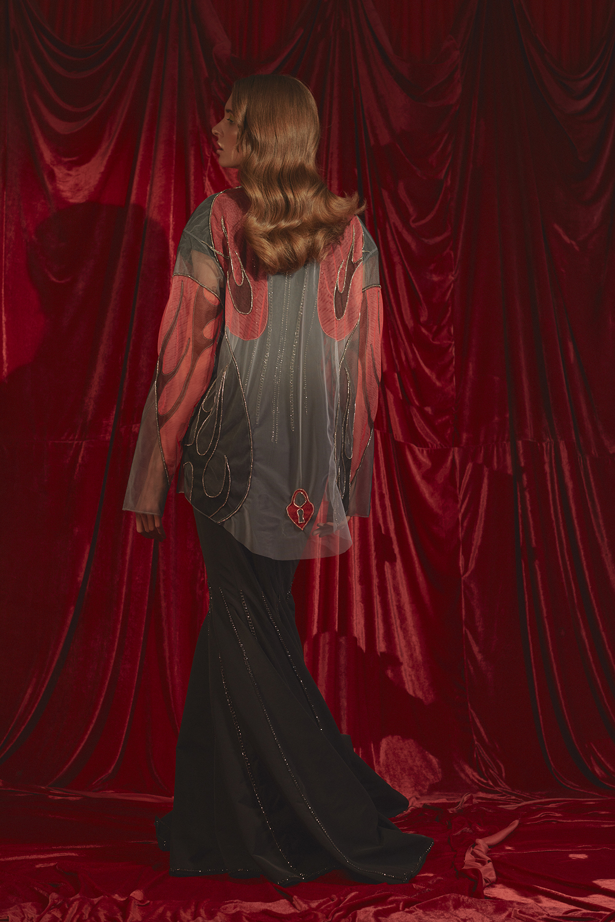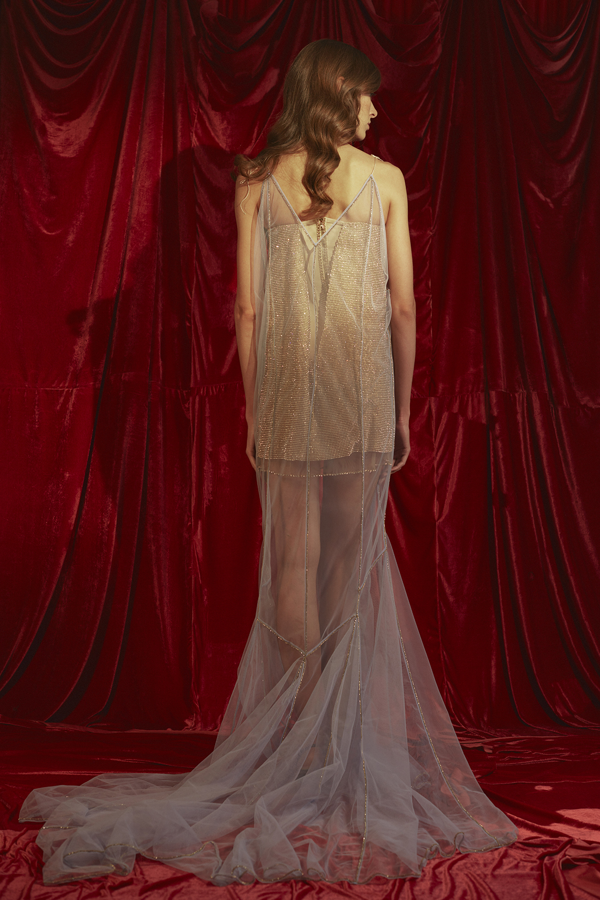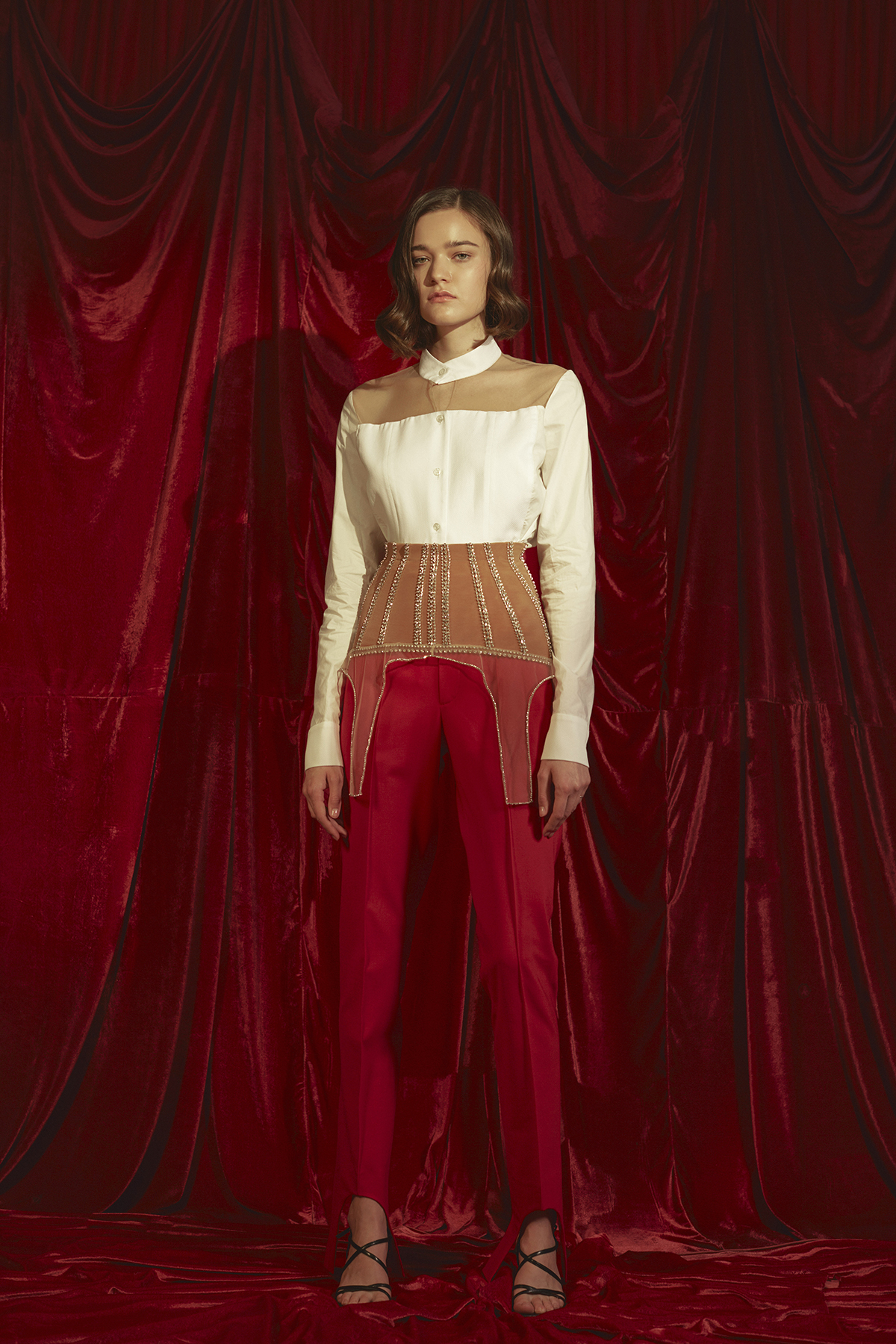 В этом году бренд отпраздновал пятилетие, и во многом это событие определило наполнение коллекции. Она состоит из бестселлеров и знаковых элементов: корсетов, полупрозрачных фактур, масок, поясов для чулок, мини-платьев, мерцающих текстур. Вещи дополнены вышивкой и кристаллами.