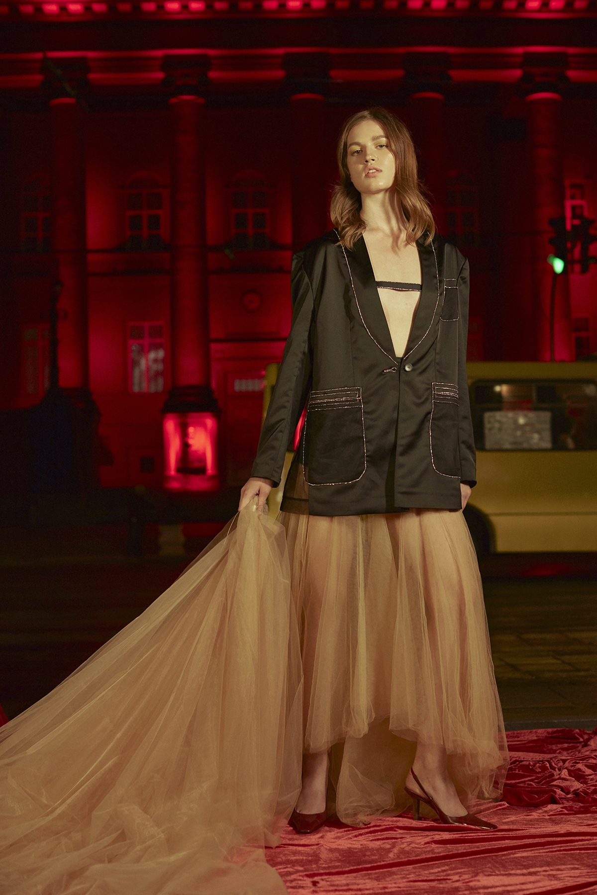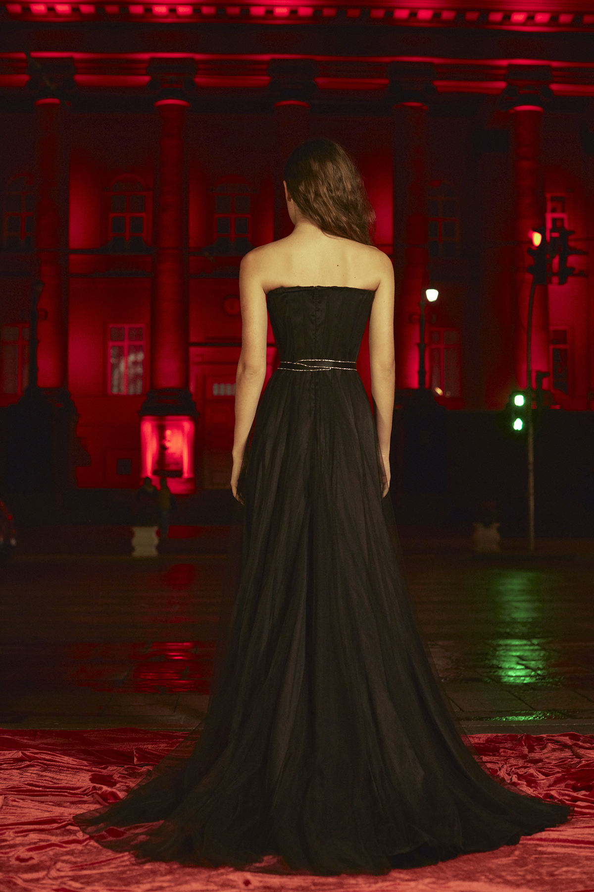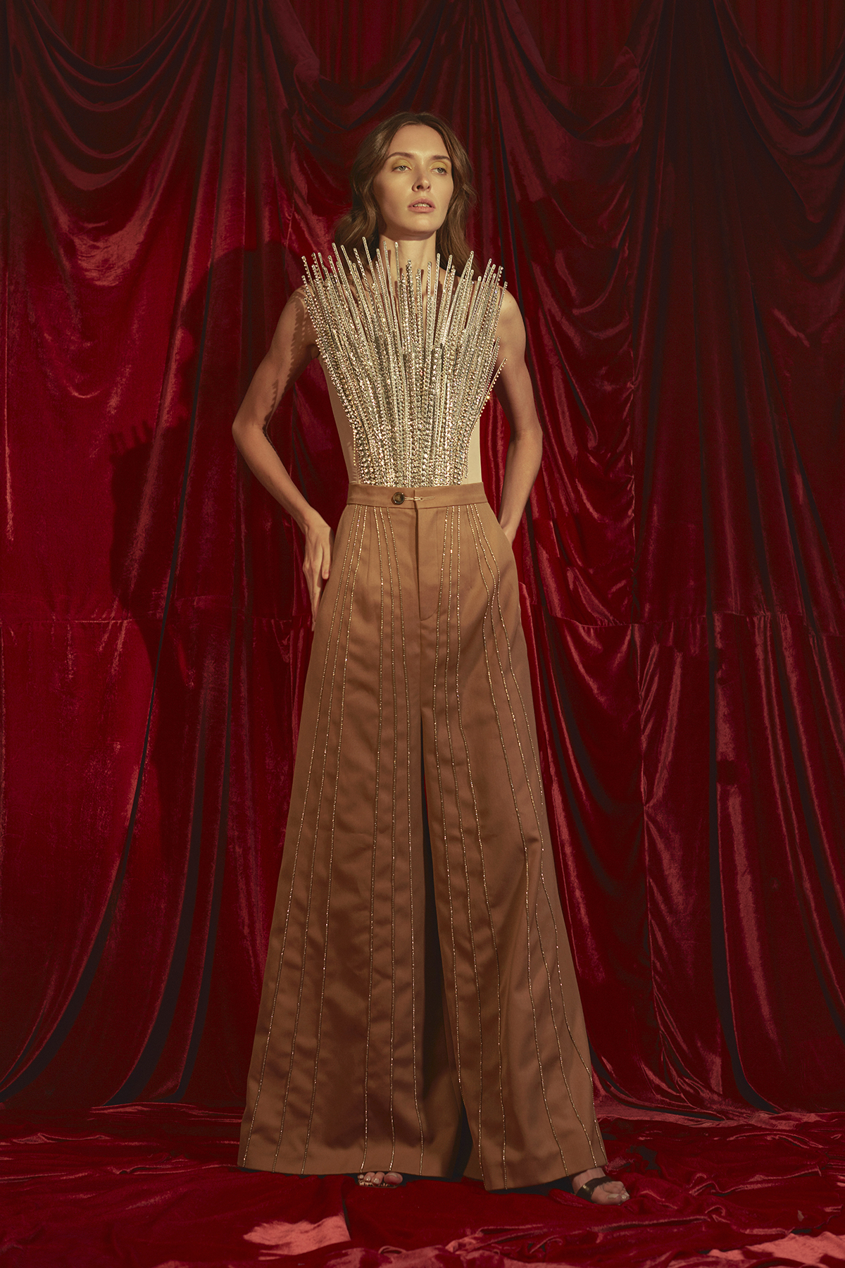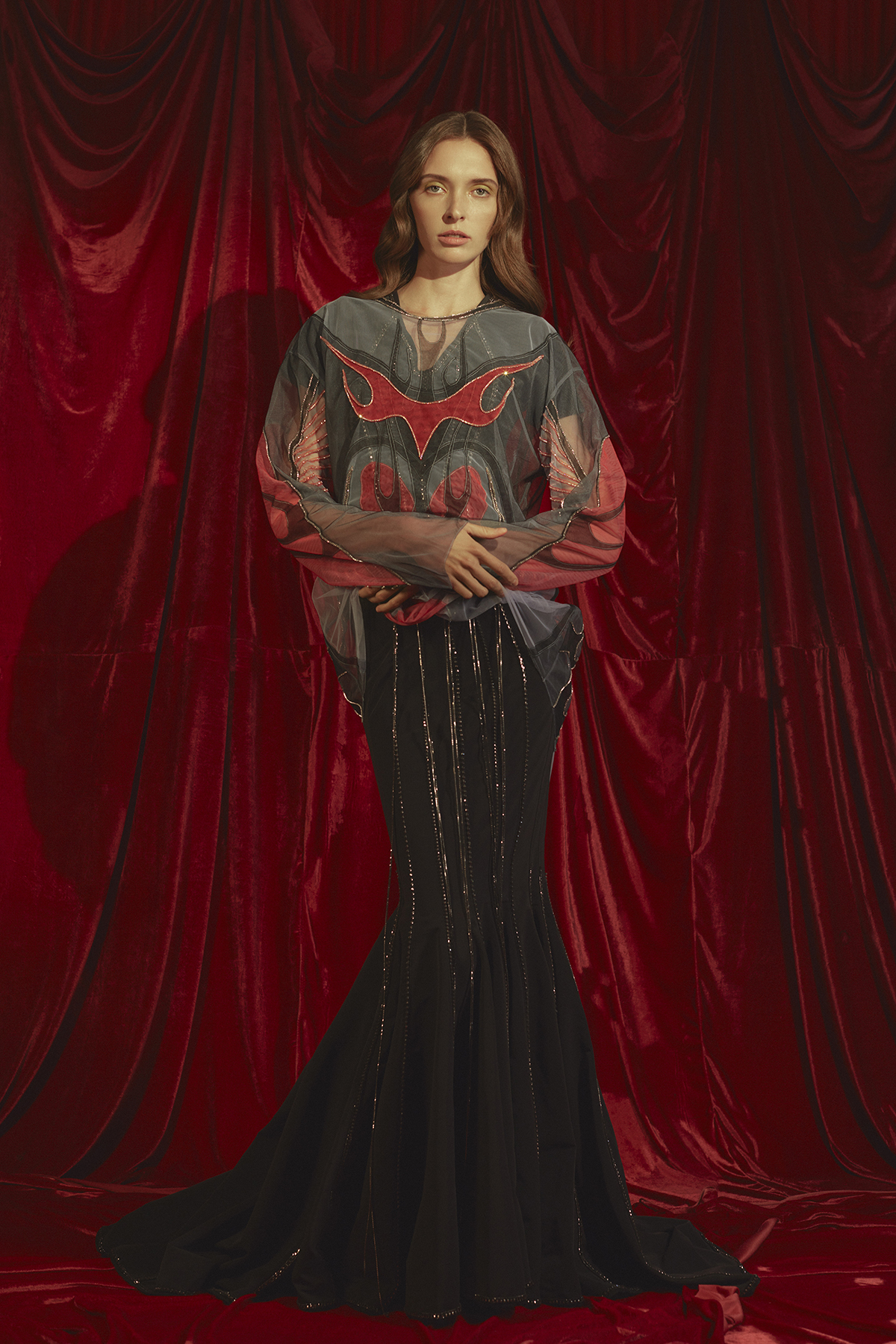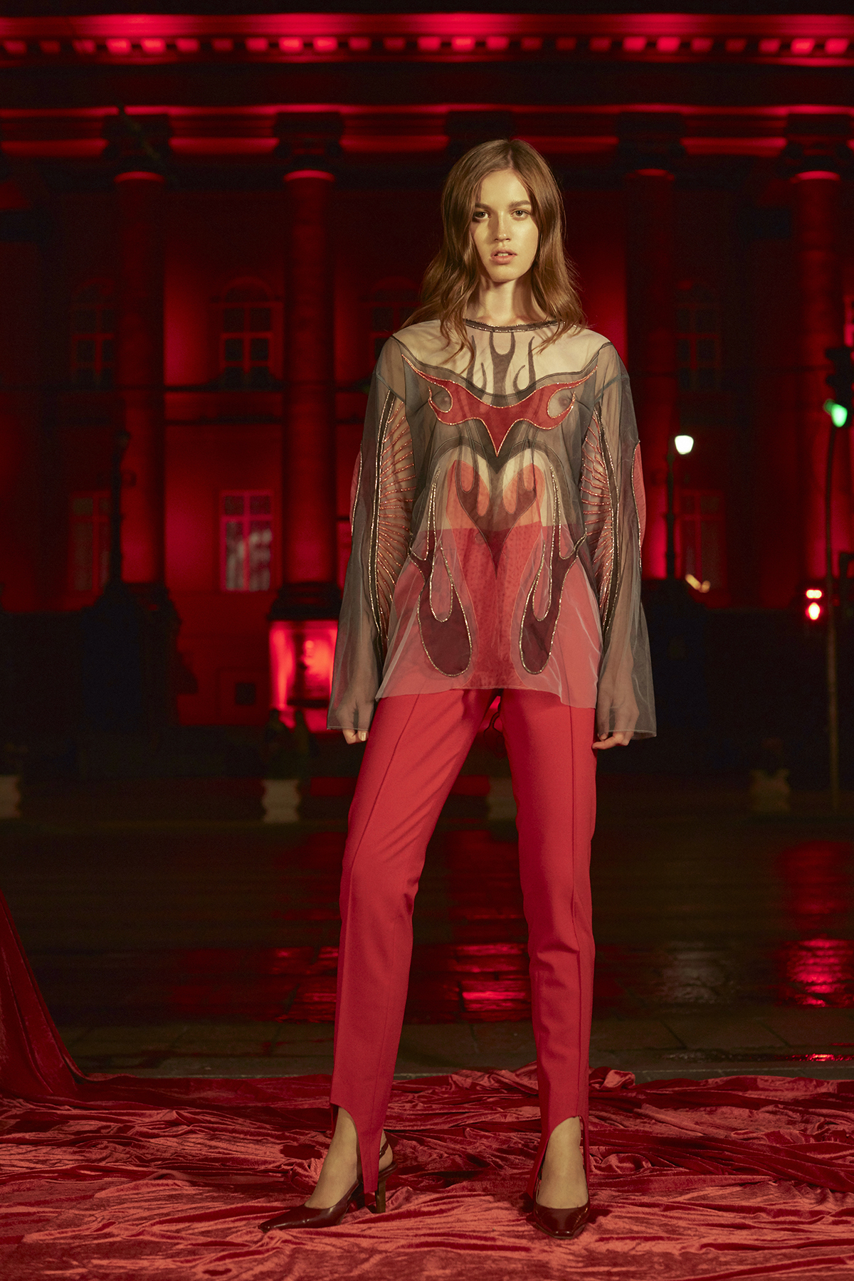 В этом году бренд отпраздновал пятилетие, и во многом это событие определило наполнение коллекции. Она состоит из бестселлеров и знаковых элементов: корсетов, полупрозрачных фактур, масок, поясов для чулок, мини-платьев, мерцающих текстур. Вещи дополнены вышивкой и кристаллами.