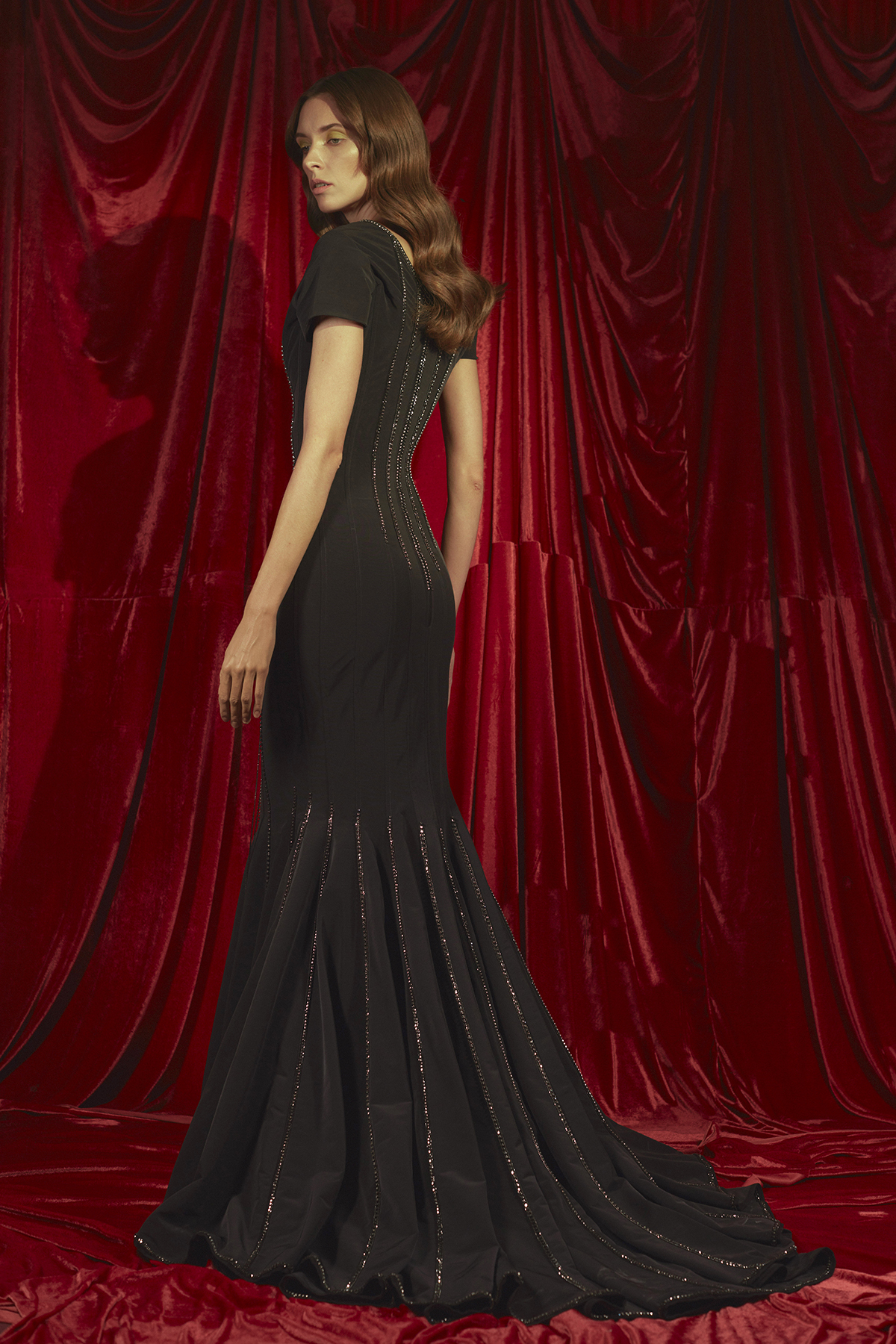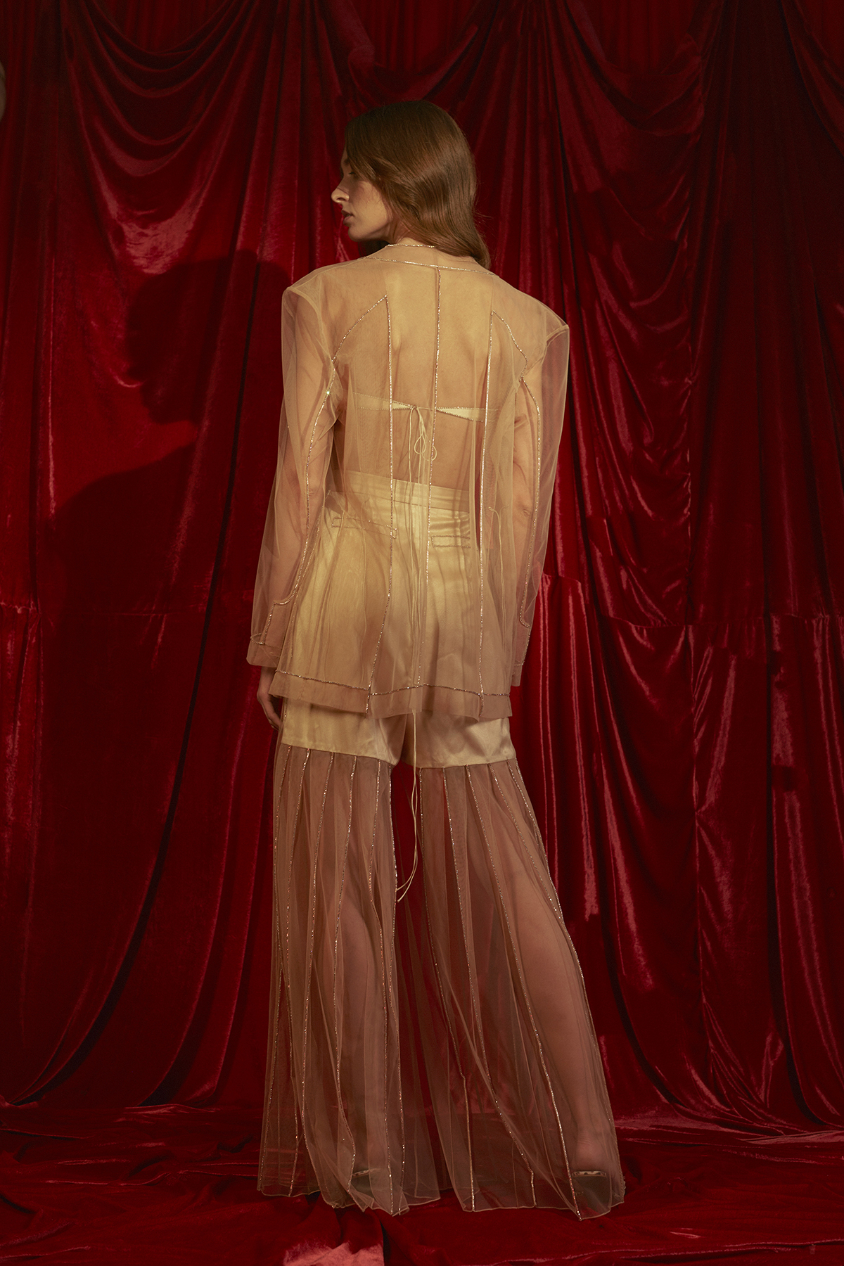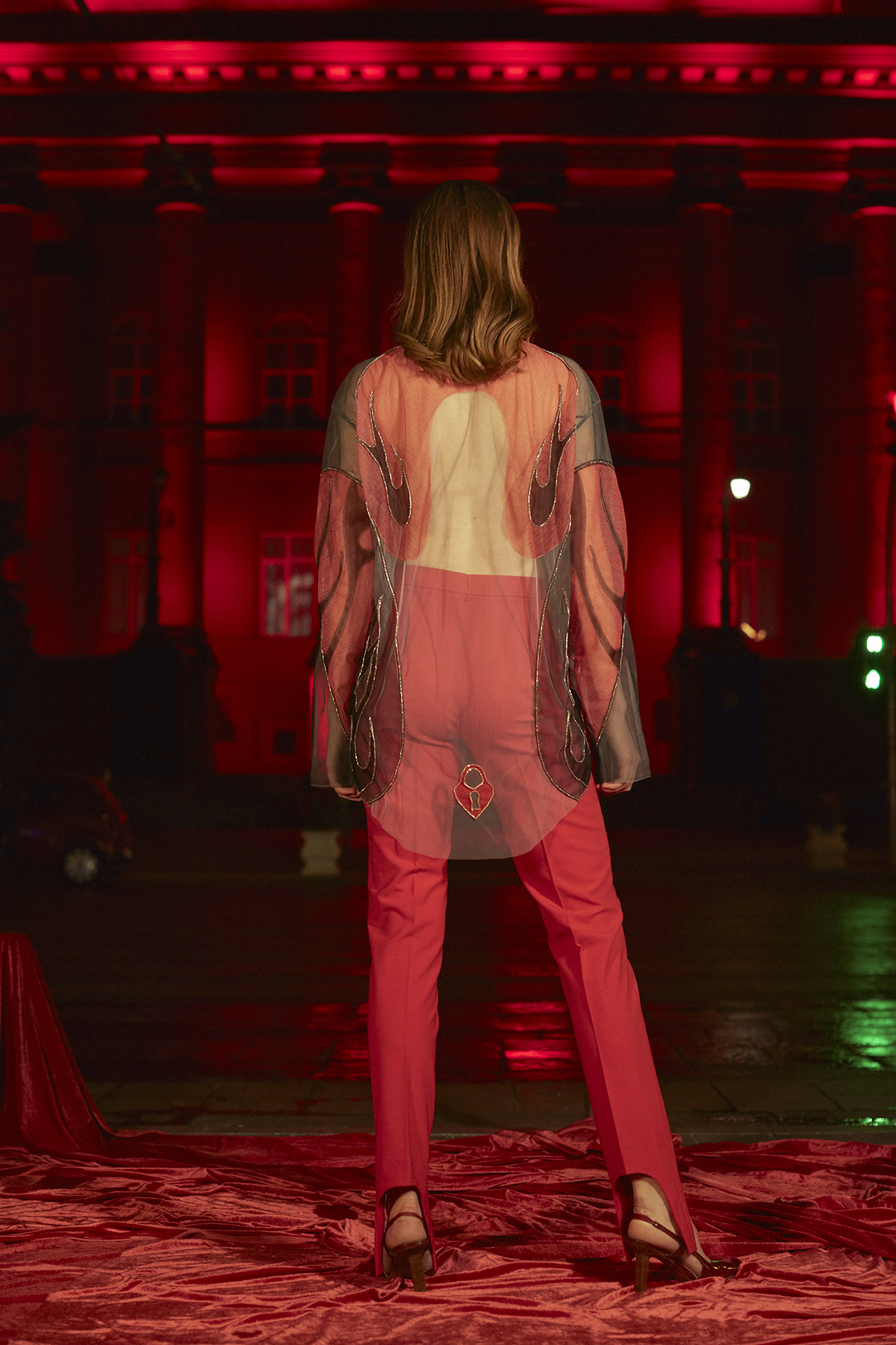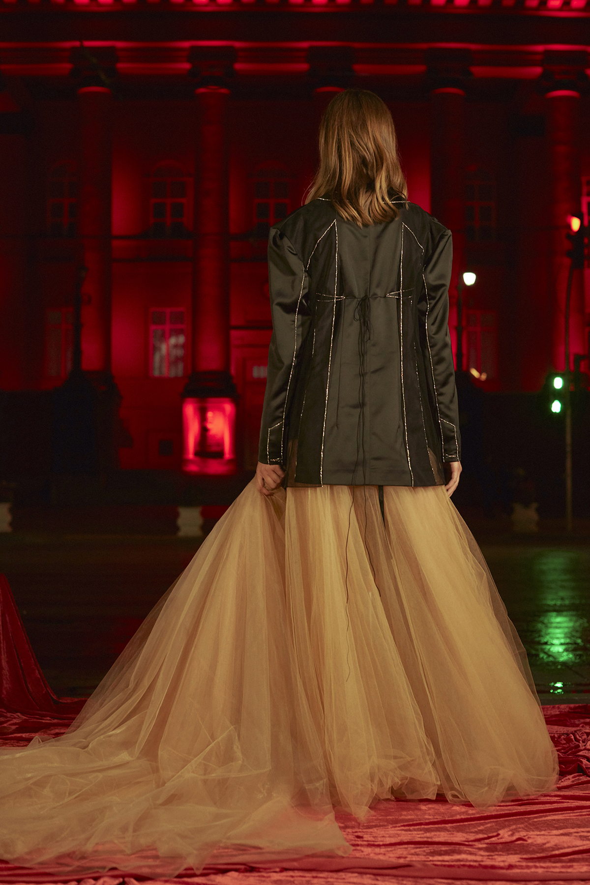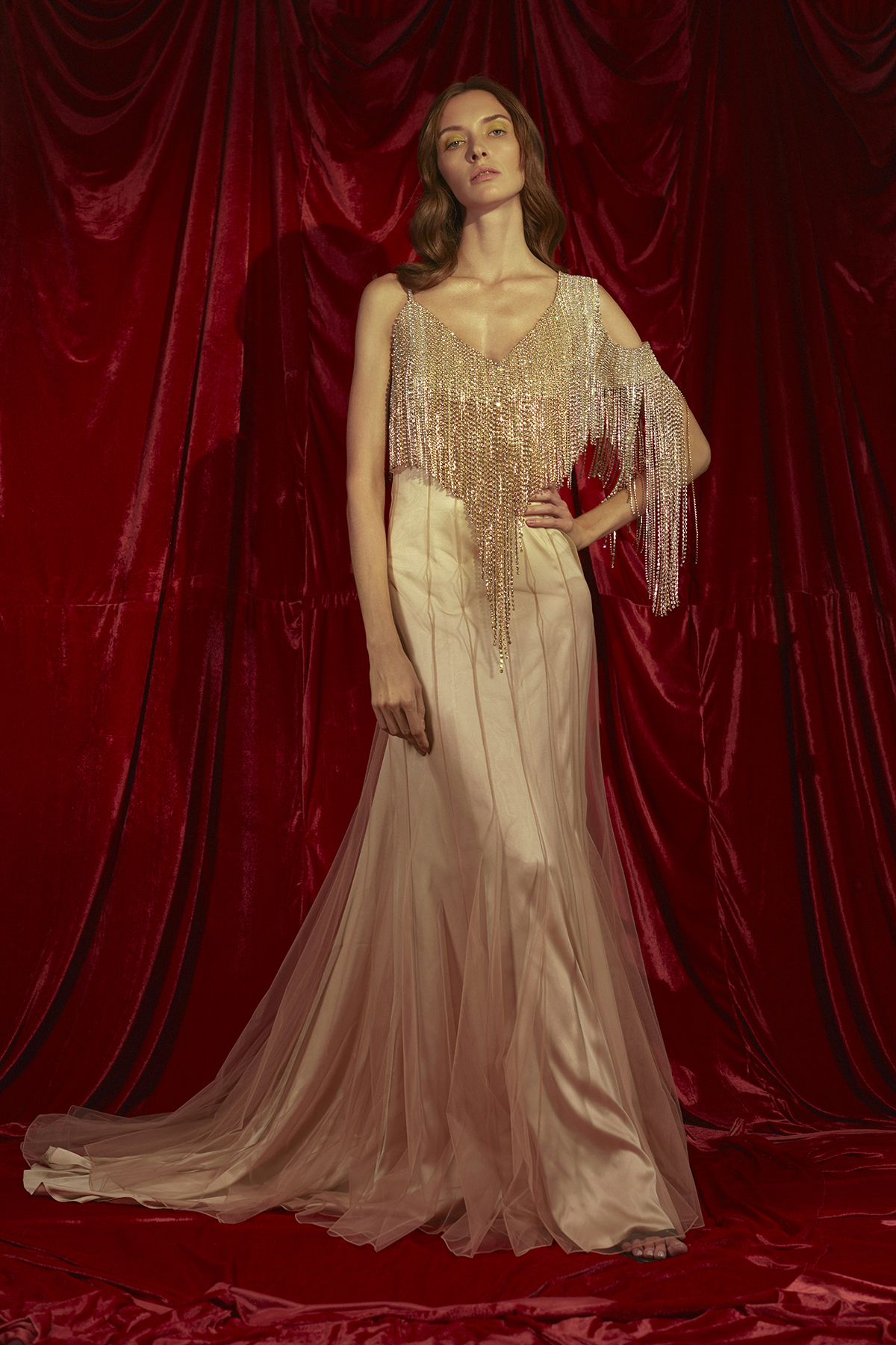 В этом году бренд отпраздновал пятилетие, и во многом это событие определило наполнение коллекции. Она состоит из бестселлеров и знаковых элементов: корсетов, полупрозрачных фактур, масок, поясов для чулок, мини-платьев, мерцающих текстур. Вещи дополнены вышивкой и кристаллами.