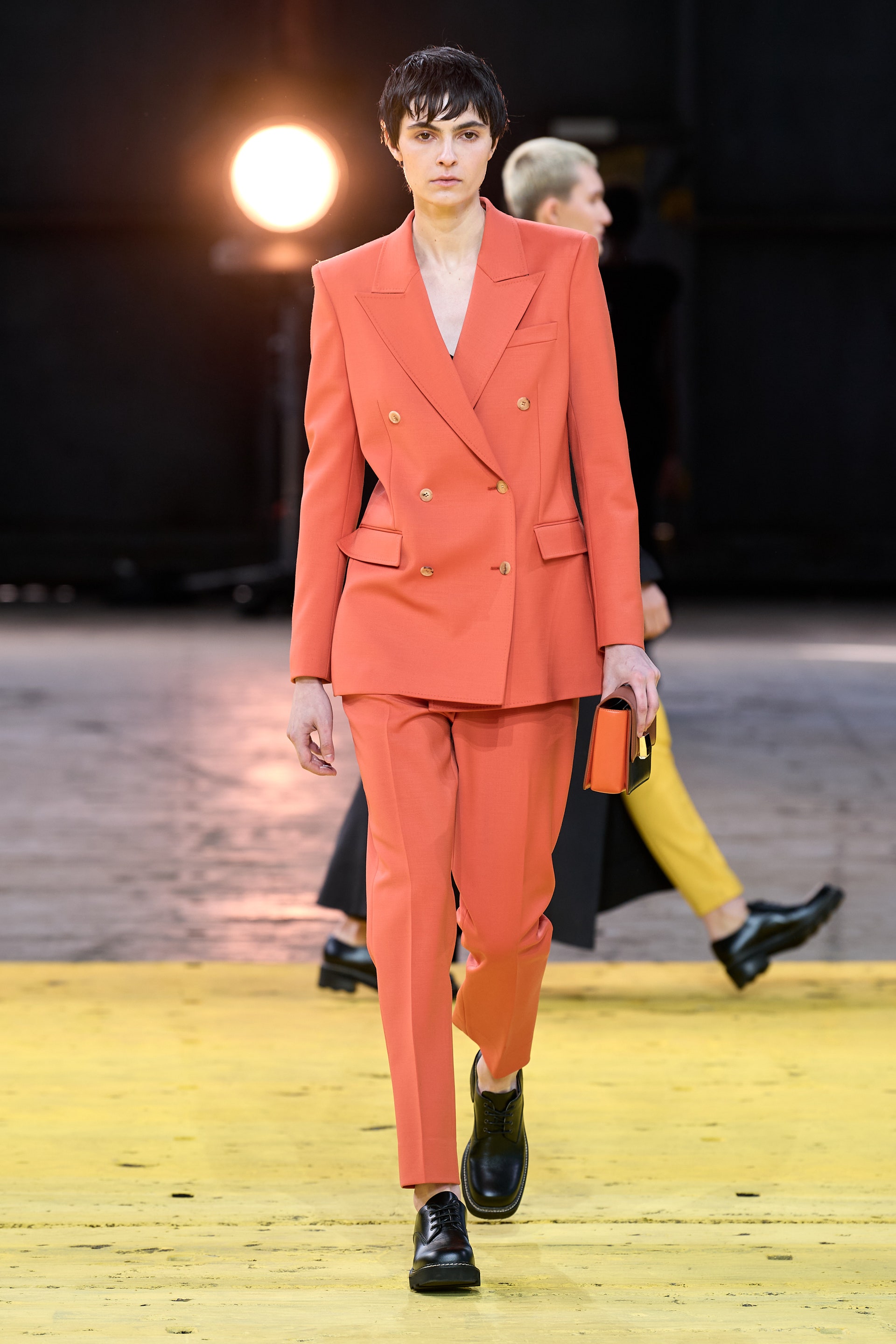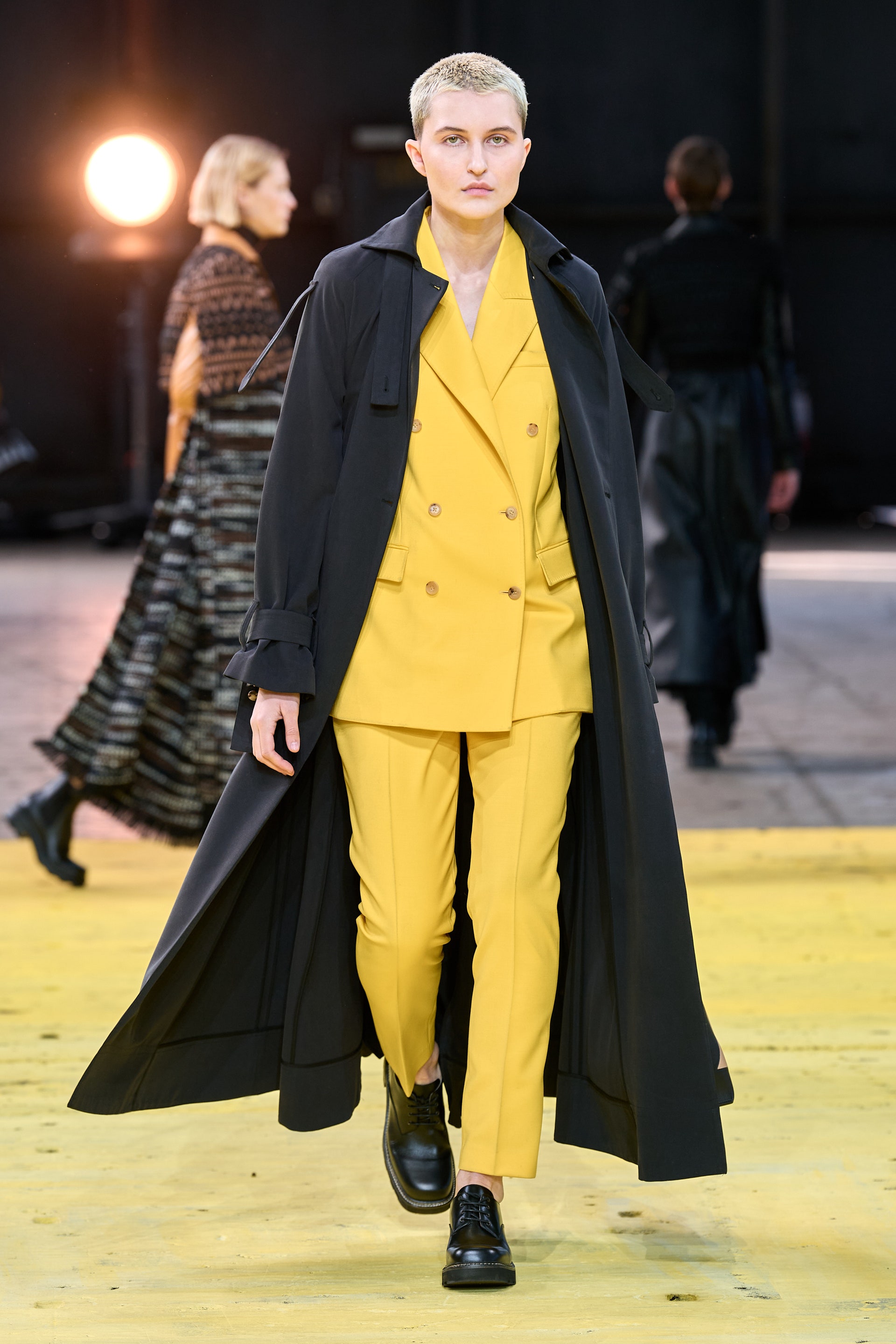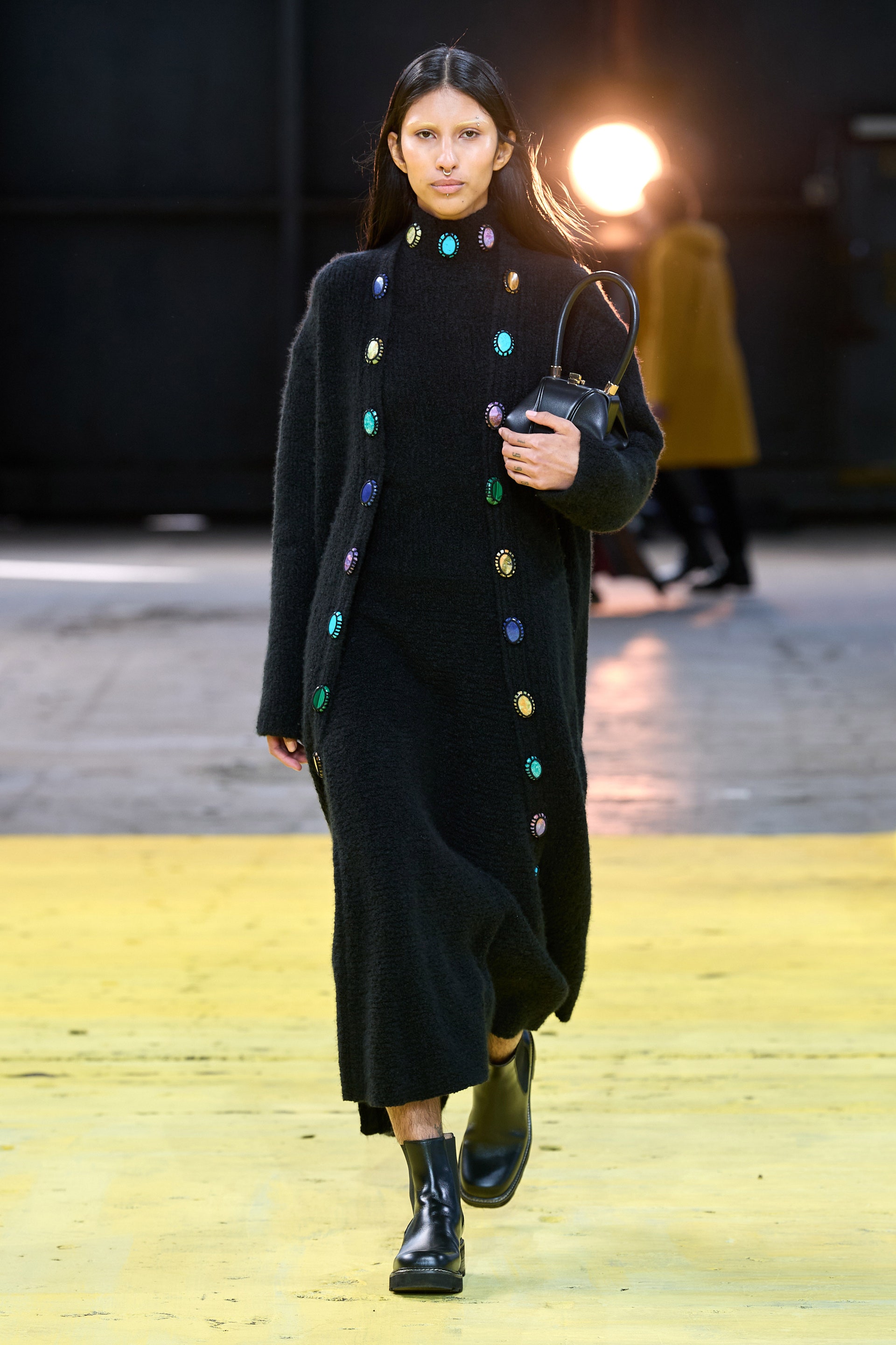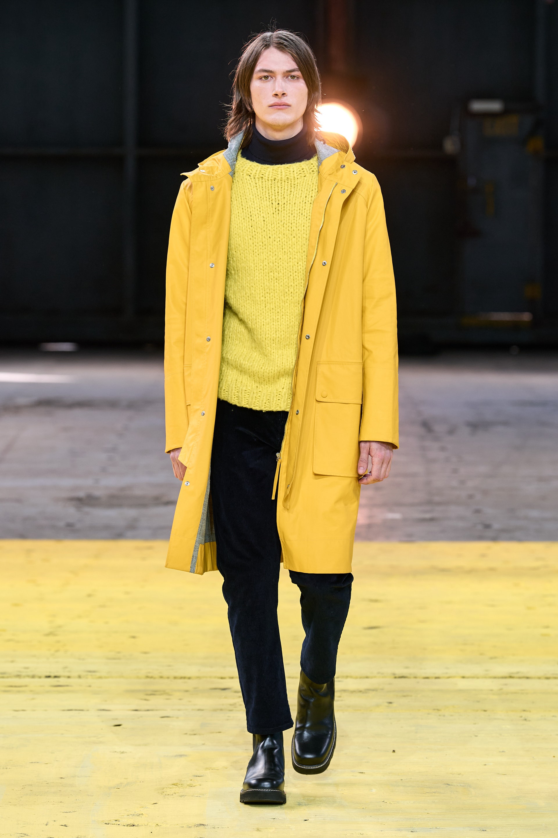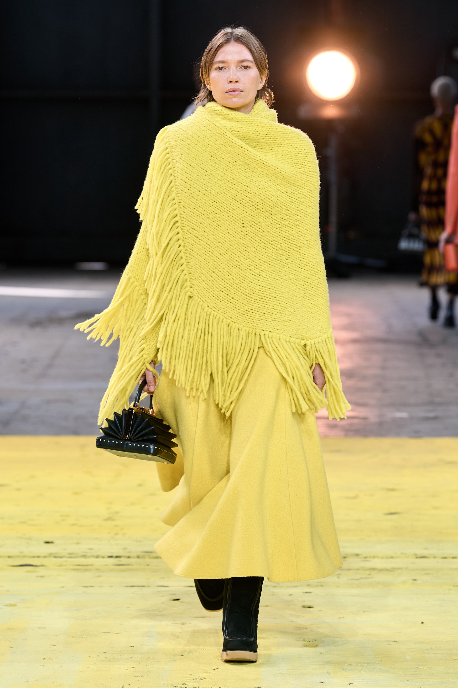 Дофаминовый гардероб остается одним из главных трендов последних сезонов. Оптимистичные оттенки и уверенные силуэты помогают справляться с плохим настроением и поддерживать веру в будущее. В новой коллекции Габриэлы Херст есть все для этого: пончо и плащи солнечного желтого цвета, пудрово-розовые юбки и свитеры. Цвета, материалы и силуэты на подиуме были одинаковыми для мужчин и женщин: пушистые шарфы, элегантные пальто и брючные костюмы, универсальные куртки прямого кроя. В качестве аксессуаров Херст представила линию сумок и клатчей в виде раскрытых книг в прочных переплетах.