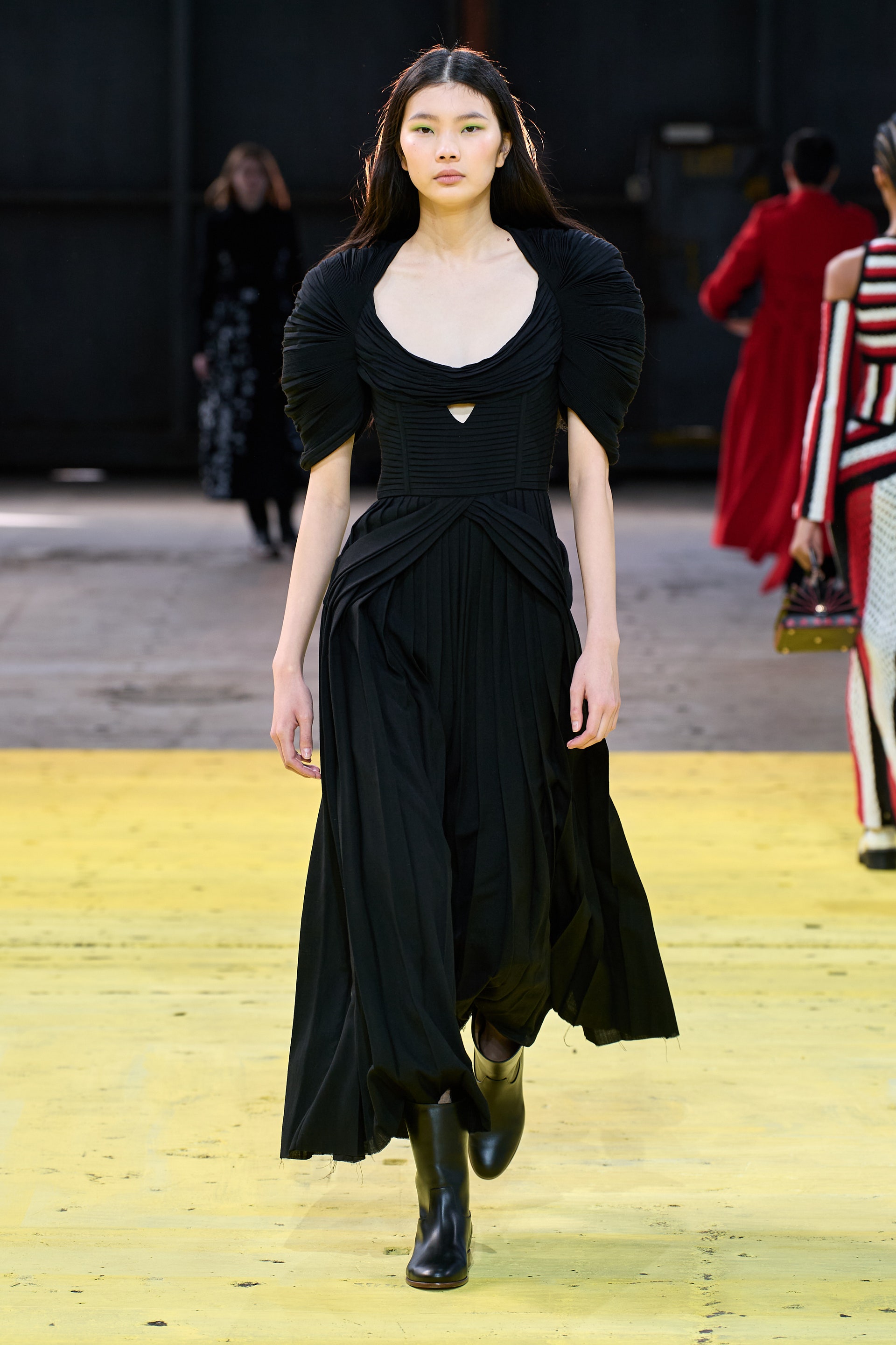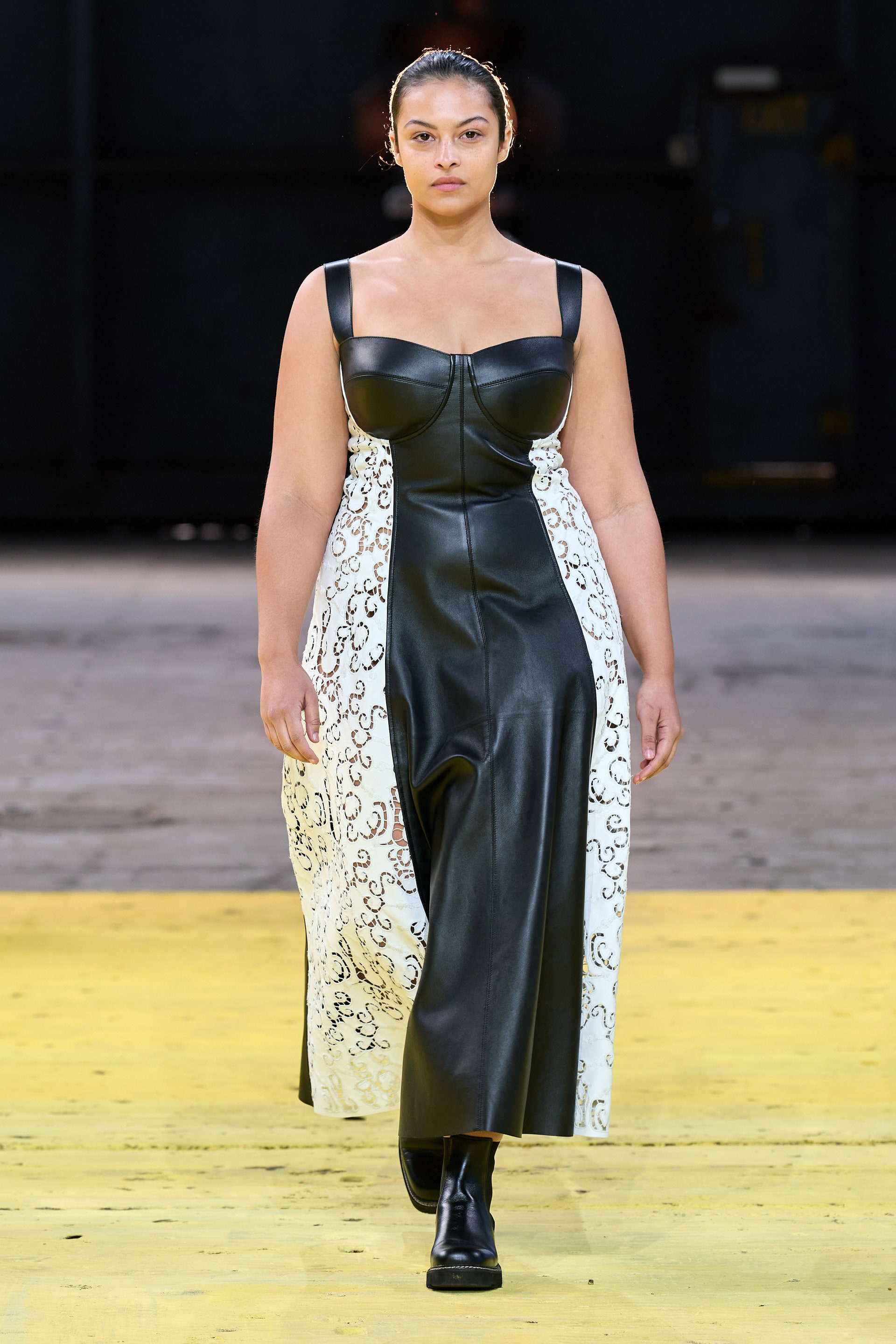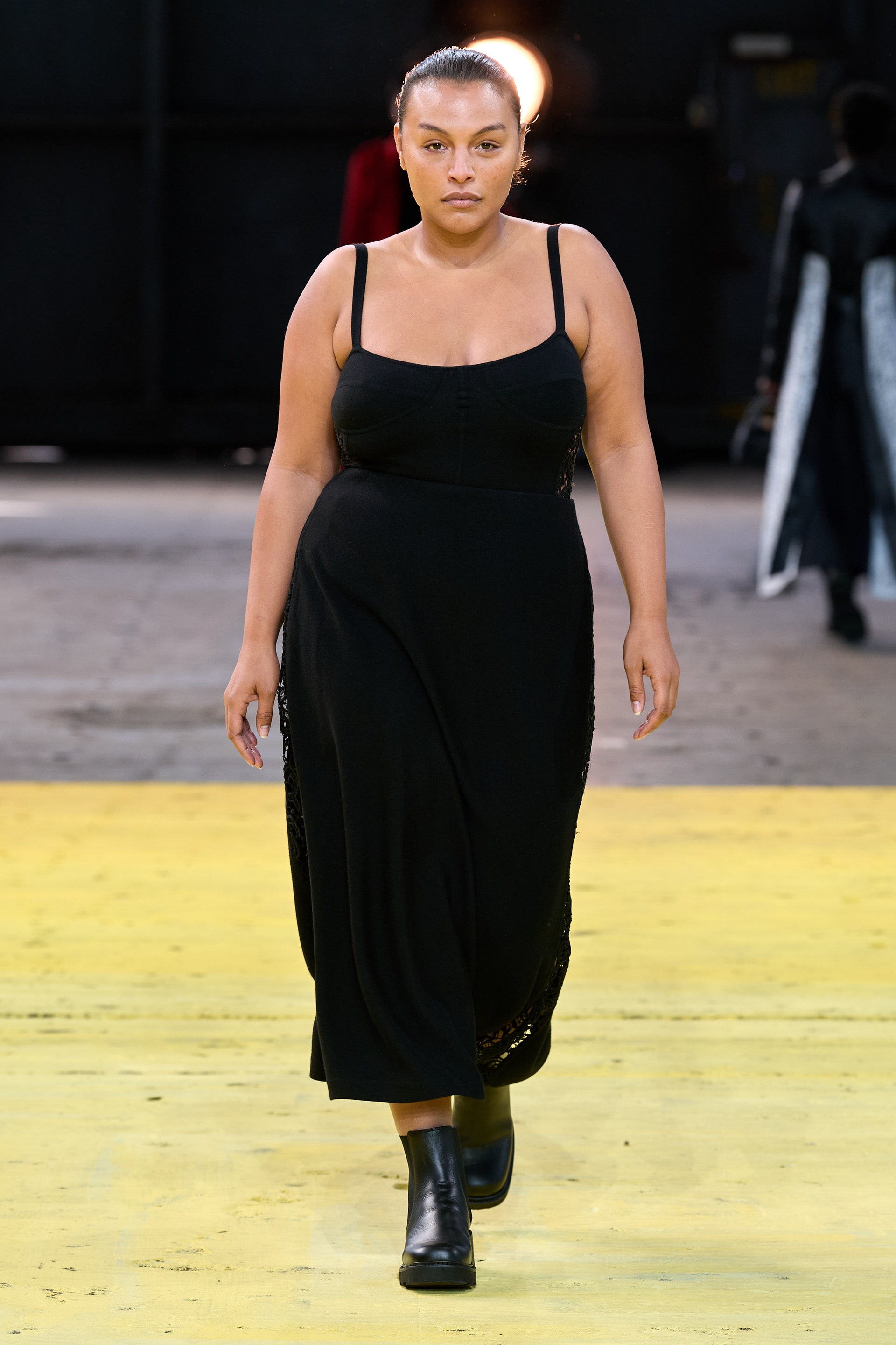 Сочных оттенков цитрина, арбуза, дыни и манго команда добилась при помощи природных красителей, а вязаные вещи, как и всегда, были произведены женской ремесленной школой Manos De Uruguay. Творчество Габриэлы Херст бескомпромиссно подчинено ответственному использованию ресурсов и заботе об окружающей среде. Одним из ключевых источников вдохновения для дизайнера также остается искусство Латинской Америки. В этом сезоне эффектное пончо украсила картина художницы Анны Мартинес Оризондо — ветвистое мистическое дерево. В узорах, связанных крючком, на платье макси, топе и юбке миди угадывается стилизация перьев павлина или мифической огненной птицы. Показ закрыла супермодель Эмбер Валлетта в двубортном костюме из плотного трикотажа. Перед ней на подиуме появились модели в платьях сложных конструкций, напоминающих доспехи. Драпировки для них выполняли в известном нью-йоркском районе Гармент, в котором расположено наибольшее количество модных ателье.