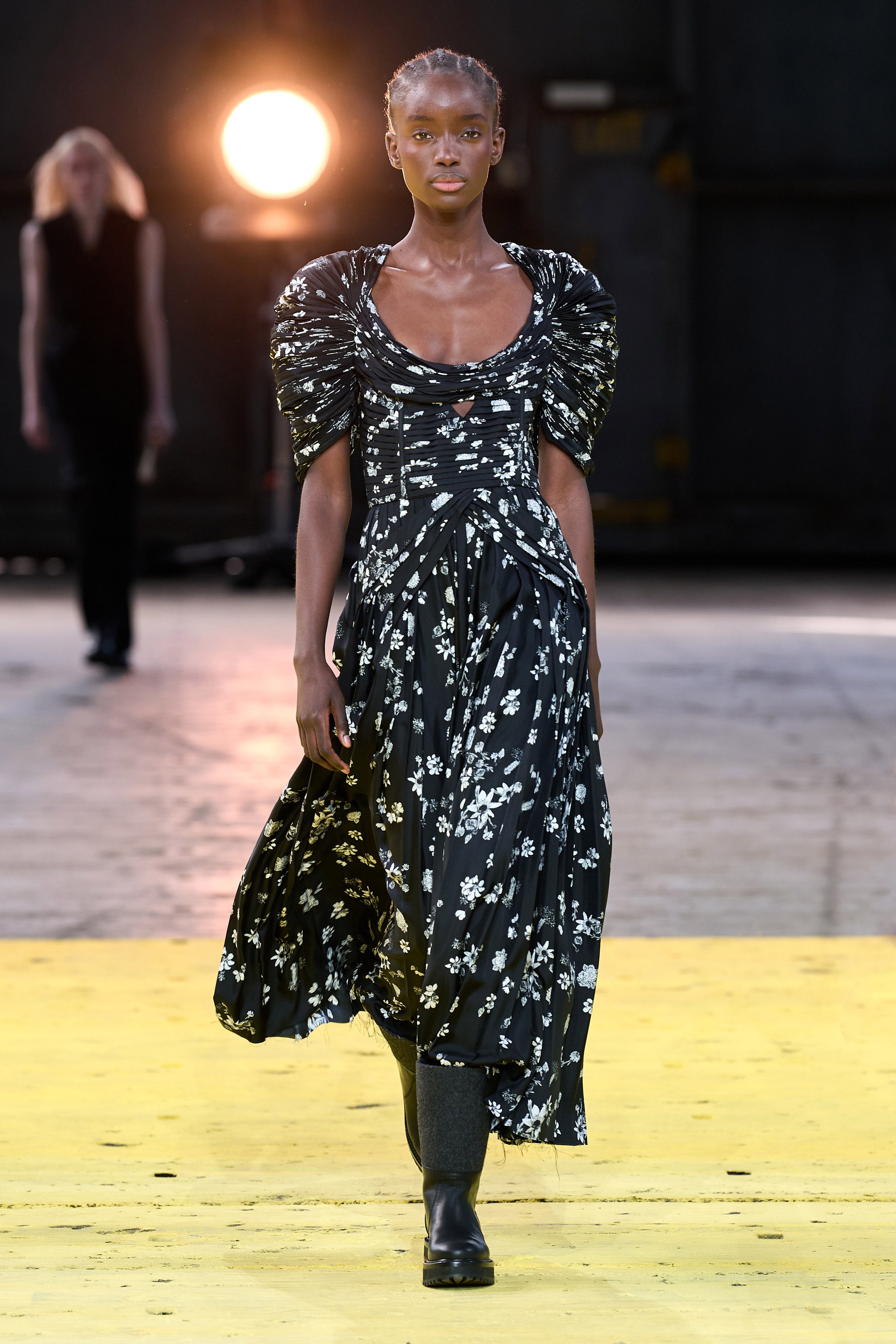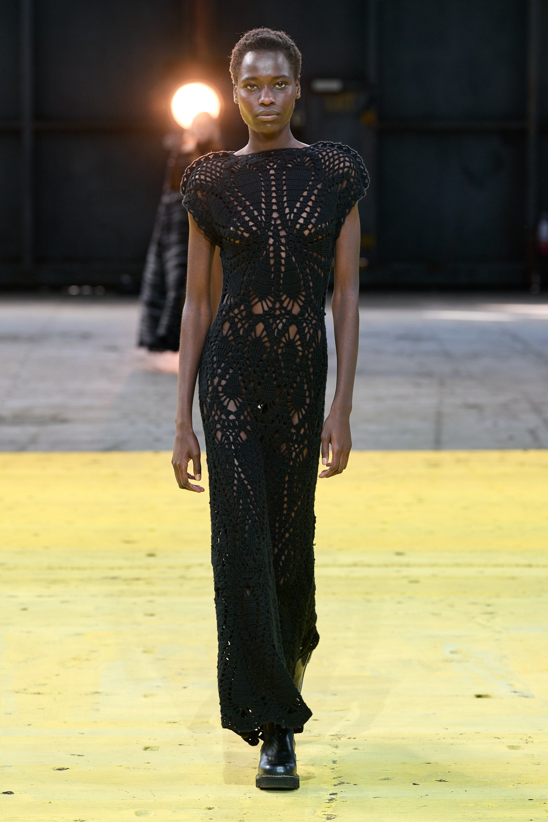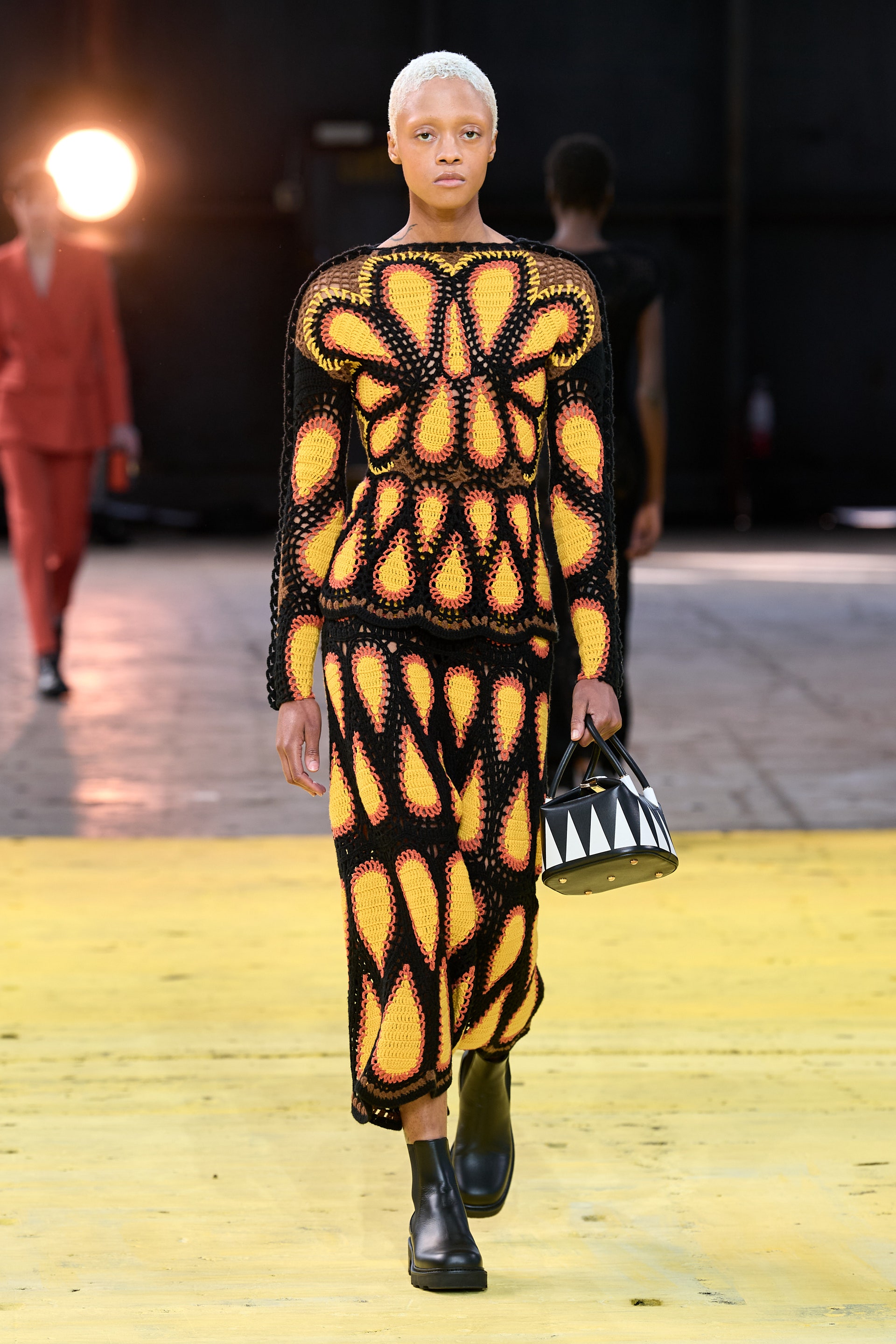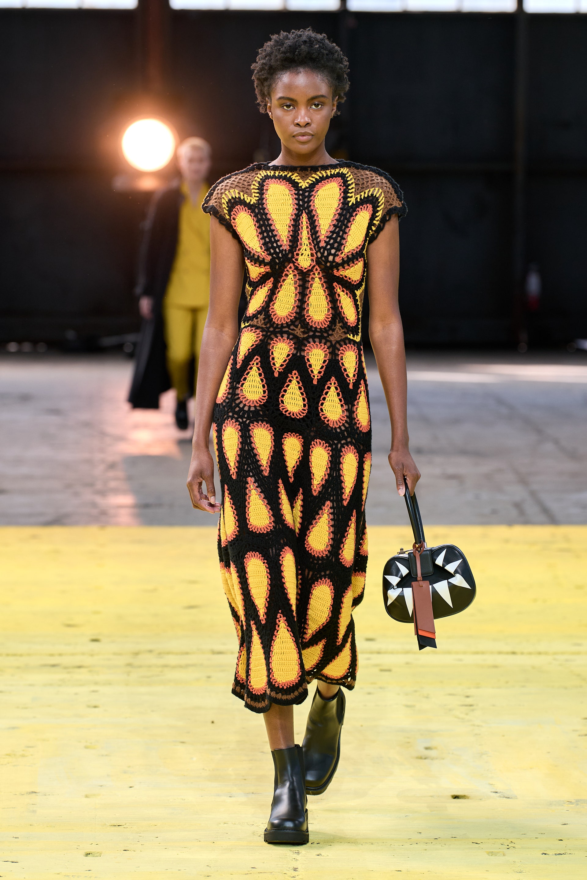 Сочных оттенков цитрина, арбуза, дыни и манго команда добилась при помощи природных красителей, а вязаные вещи, как и всегда, были произведены женской ремесленной школой Manos De Uruguay. Творчество Габриэлы Херст бескомпромиссно подчинено ответственному использованию ресурсов и заботе об окружающей среде. Одним из ключевых источников вдохновения для дизайнера также остается искусство Латинской Америки. В этом сезоне эффектное пончо украсила картина художницы Анны Мартинес Оризондо — ветвистое мистическое дерево. В узорах, связанных крючком, на платье макси, топе и юбке миди угадывается стилизация перьев павлина или мифической огненной птицы. Показ закрыла супермодель Эмбер Валлетта в двубортном костюме из плотного трикотажа. Перед ней на подиуме появились модели в платьях сложных конструкций, напоминающих доспехи. Драпировки для них выполняли в известном нью-йоркском районе Гармент, в котором расположено наибольшее количество модных ателье.
