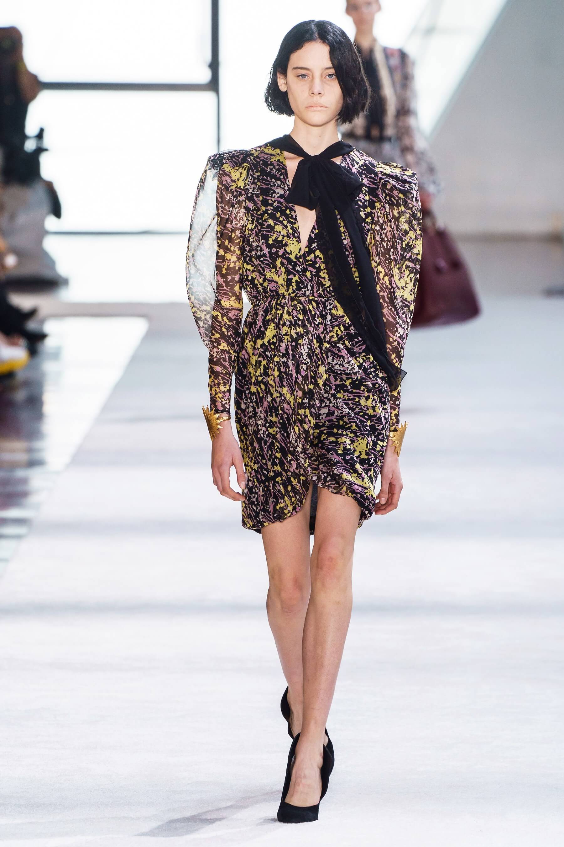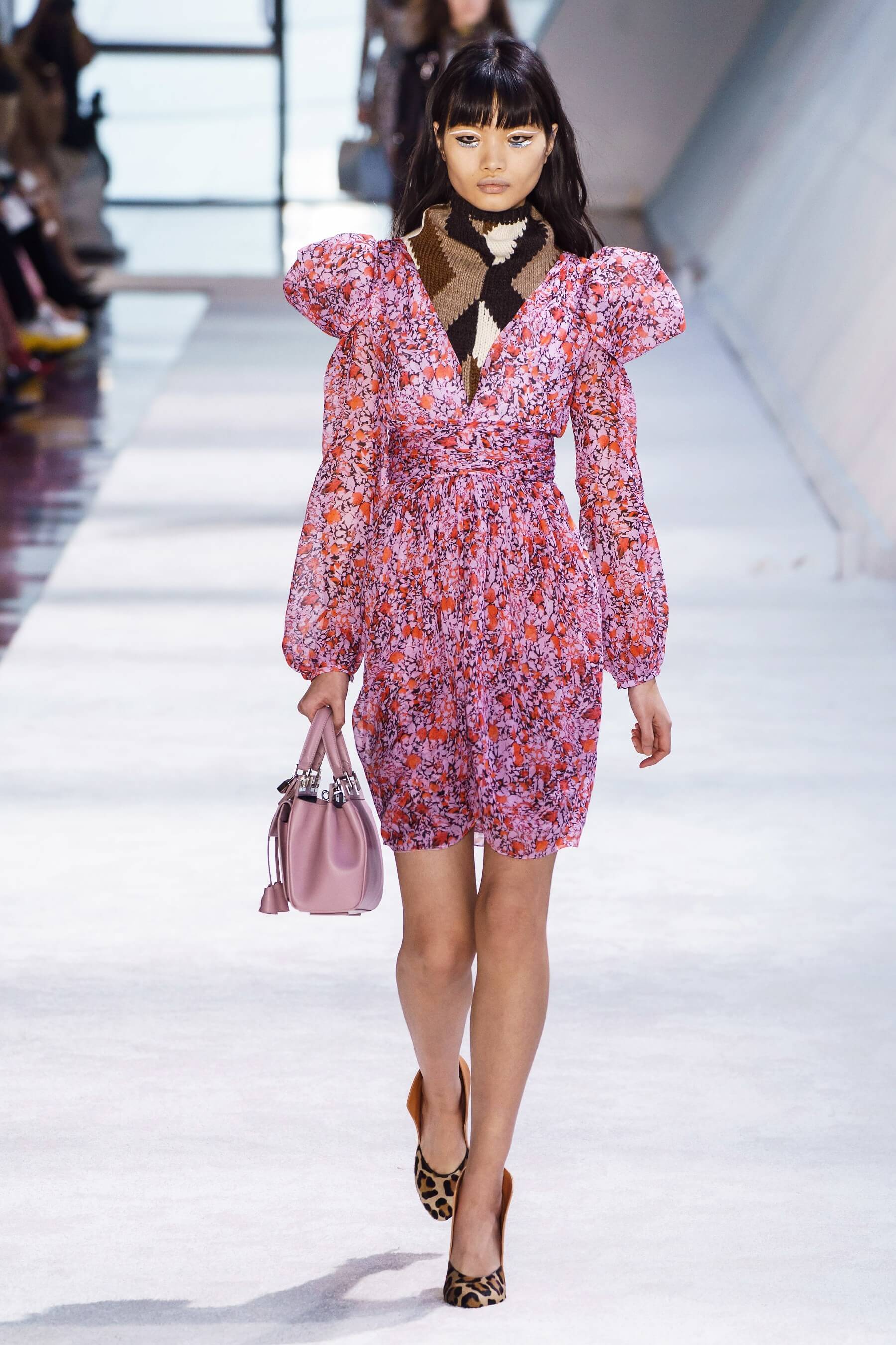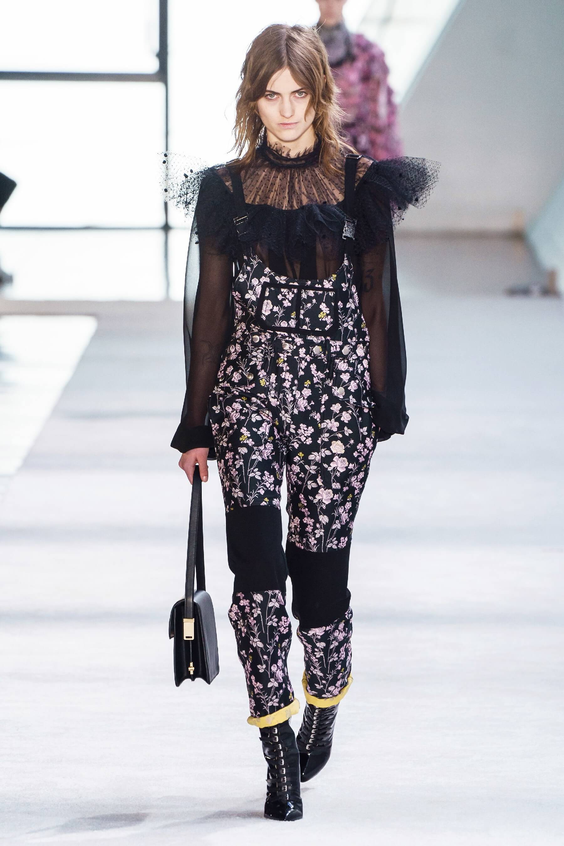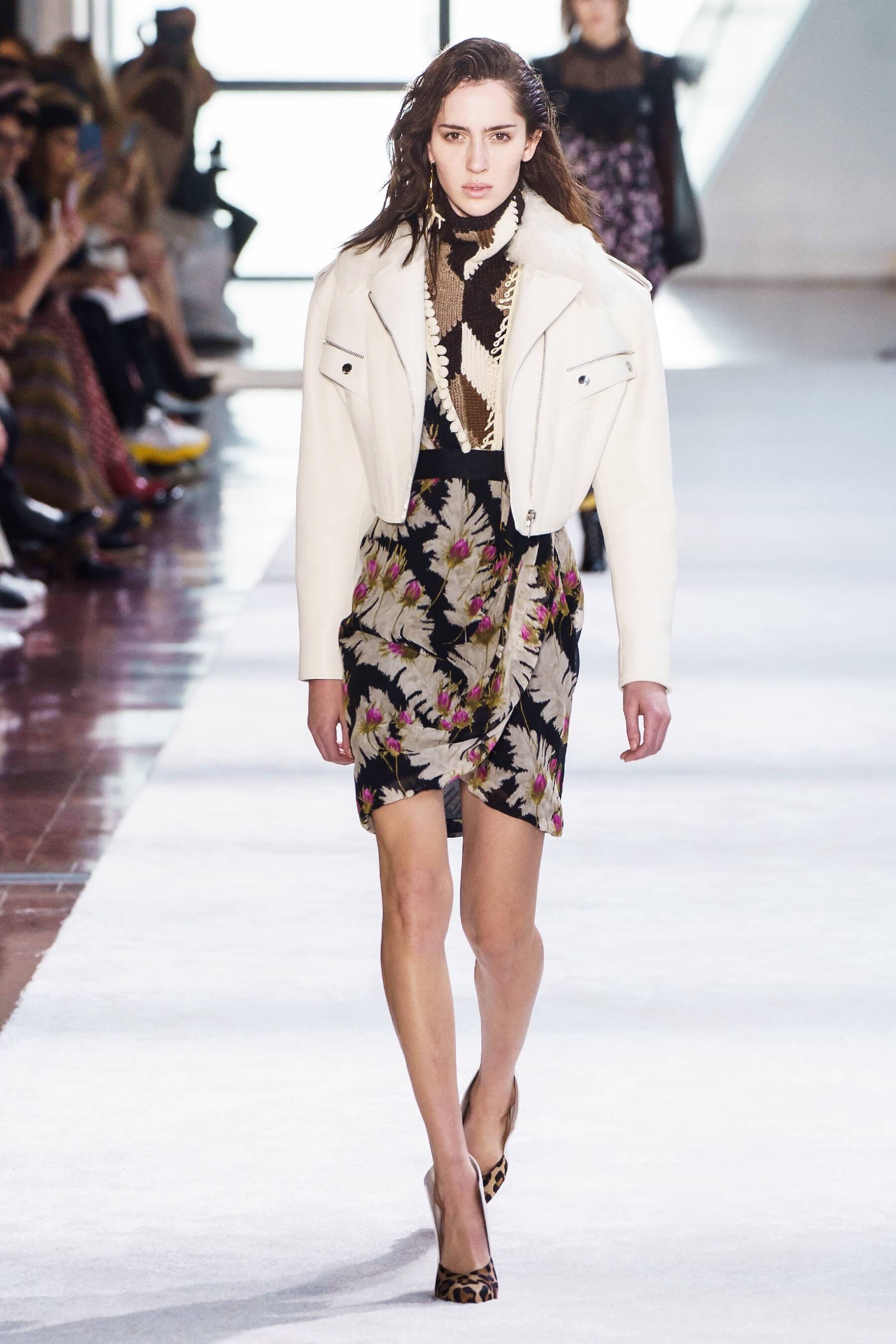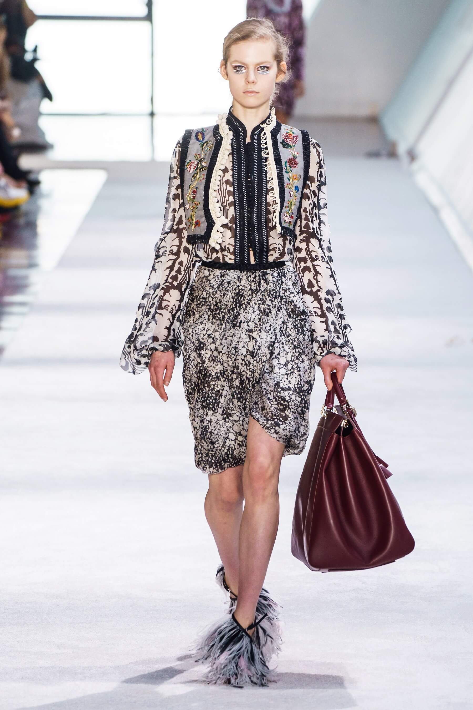 Будущей осенью, какой бы ветер ни дул, дизайнер предлагает носить богемные наряды из тончайших слоёв шелка и тюля, расцвеченных то мириадами мелких цветов, то фрагментами экспрессионистских картин вроде "Сада в Живерни" Клода Моне. Рукава в коллекции приподняты и объёмны, как в нарядах конца 19 — начала 20 века, на блузах расположилась вышивка, а дополняют всё кожаные косухи, пальто в змеиный принт и лаковые блестящие брюки.