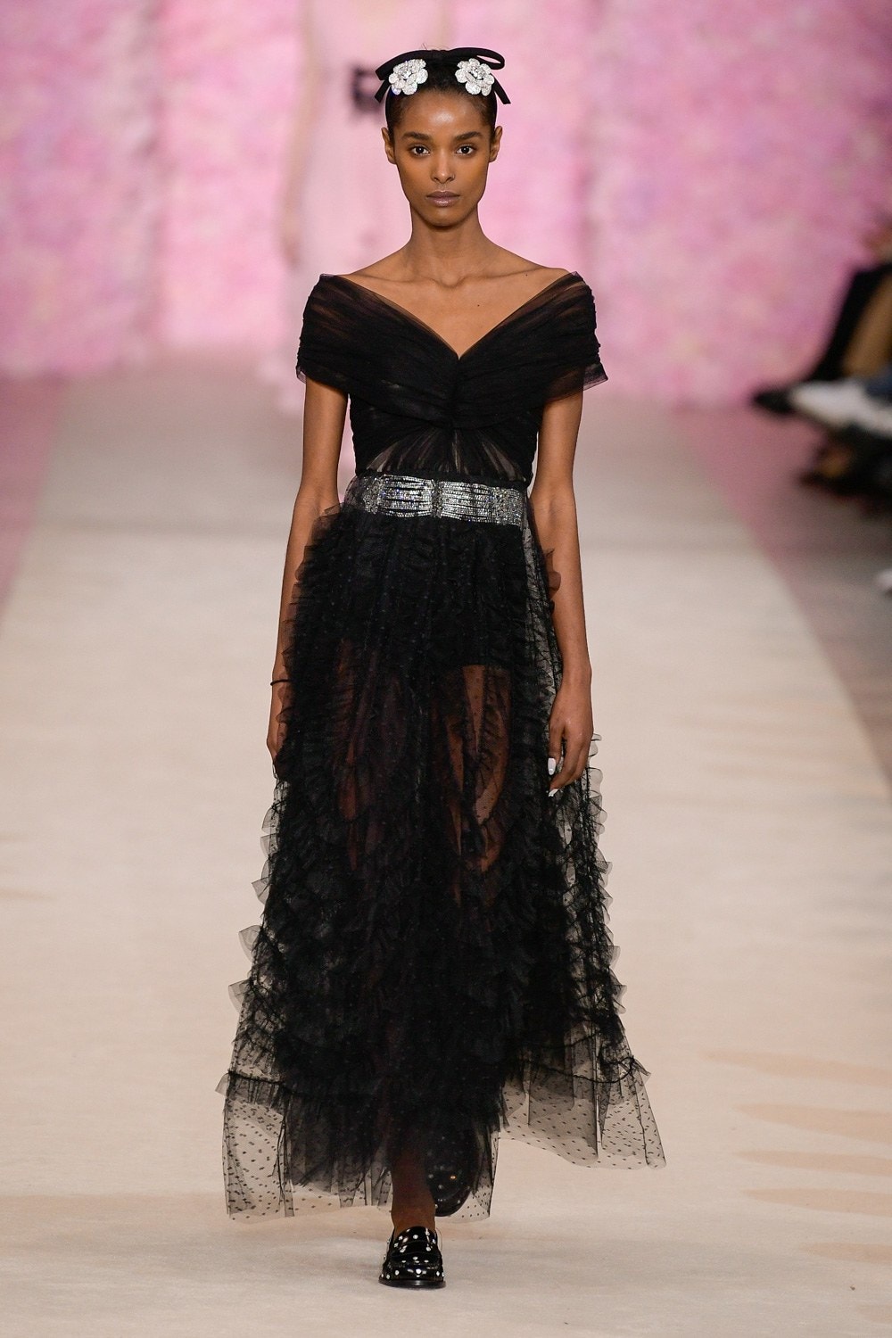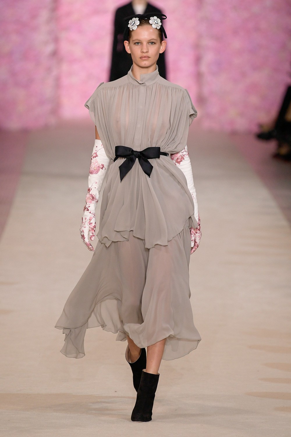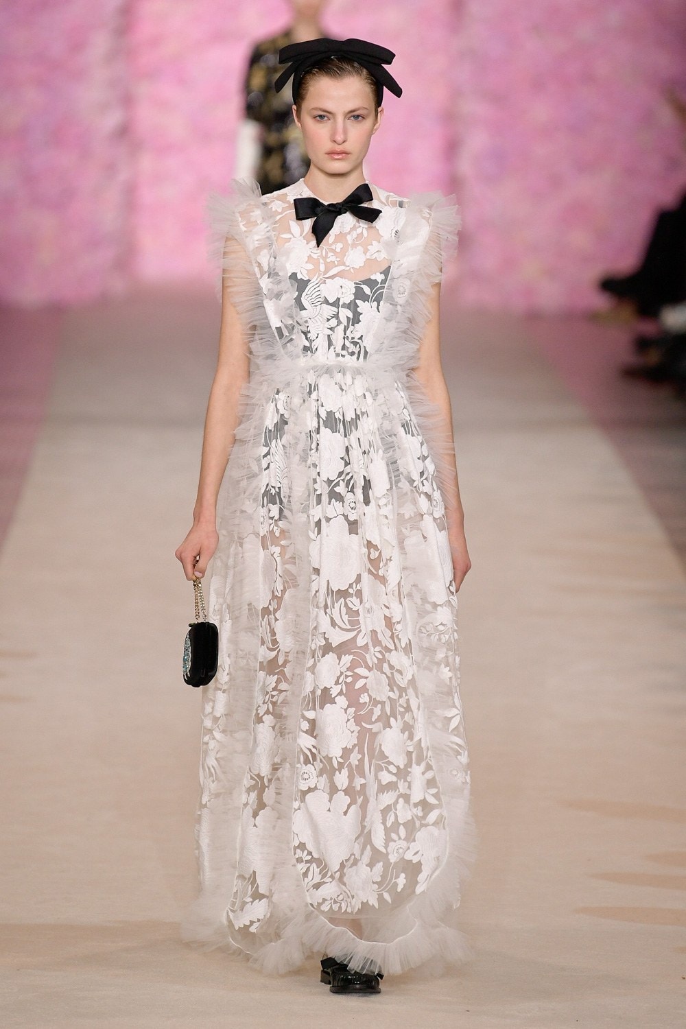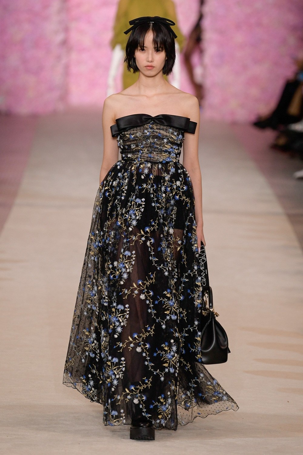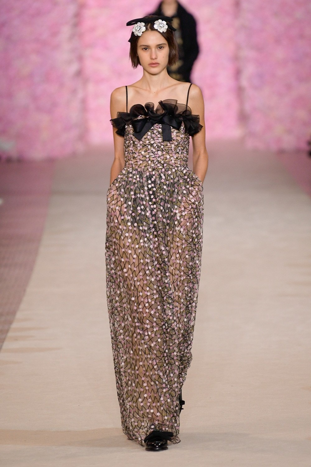 Наслоения нежного тюля, рюши и чувственные оборки традиционно сплетаются с милыми контрастными бантами, прозрачными, невесомыми фактурами и цветочными аппликациями. Правда, силуэты Giambattista Valli в новом сезоне несколько более драматичны, а на отдельных нарядах появились украшения и принты в виде змея-искусителя.