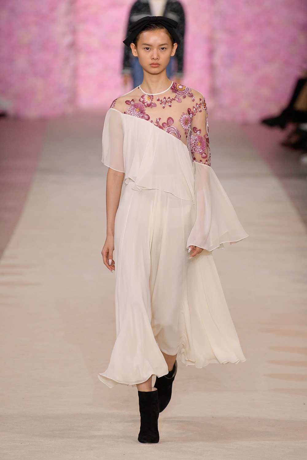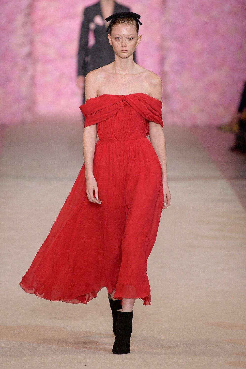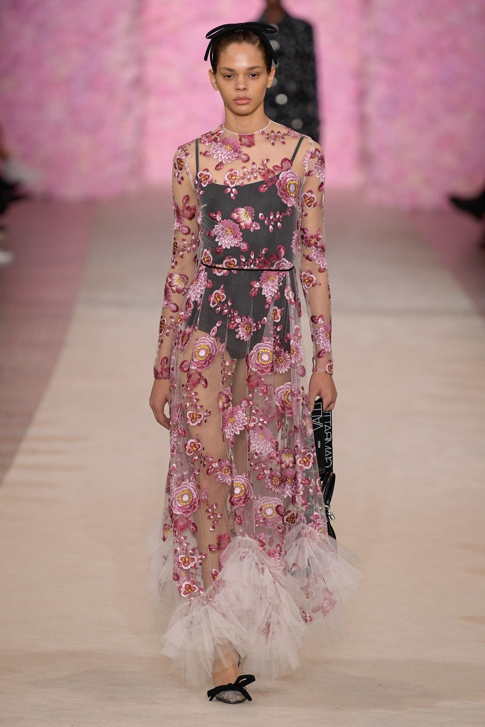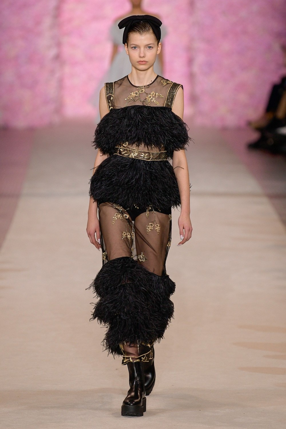 Наслоения нежного тюля, рюши и чувственные оборки традиционно сплетаются с милыми контрастными бантами, прозрачными, невесомыми фактурами и цветочными аппликациями. Правда, силуэты Giambattista Valli в новом сезоне несколько более драматичны, а на отдельных нарядах появились украшения и принты в виде змея-искусителя.