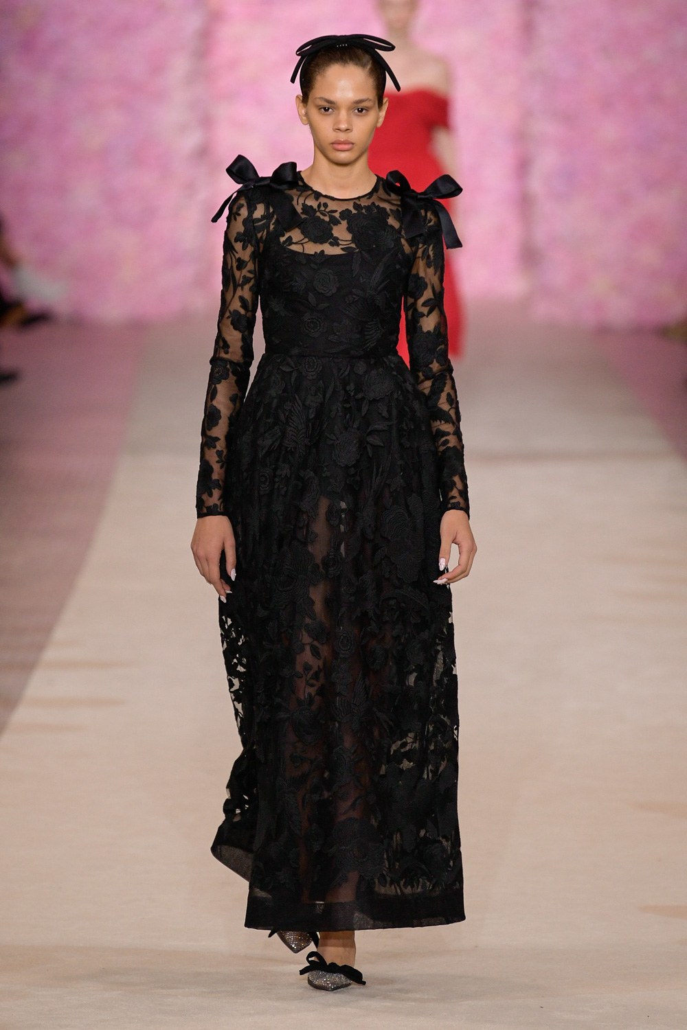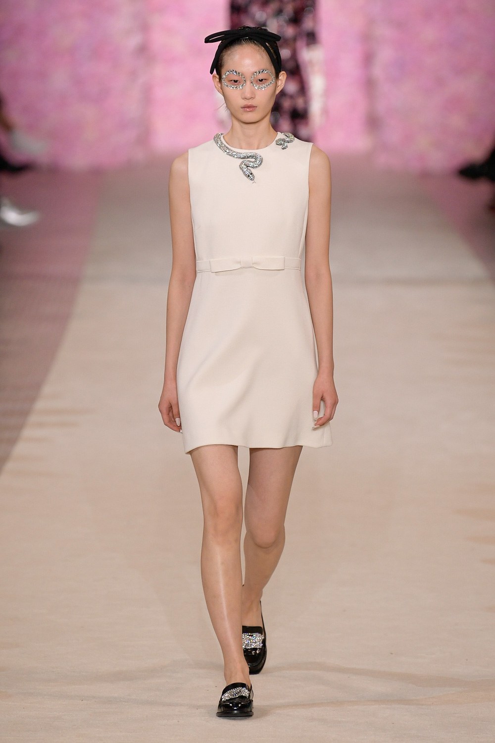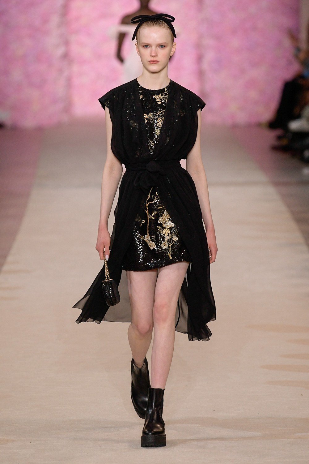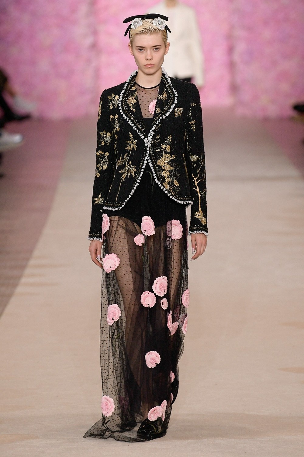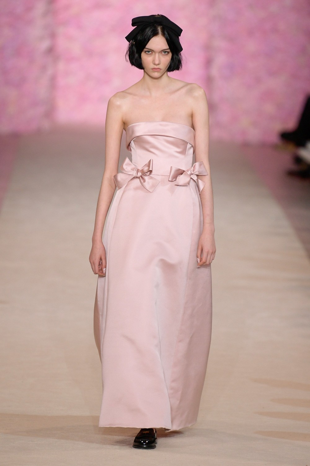 Наслоения нежного тюля, рюши и чувственные оборки традиционно сплетаются с милыми контрастными бантами, прозрачными, невесомыми фактурами и цветочными аппликациями. Правда, силуэты Giambattista Valli в новом сезоне несколько более драматичны, а на отдельных нарядах появились украшения и принты в виде змея-искусителя.