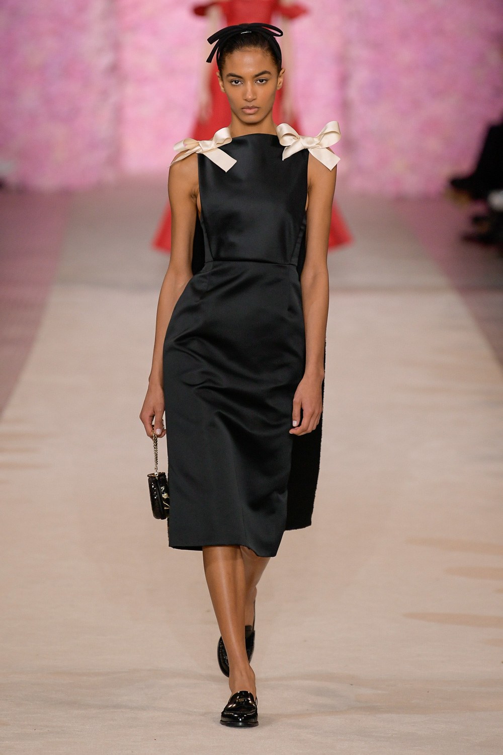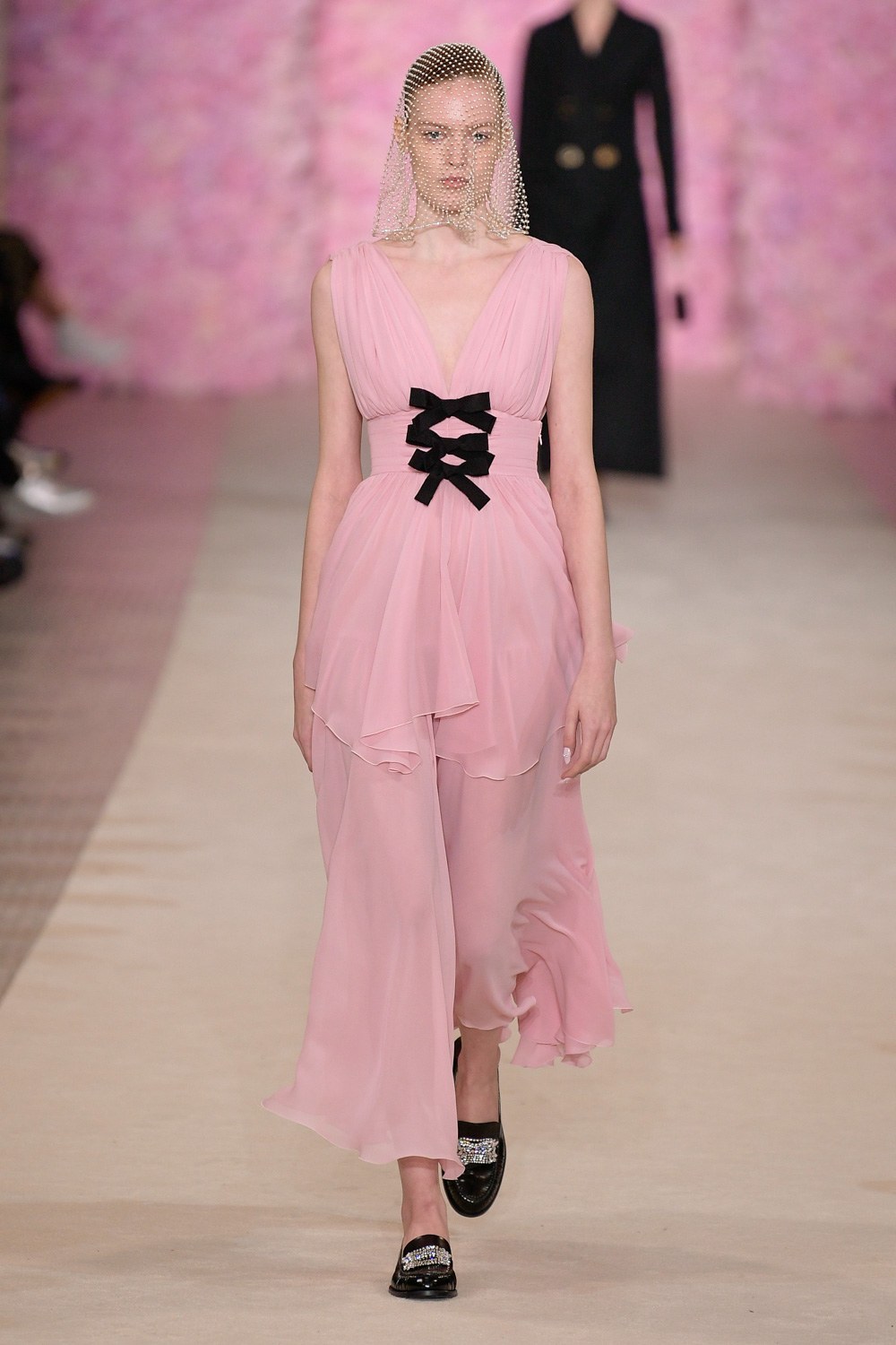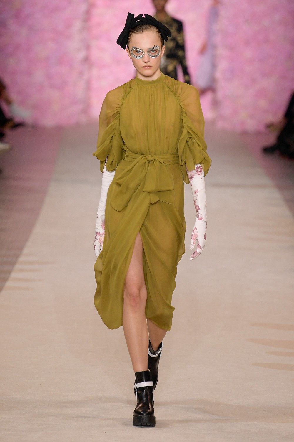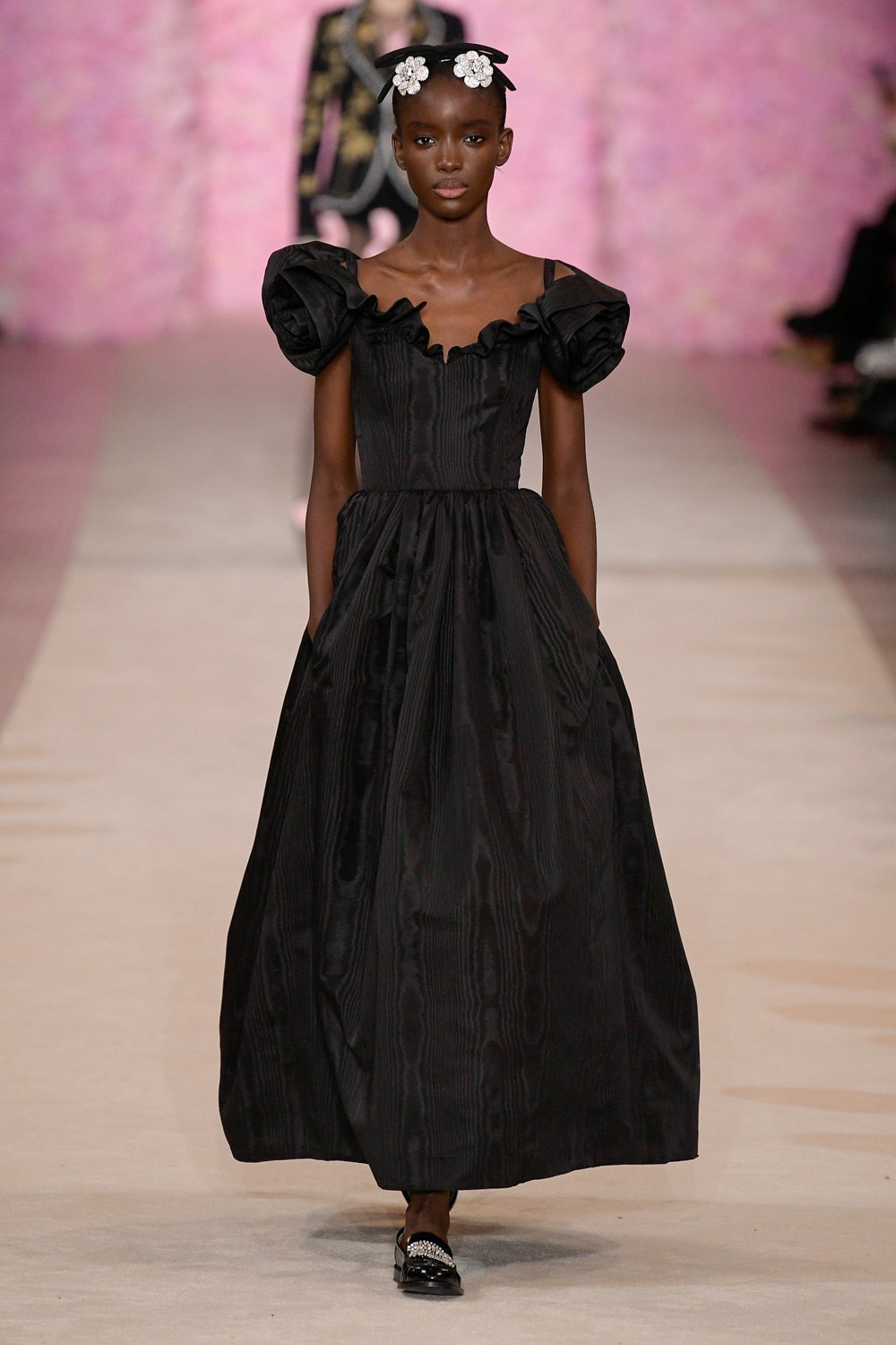 Наслоения нежного тюля, рюши и чувственные оборки традиционно сплетаются с милыми контрастными бантами, прозрачными, невесомыми фактурами и цветочными аппликациями. Правда, силуэты Giambattista Valli в новом сезоне несколько более драматичны, а на отдельных нарядах появились украшения и принты в виде змея-искусителя.
