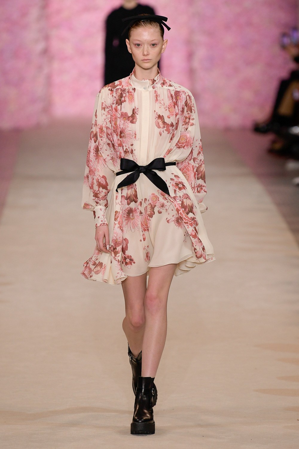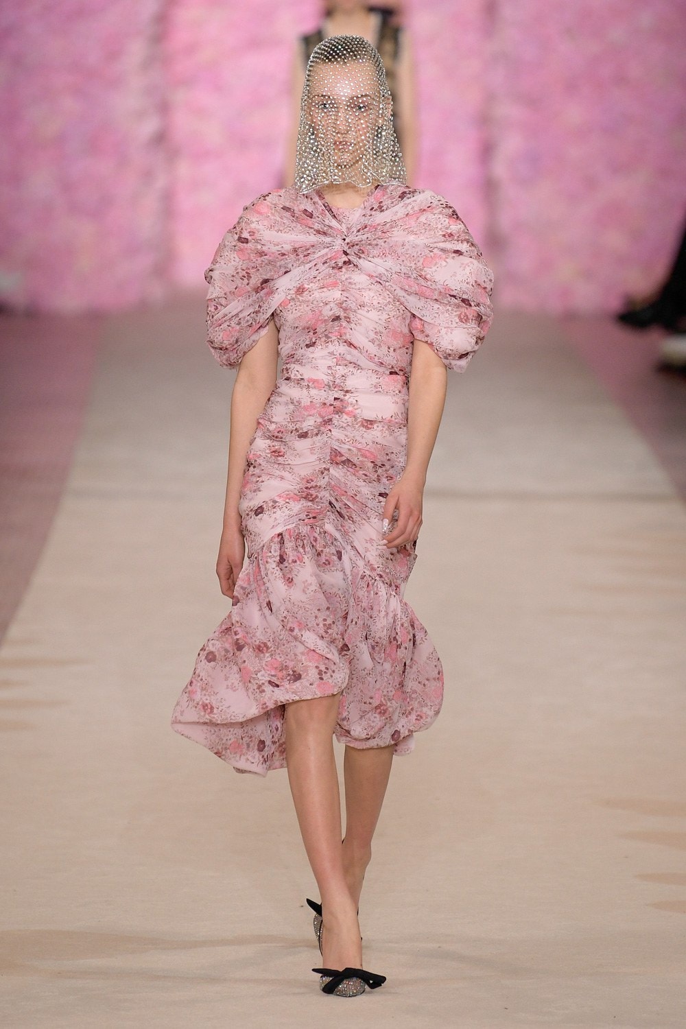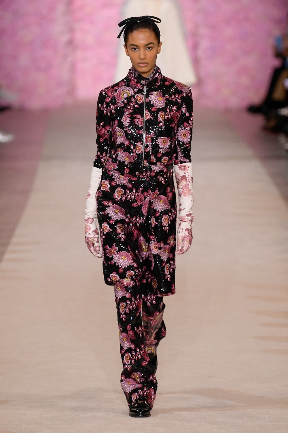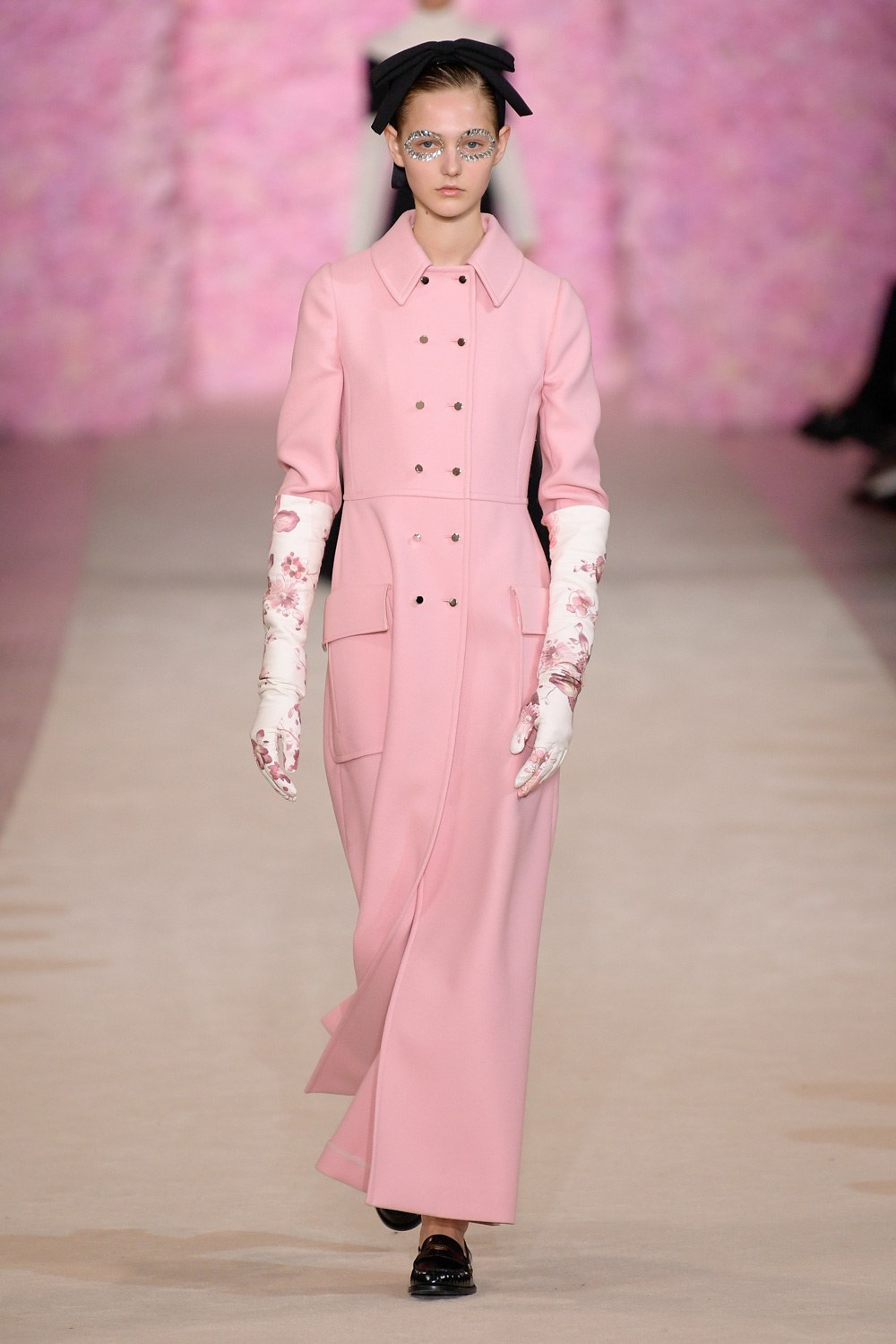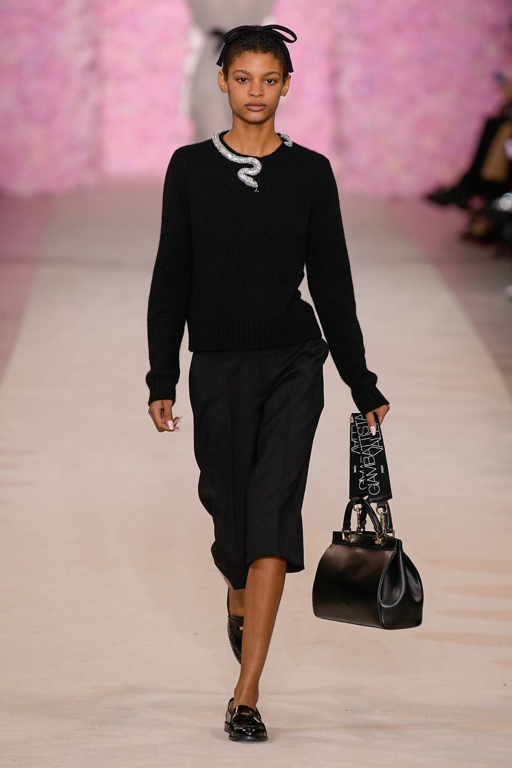 Наслоения нежного тюля, рюши и чувственные оборки традиционно сплетаются с милыми контрастными бантами, прозрачными, невесомыми фактурами и цветочными аппликациями. Правда, силуэты Giambattista Valli в новом сезоне несколько более драматичны, а на отдельных нарядах появились украшения и принты в виде змея-искусителя.
