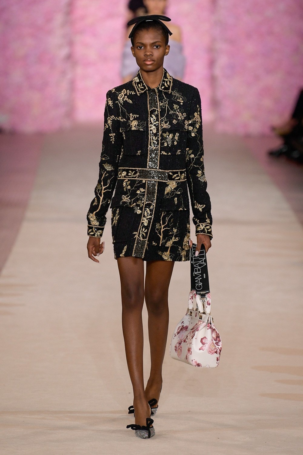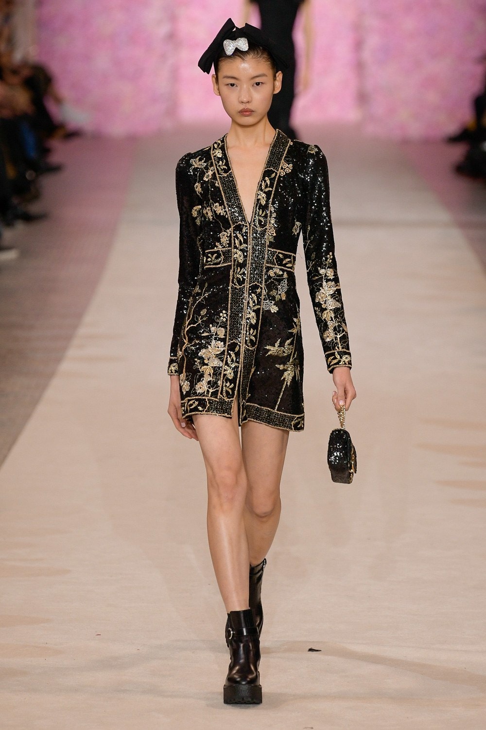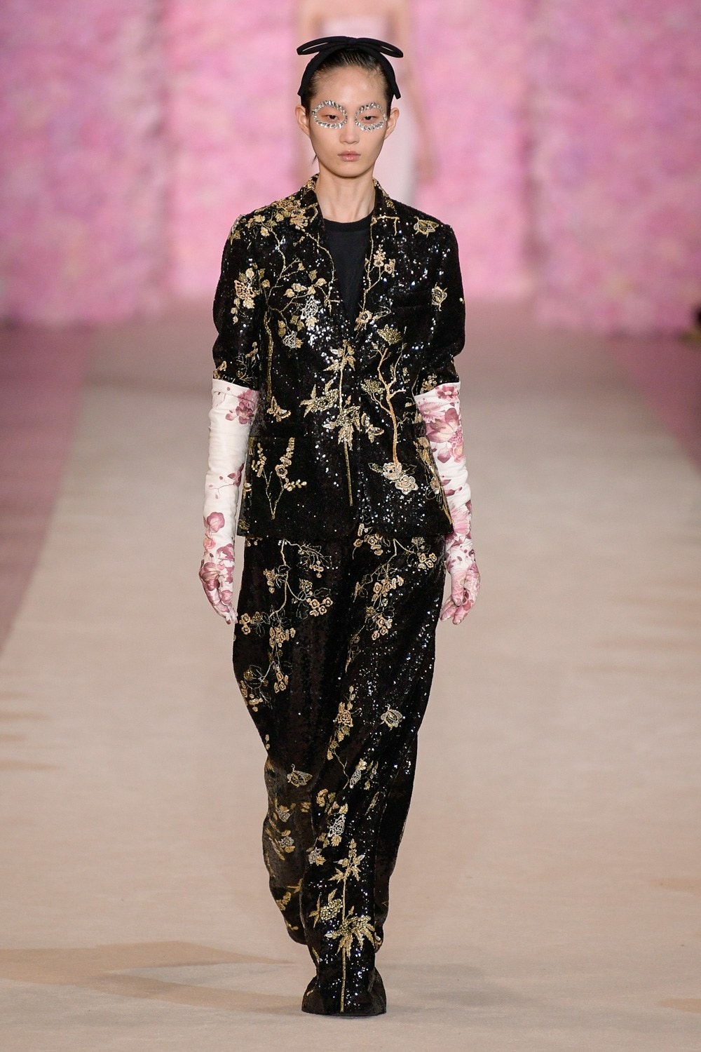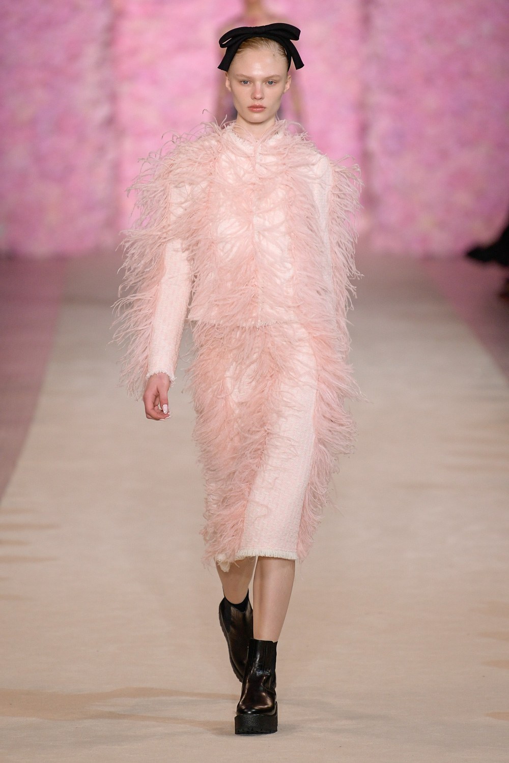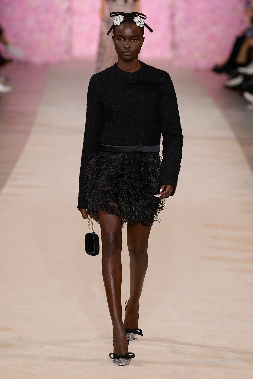 Наслоения нежного тюля, рюши и чувственные оборки традиционно сплетаются с милыми контрастными бантами, прозрачными, невесомыми фактурами и цветочными аппликациями. Правда, силуэты Giambattista Valli в новом сезоне несколько более драматичны, а на отдельных нарядах появились украшения и принты в виде змея-искусителя.