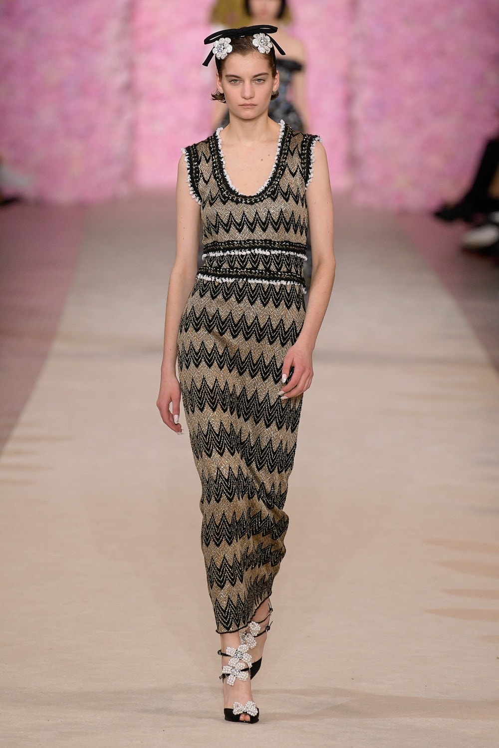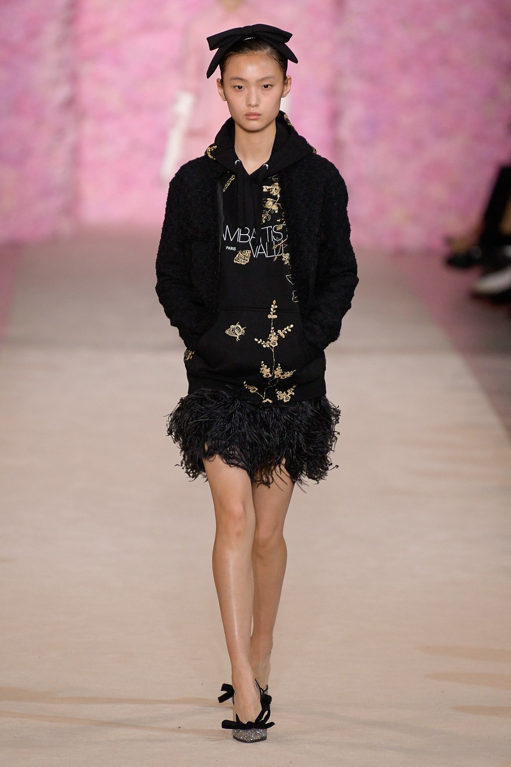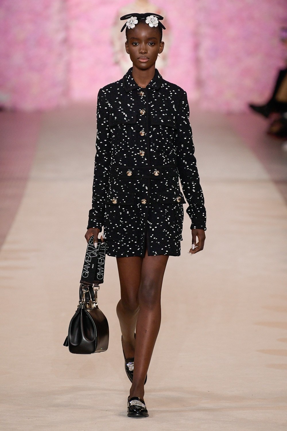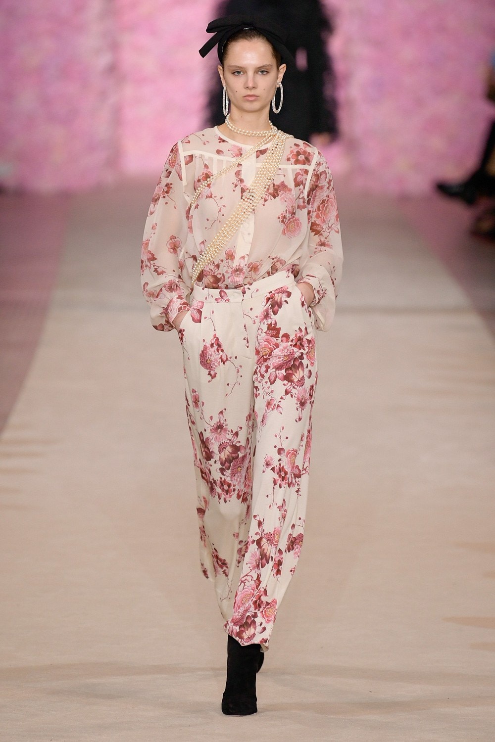 Наслоения нежного тюля, рюши и чувственные оборки традиционно сплетаются с милыми контрастными бантами, прозрачными, невесомыми фактурами и цветочными аппликациями. Правда, силуэты Giambattista Valli в новом сезоне несколько более драматичны, а на отдельных нарядах появились украшения и принты в виде змея-искусителя.