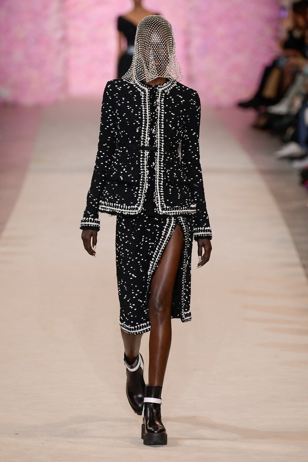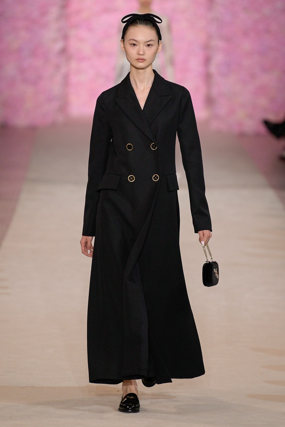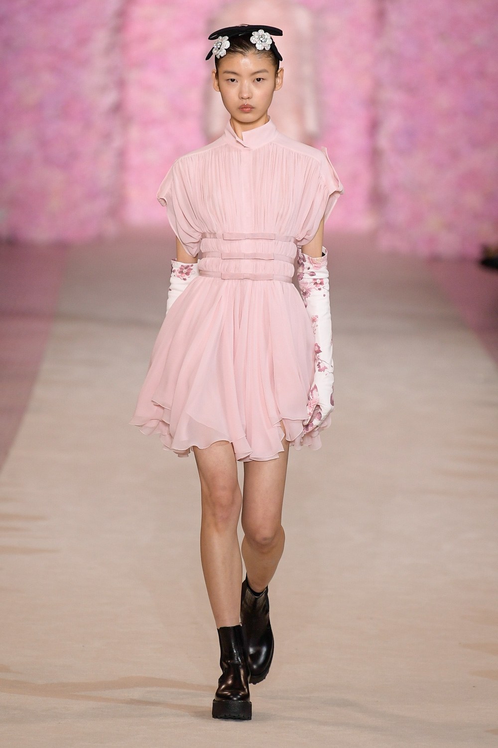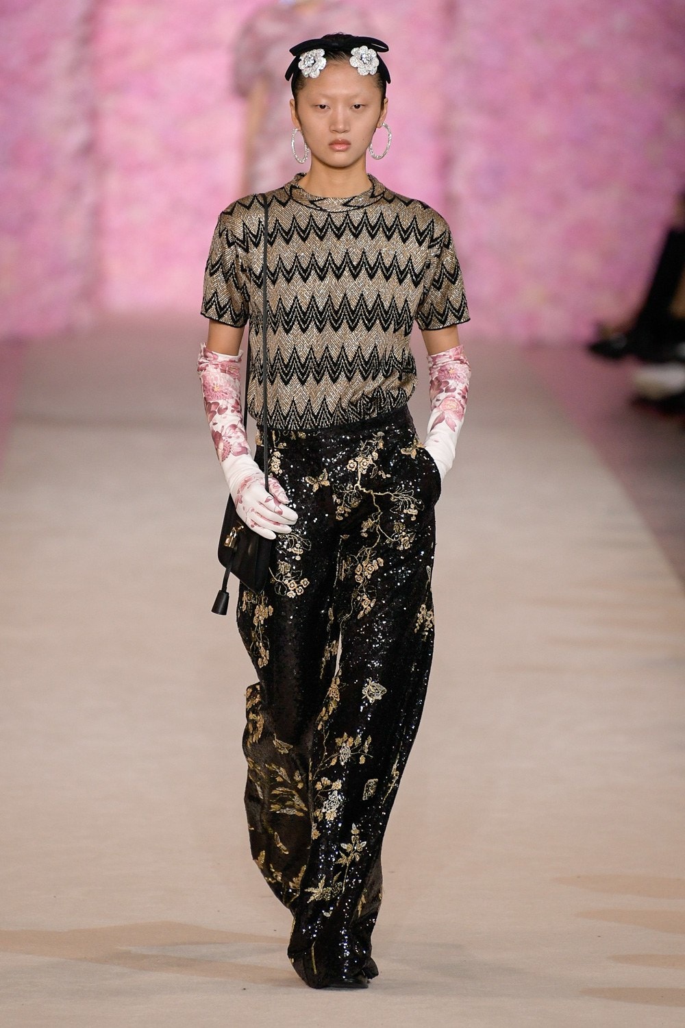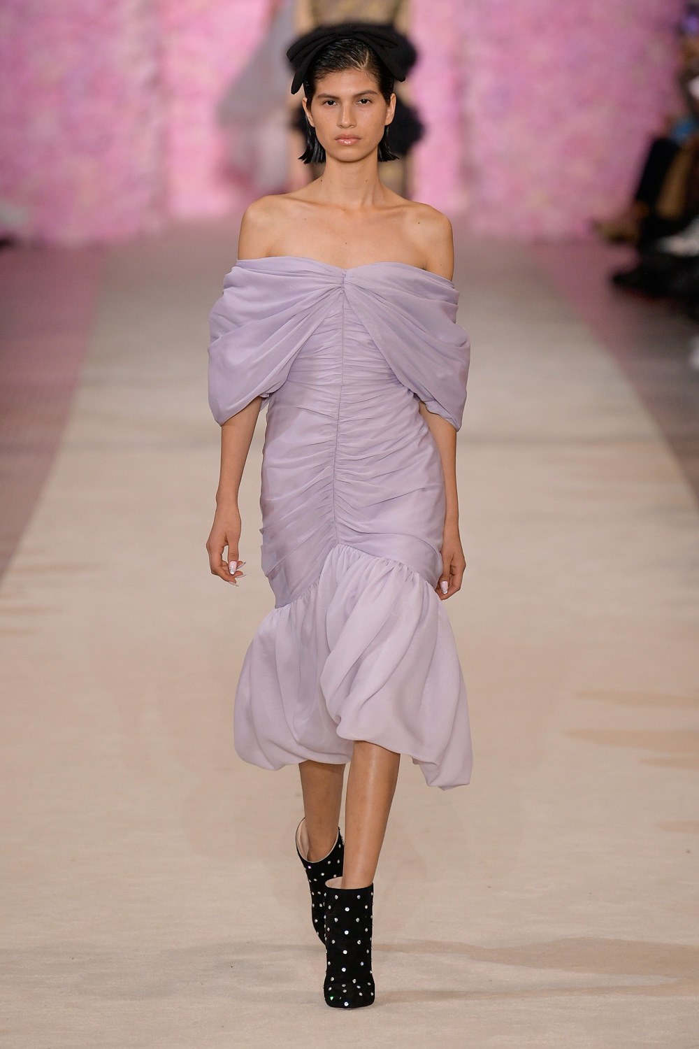 Наслоения нежного тюля, рюши и чувственные оборки традиционно сплетаются с милыми контрастными бантами, прозрачными, невесомыми фактурами и цветочными аппликациями. Правда, силуэты Giambattista Valli в новом сезоне несколько более драматичны, а на отдельных нарядах появились украшения и принты в виде змея-искусителя.
