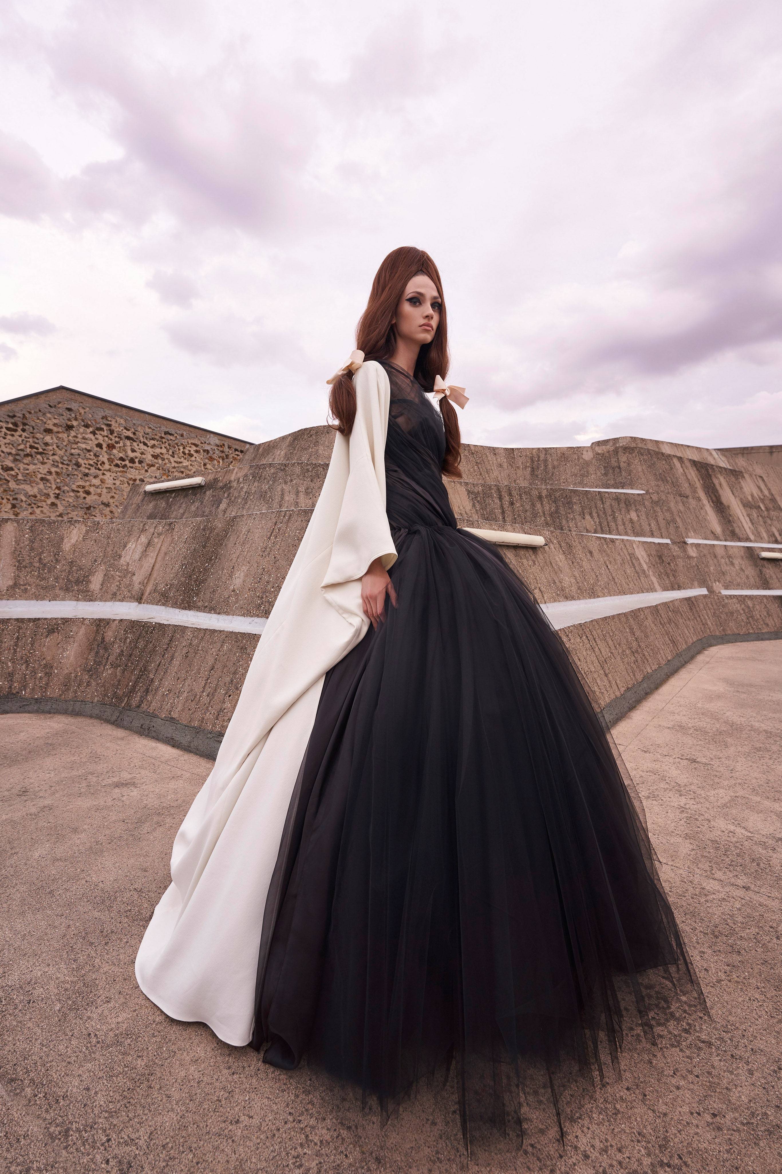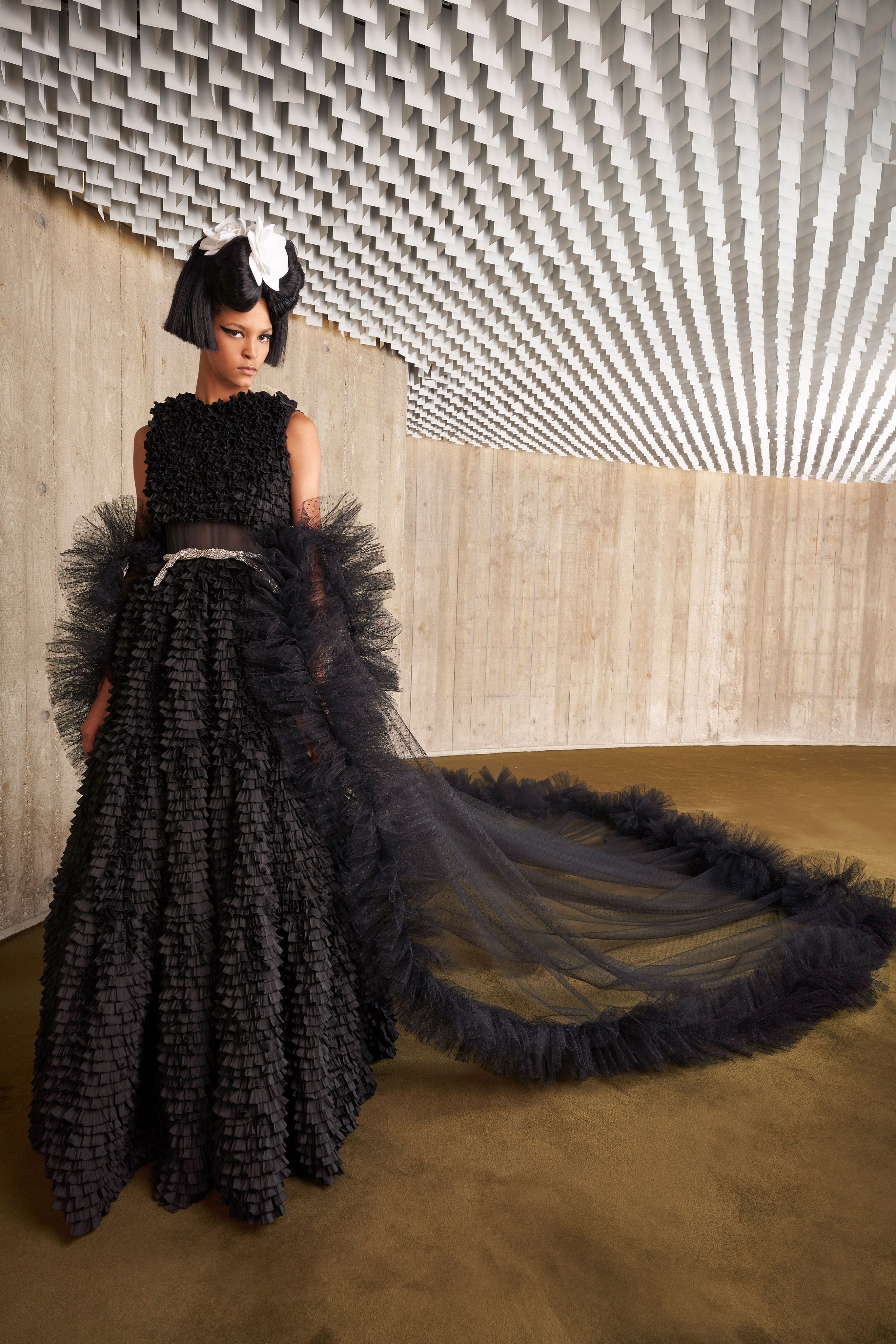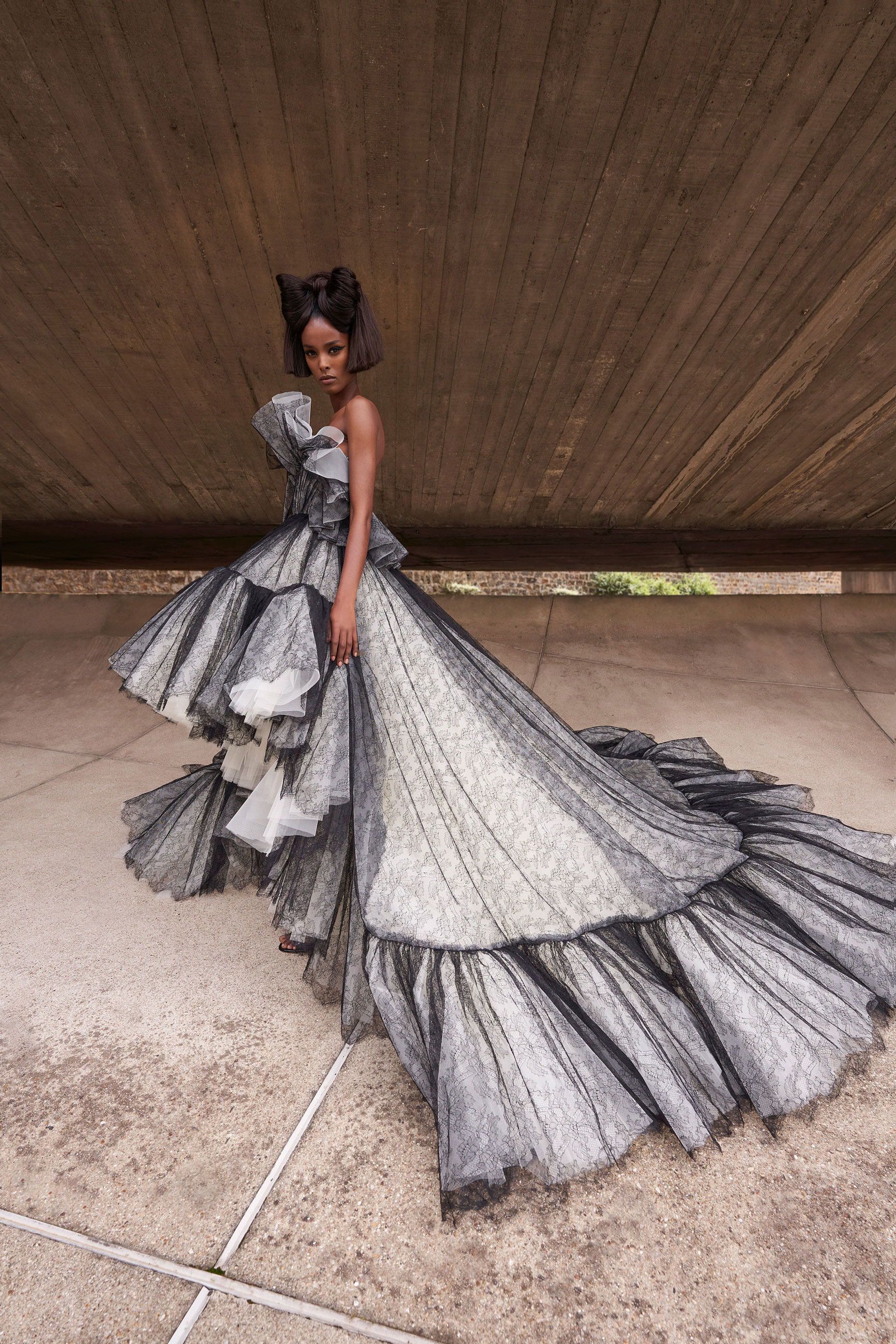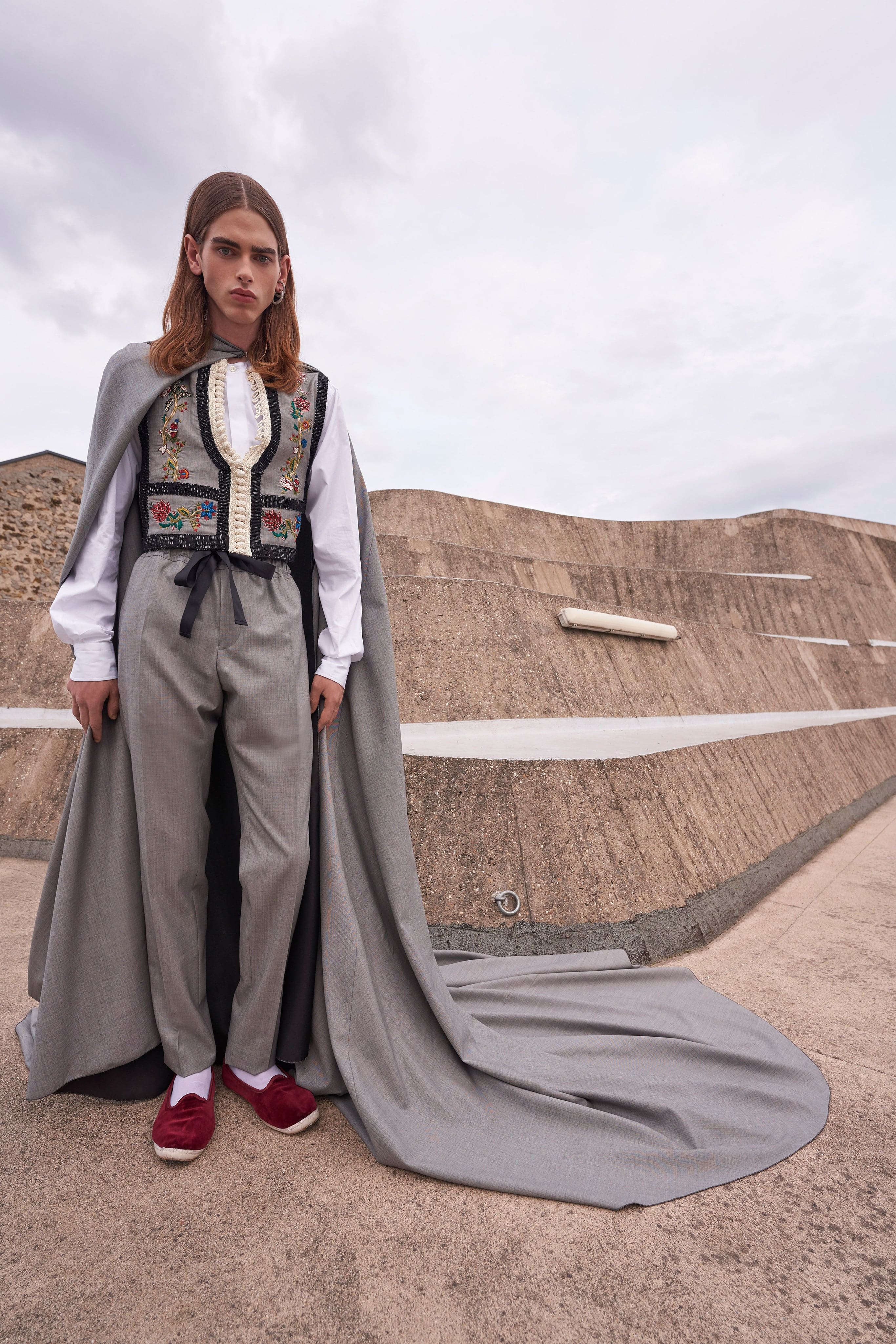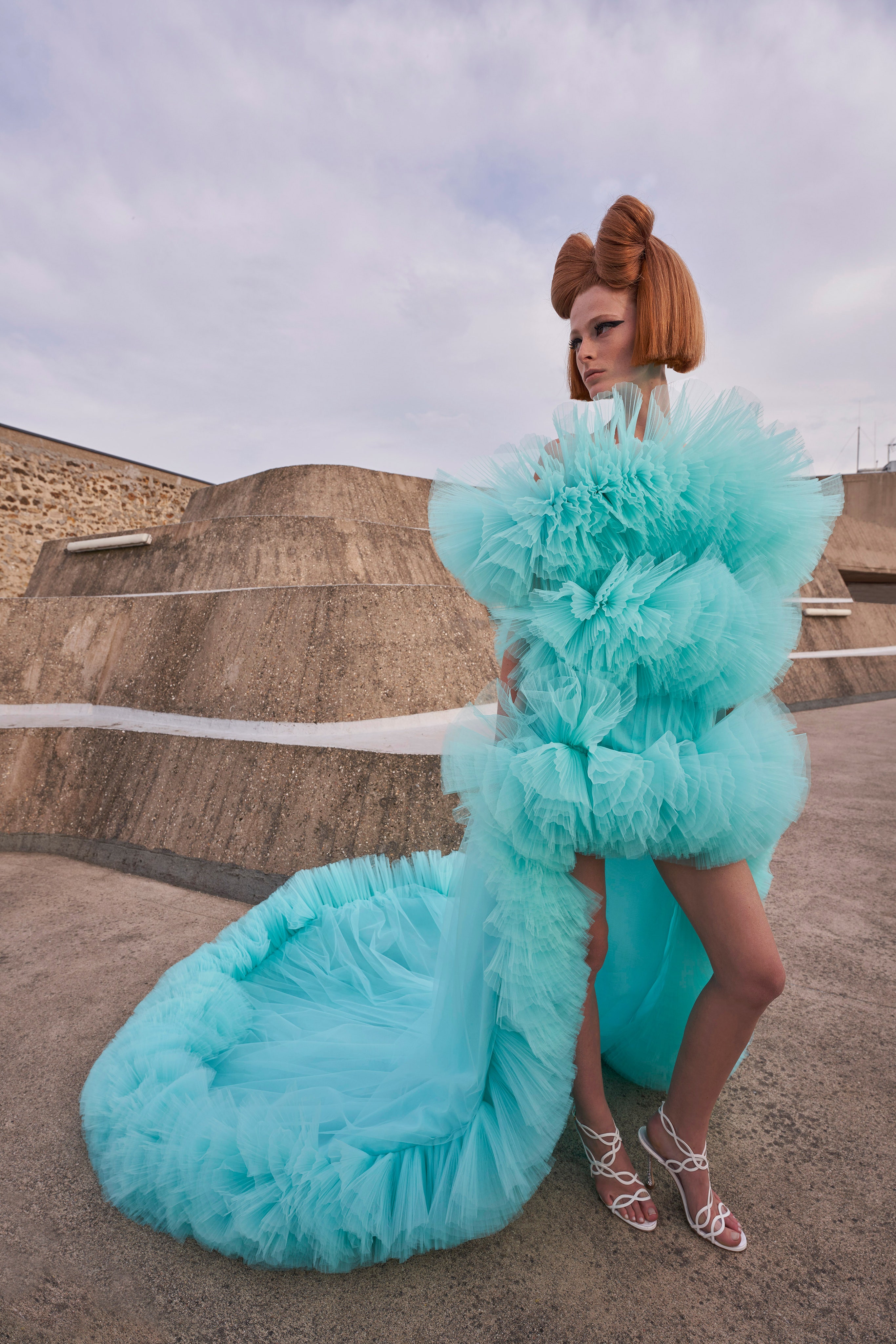 В подтверждение ностальгического и вместе с тем фантазийного настроя Валли, образы моделей отсылают к эксцентричной моде конца 60-х — начала 70-х, когда блеск и гламур ночных клубов были в самом расцвете. Объемные укладки в виде бантов и рогов очевидно повторяли пышность платьев, неизменно сотканных из облаков тюля. В коллекции также чувствуется мотив непредсказуемости и той дурманящей легкости, почти граничащей со сладкой меланхолией, о которой размечтался дизайнер: это и небрежно драпированные платья, и мужские костюмы, прикрытые накидками, в лучших традициях моды в духе Джорджа Браммела, и мужской образ с просторными формальными брюками и рубашкой из перьев.