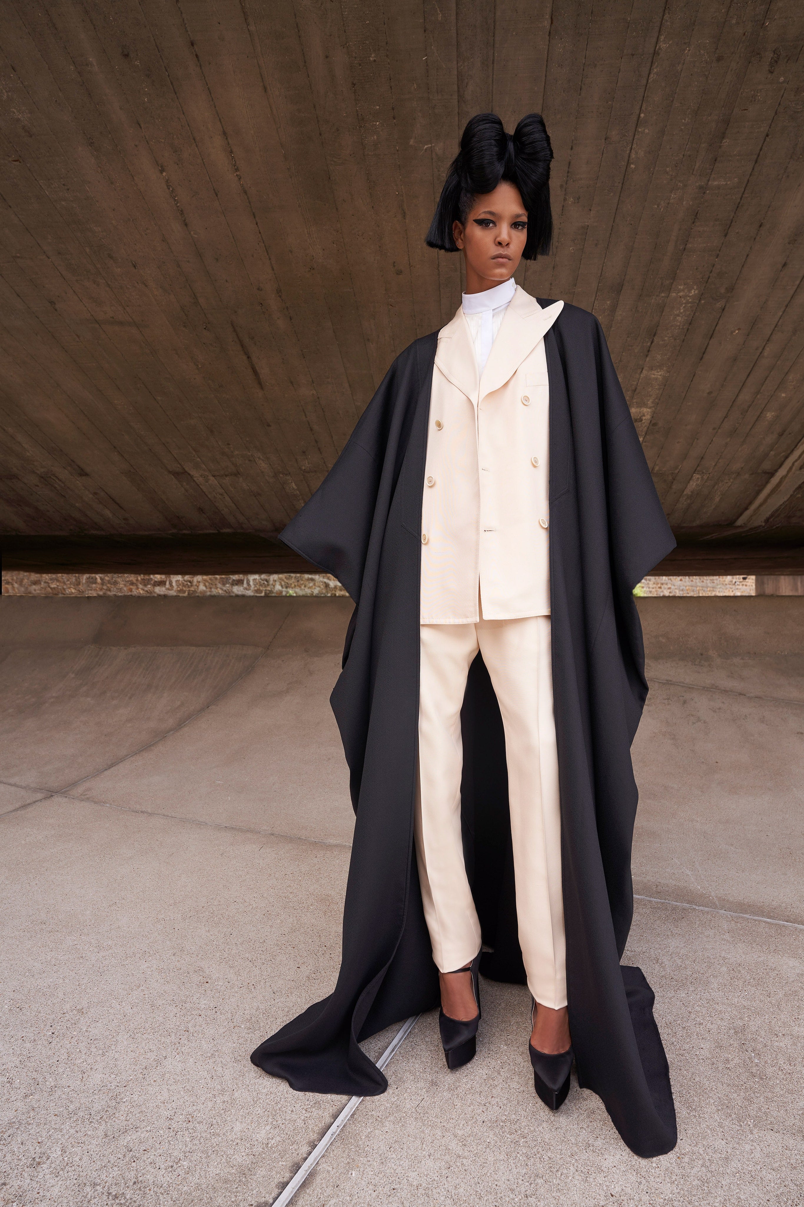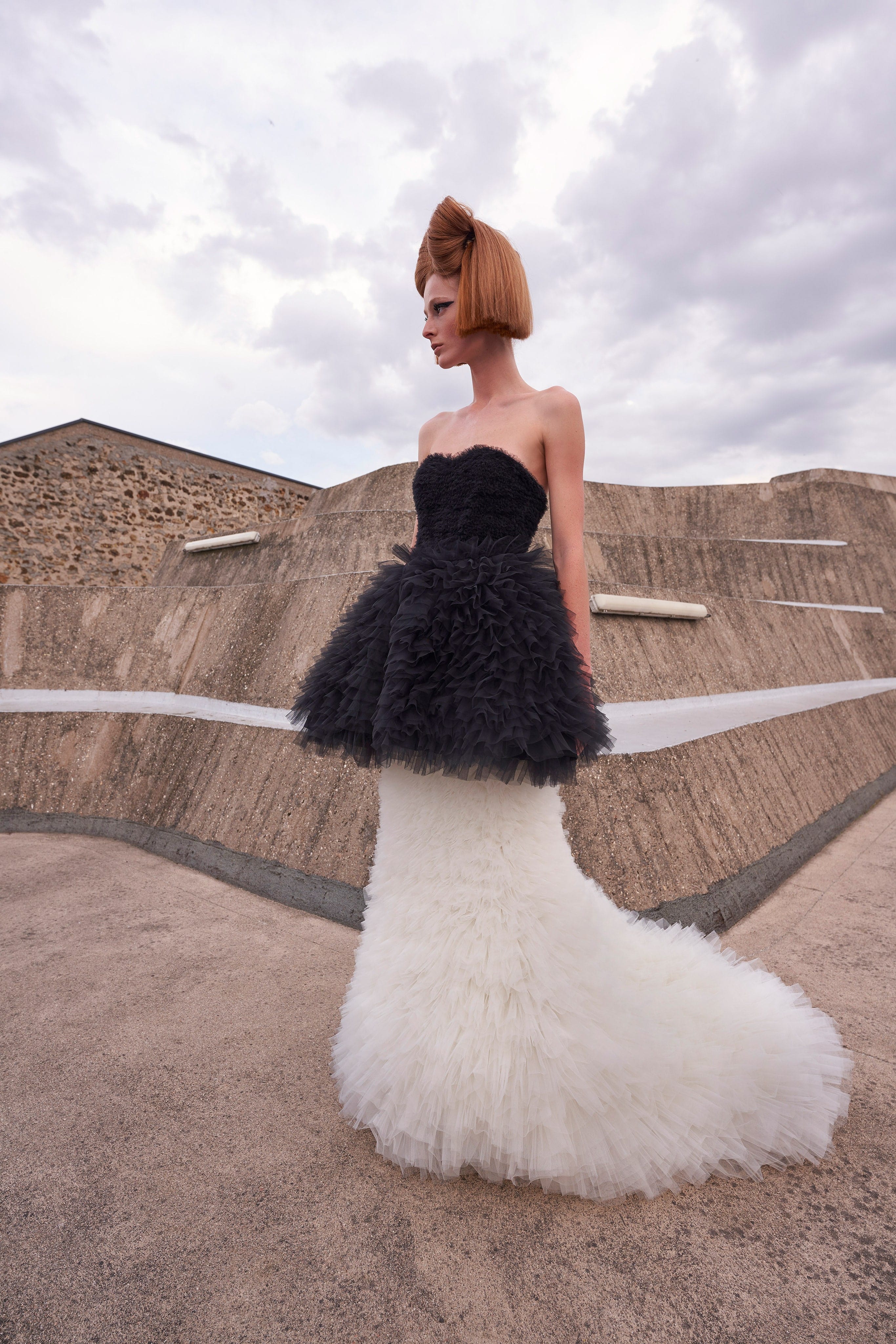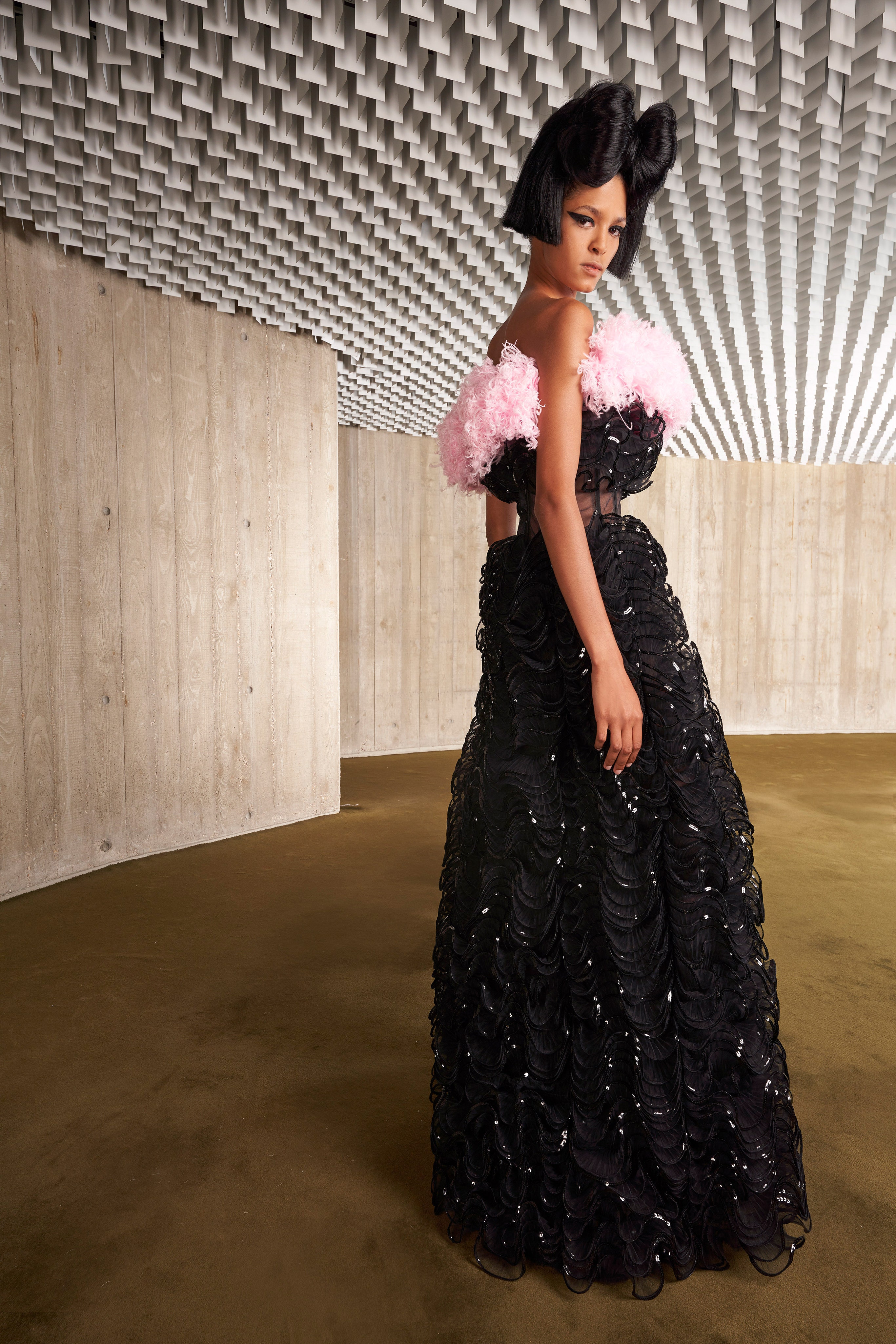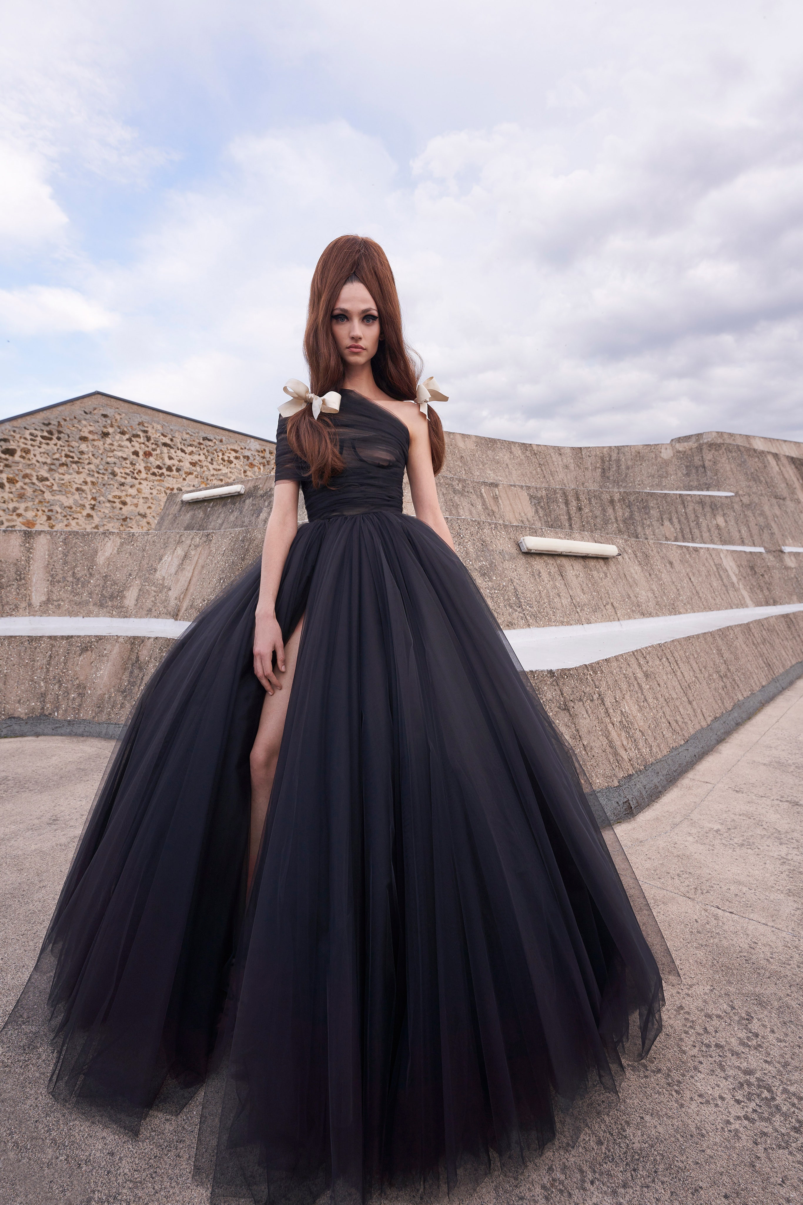 В подтверждение ностальгического и вместе с тем фантазийного настроя Валли, образы моделей отсылают к эксцентричной моде конца 60-х — начала 70-х, когда блеск и гламур ночных клубов были в самом расцвете. Объемные укладки в виде бантов и рогов очевидно повторяли пышность платьев, неизменно сотканных из облаков тюля. В коллекции также чувствуется мотив непредсказуемости и той дурманящей легкости, почти граничащей со сладкой меланхолией, о которой размечтался дизайнер: это и небрежно драпированные платья, и мужские костюмы, прикрытые накидками, в лучших традициях моды в духе Джорджа Браммела, и мужской образ с просторными формальными брюками и рубашкой из перьев.