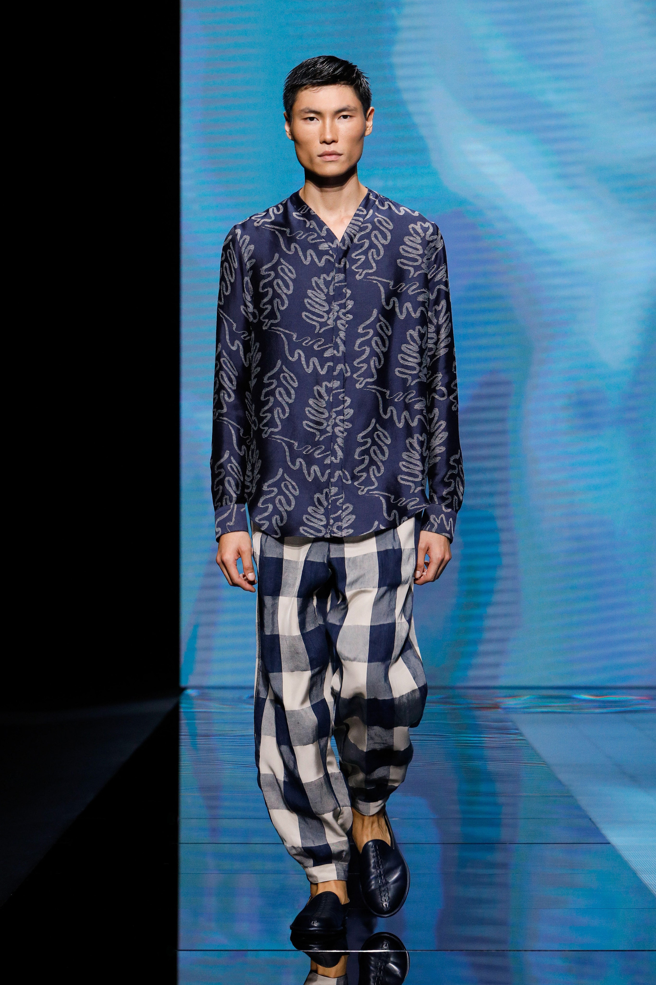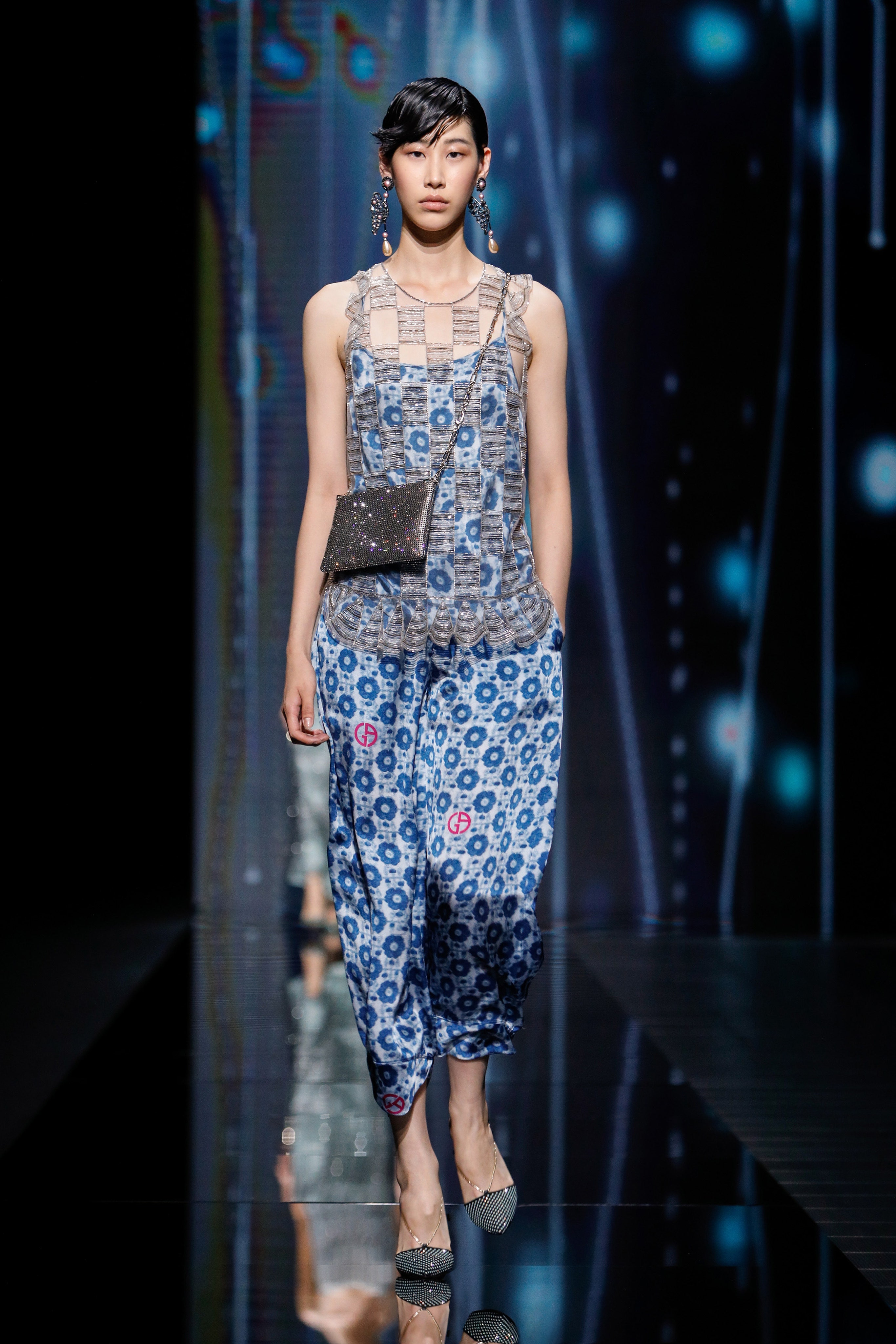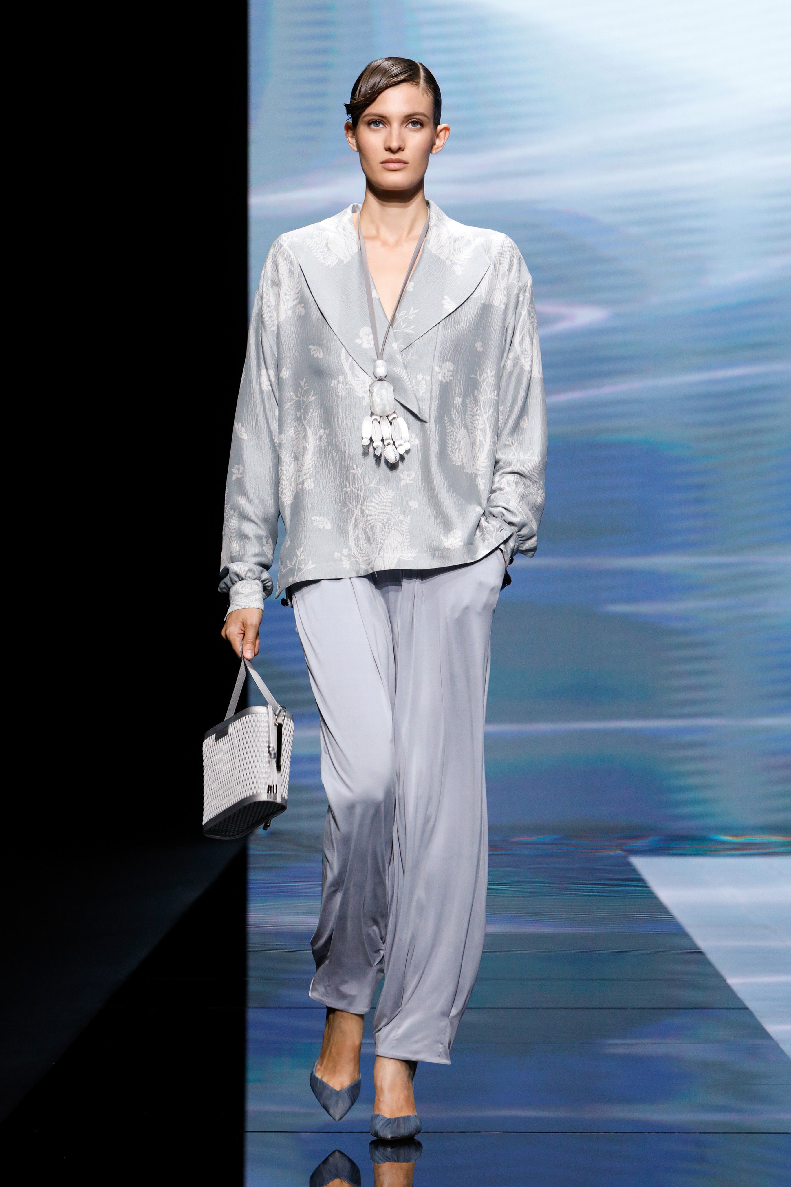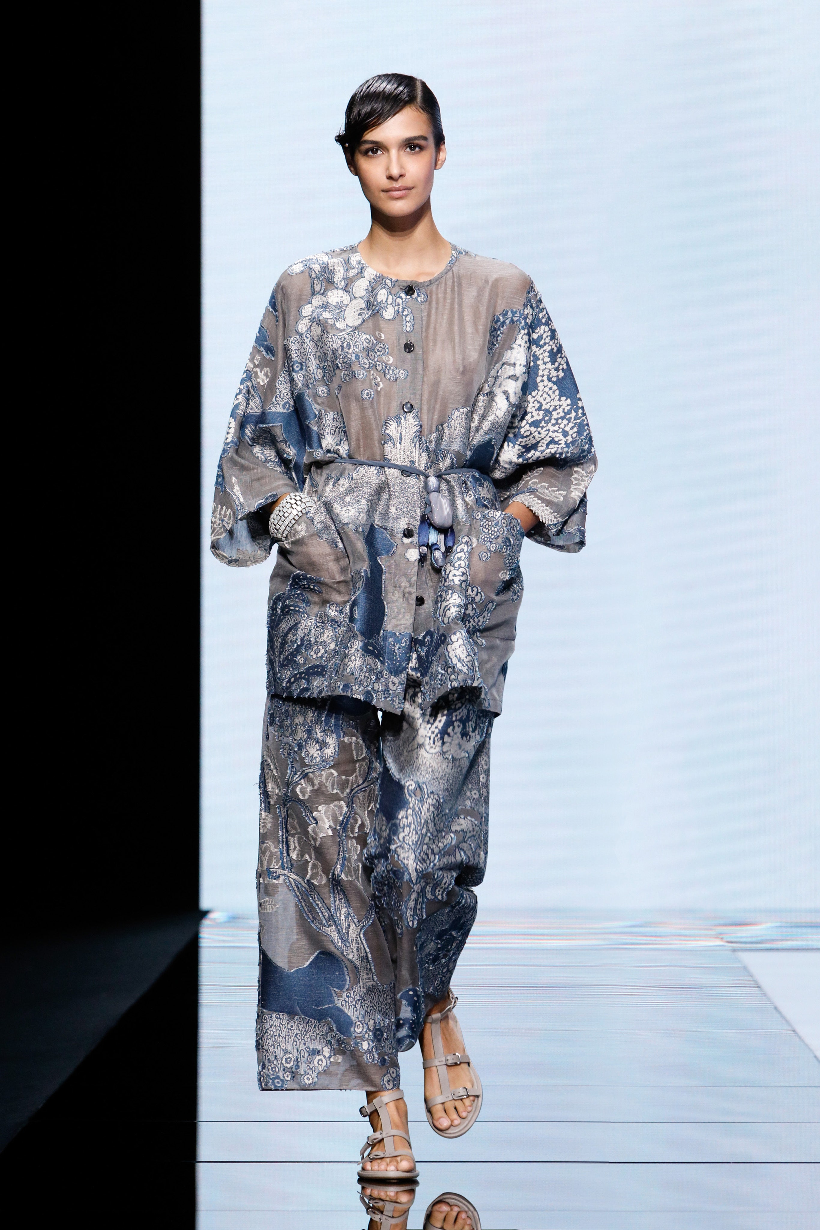 Лейтмотив весны по версии Giorgio Armani — эстетика традиционного японского костюма: удлиненные платья покрывает принт в виде морских волн художника Кацусики Хокусая, а многослойные мужские костюмы напоминают о повседневной одежде вольных самураев. Отдельные вещи, например небесно-голубой и жемчужно-серый жакеты, скроены с отложным воротом, который напоминает полураспахнутое кимоно, иные образы коллекции дополнены изящными поясами на манер японских оби.