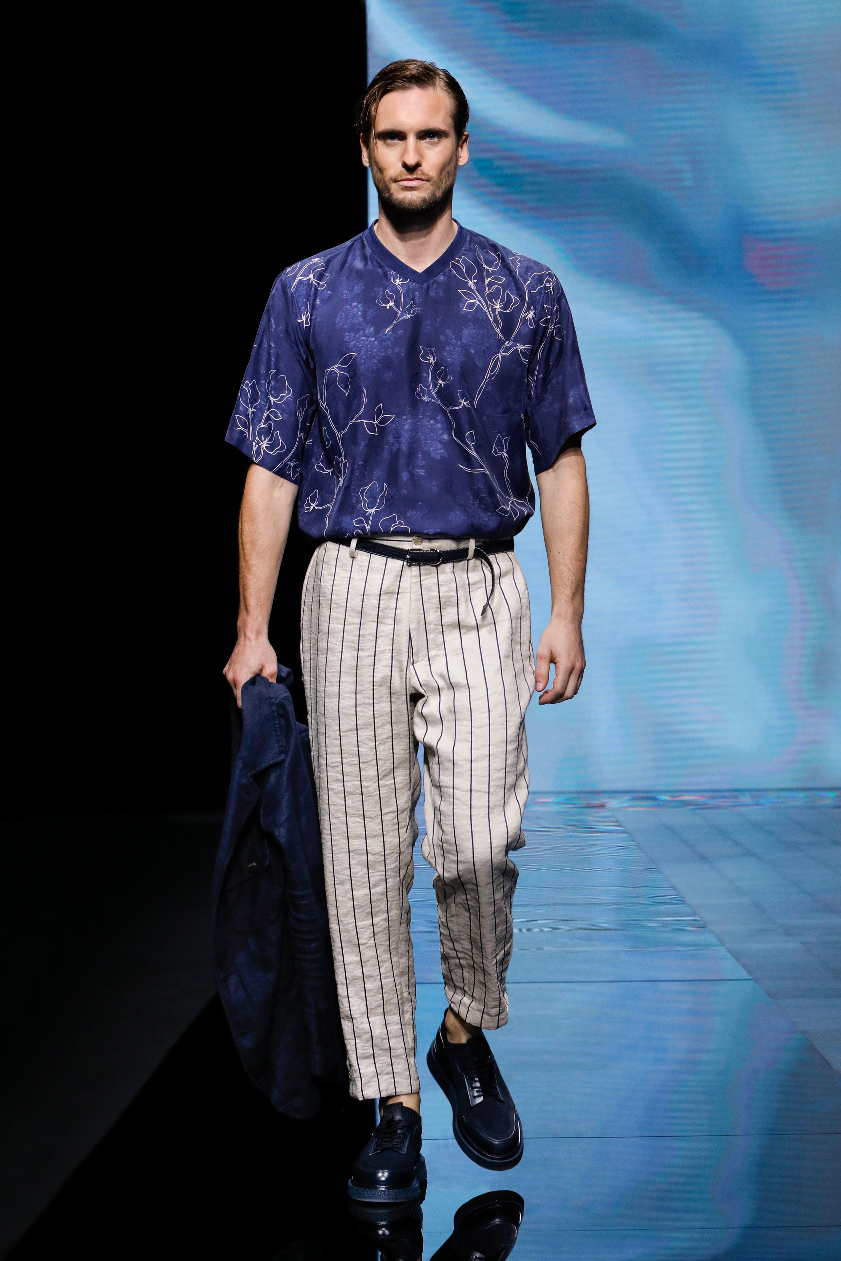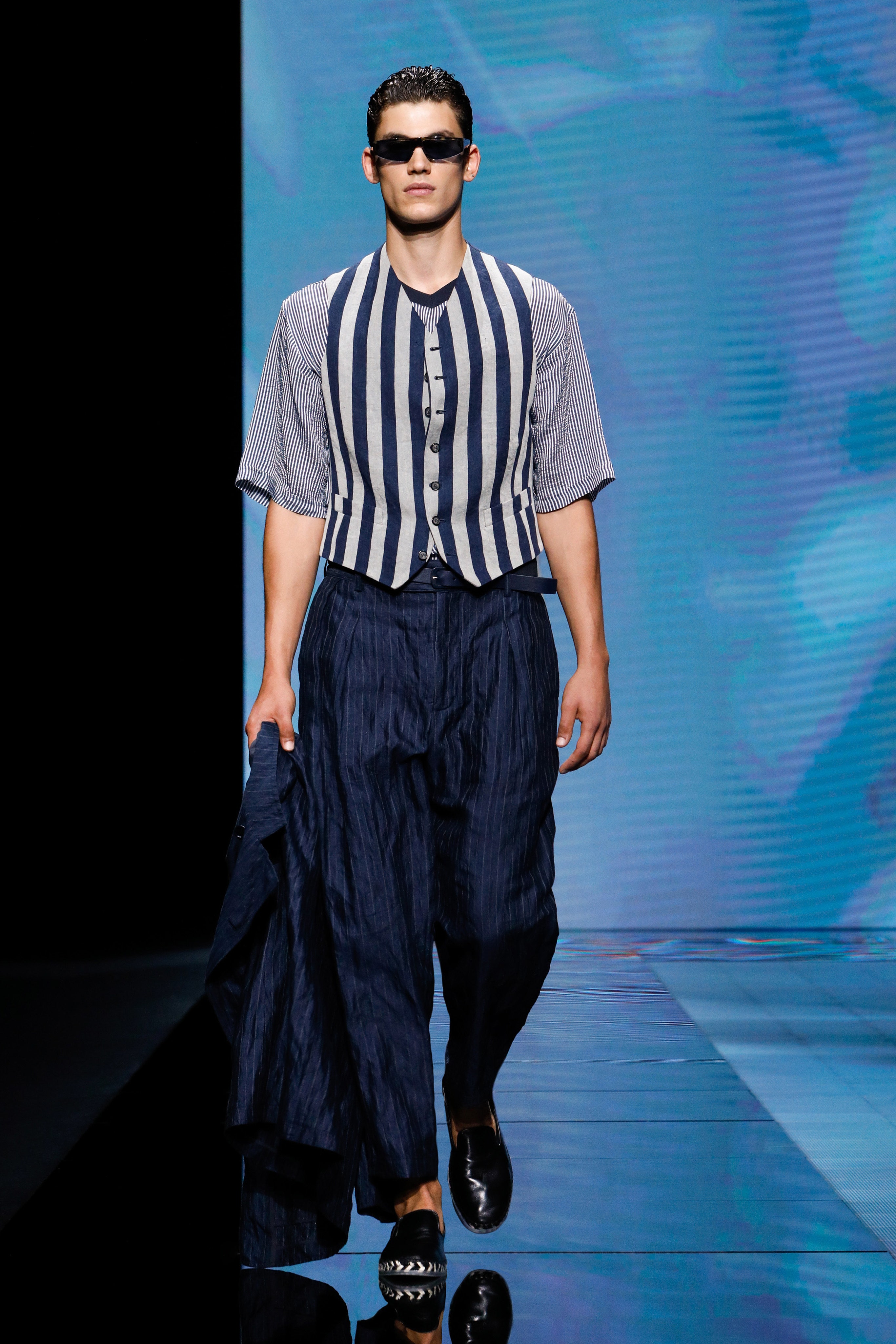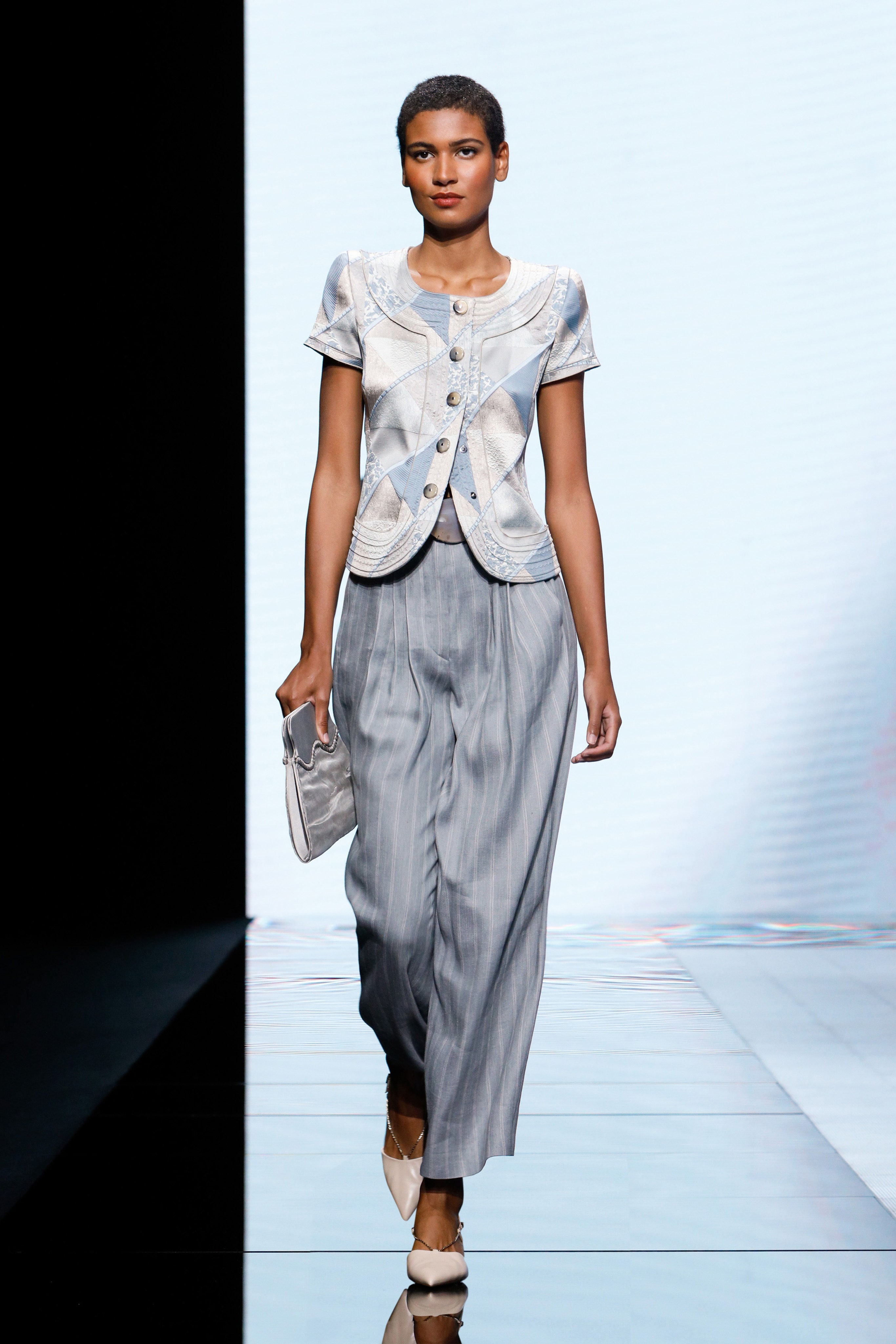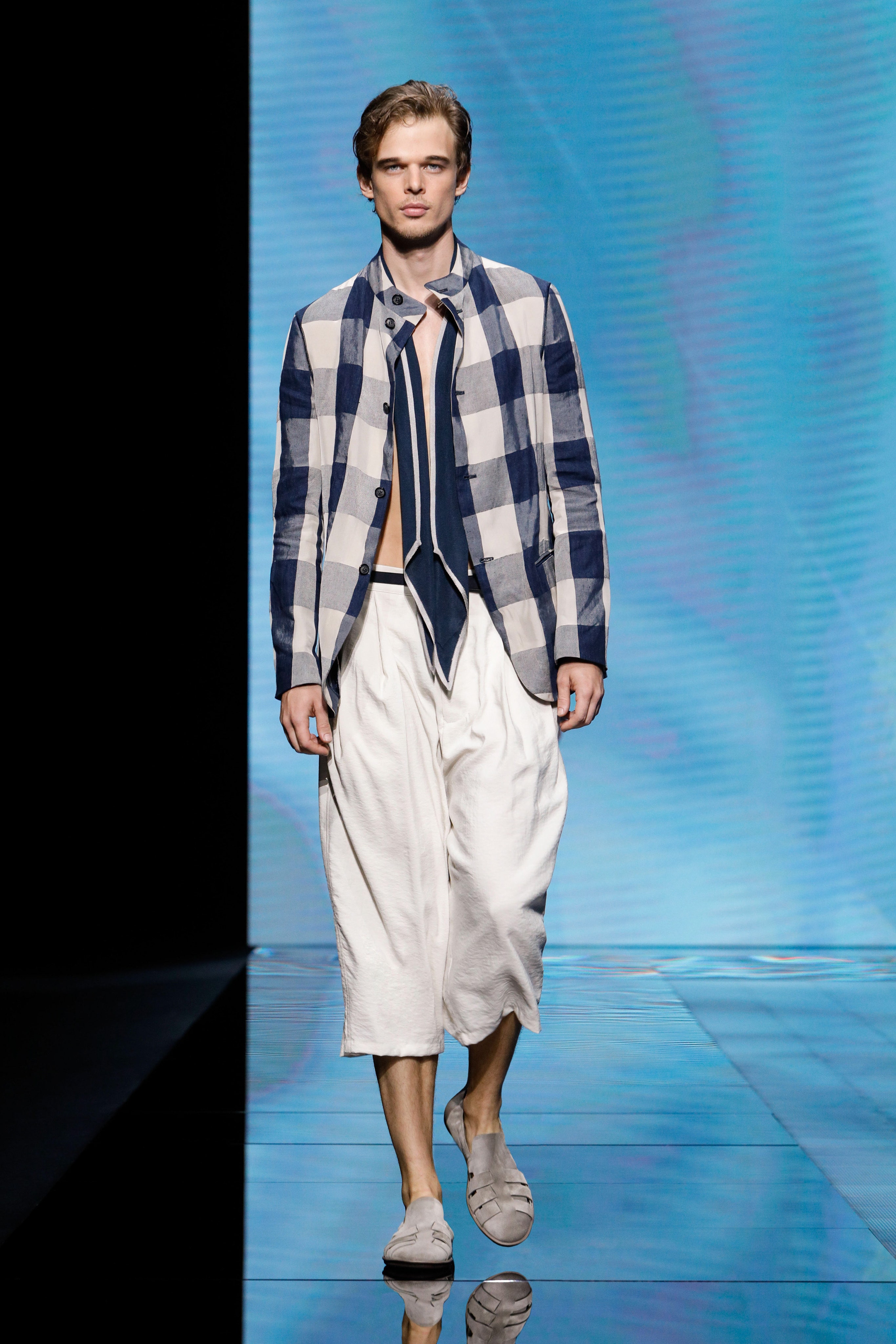 Лейтмотив весны по версии Giorgio Armani — эстетика традиционного японского костюма: удлиненные платья покрывает принт в виде морских волн художника Кацусики Хокусая, а многослойные мужские костюмы напоминают о повседневной одежде вольных самураев. Отдельные вещи, например небесно-голубой и жемчужно-серый жакеты, скроены с отложным воротом, который напоминает полураспахнутое кимоно, иные образы коллекции дополнены изящными поясами на манер японских оби.