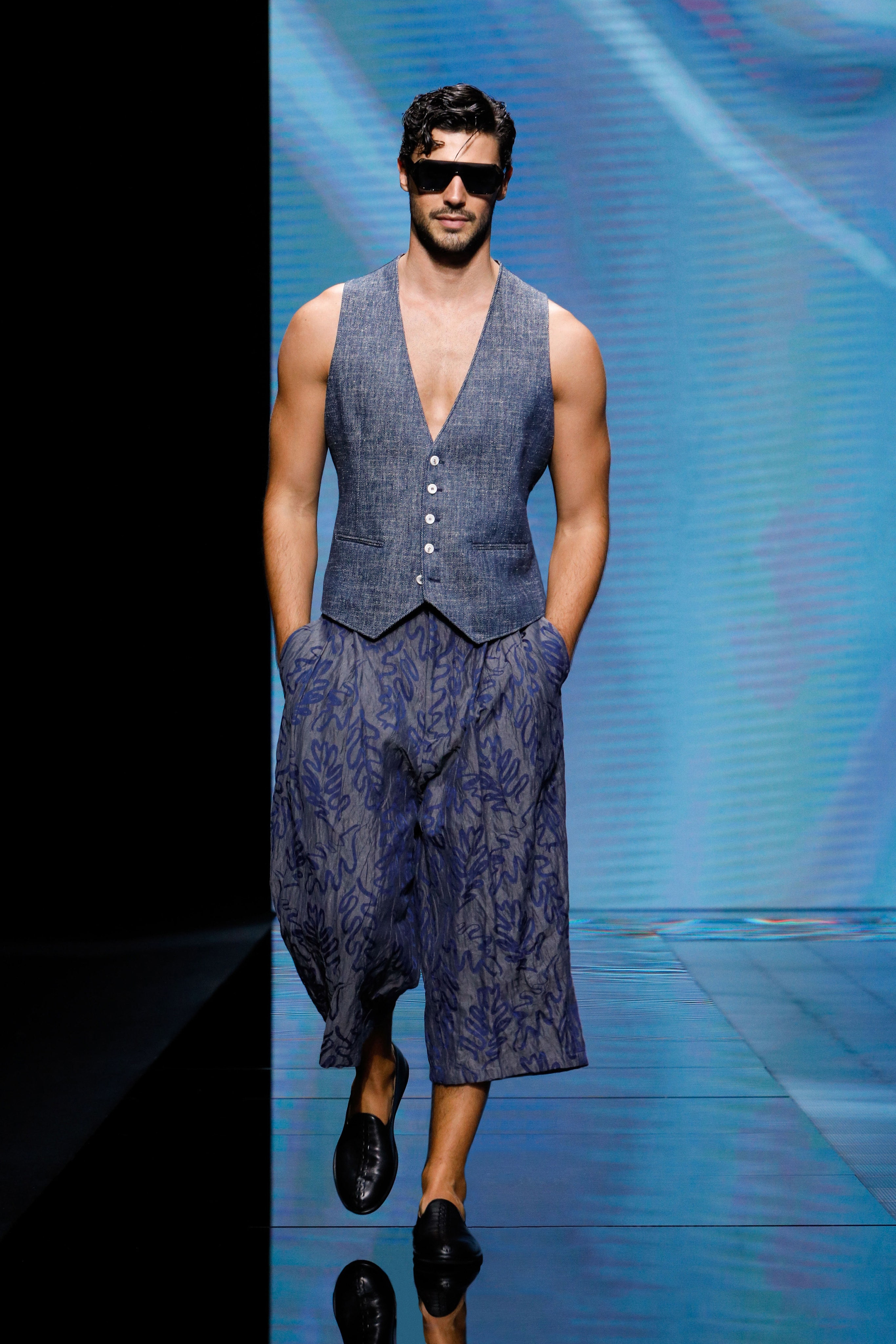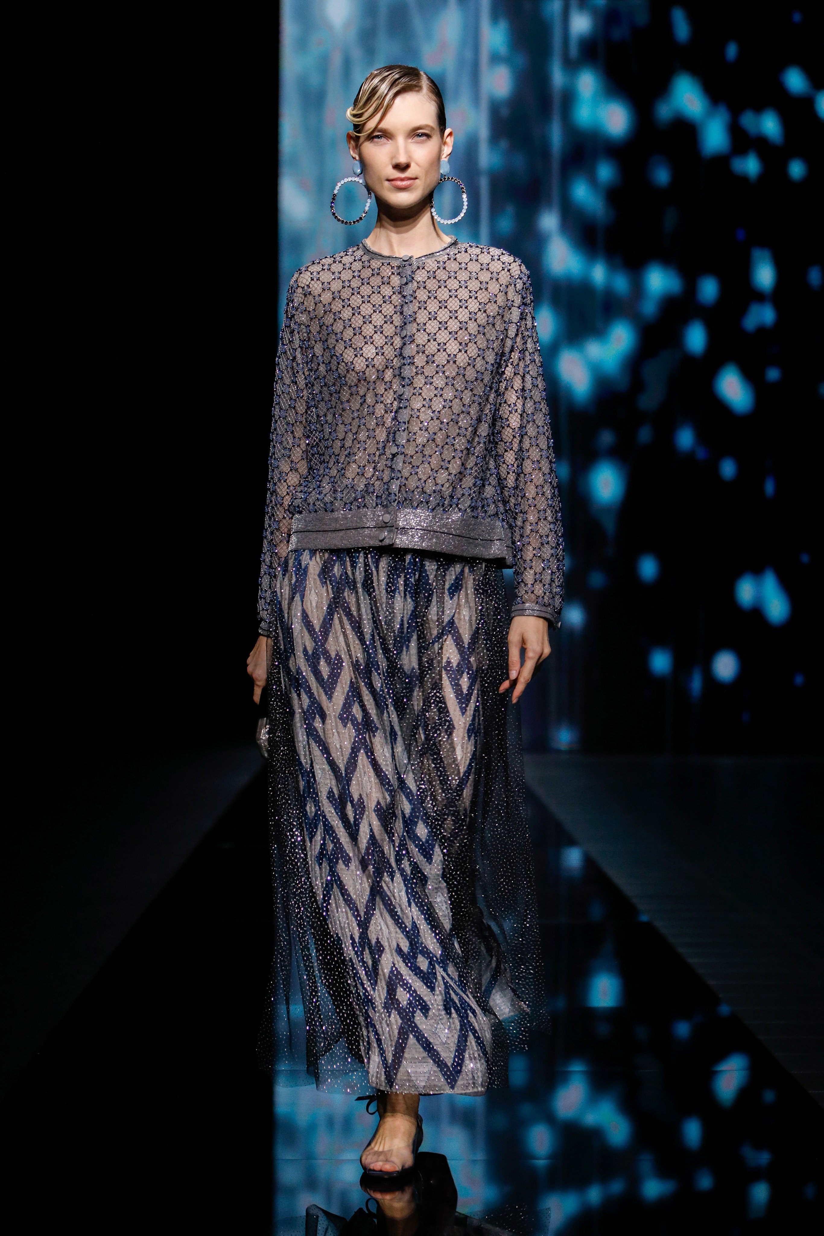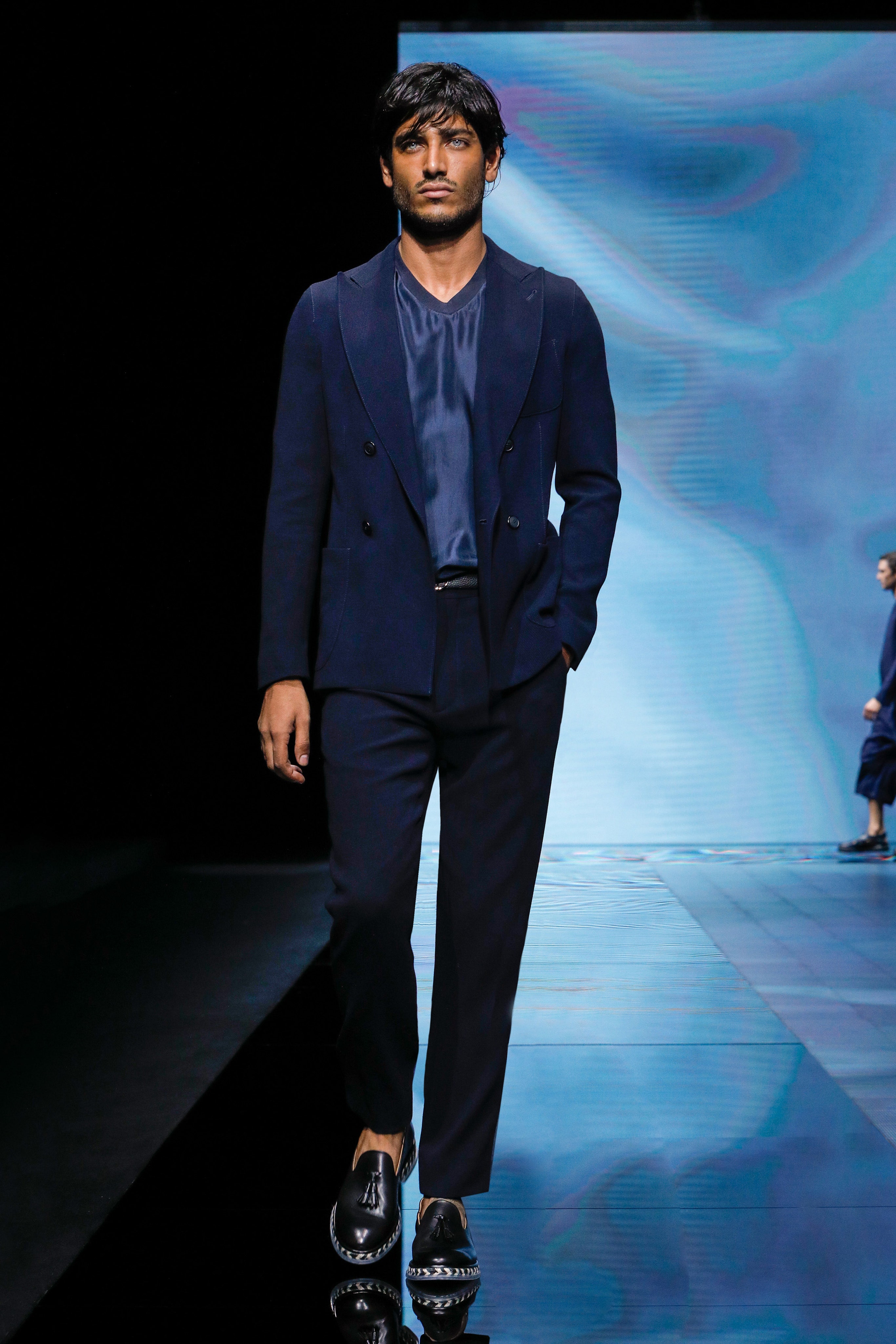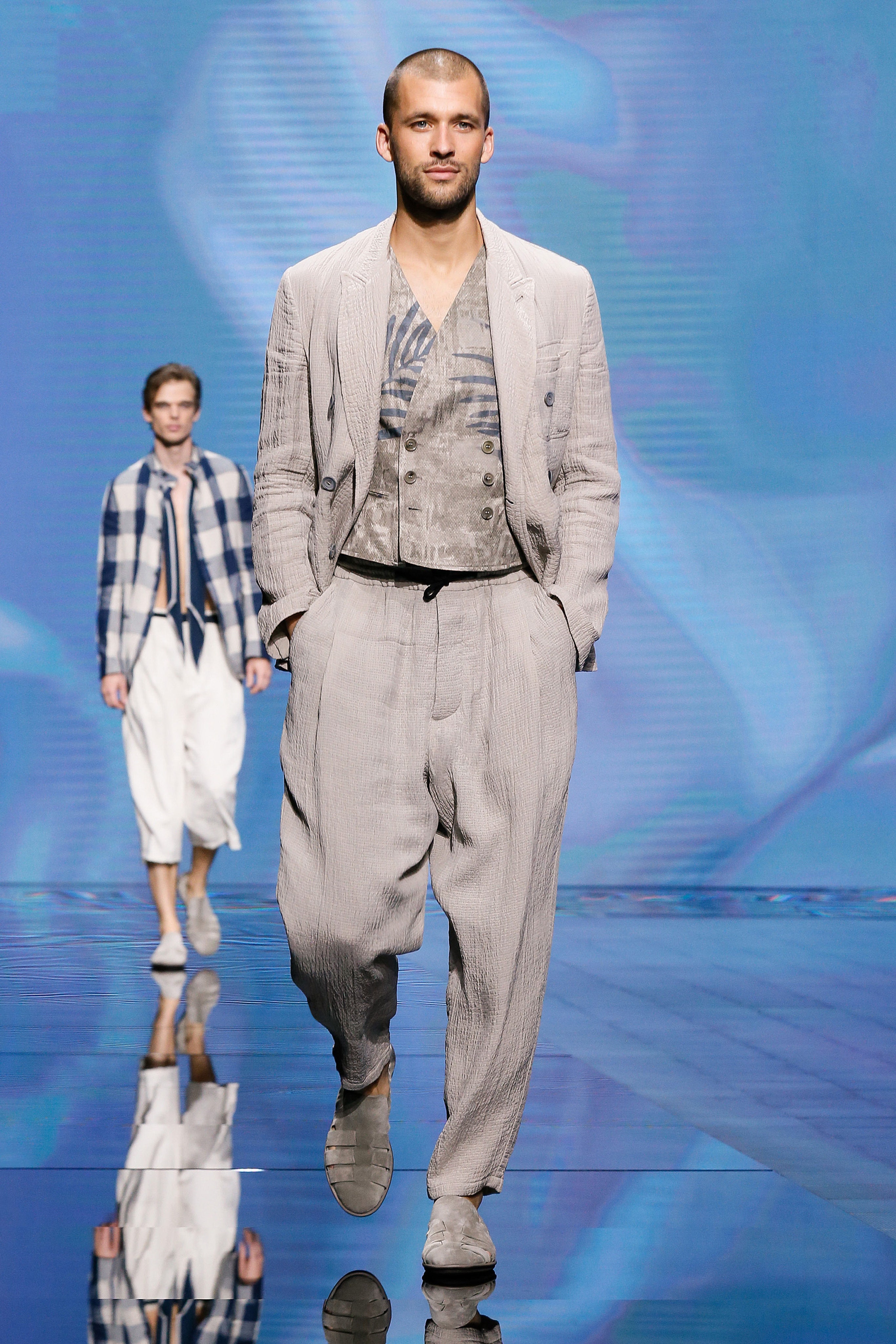 Лейтмотив весны по версии Giorgio Armani — эстетика традиционного японского костюма: удлиненные платья покрывает принт в виде морских волн художника Кацусики Хокусая, а многослойные мужские костюмы напоминают о повседневной одежде вольных самураев. Отдельные вещи, например небесно-голубой и жемчужно-серый жакеты, скроены с отложным воротом, который напоминает полураспахнутое кимоно, иные образы коллекции дополнены изящными поясами на манер японских оби.