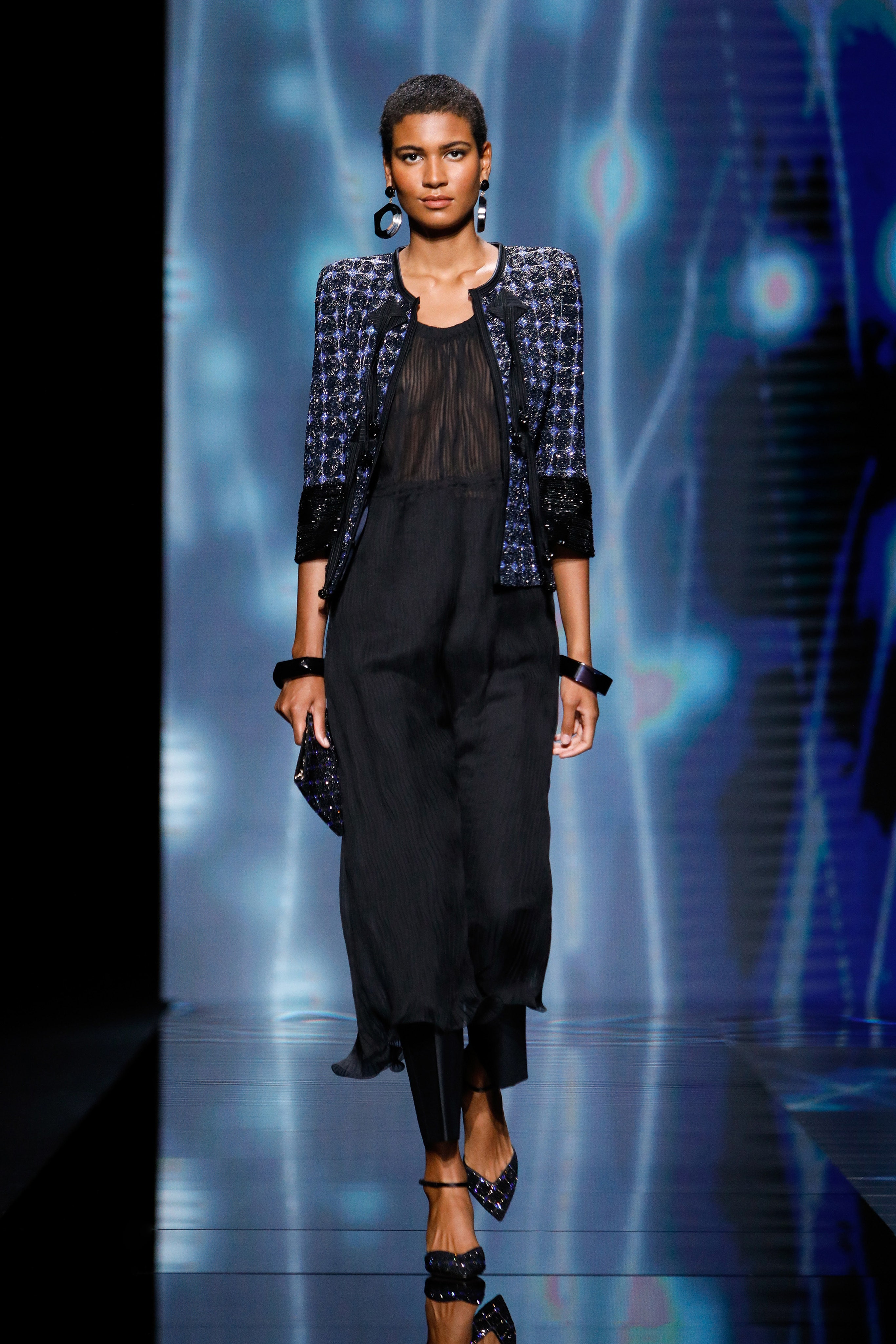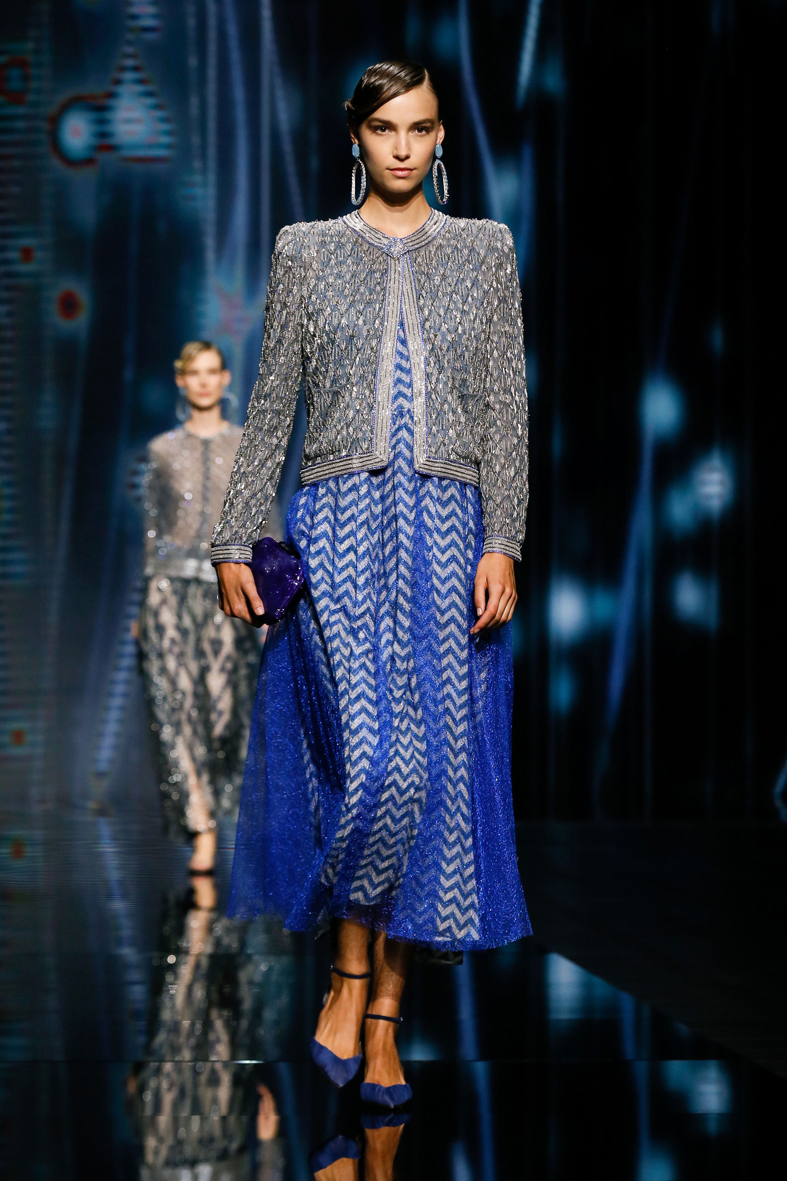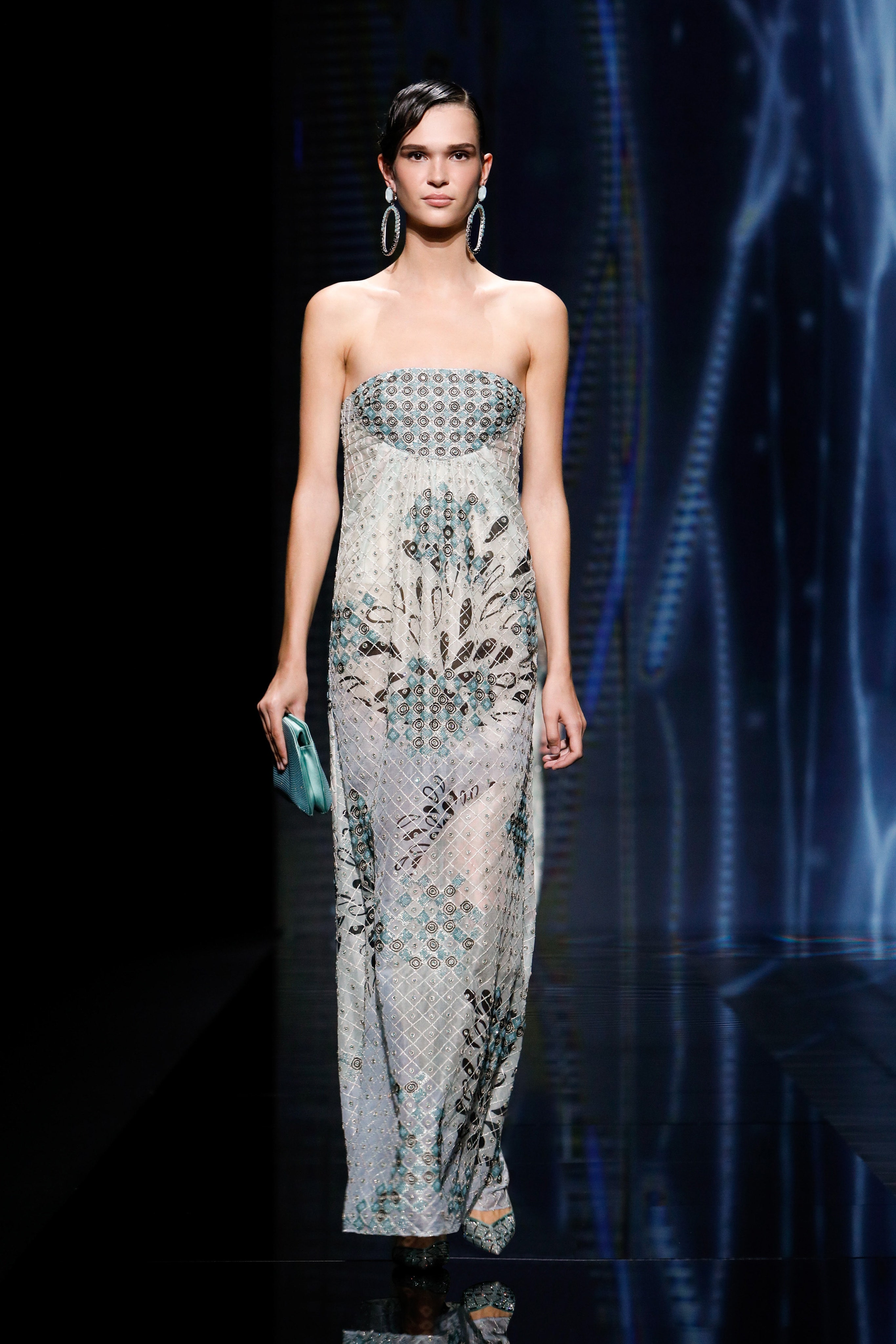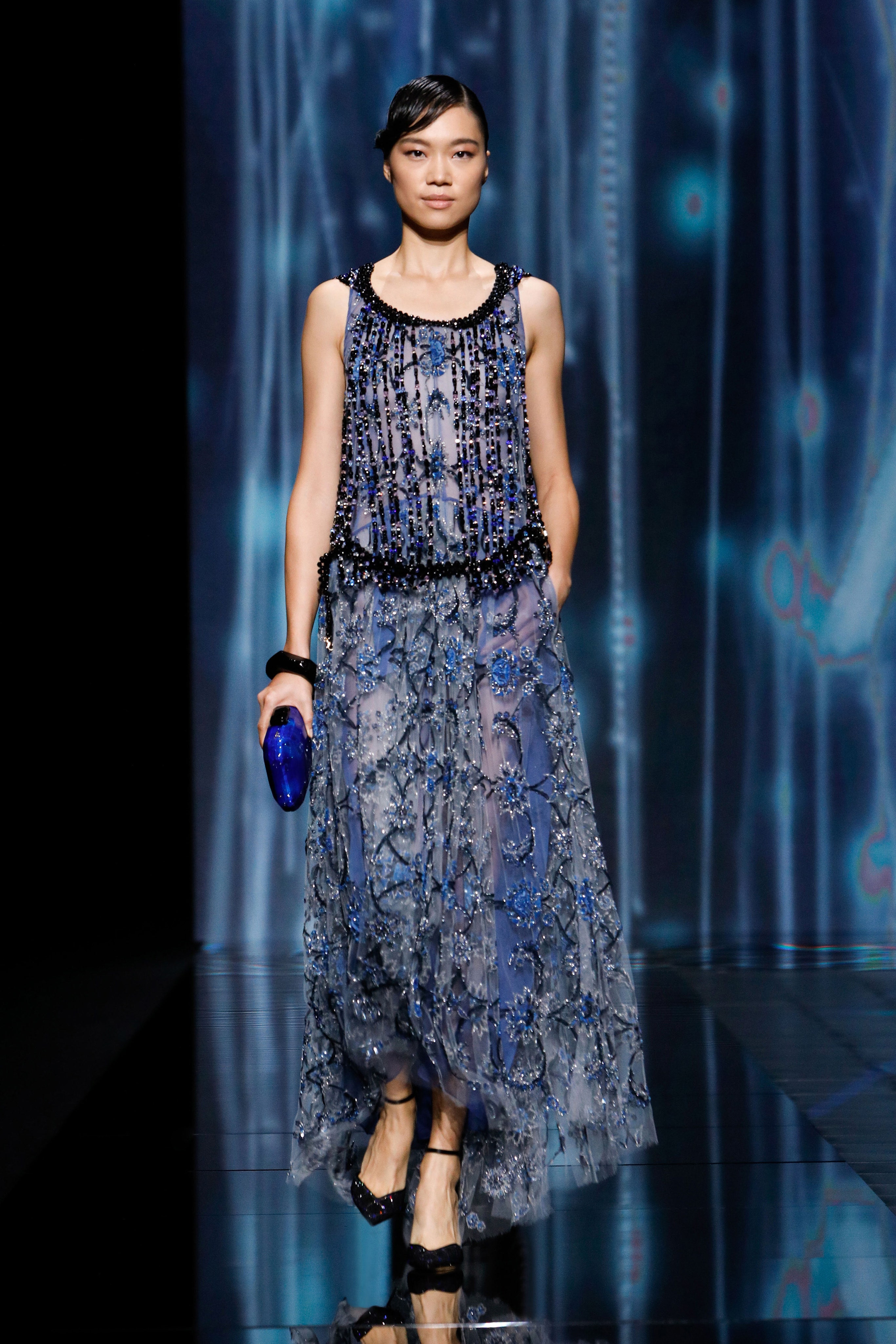 Лейтмотив весны по версии Giorgio Armani — эстетика традиционного японского костюма: удлиненные платья покрывает принт в виде морских волн художника Кацусики Хокусая, а многослойные мужские костюмы напоминают о повседневной одежде вольных самураев. Отдельные вещи, например небесно-голубой и жемчужно-серый жакеты, скроены с отложным воротом, который напоминает полураспахнутое кимоно, иные образы коллекции дополнены изящными поясами на манер японских оби.