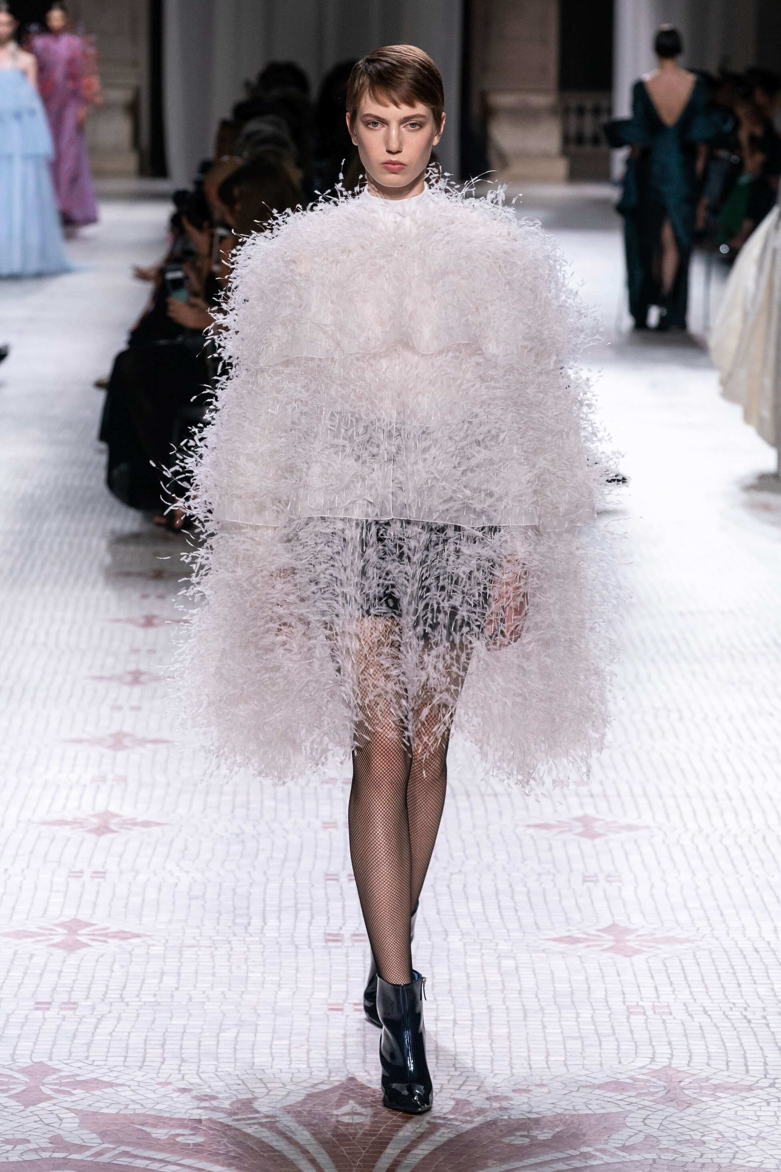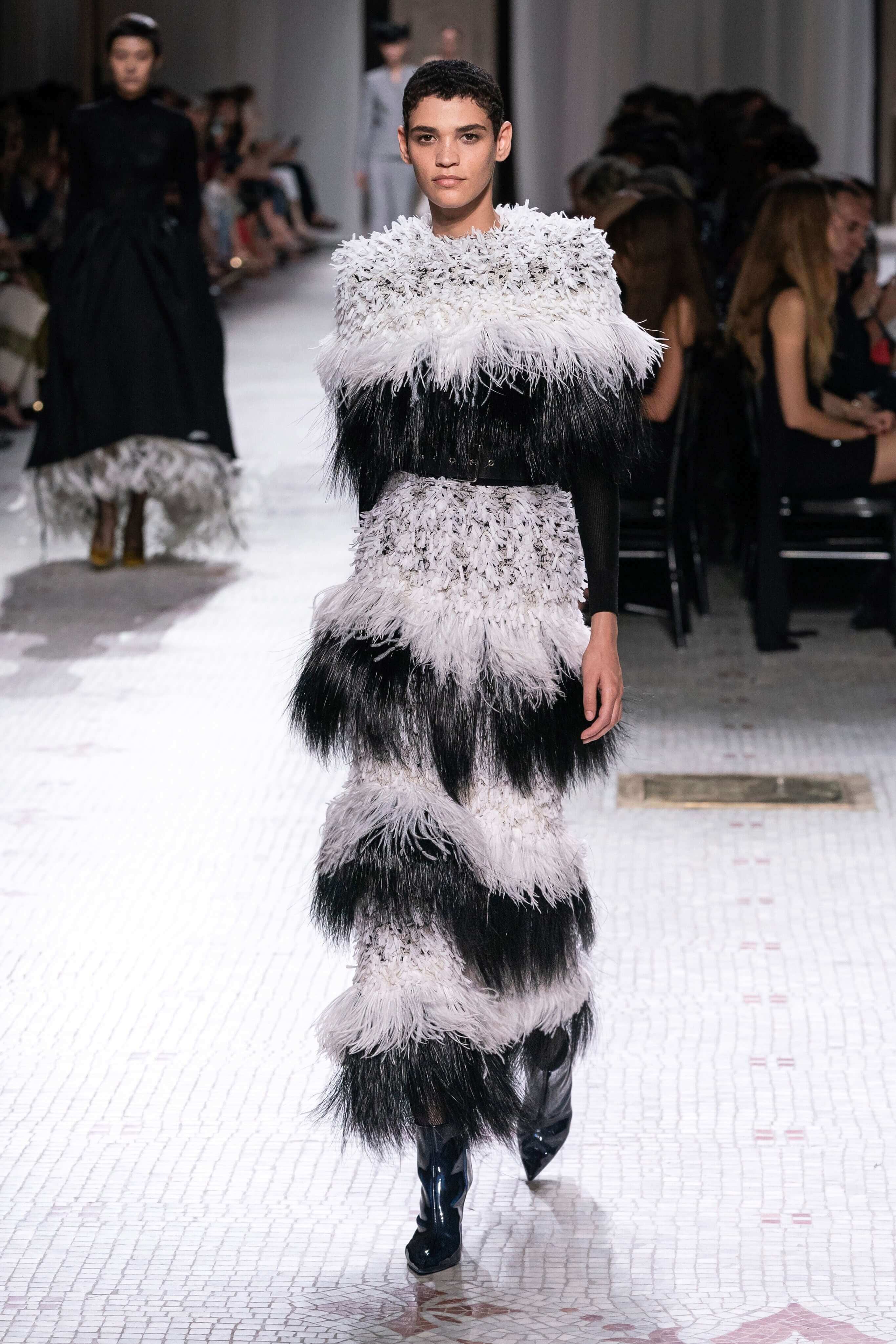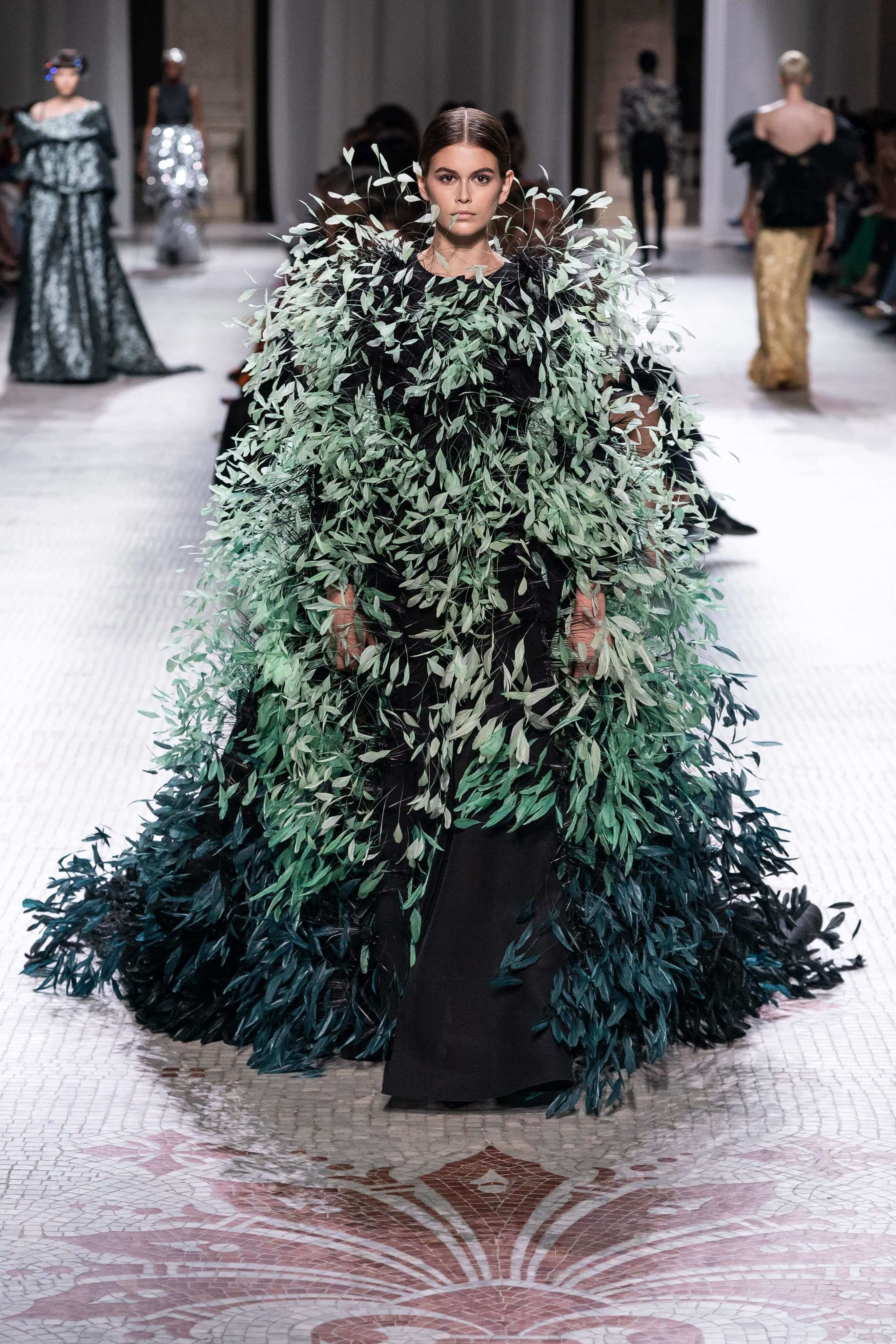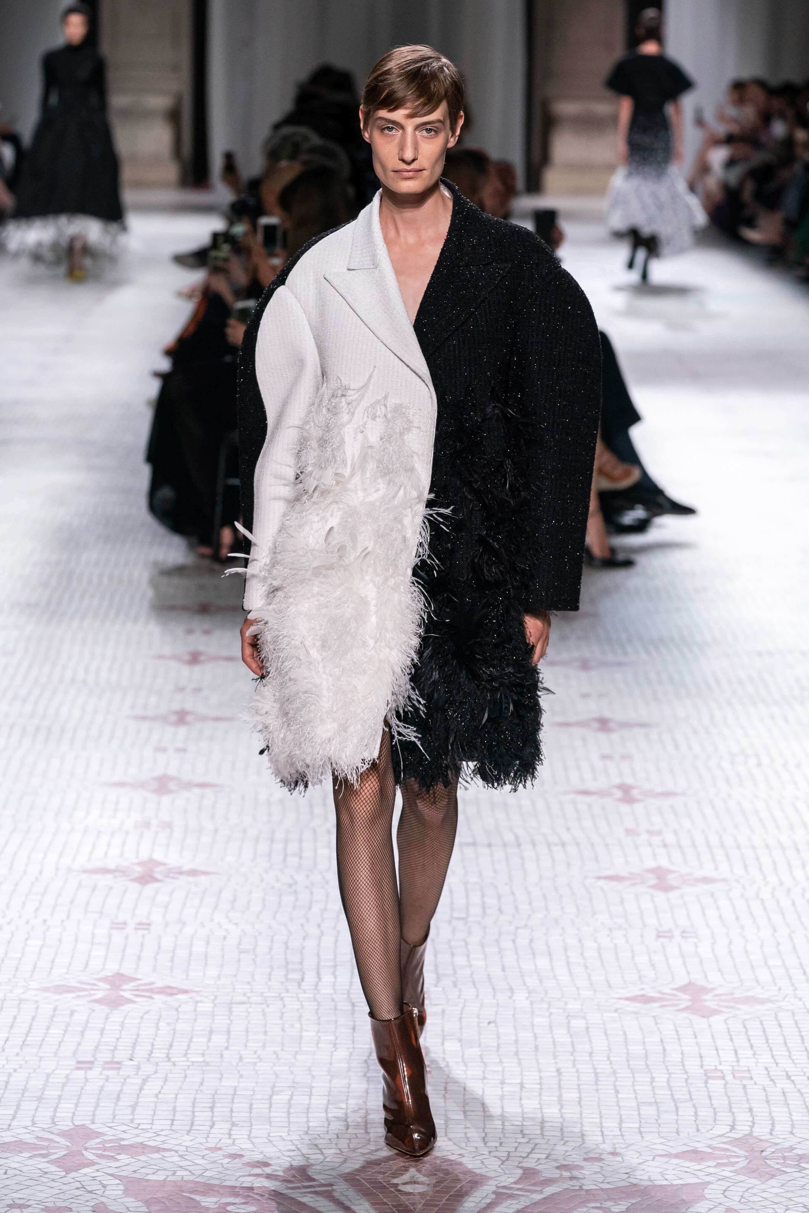 Нечто от Французской революции читается и в мужских образах коллекции — узкие брюки, удлиненные пиджаки с блестящими белыми лацканами поверх светлых гольфов с присобранными горловинами отсылают нашу память к образам Наполеона Бонапарта. Одним из заглавных для Клэр Уэйт Келлер стал также образ женщины-птицы, свободной и необузданной. Эта идея была выражена в экстравагантных укладках моделей, напоминающих взбитый ветром хохолок птичьих перьев. Сами же перья украшали большую часть нарядов коллекции, то оттеняя подол пышного вечернего платья, то покрывая иное одеяние. Главным стал выход модели Кайи Гербер в изысканном платье, напоминающем оперение сказочной птицы: плотный черный атлас был густо и объемно декорирован перьями мятно-серого и цвета морской волны.
