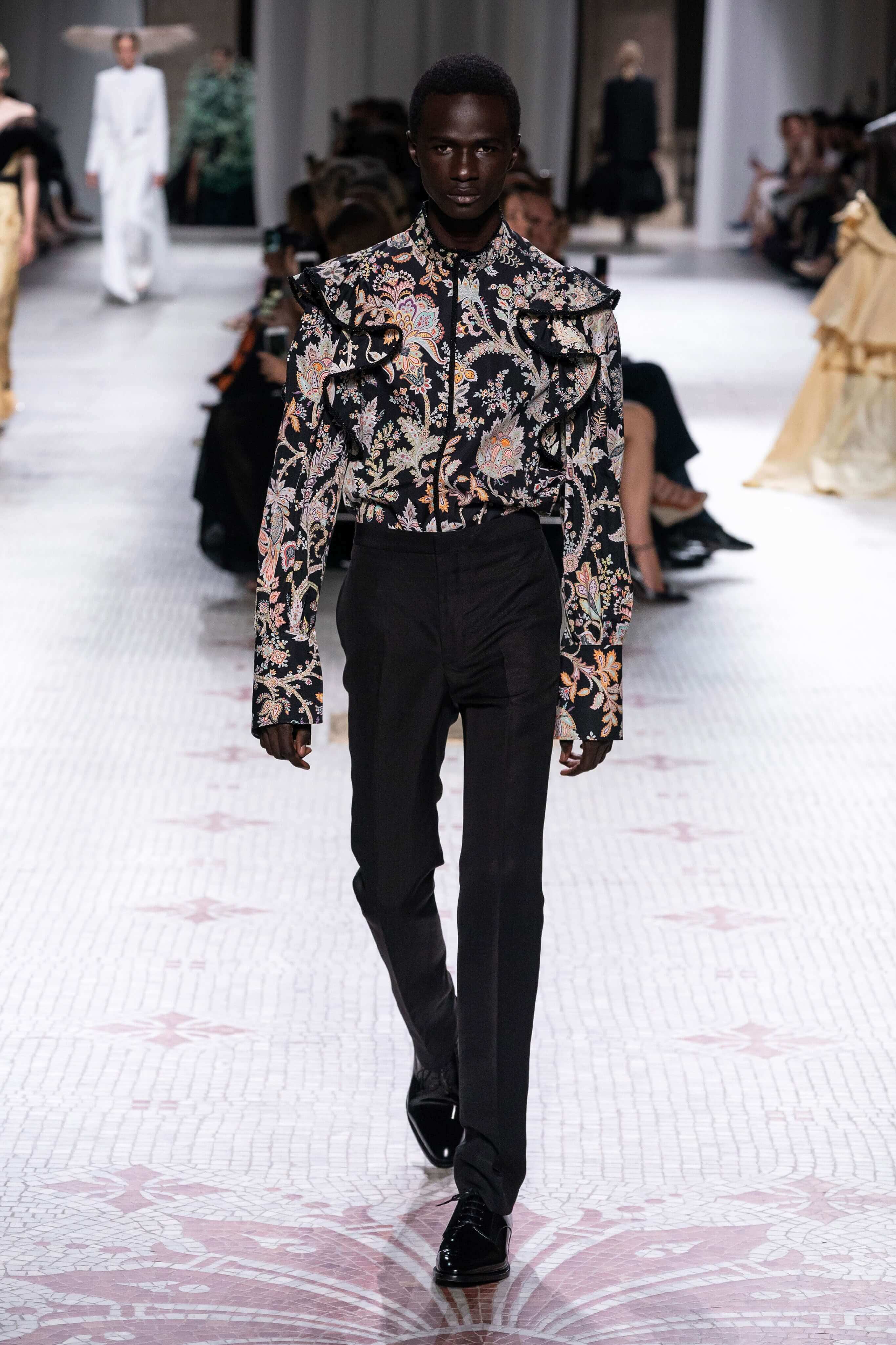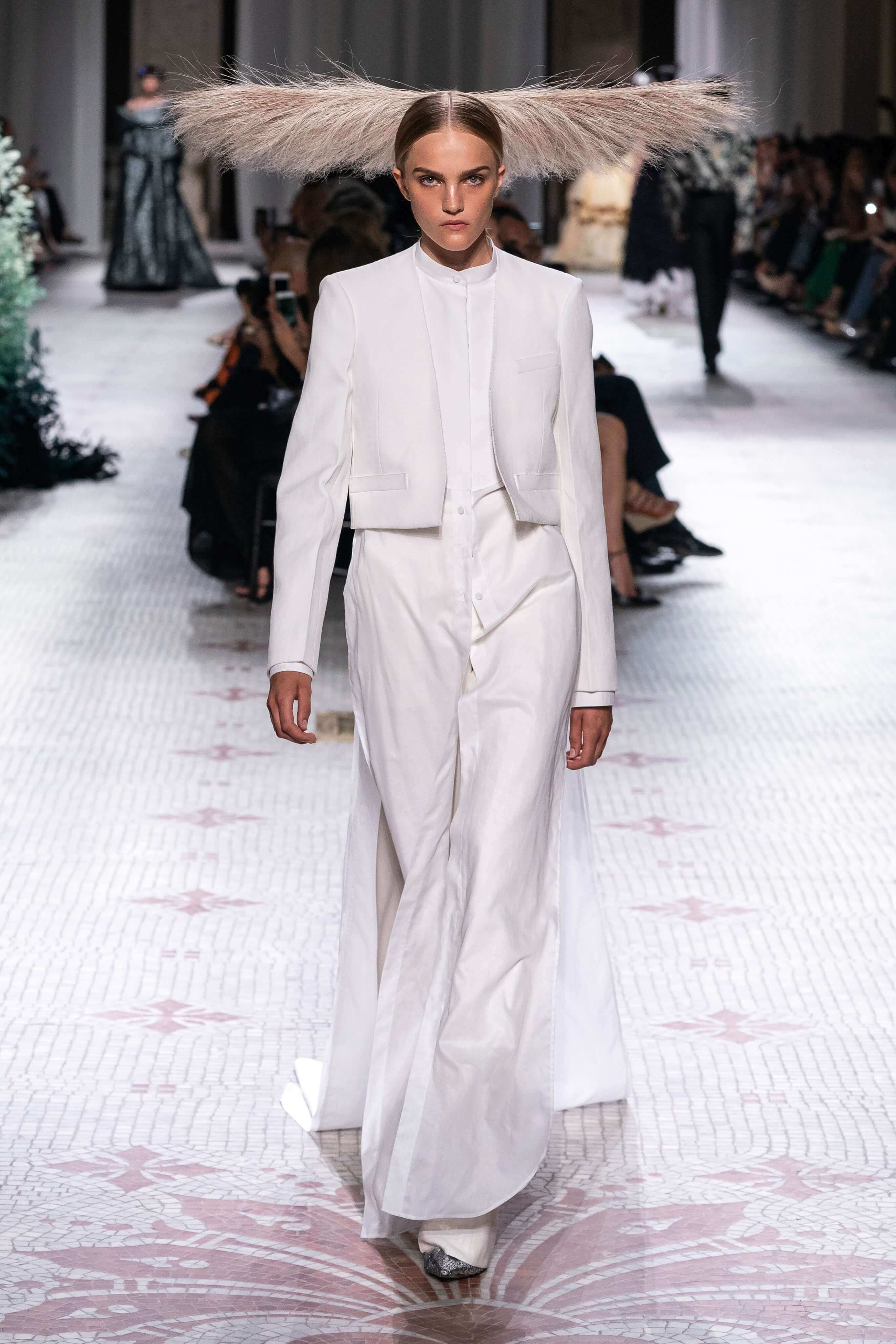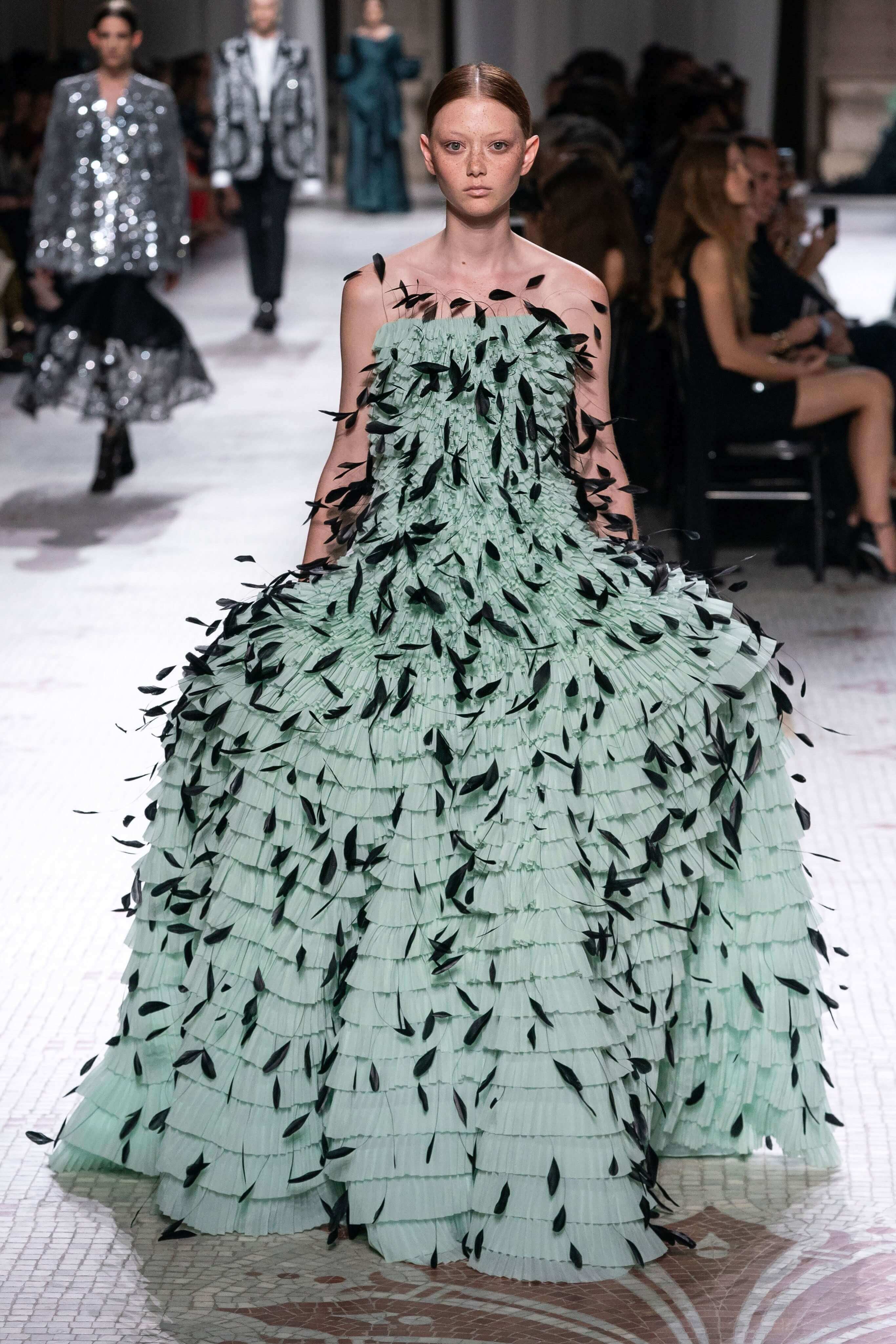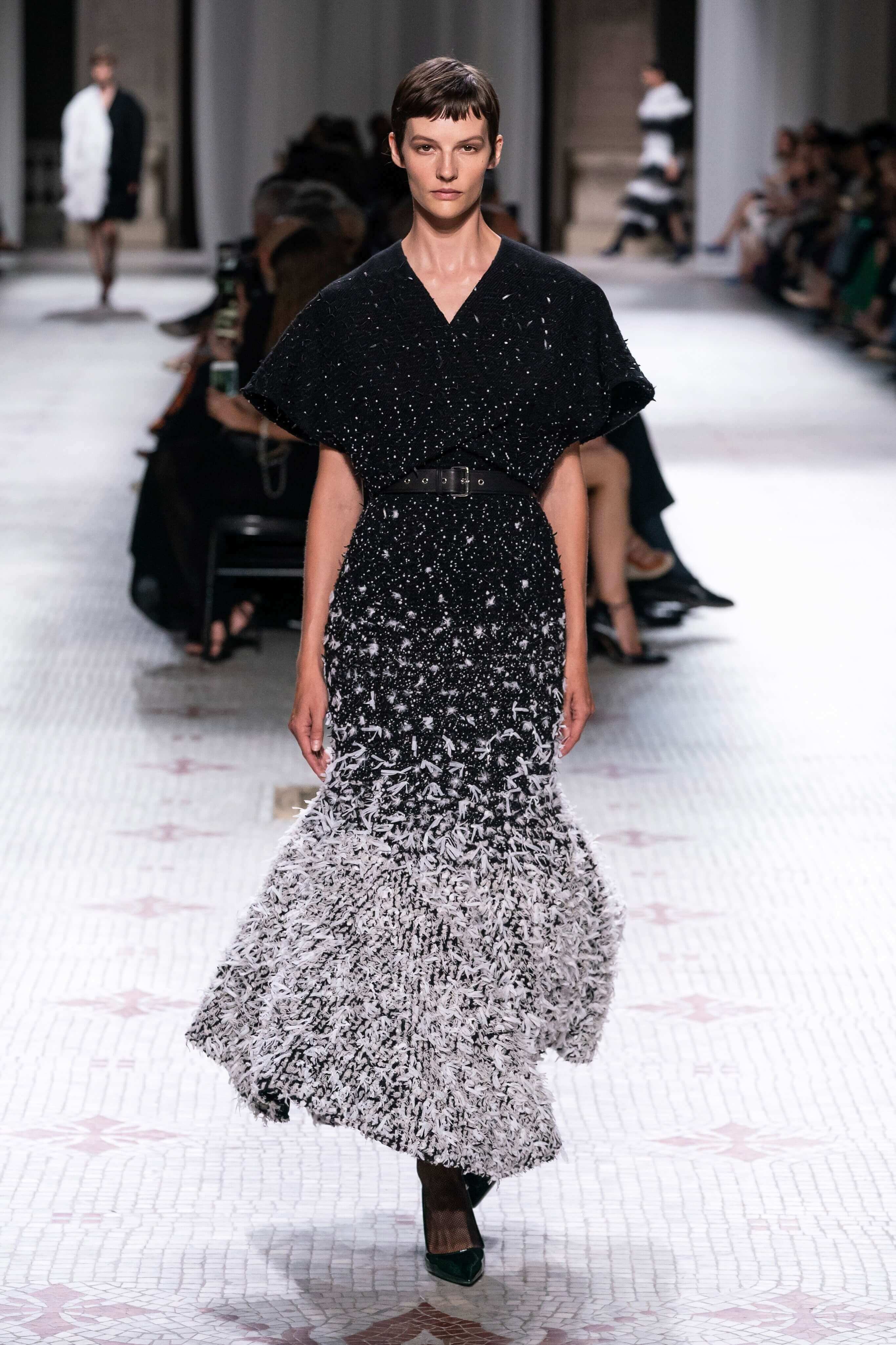 Нечто от Французской революции читается и в мужских образах коллекции — узкие брюки, удлиненные пиджаки с блестящими белыми лацканами поверх светлых гольфов с присобранными горловинами отсылают нашу память к образам Наполеона Бонапарта. Одним из заглавных для Клэр Уэйт Келлер стал также образ женщины-птицы, свободной и необузданной. Эта идея была выражена в экстравагантных укладках моделей, напоминающих взбитый ветром хохолок птичьих перьев. Сами же перья украшали большую часть нарядов коллекции, то оттеняя подол пышного вечернего платья, то покрывая иное одеяние. Главным стал выход модели Кайи Гербер в изысканном платье, напоминающем оперение сказочной птицы: плотный черный атлас был густо и объемно декорирован перьями мятно-серого и цвета морской волны.