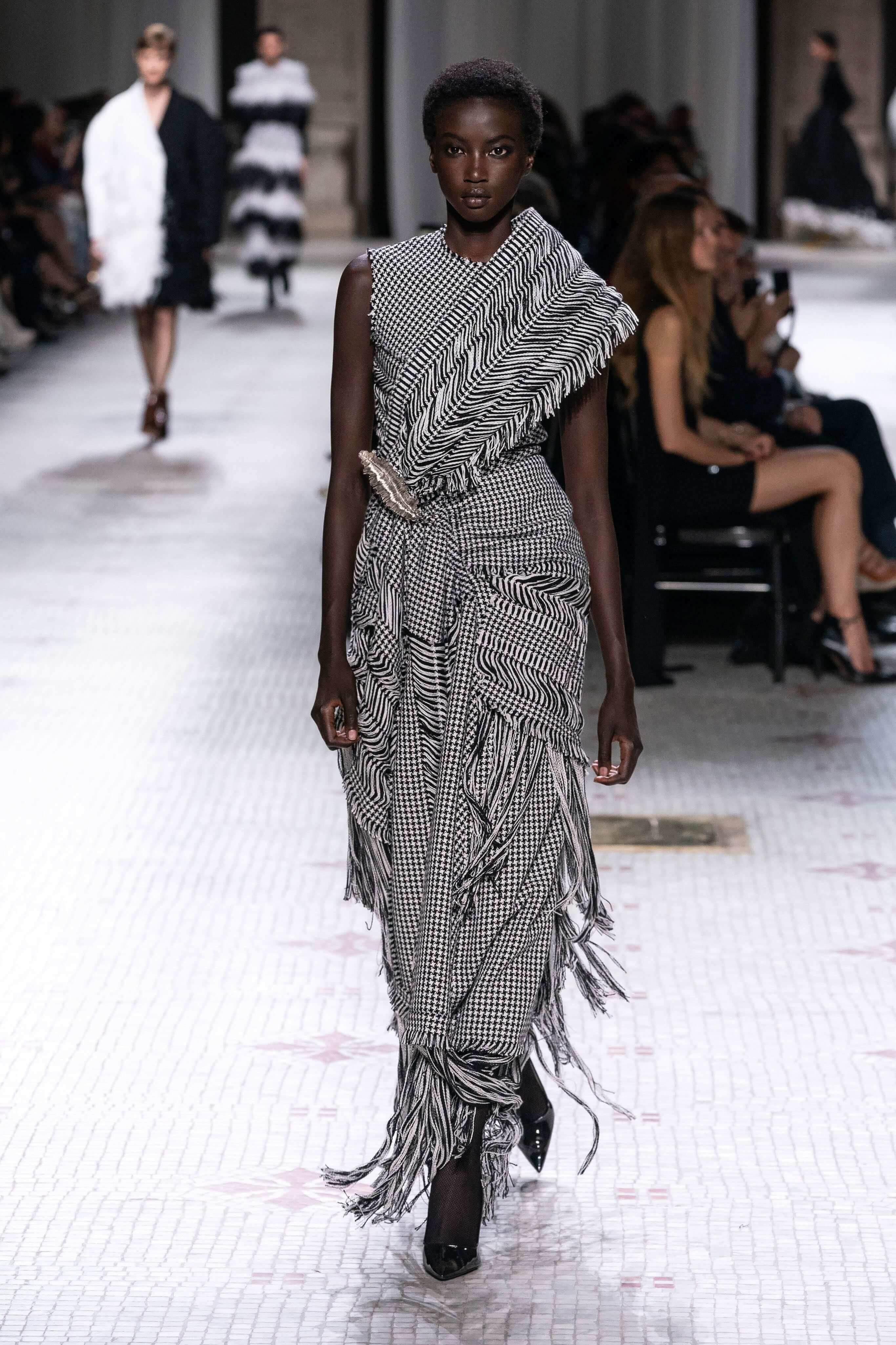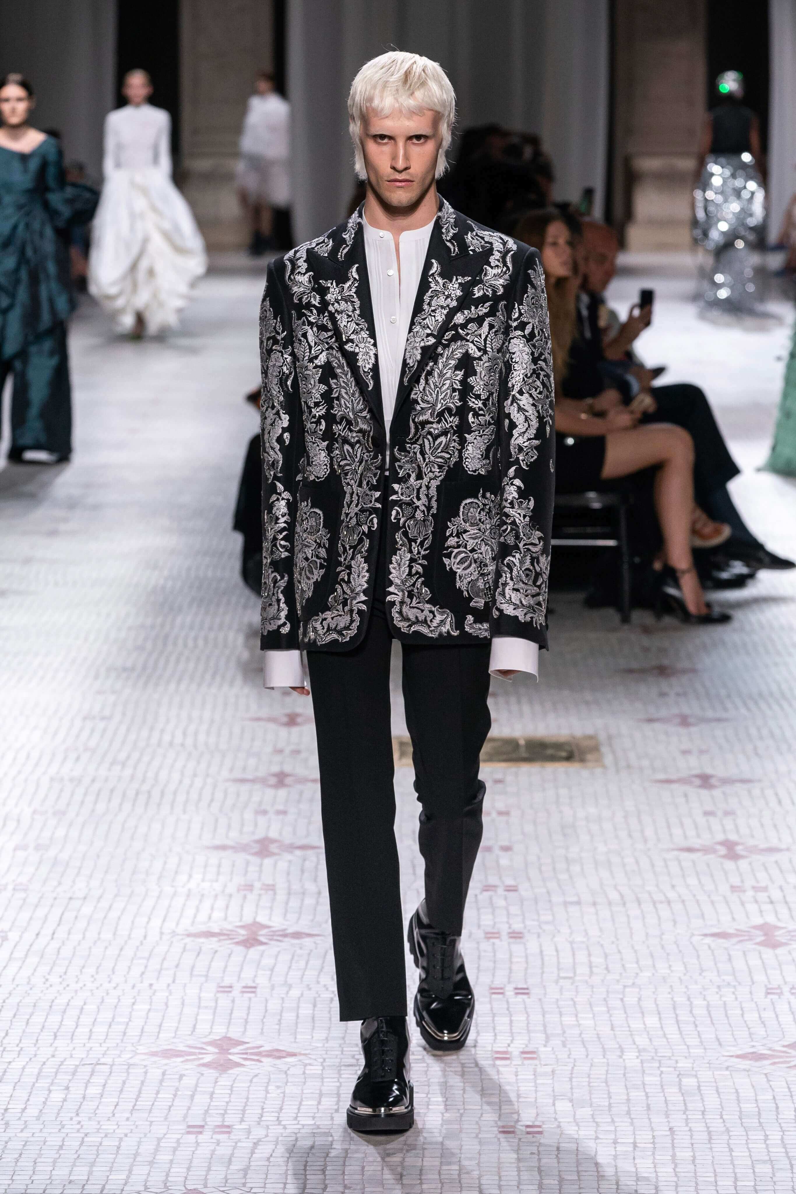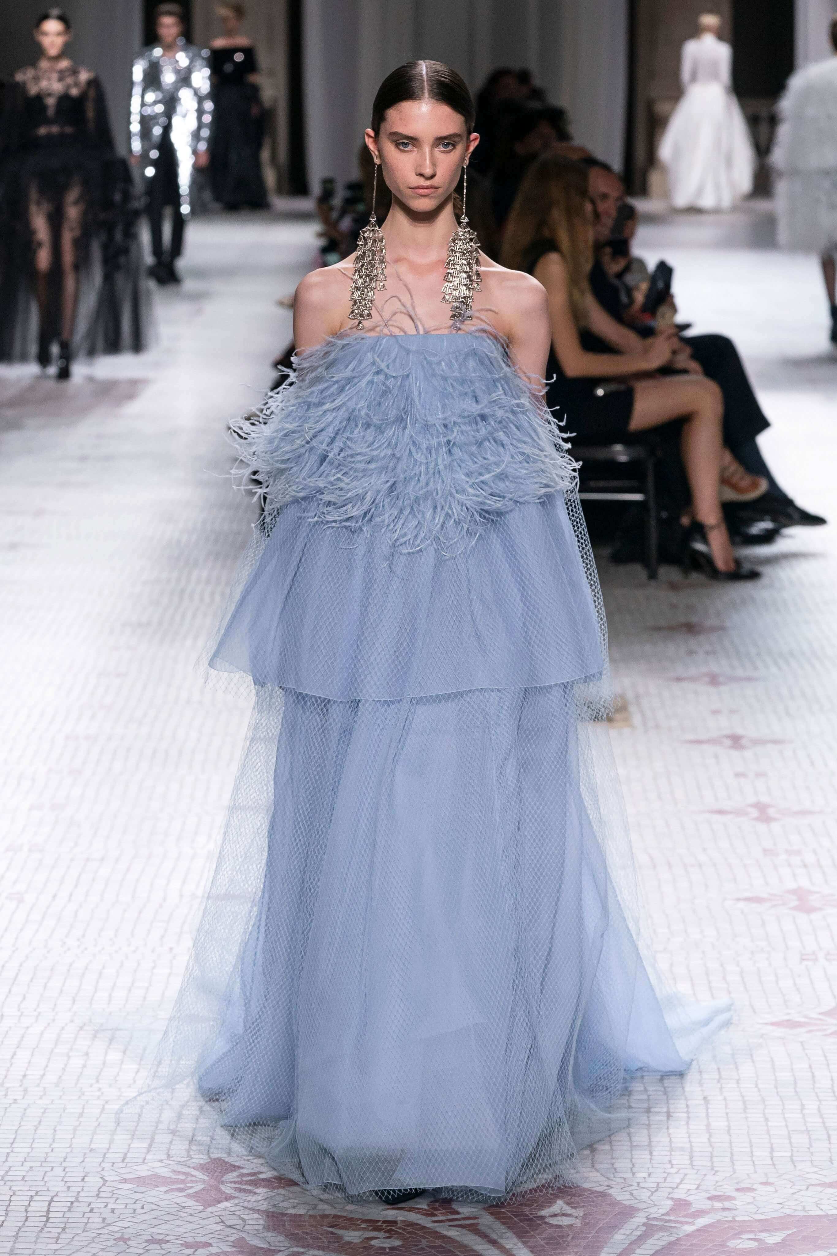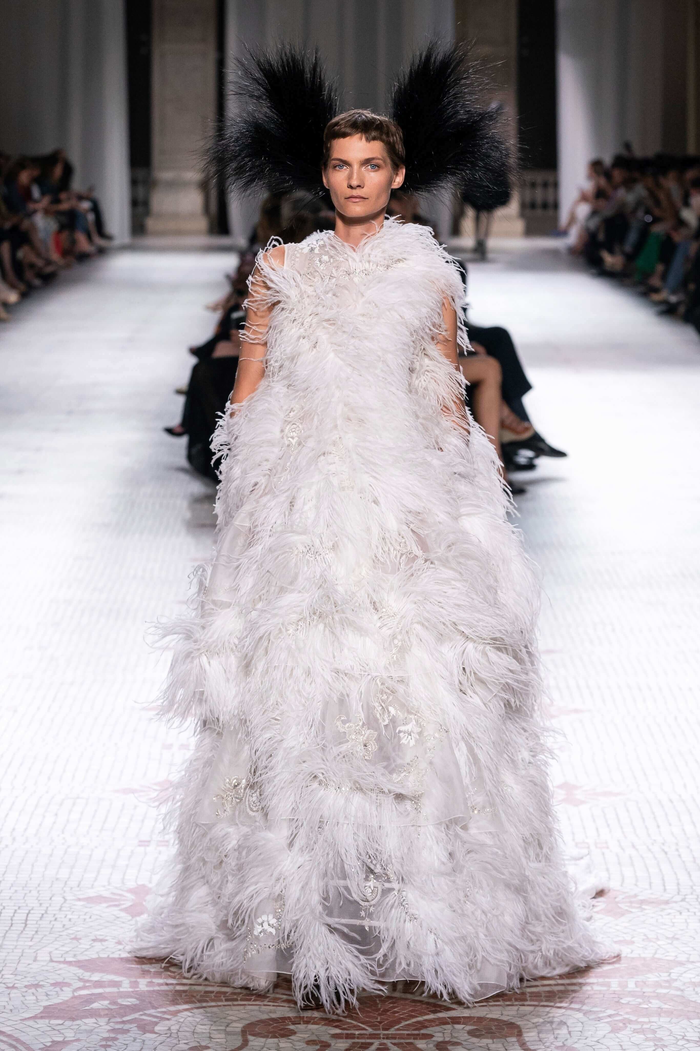 Нечто от Французской революции читается и в мужских образах коллекции — узкие брюки, удлиненные пиджаки с блестящими белыми лацканами поверх светлых гольфов с присобранными горловинами отсылают нашу память к образам Наполеона Бонапарта. Одним из заглавных для Клэр Уэйт Келлер стал также образ женщины-птицы, свободной и необузданной. Эта идея была выражена в экстравагантных укладках моделей, напоминающих взбитый ветром хохолок птичьих перьев. Сами же перья украшали большую часть нарядов коллекции, то оттеняя подол пышного вечернего платья, то покрывая иное одеяние. Главным стал выход модели Кайи Гербер в изысканном платье, напоминающем оперение сказочной птицы: плотный черный атлас был густо и объемно декорирован перьями мятно-серого и цвета морской волны.