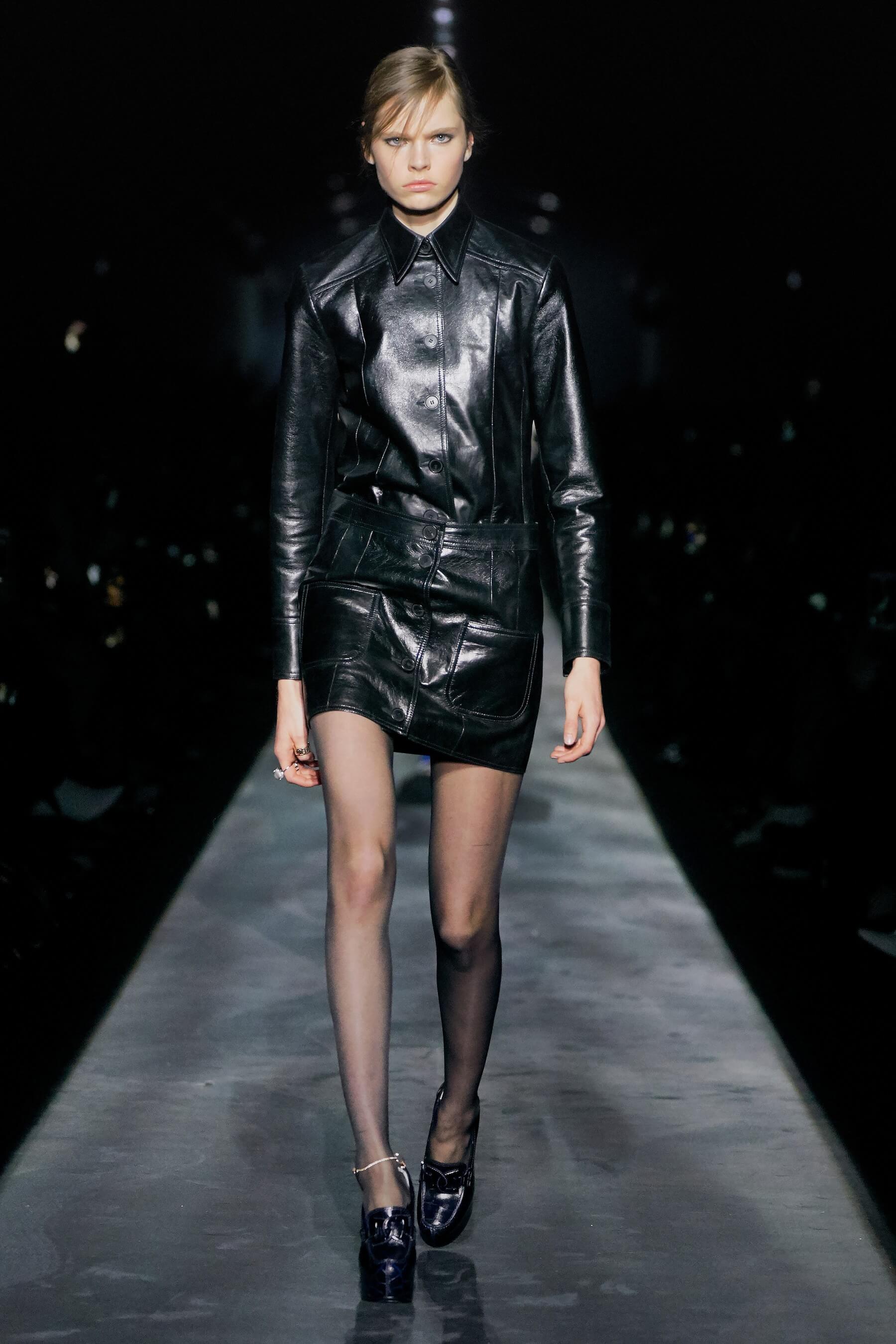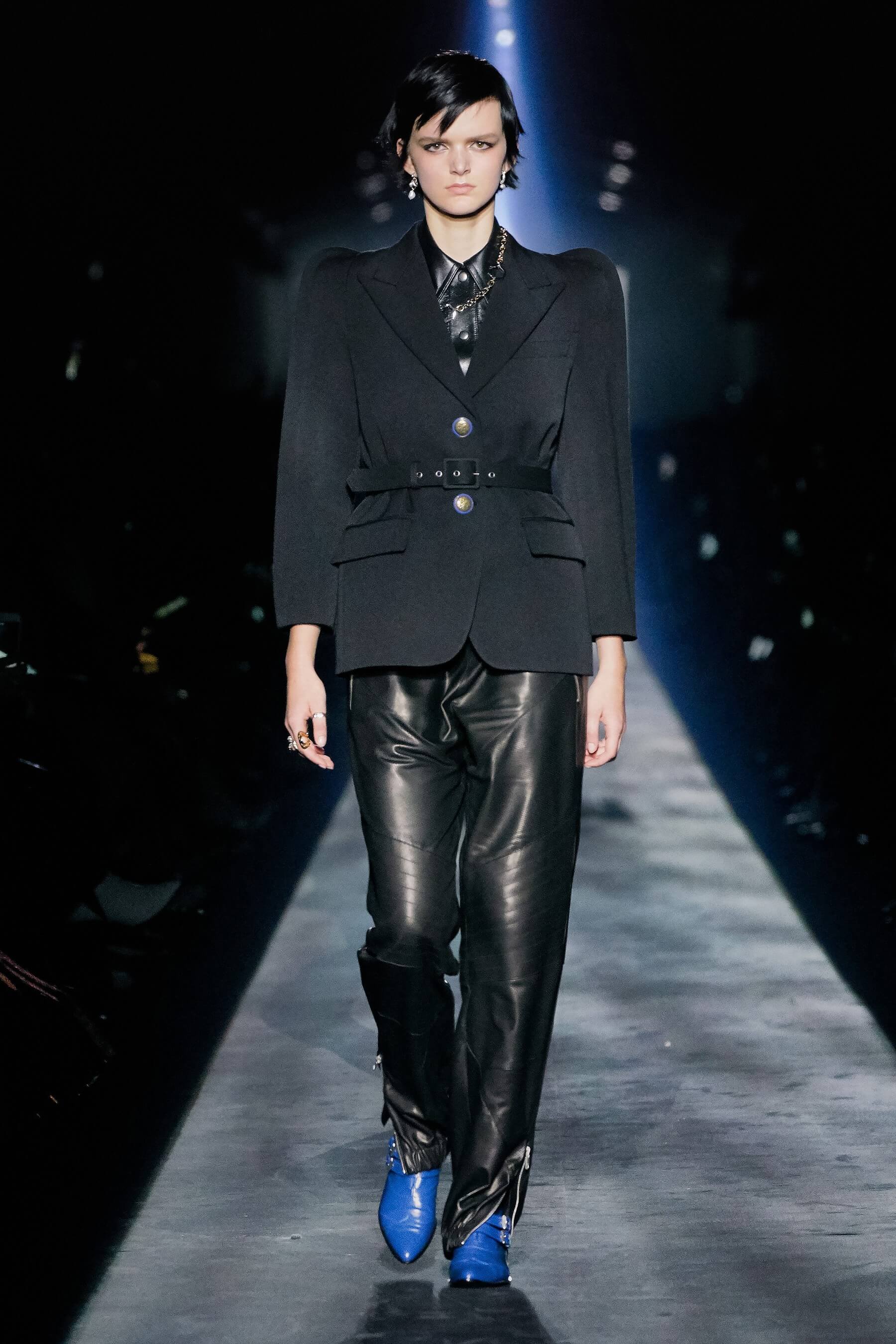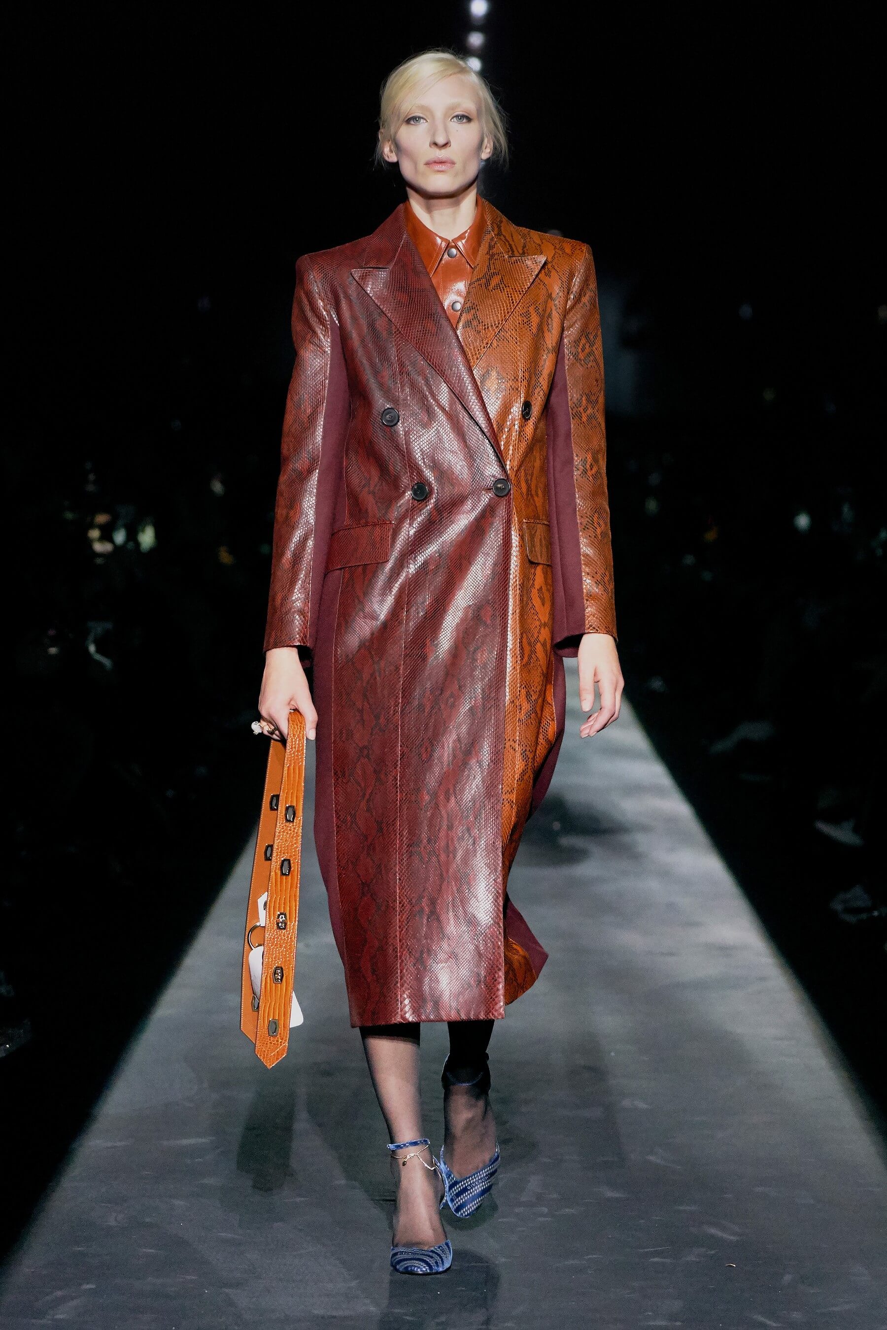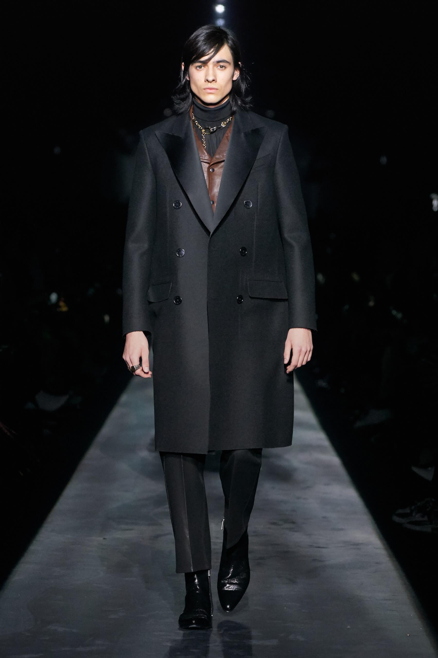 Мужские образы были выстроены на эффектном сочетании костюмной шерсти и блестящей кожи, а одним из самых запоминающихся выходов стало появление модели в лаковых черных брюках, змеиной рубашке и белом пальто.
