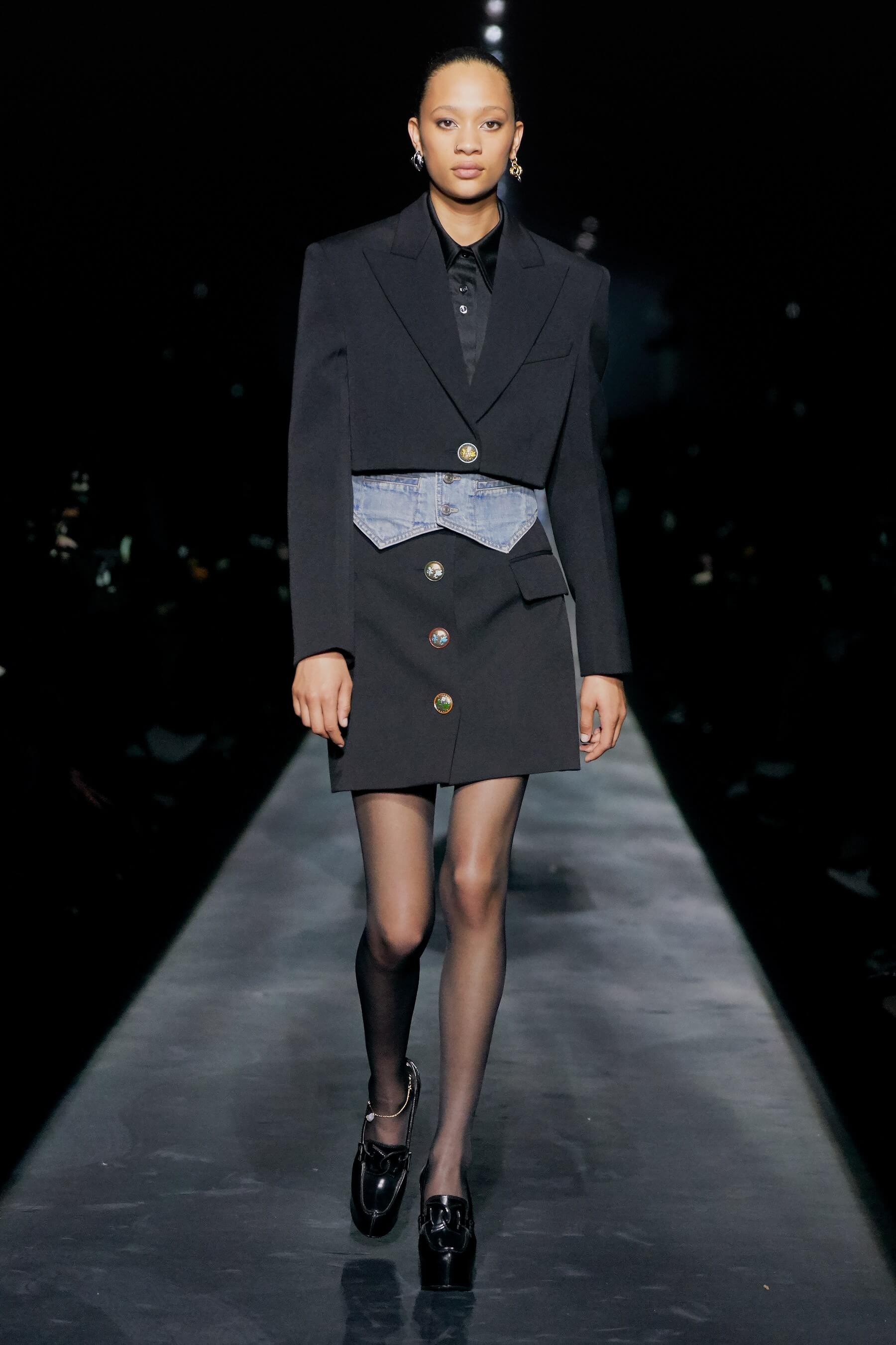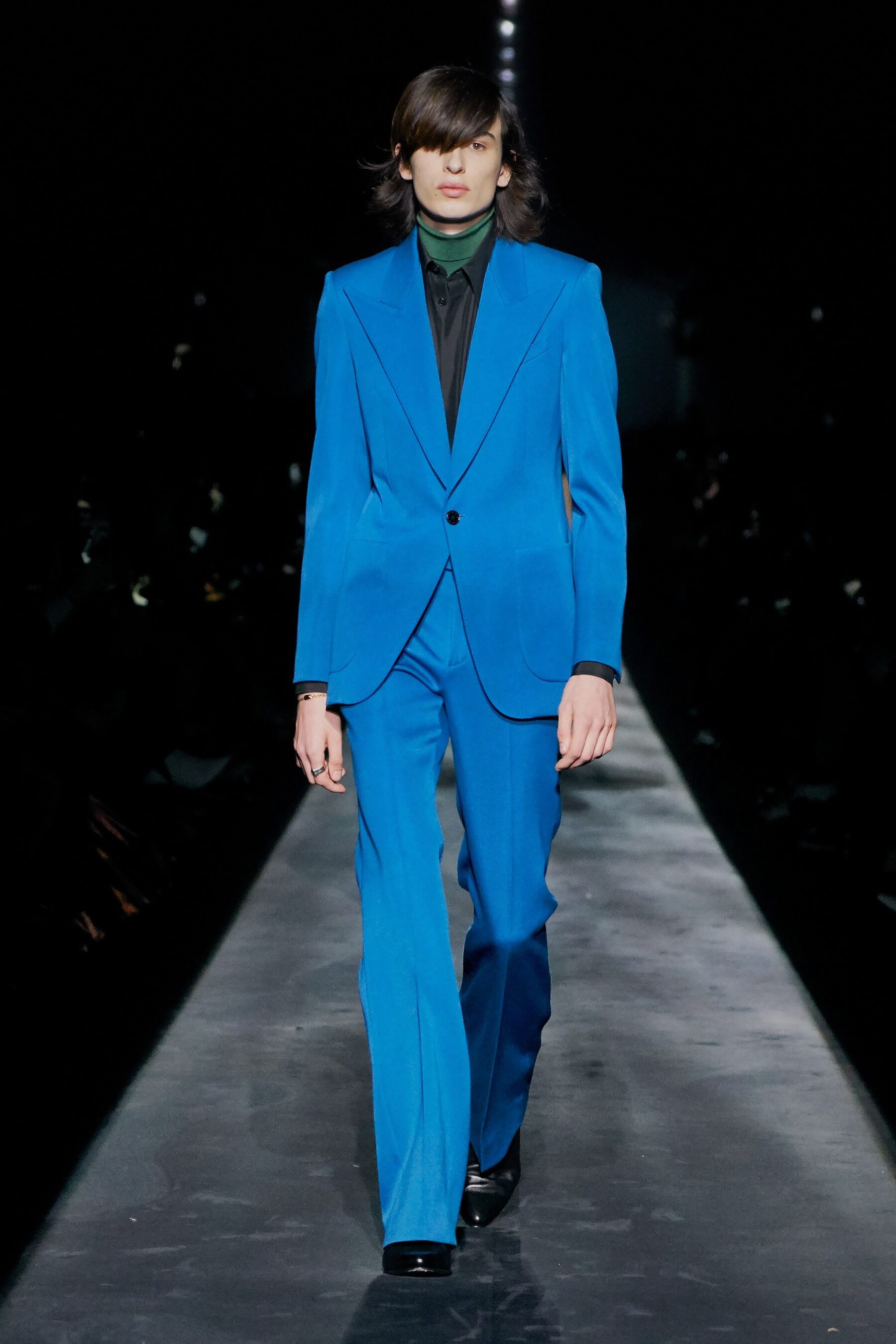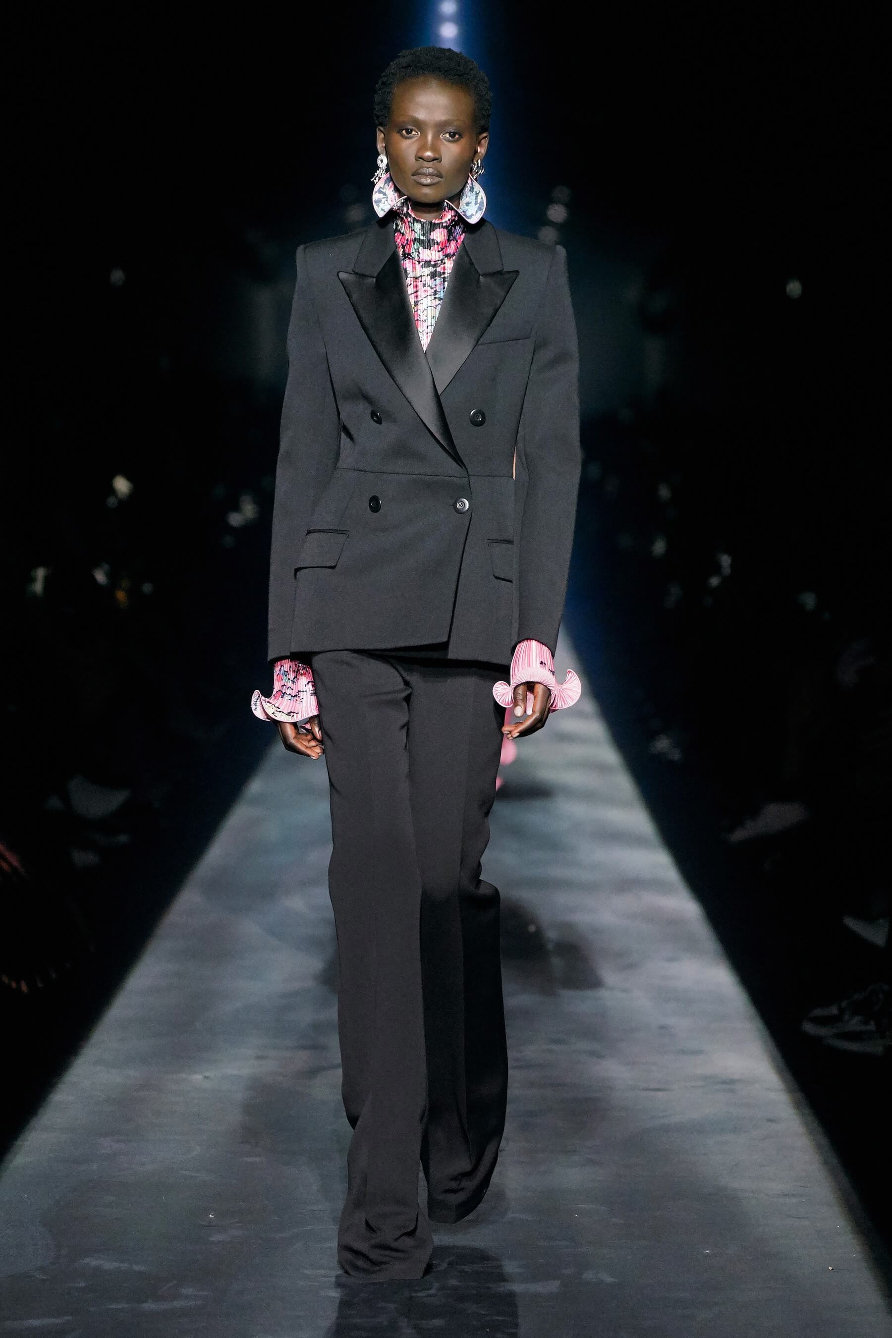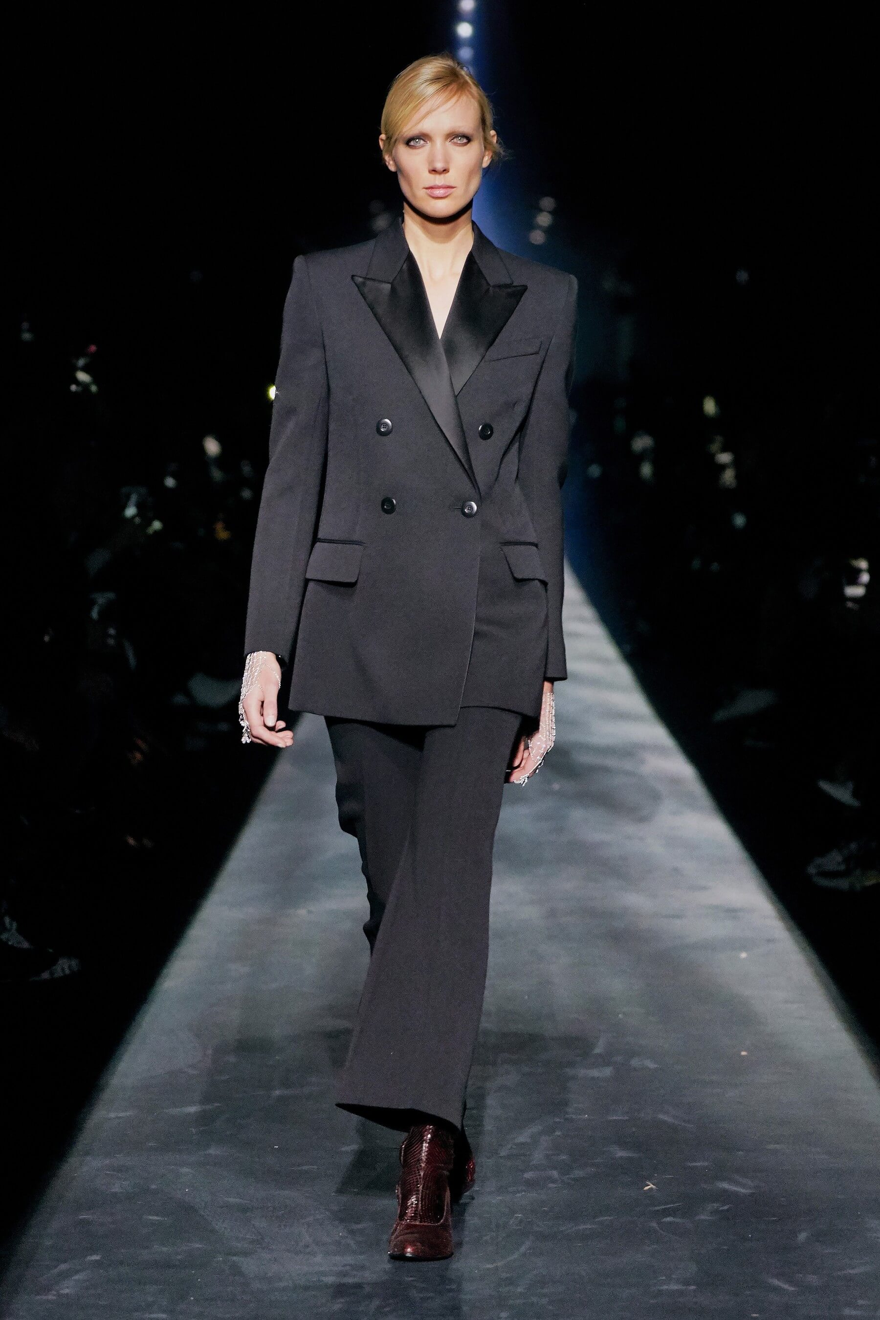 Мужские образы были выстроены на эффектном сочетании костюмной шерсти и блестящей кожи, а одним из самых запоминающихся выходов стало появление модели в лаковых черных брюках, змеиной рубашке и белом пальто.