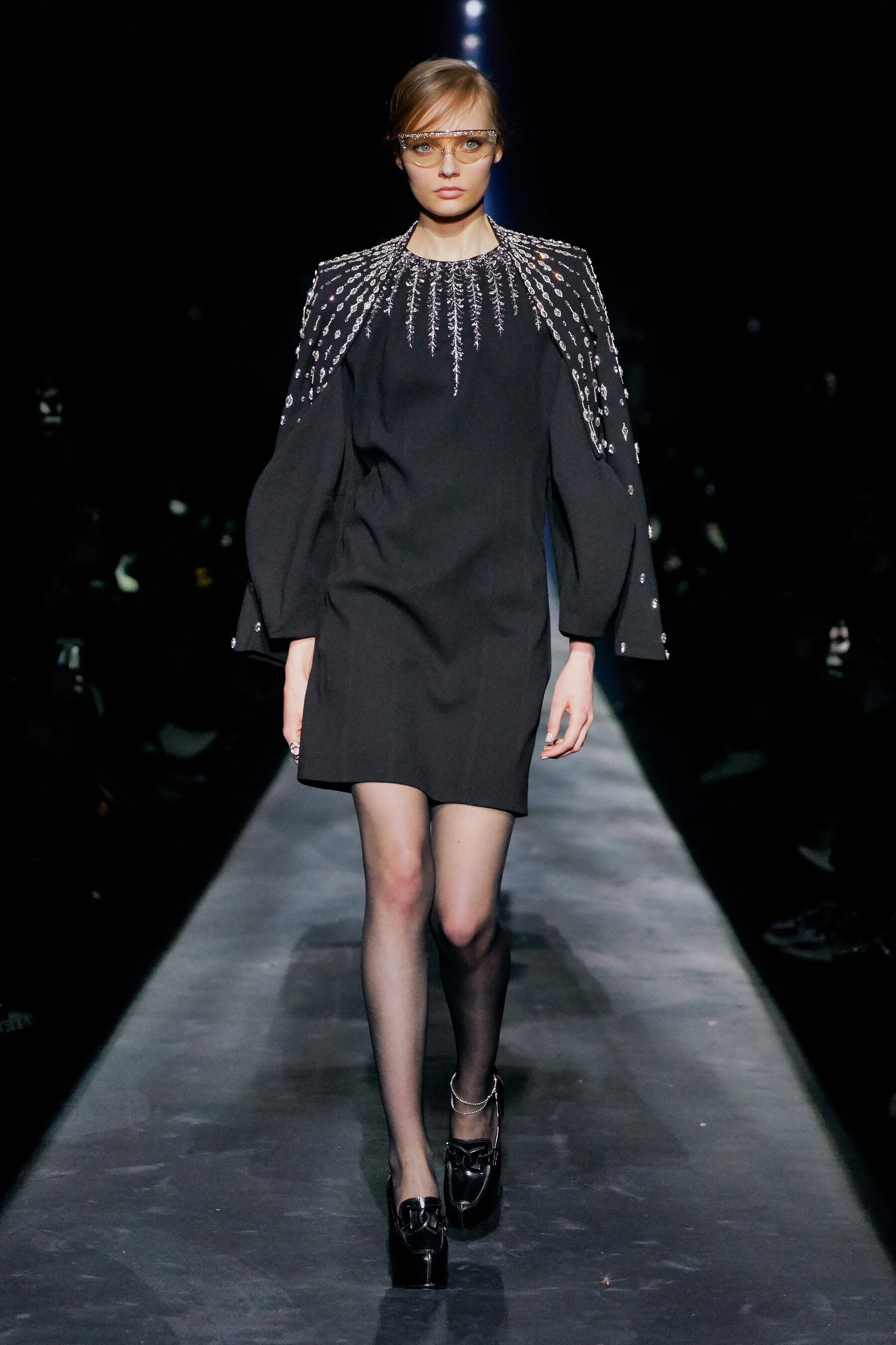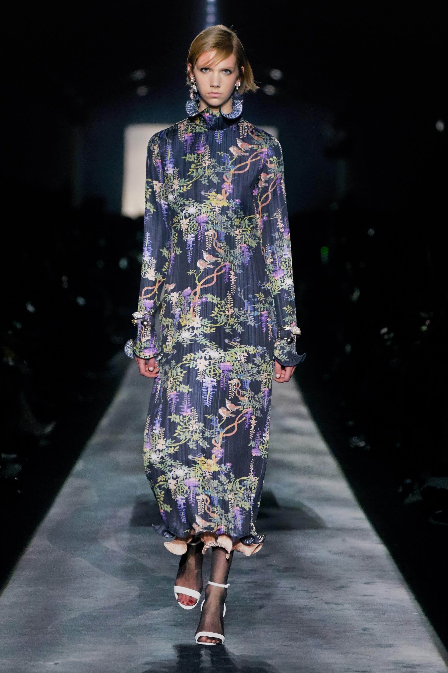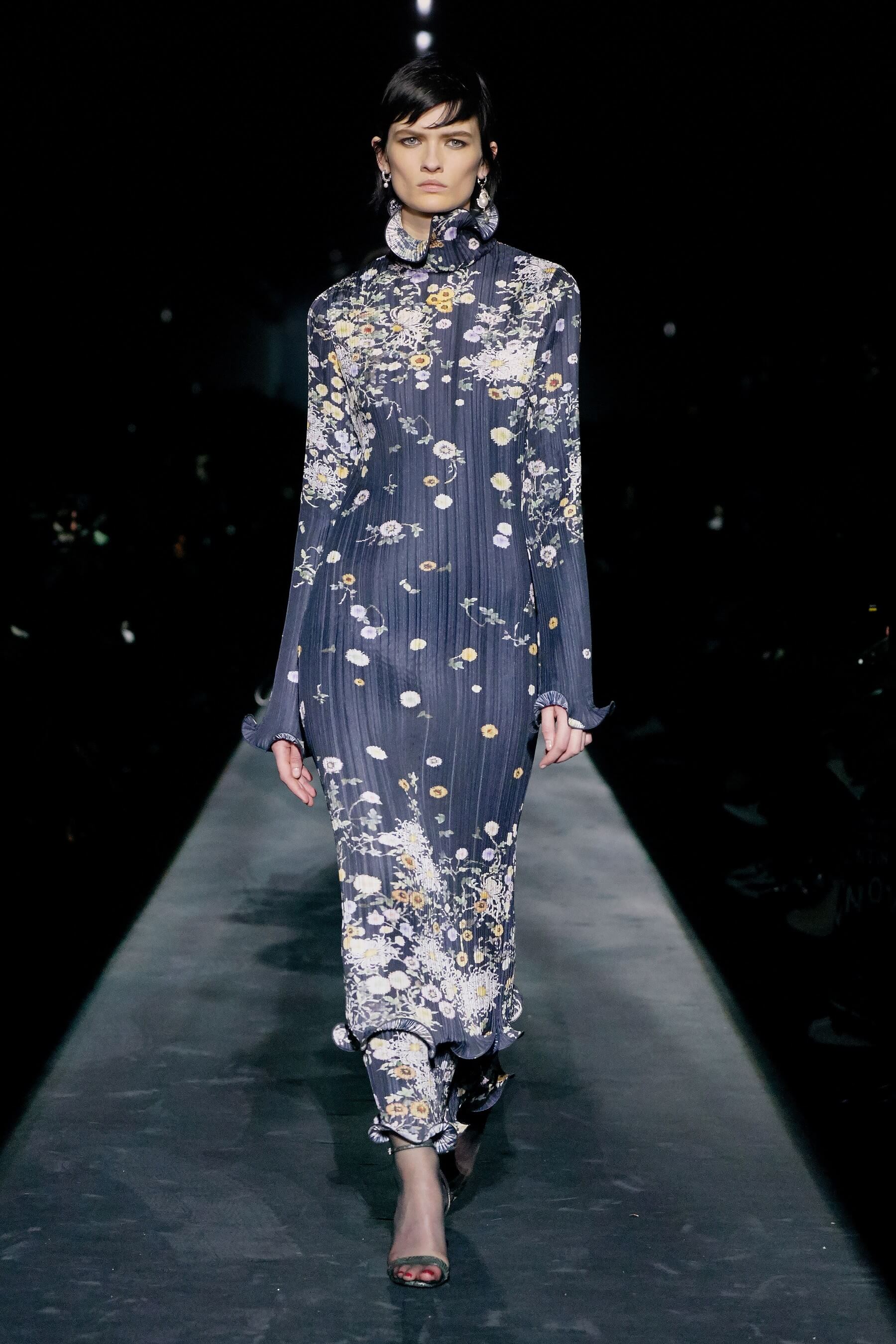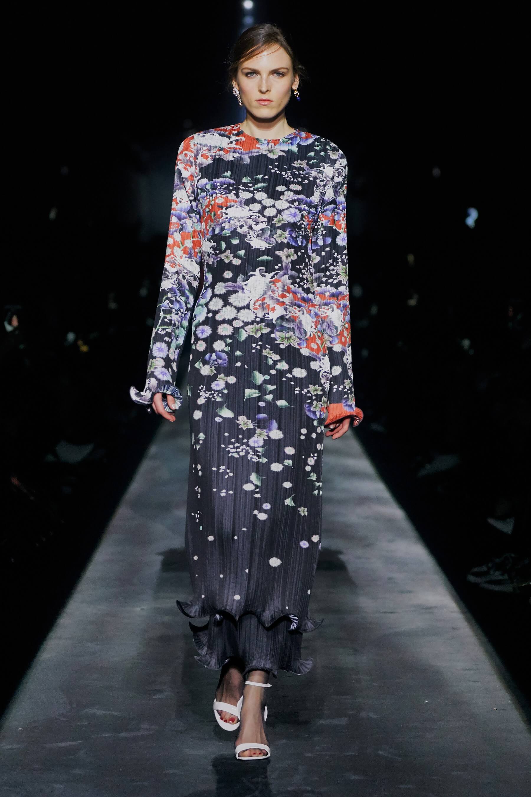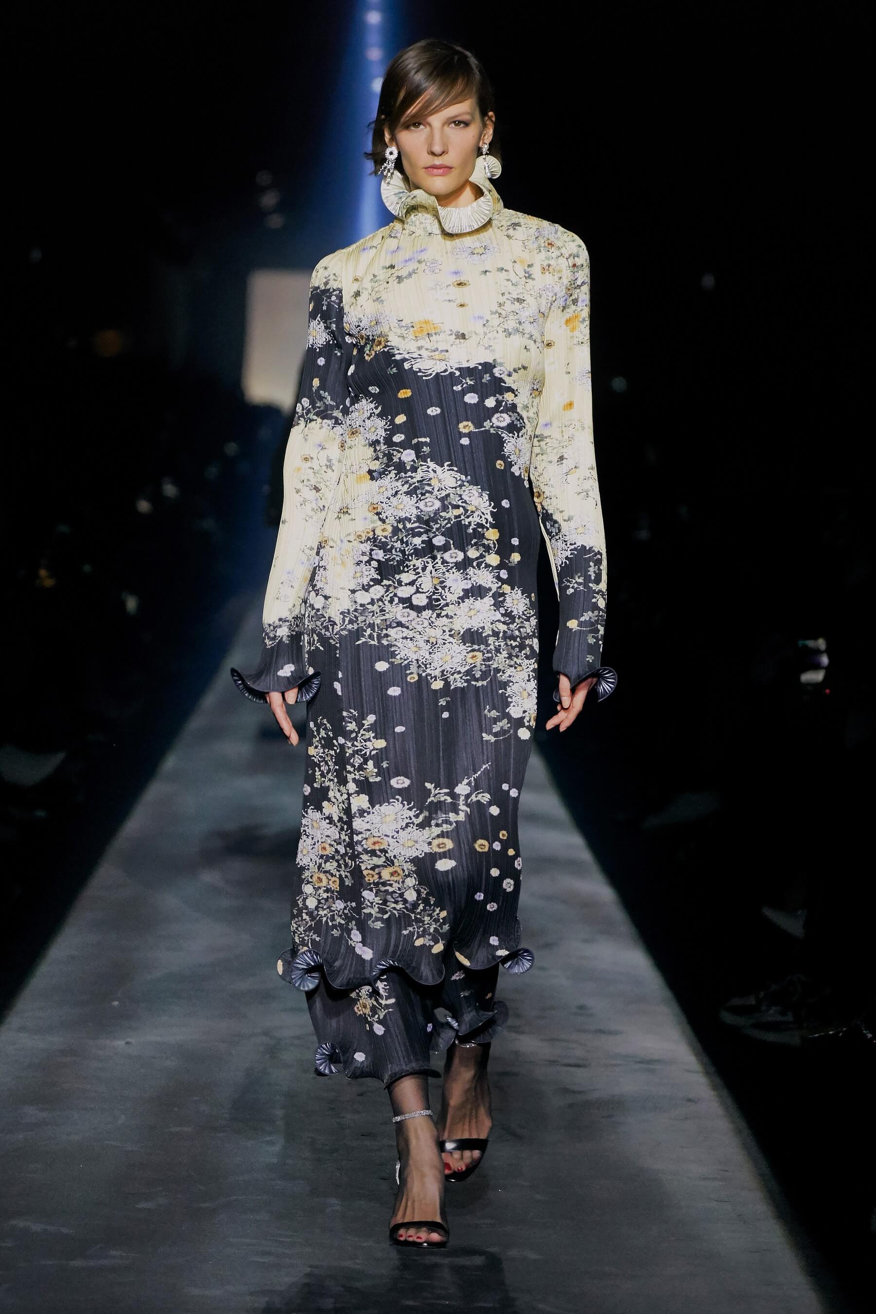 В парижском ботаническом саду прошел показ коллекции Givenchy, которую Клэр Уэйт Келлер назвала "Зима в Эдеме". Дизайнер показала гостям женственные и утонченные платья в цветах, нежные плиссированные костюмы с воротами-оборками, костюмы-двойки сочных цветов и сверхэлегантные пальто необычного кроя с большими и круглыми плечами. Под брючными костюмами в клетку виднелись цветные шелковые блузы, поверх изысканных силуэтных жакетов с юбками были надеты пуховики, а в качестве подвесов модели носили маленькие монетницы со змеиным принтом.