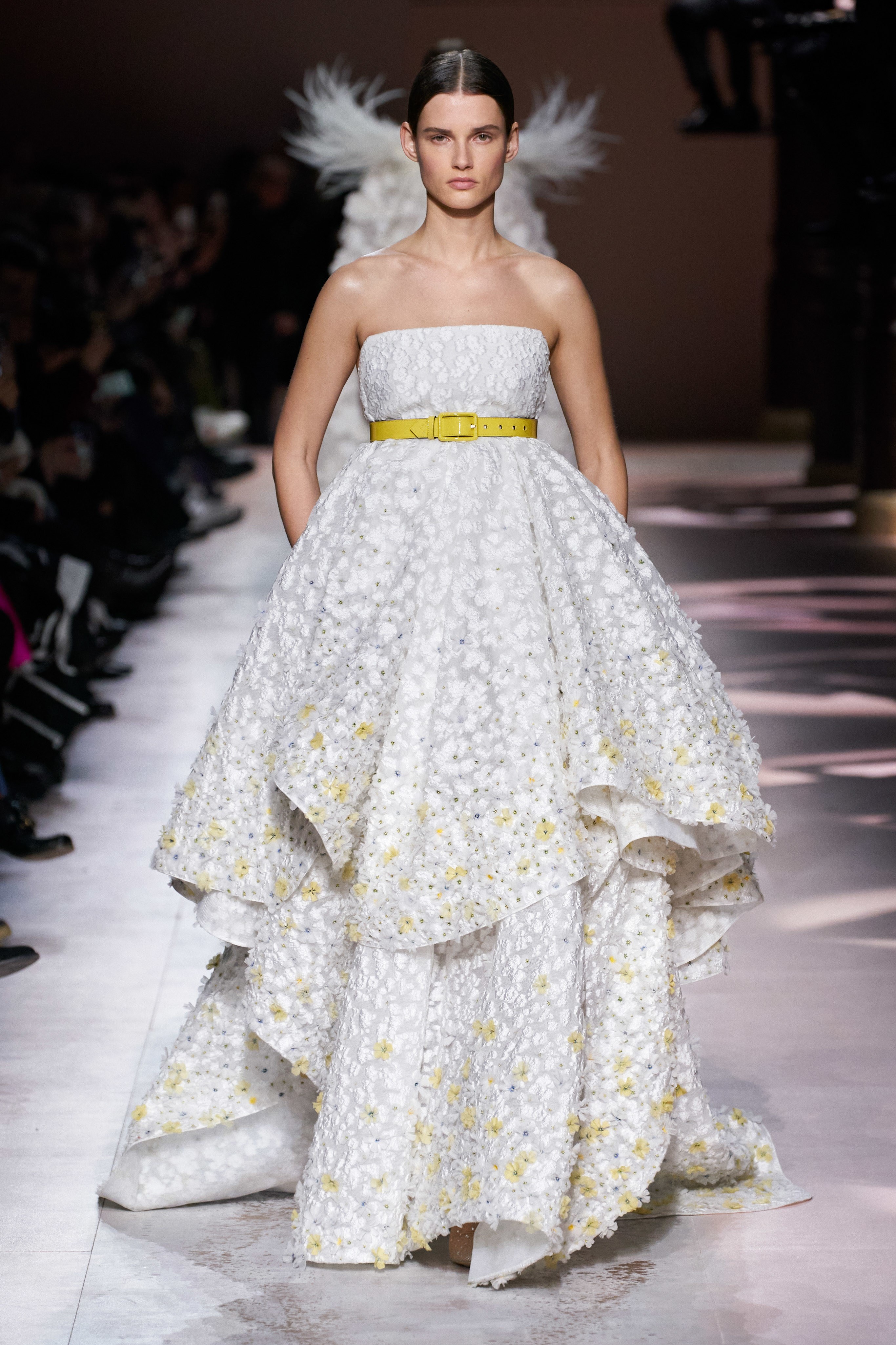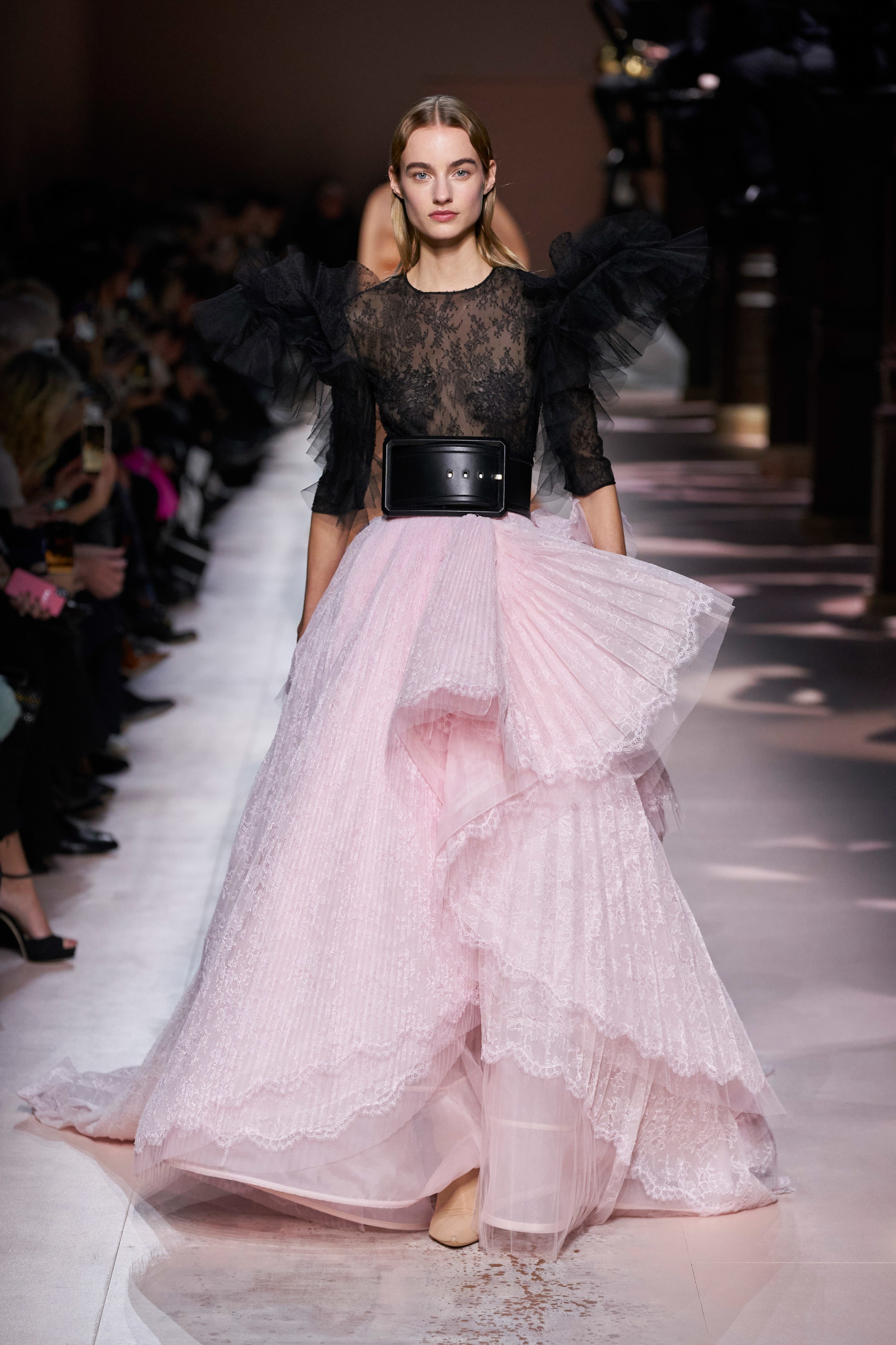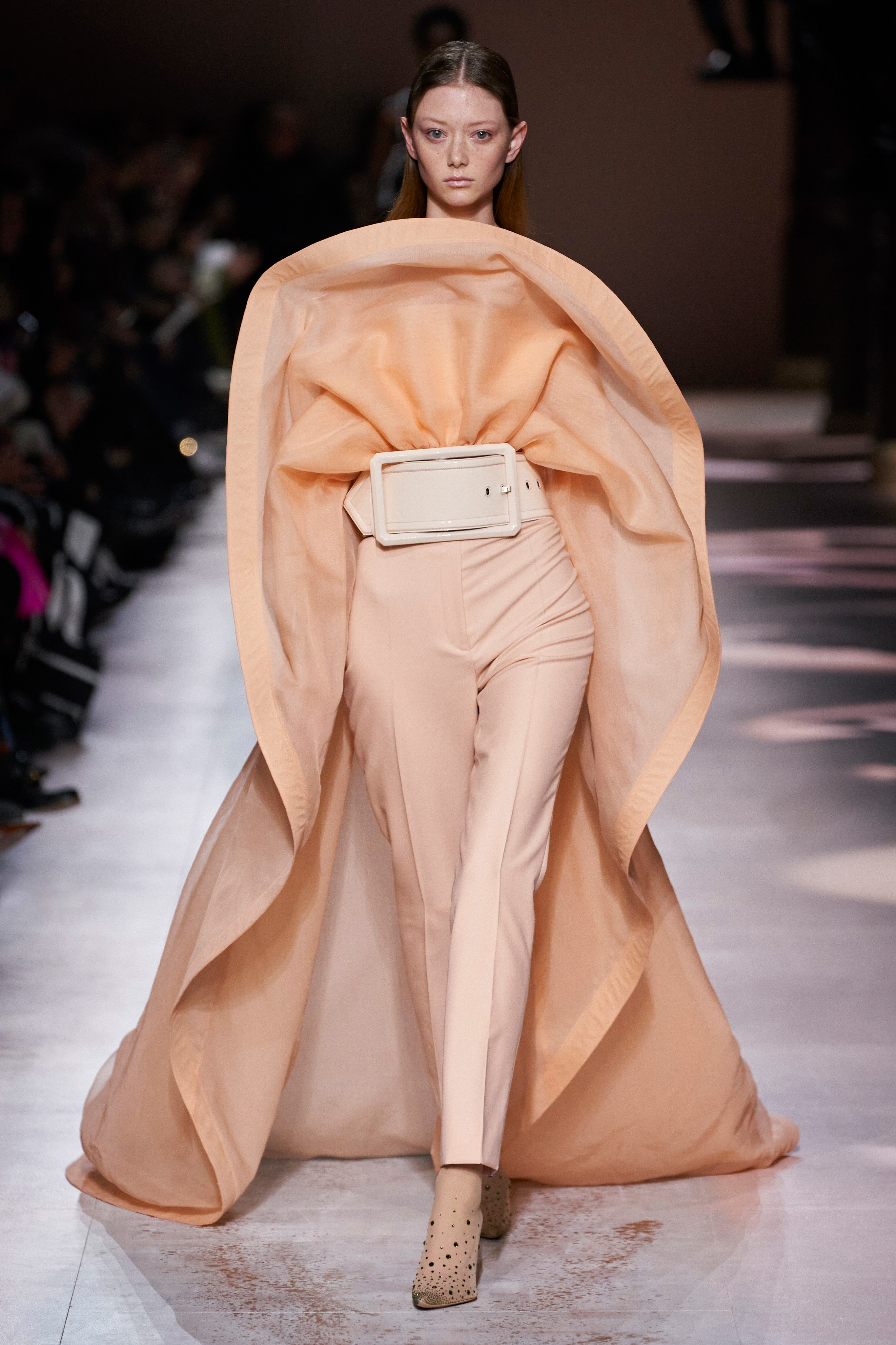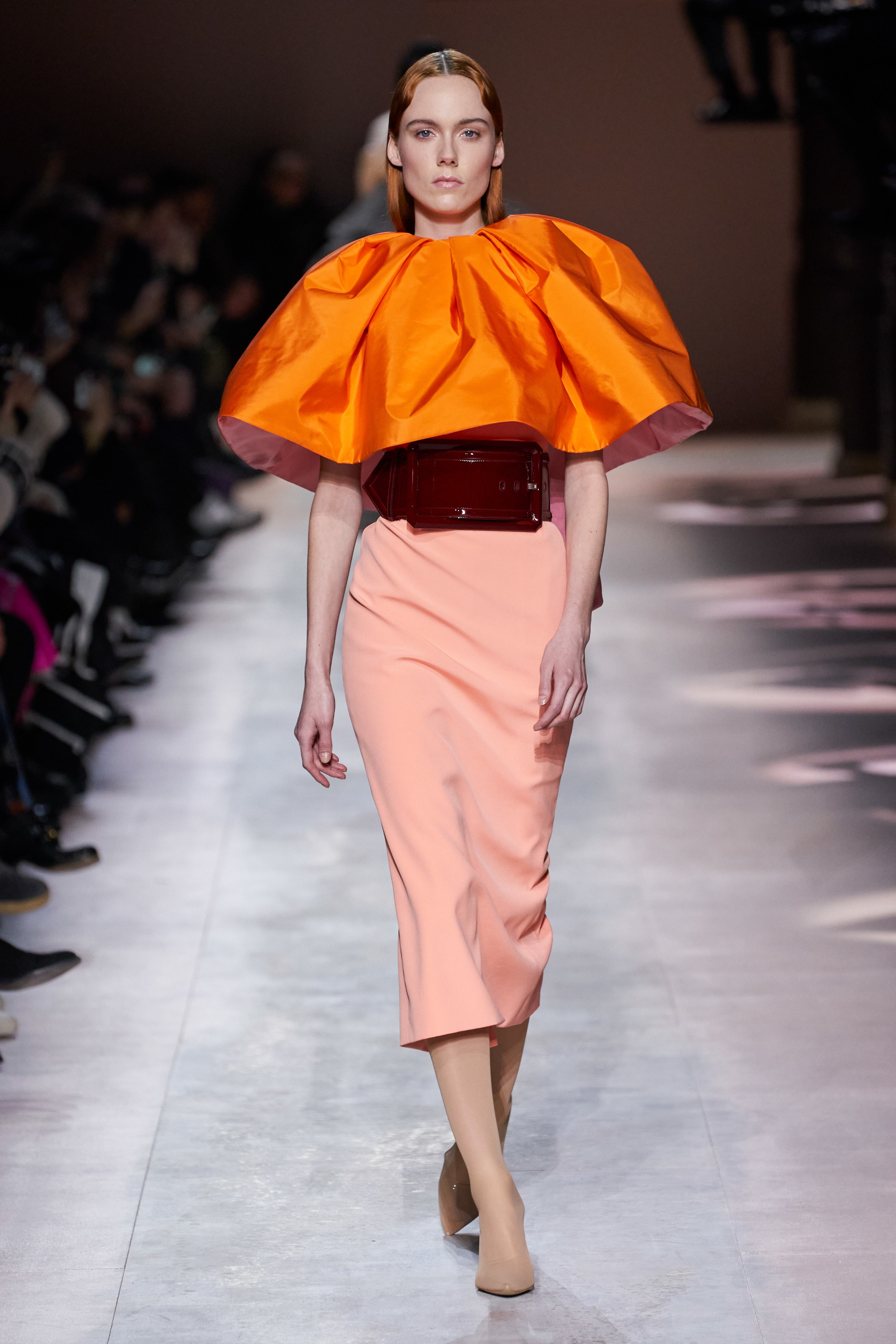 Актуальные тренды: гиперобъем, оборки и воланы, кружево, банты, широкие ремни с квадратными пряжками, стягивающие платья и костюмы на талии, белый костюм, перья.