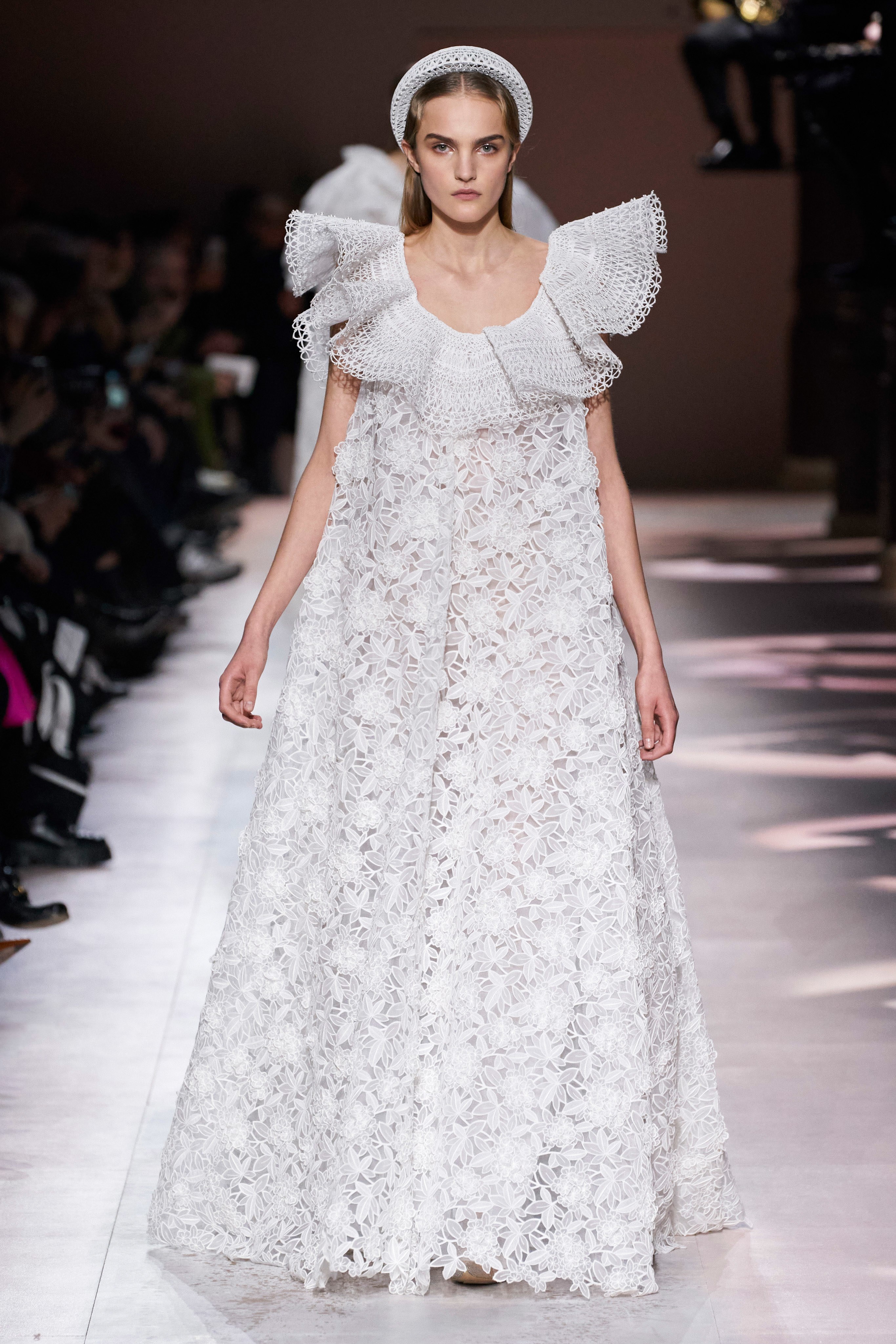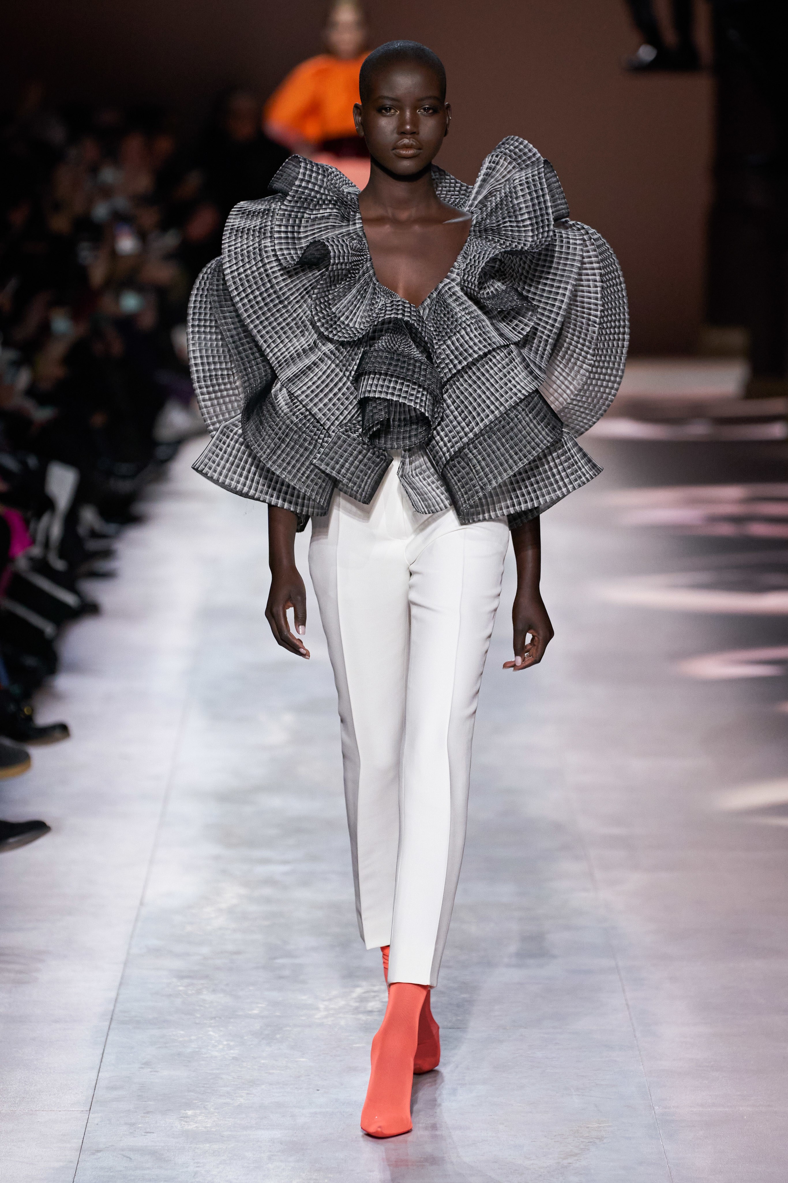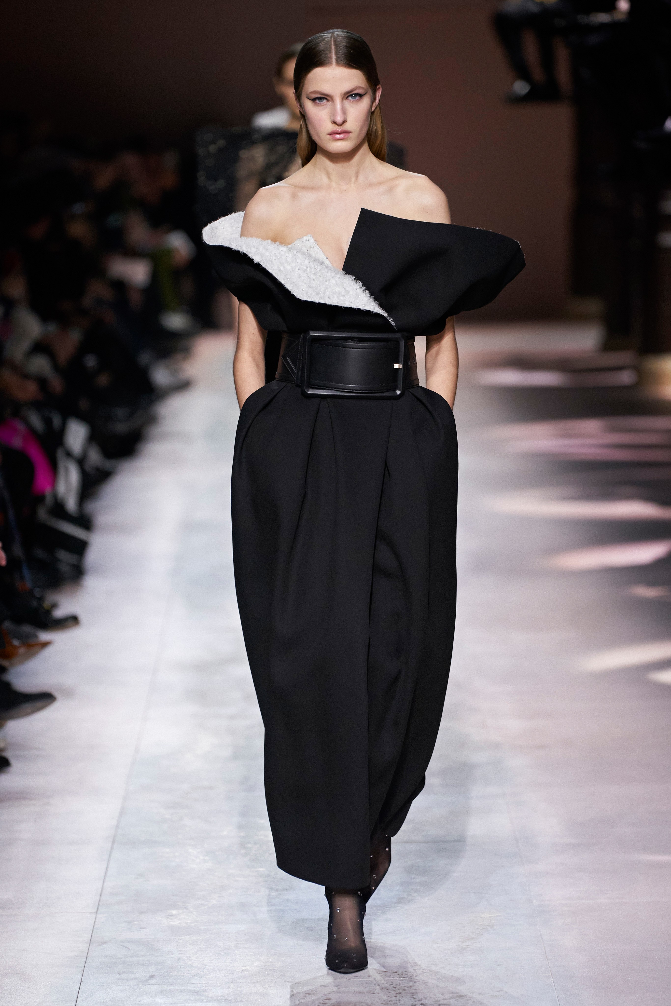 Актуальные тренды: гиперобъем, оборки и воланы, кружево, банты, широкие ремни с квадратными пряжками, стягивающие платья и костюмы на талии, белый костюм, перья.