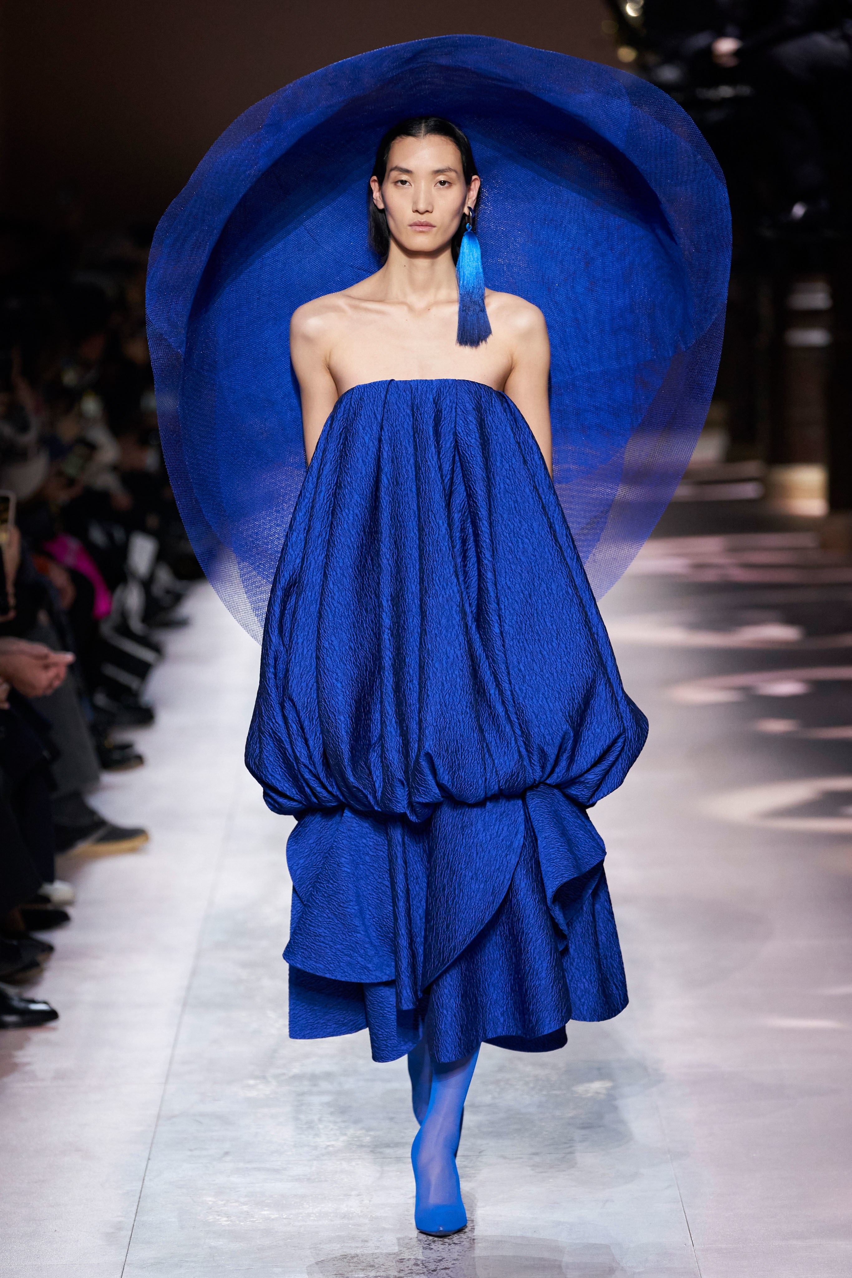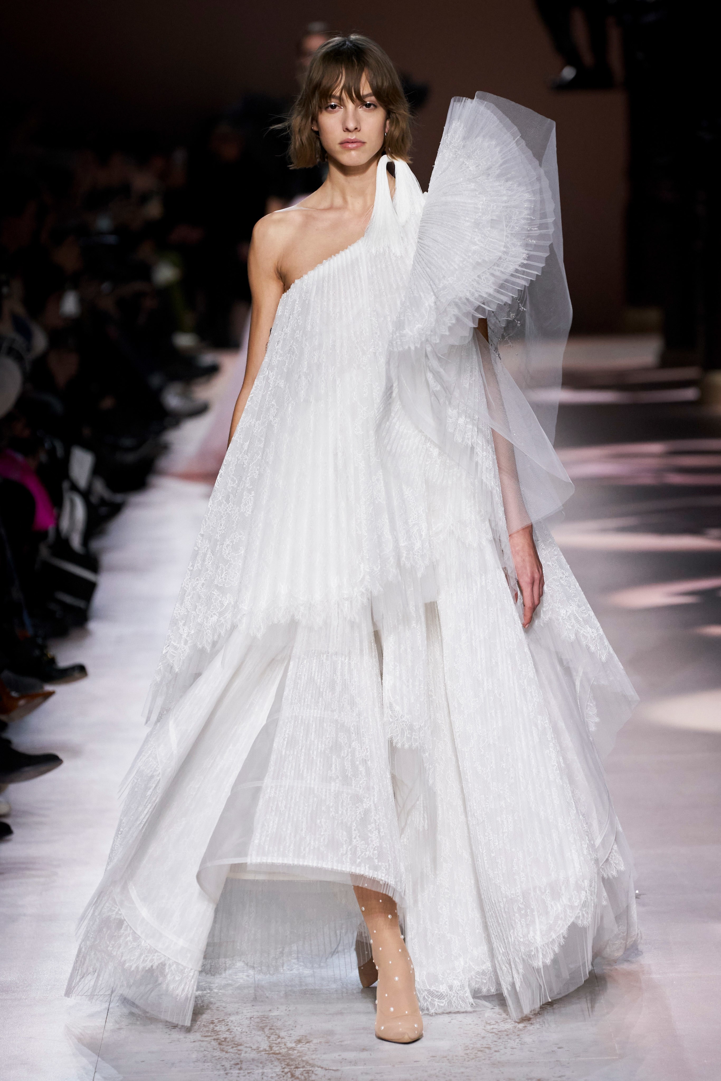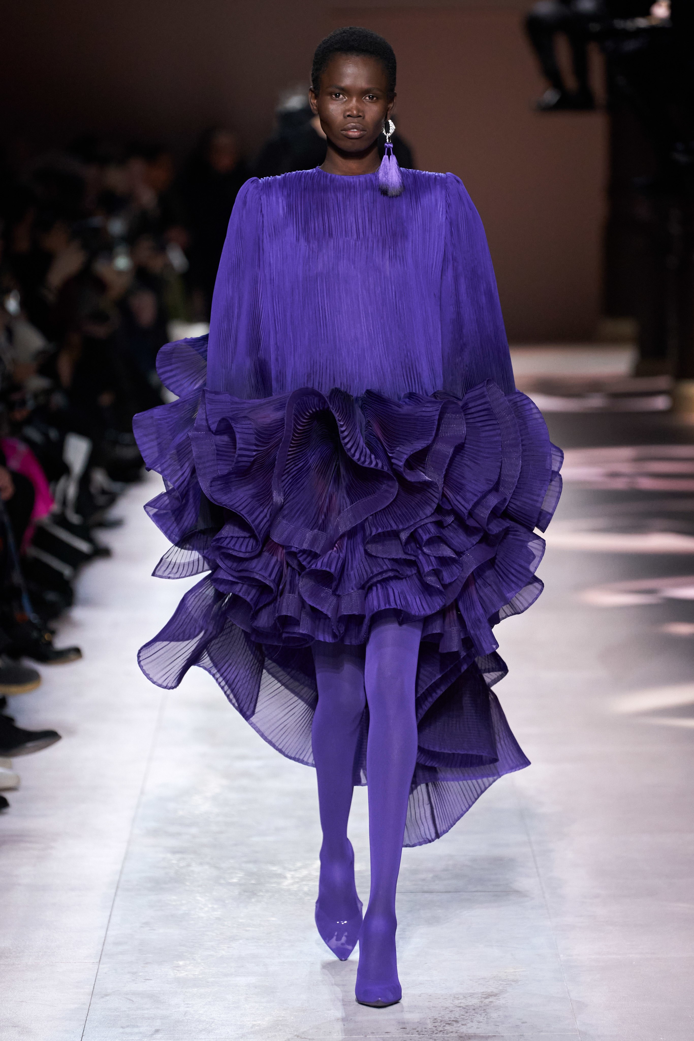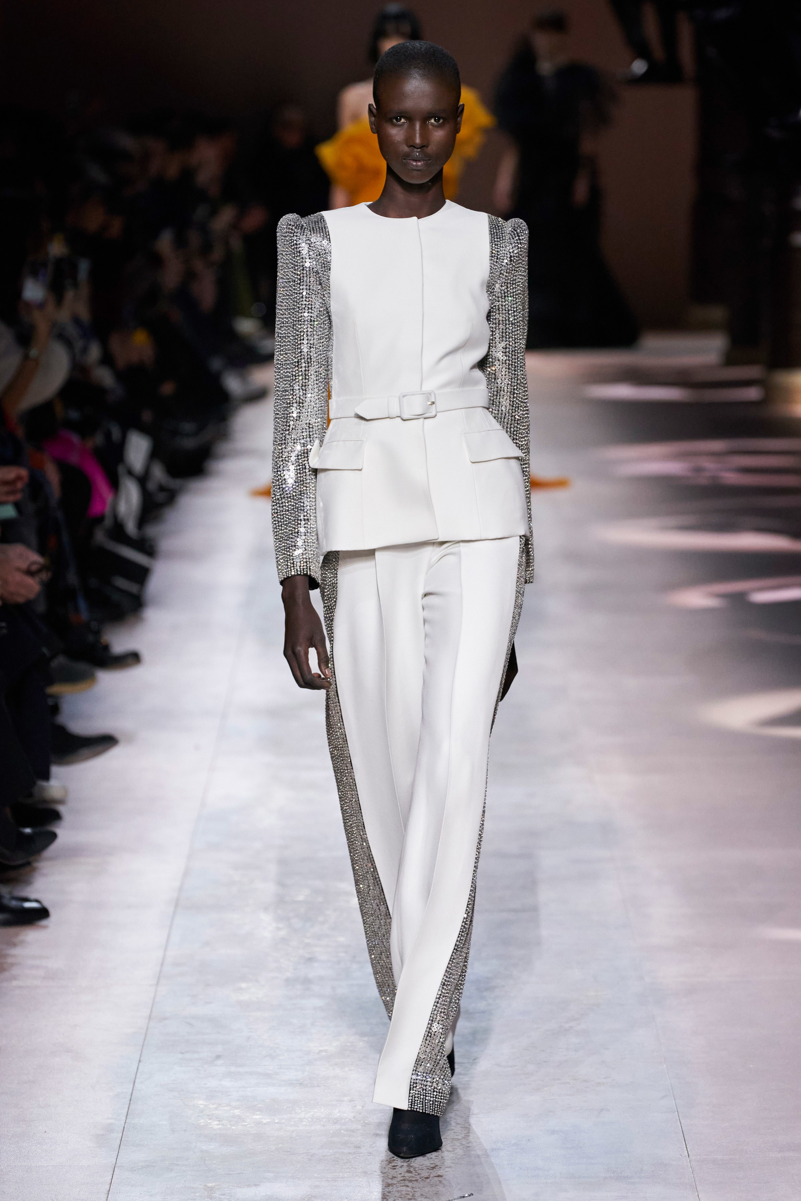 Актуальные тренды: гиперобъем, оборки и воланы, кружево, банты, широкие ремни с квадратными пряжками, стягивающие платья и костюмы на талии, белый костюм, перья.