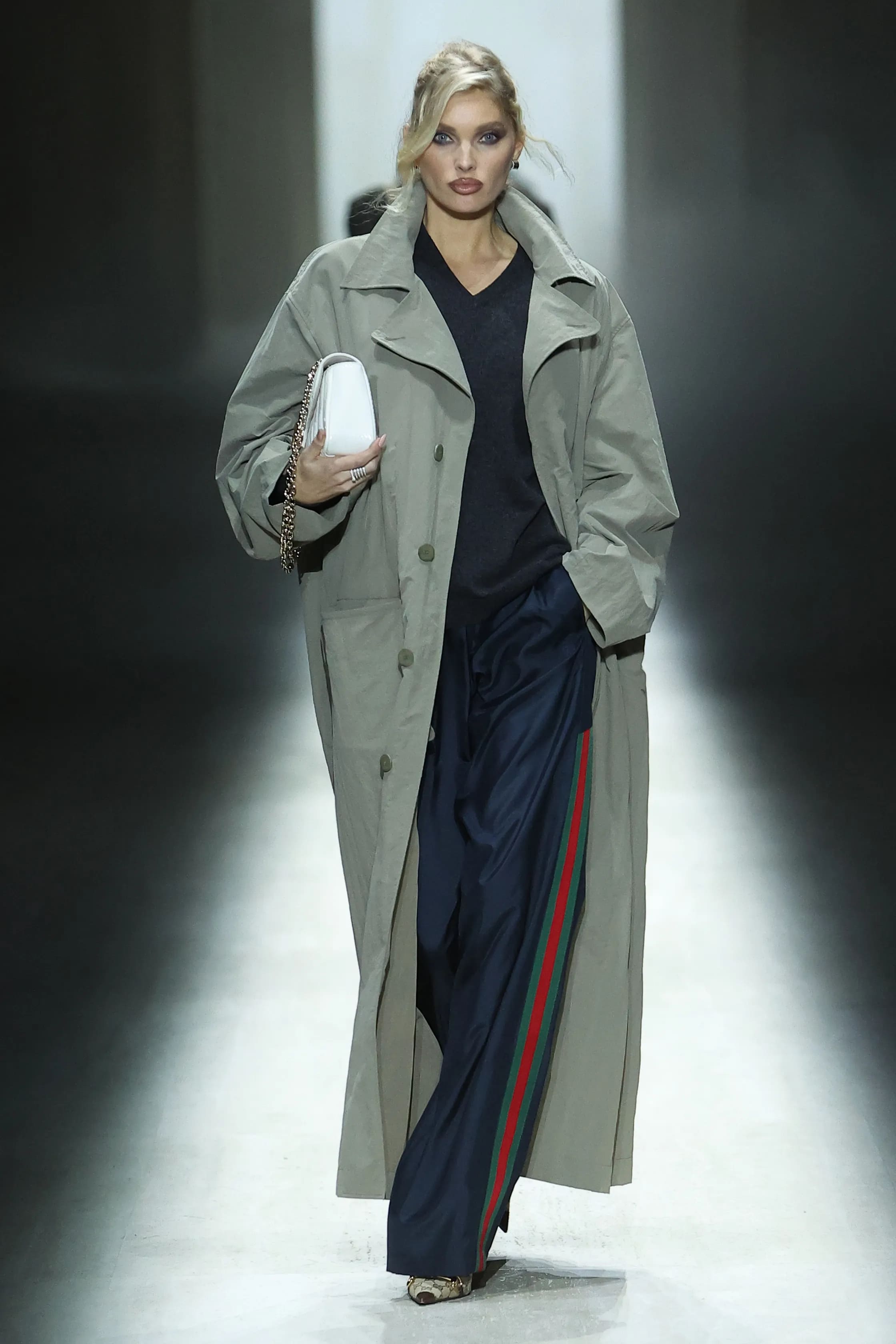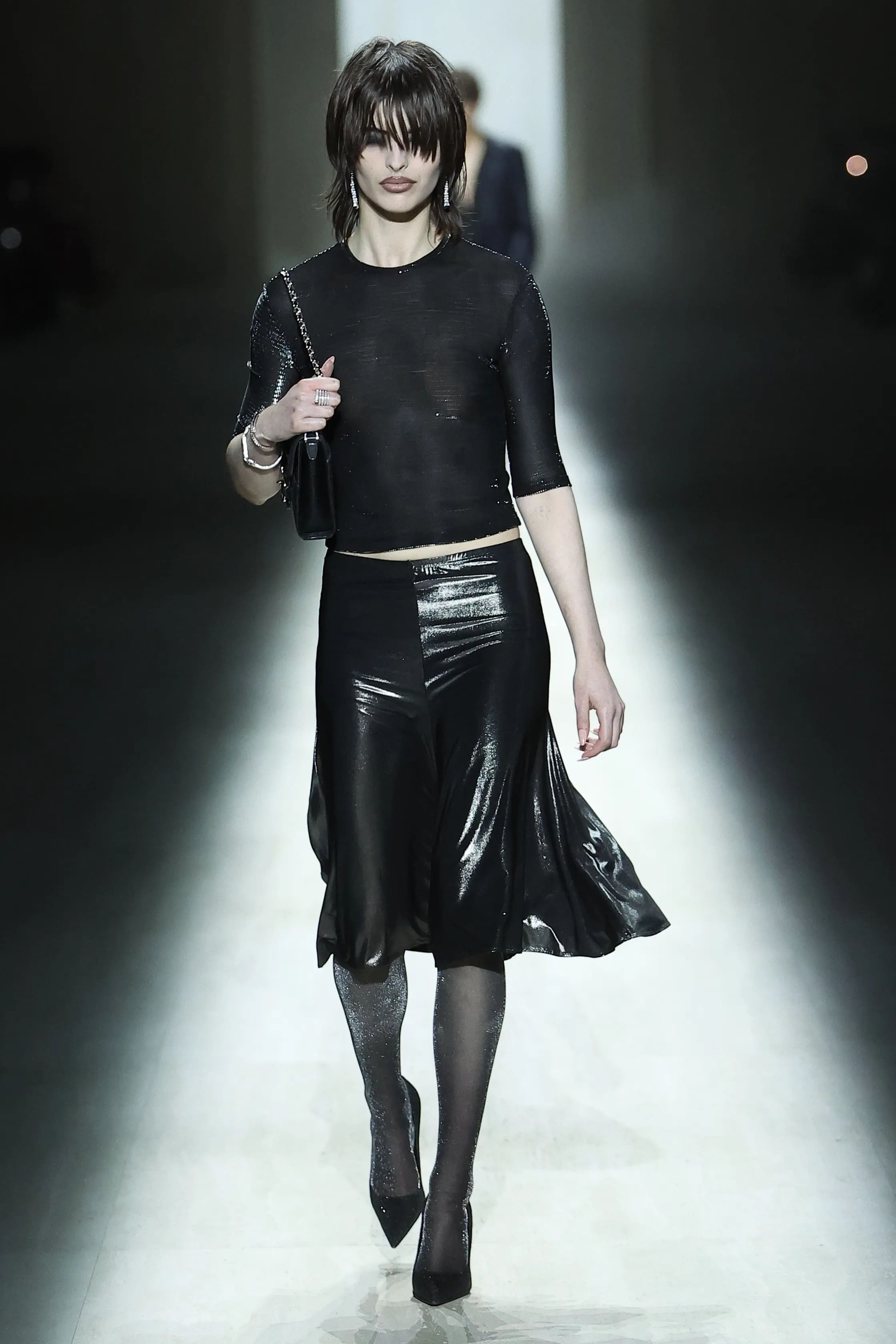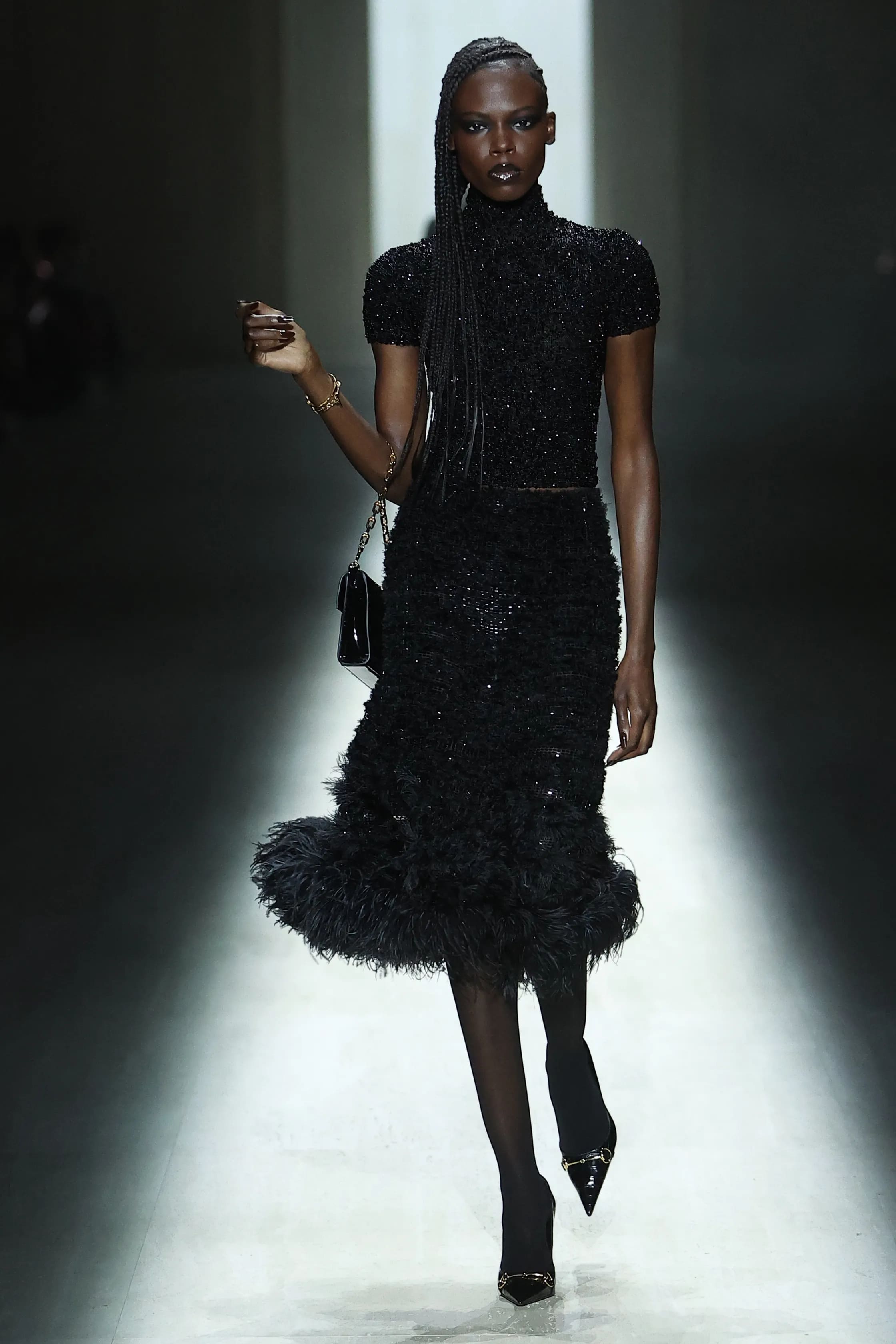 Естетика показу нагадала публіці про архівні колекції Тома Форда. Окрім знакових силуетів того часу, на подіумі було помітне й пряме цитування. У колекції з’явилась сукня з надглибоким вирізом на спині, яку, до речі, примірила Кейт Мосс.
