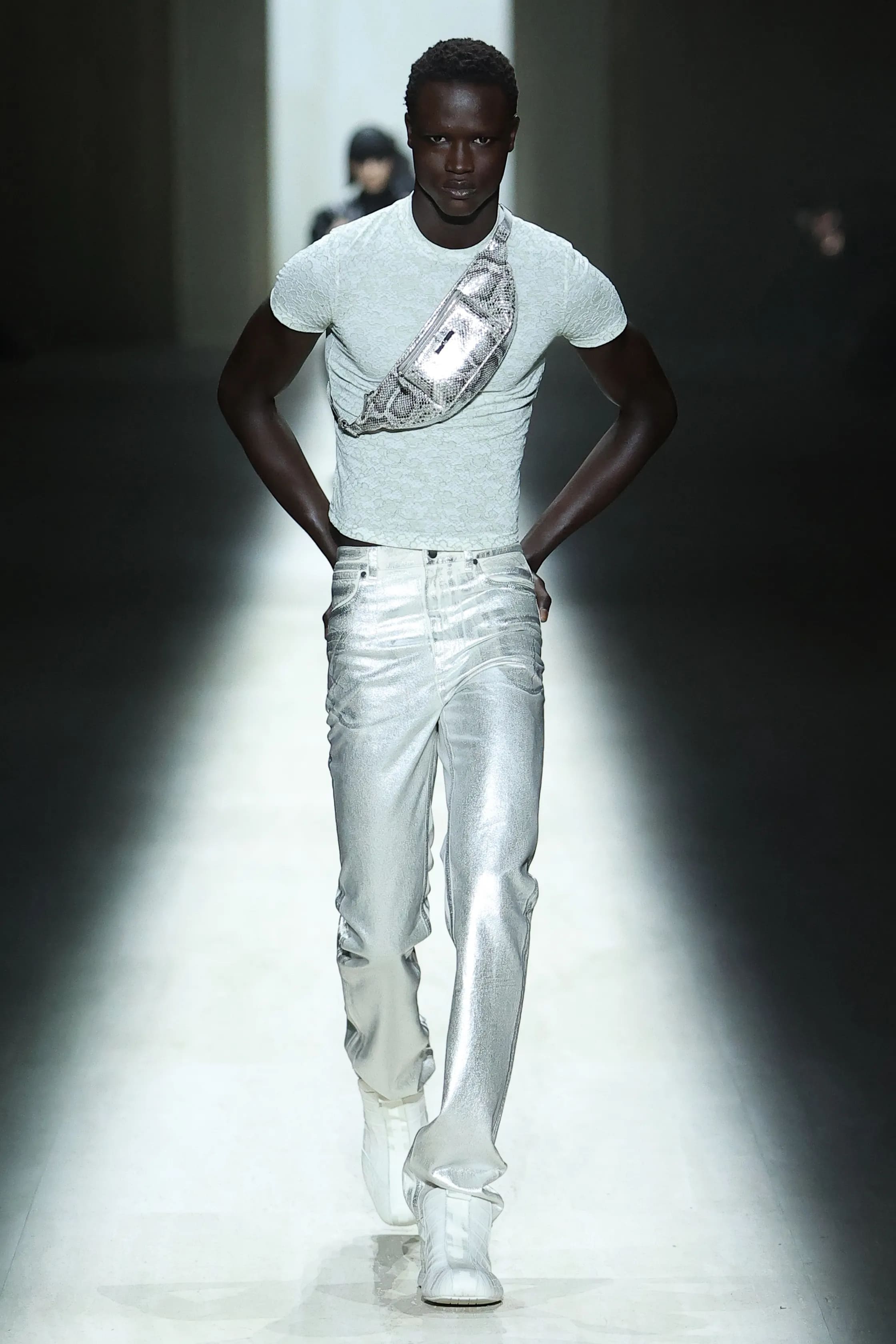 Шоу відкрив прийом, бачений публікою й раніше. Показ сезону fall-winter — 2026 розпочалося з білої сукні — натяк на чистий лист, у який Демна вписує своє ім’я в історію модного Дому. Приталені силуети та сміливі довжини продовжились і в інших образах з нової колекції: костюмах-двійках, шкіряних брюках, трикотажних топах, блузах тощо.