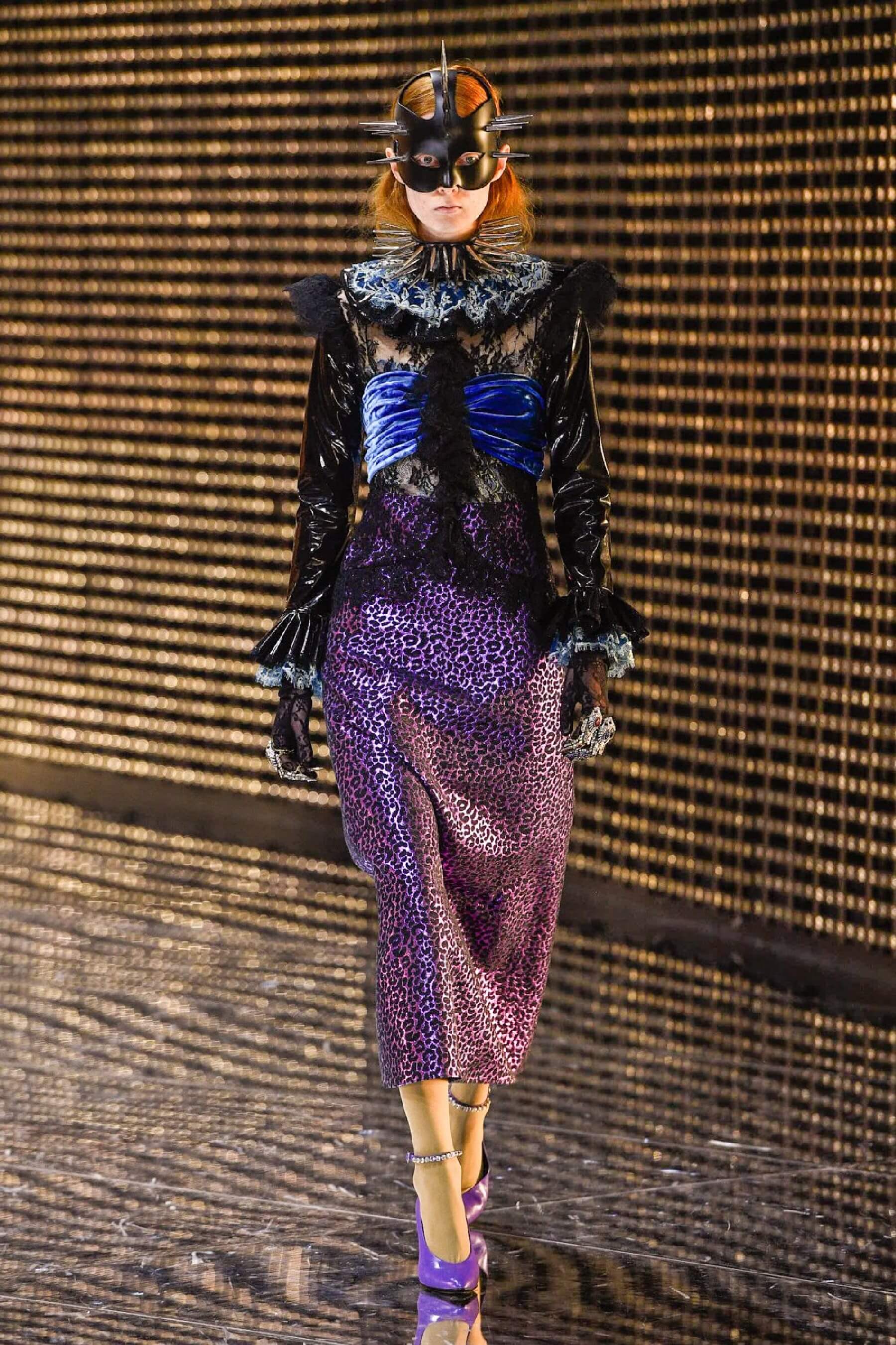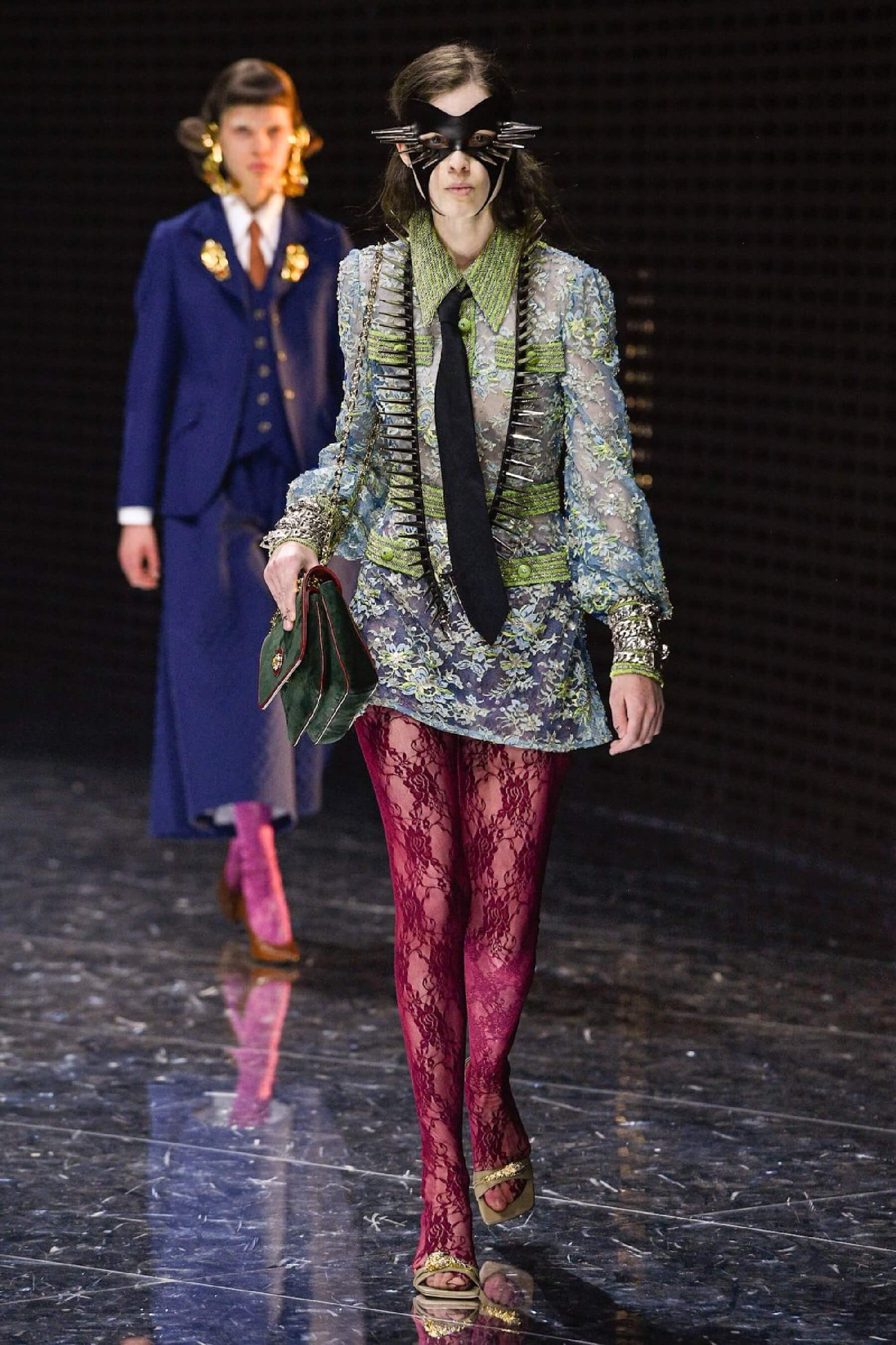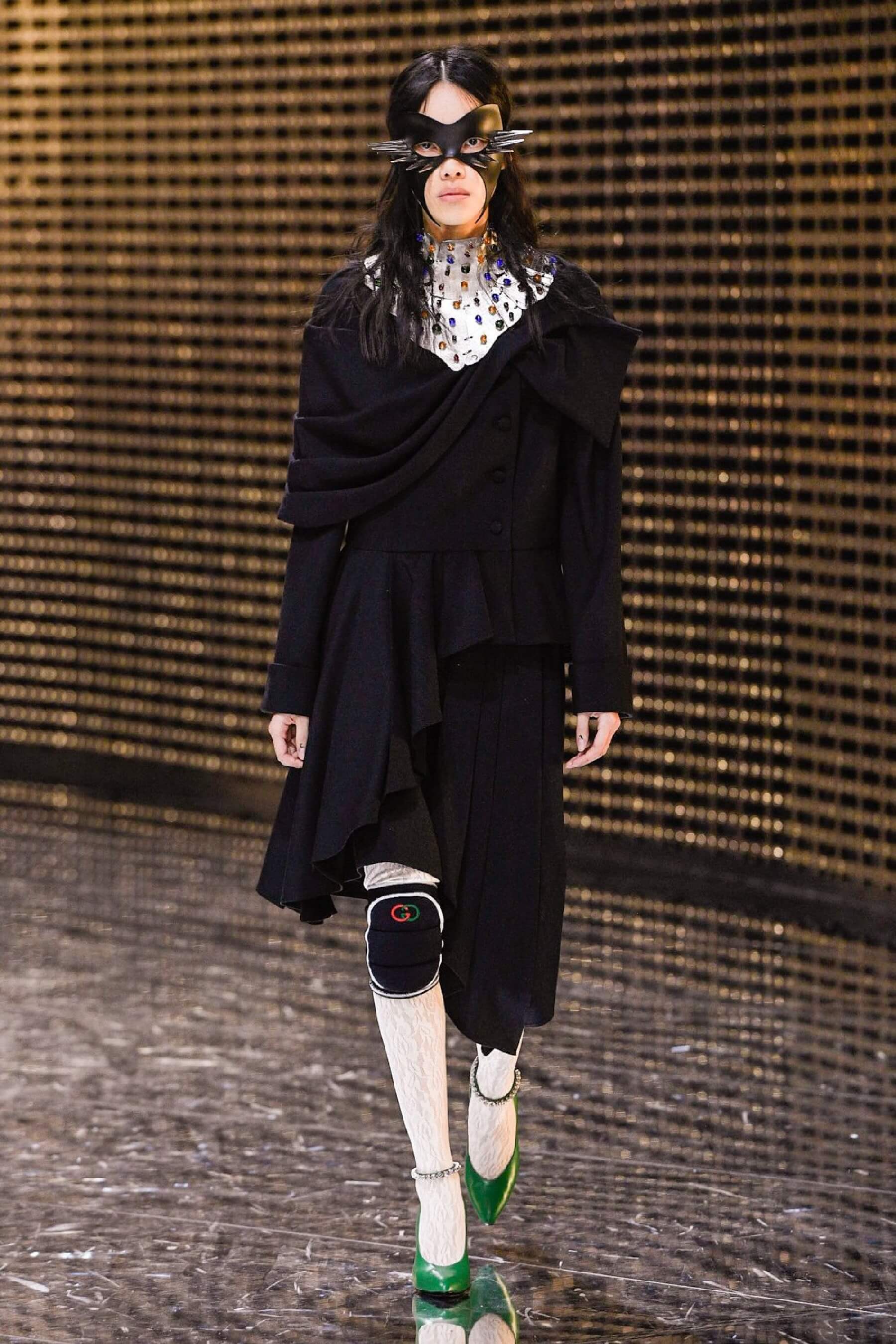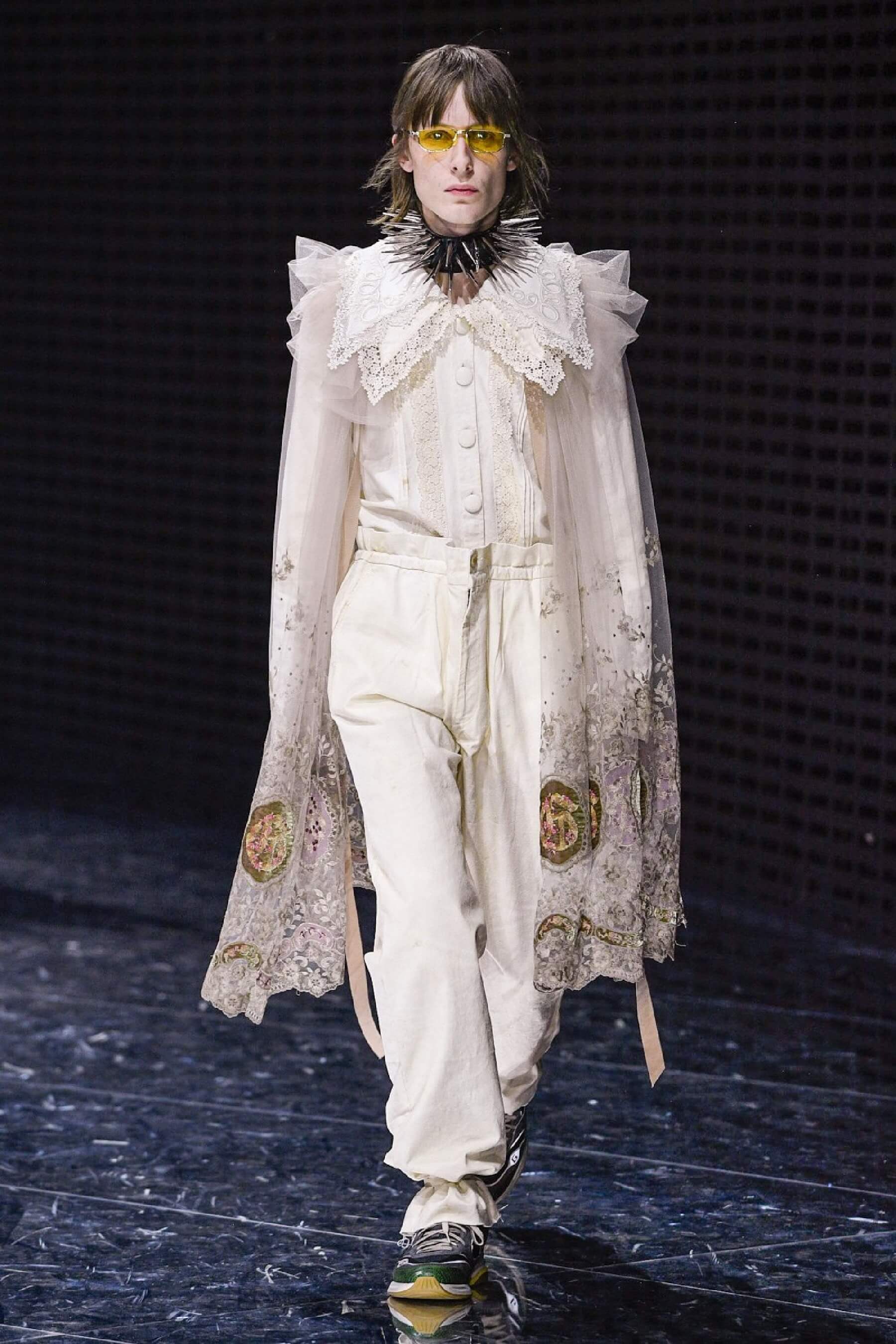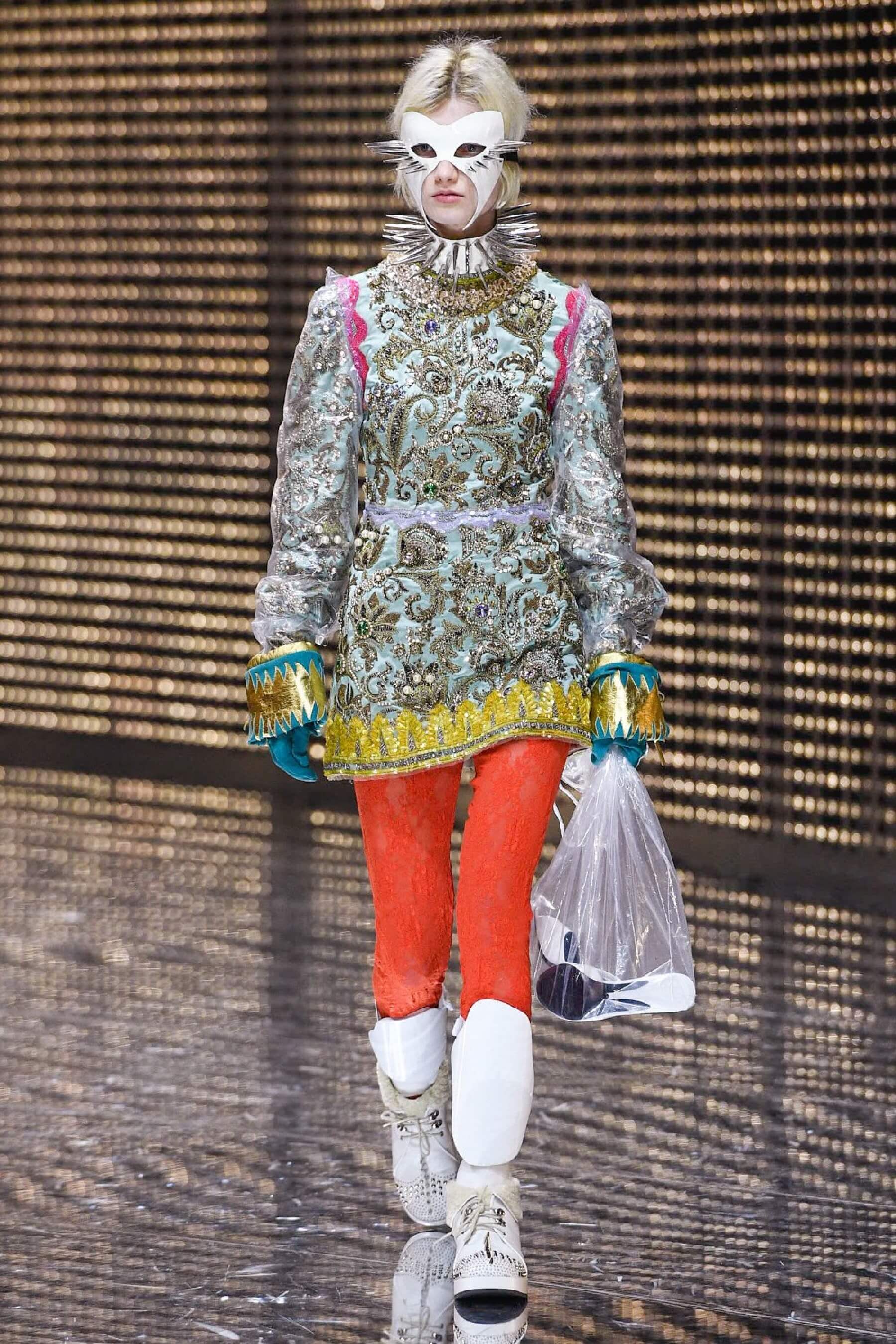 Свою новую (весьма скромную – 87 образов вместо привычных 120) коллекцию для Gucci Алессандро Микеле посвятил античной красоте, фетишизму и маскам, которые олицетворяют дуальность человеческой природы согласно философии Ханны Арендт, чьё мнение созвучно с восприятием самого дизайнера.