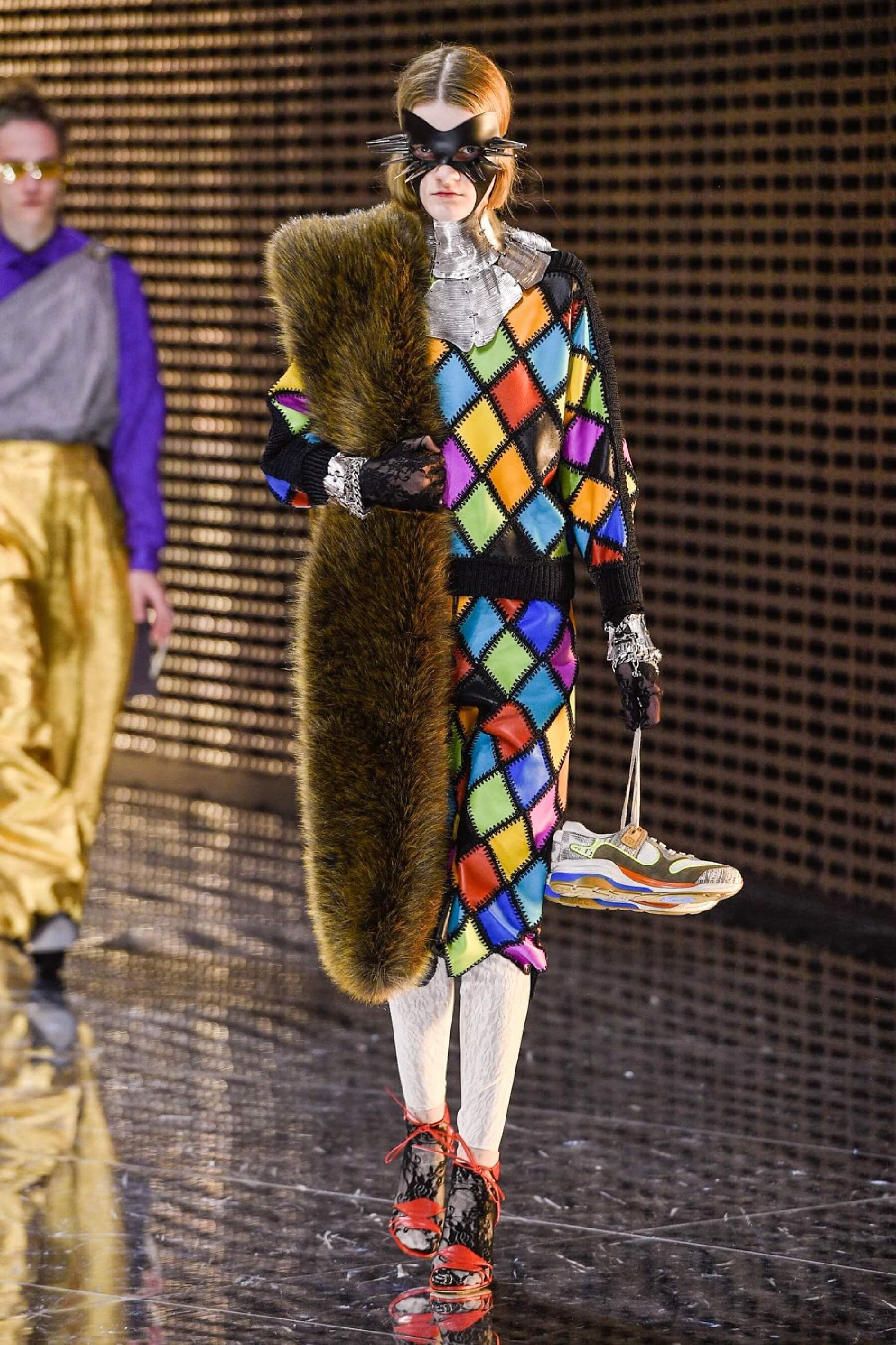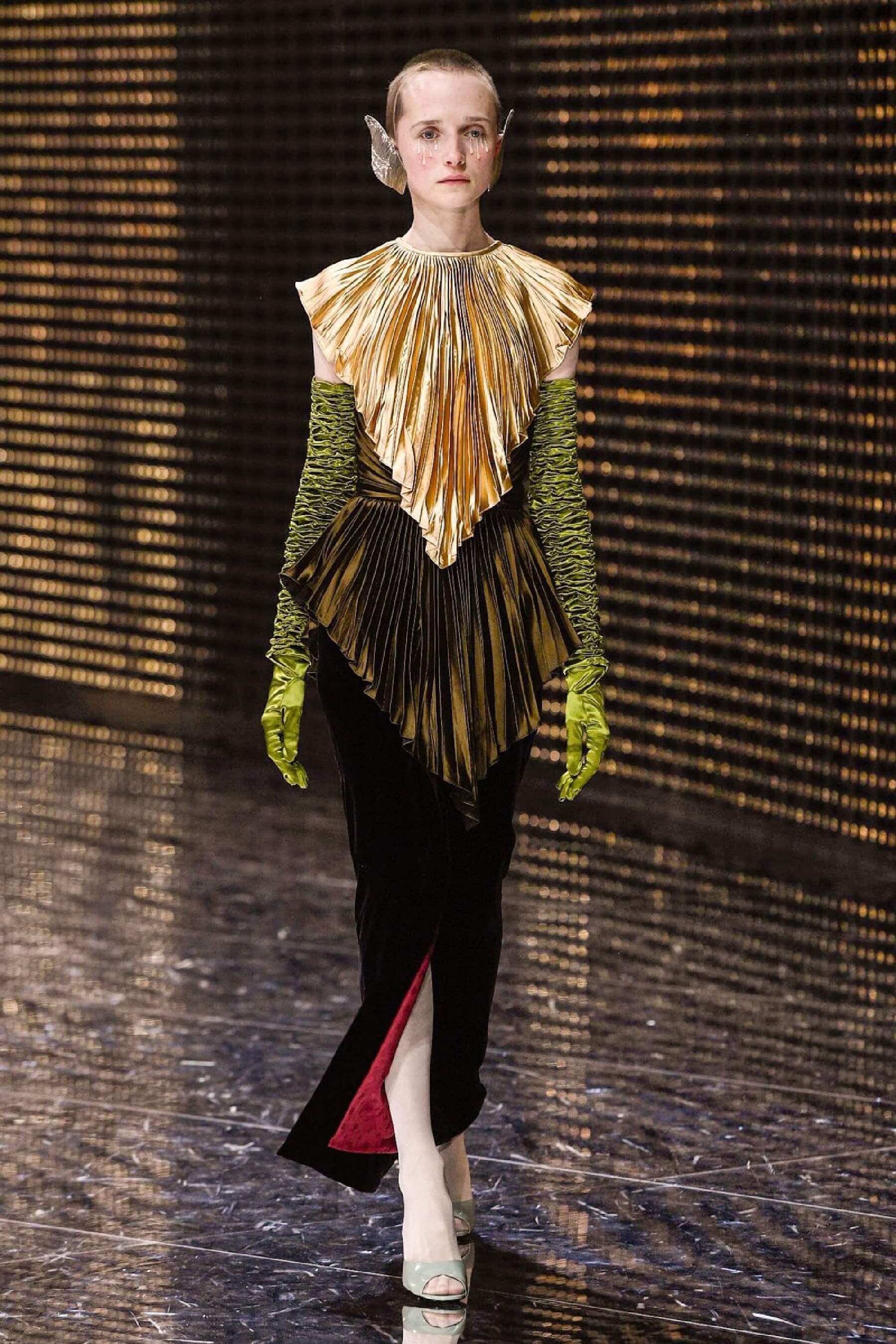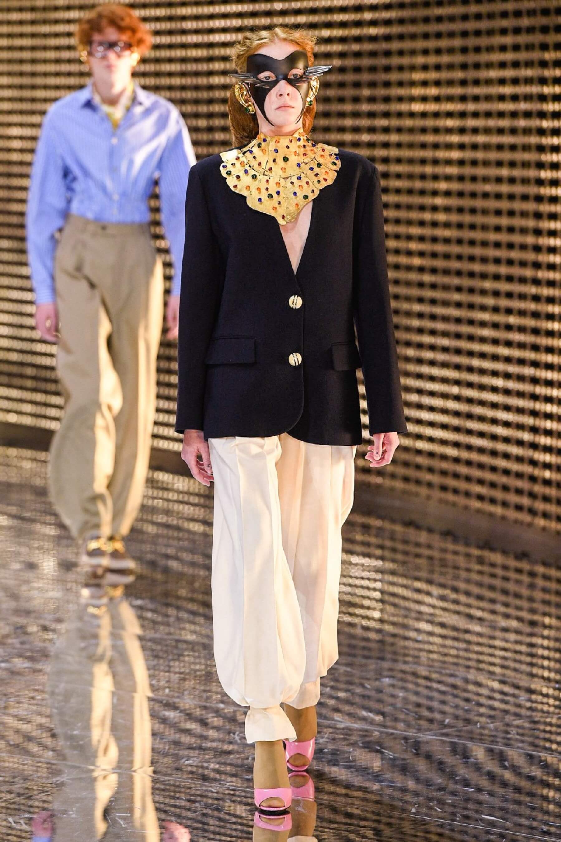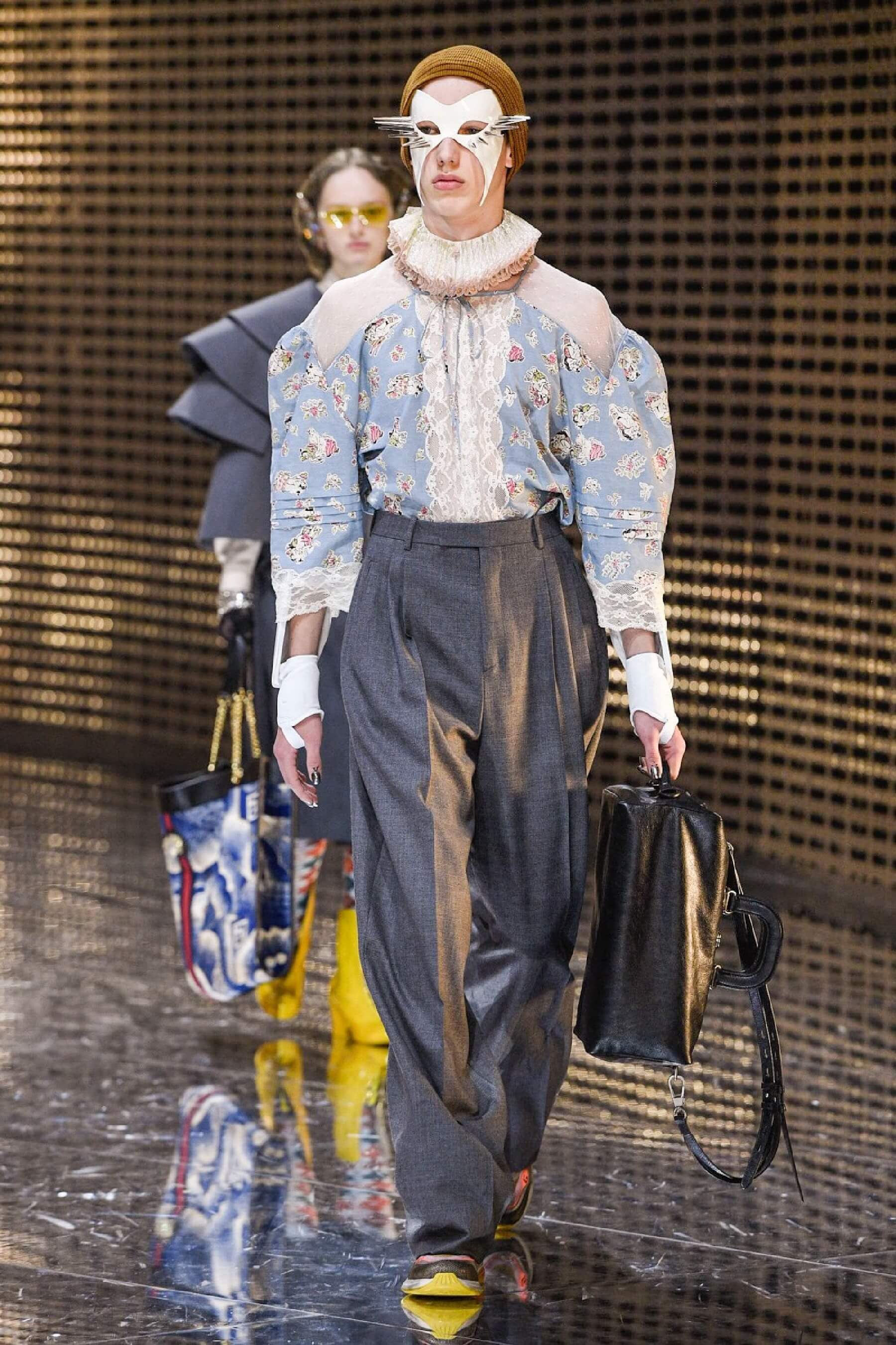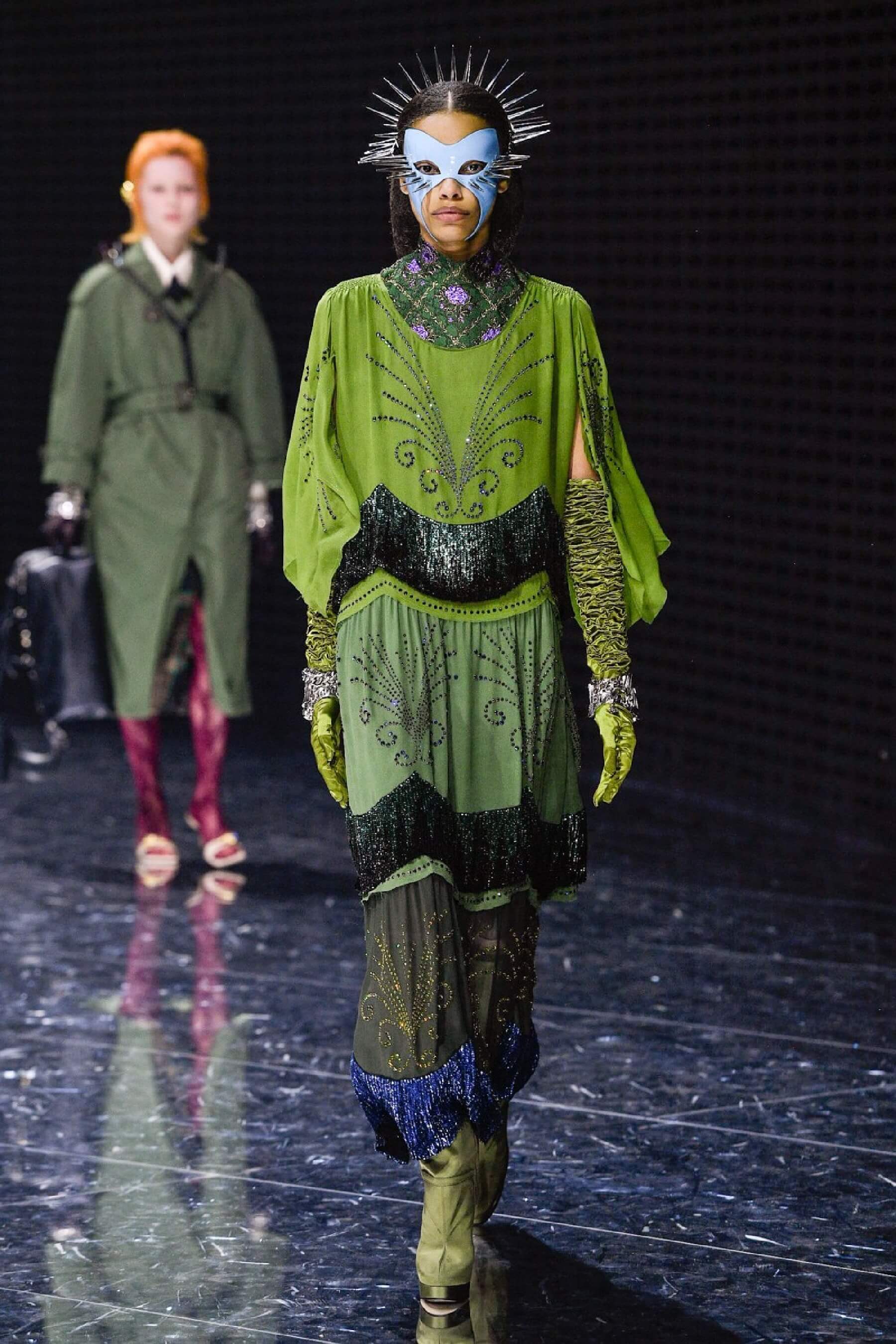 Свою новую (весьма скромную – 87 образов вместо привычных 120) коллекцию для Gucci Алессандро Микеле посвятил античной красоте, фетишизму и маскам, которые олицетворяют дуальность человеческой природы согласно философии Ханны Арендт, чьё мнение созвучно с восприятием самого дизайнера.