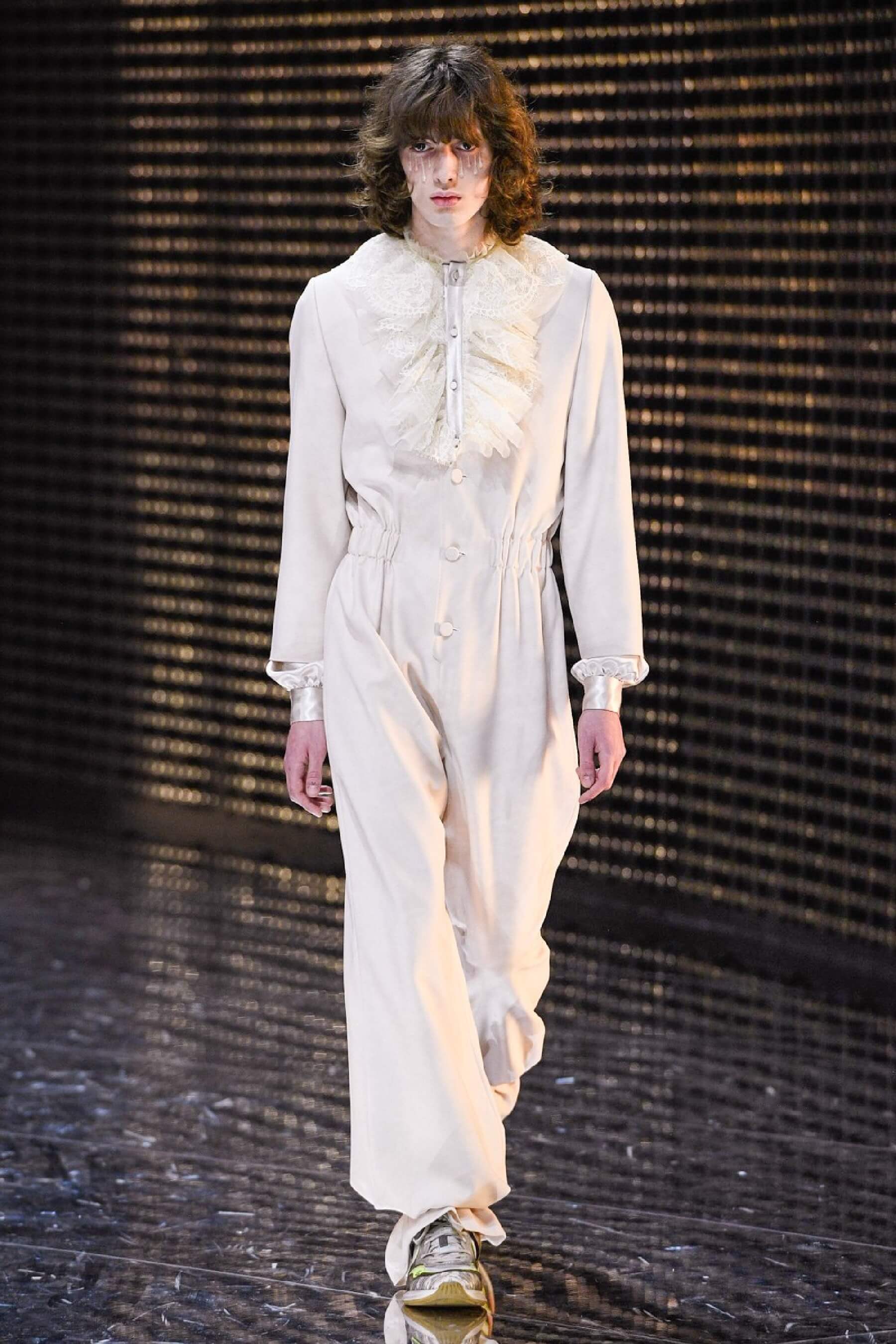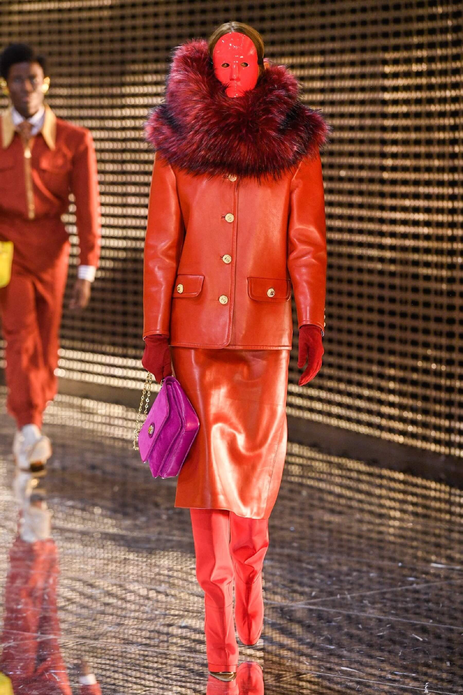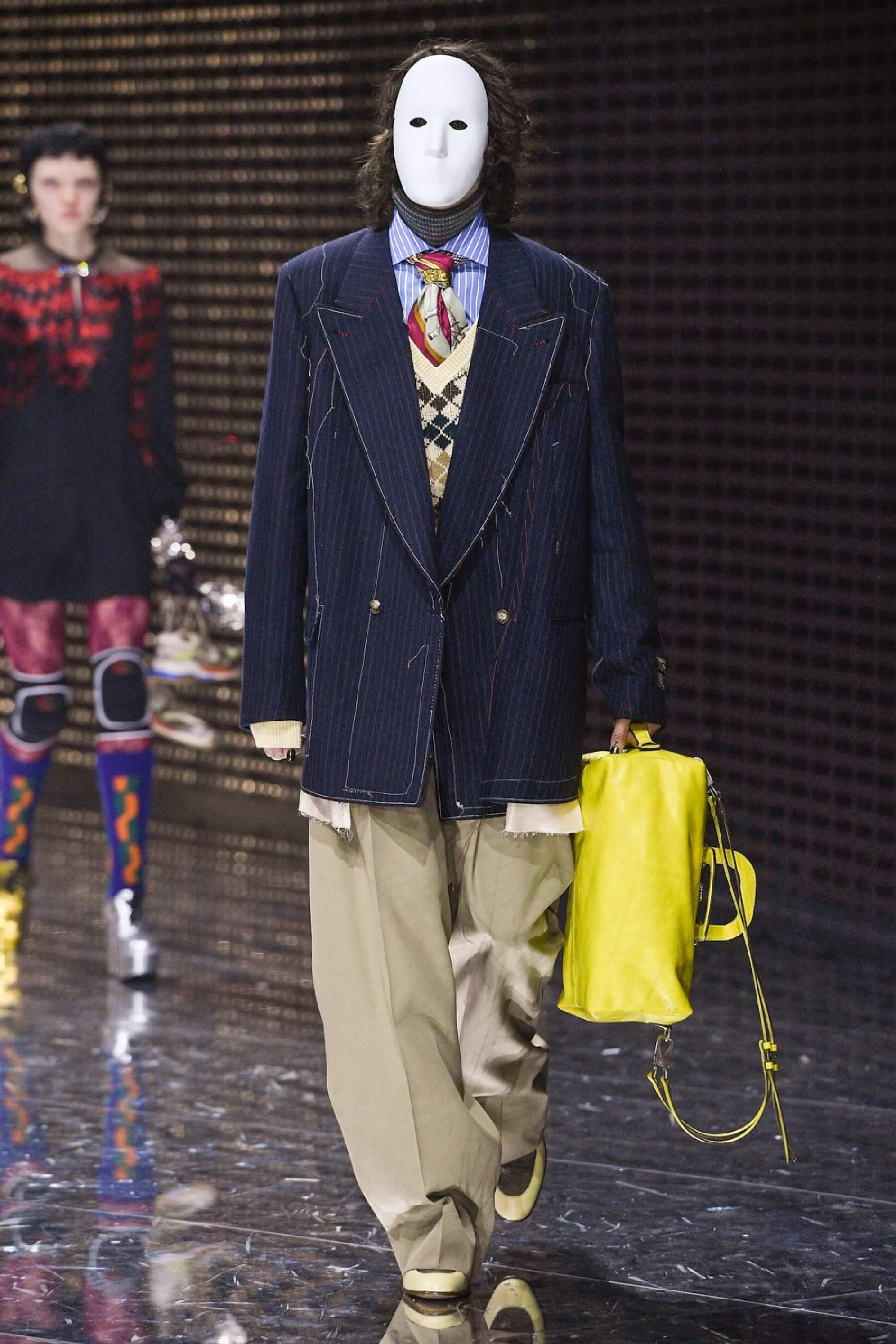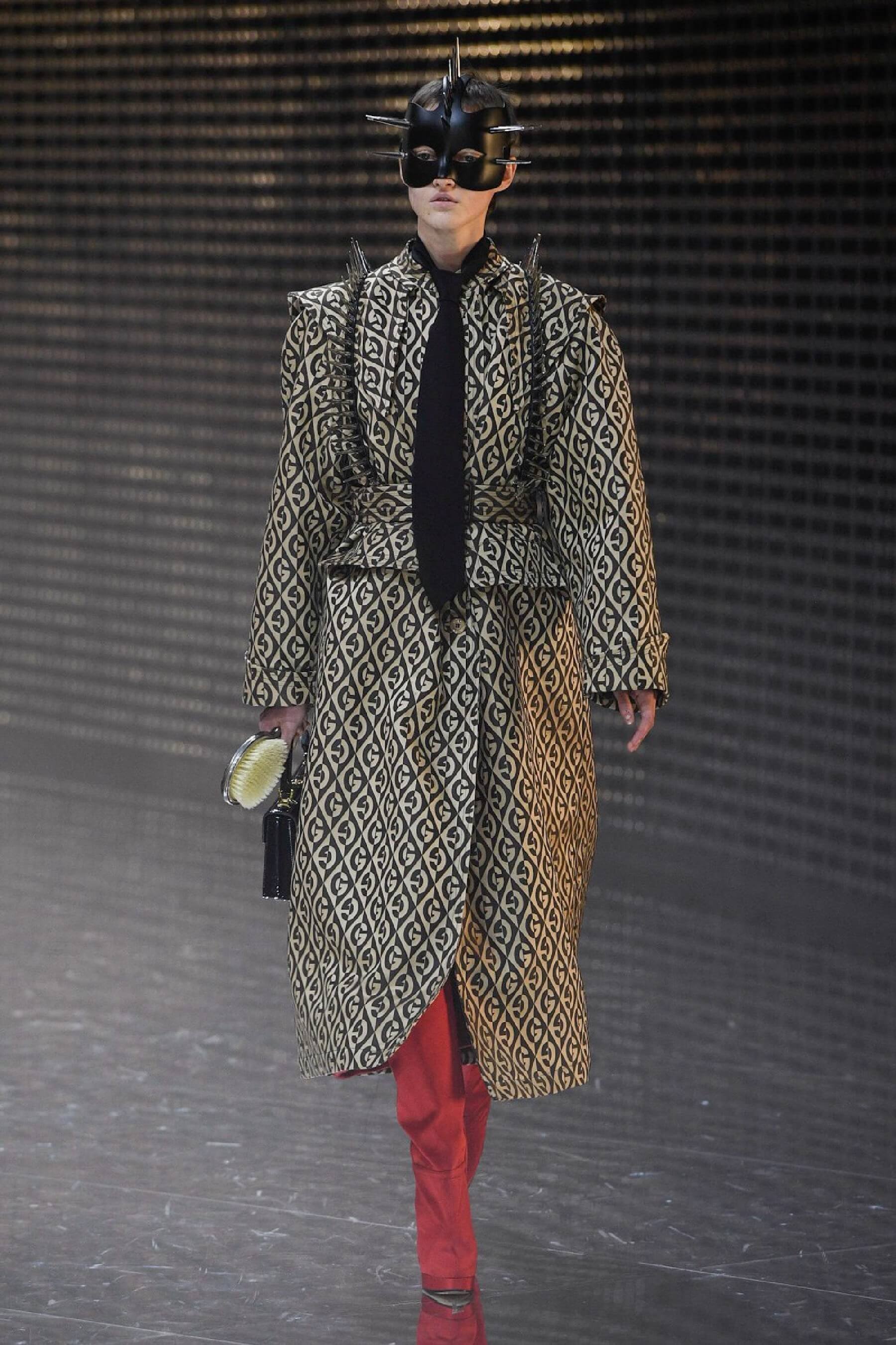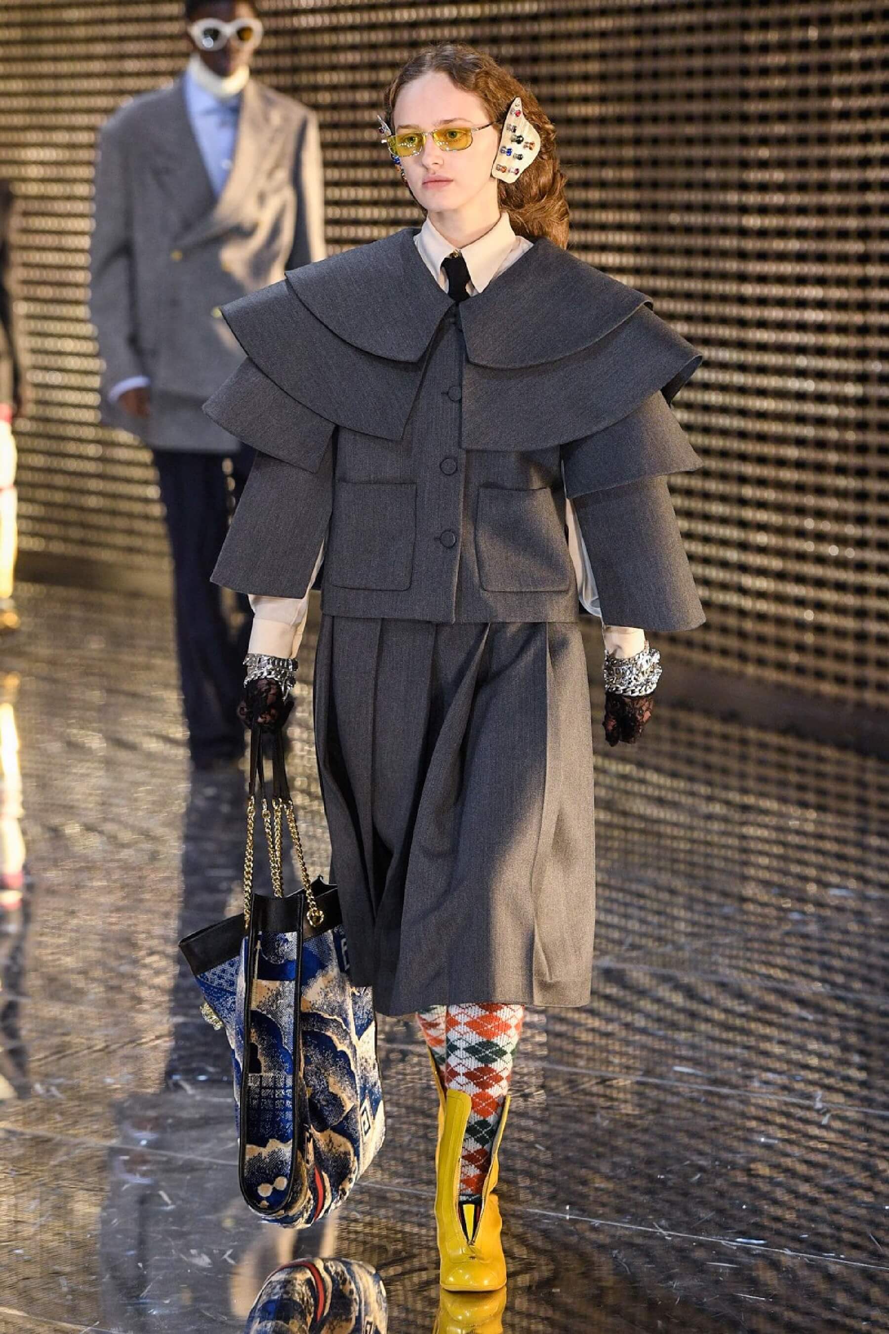 Свою новую (весьма скромную – 87 образов вместо привычных 120) коллекцию для Gucci Алессандро Микеле посвятил античной красоте, фетишизму и маскам, которые олицетворяют дуальность человеческой природы согласно философии Ханны Арендт, чьё мнение созвучно с восприятием самого дизайнера.