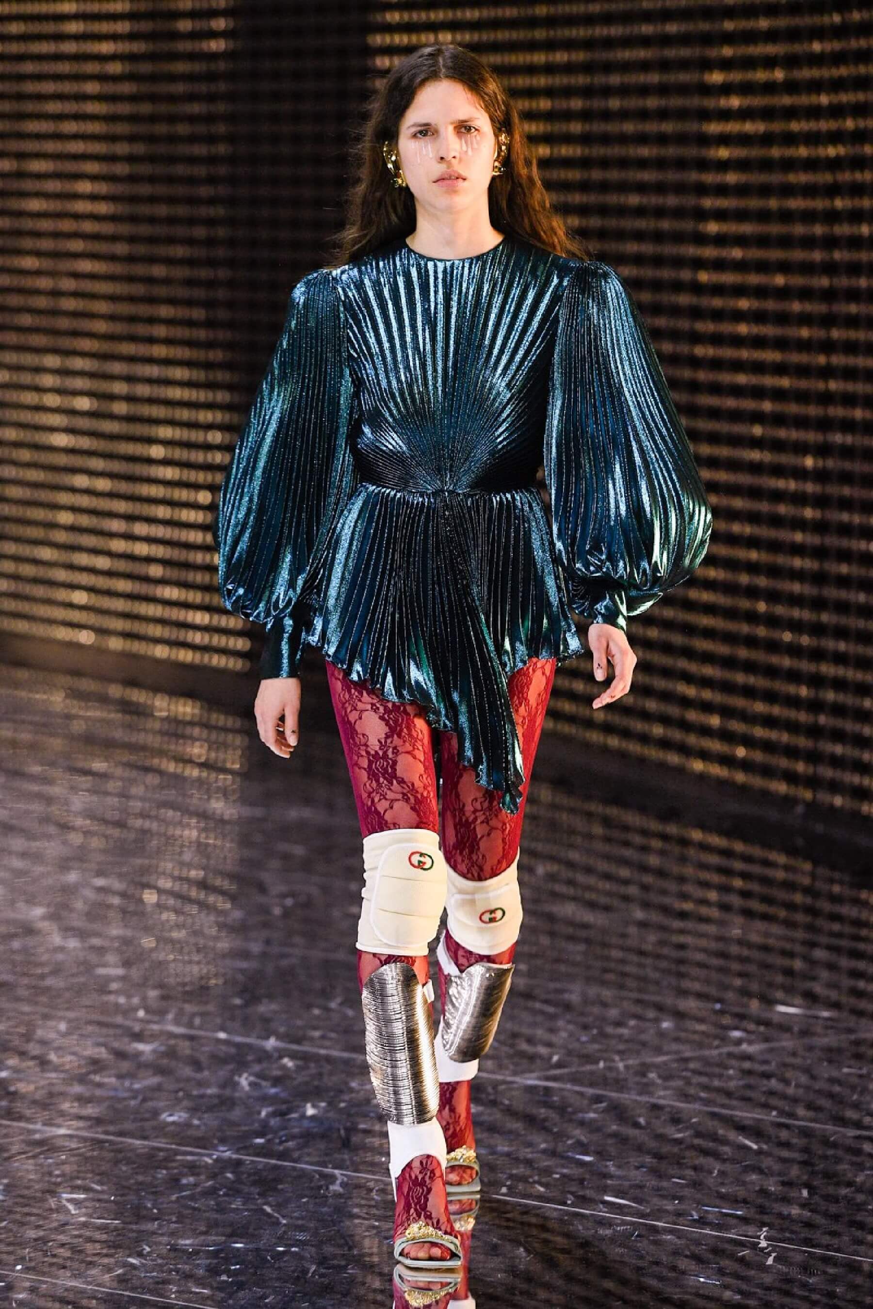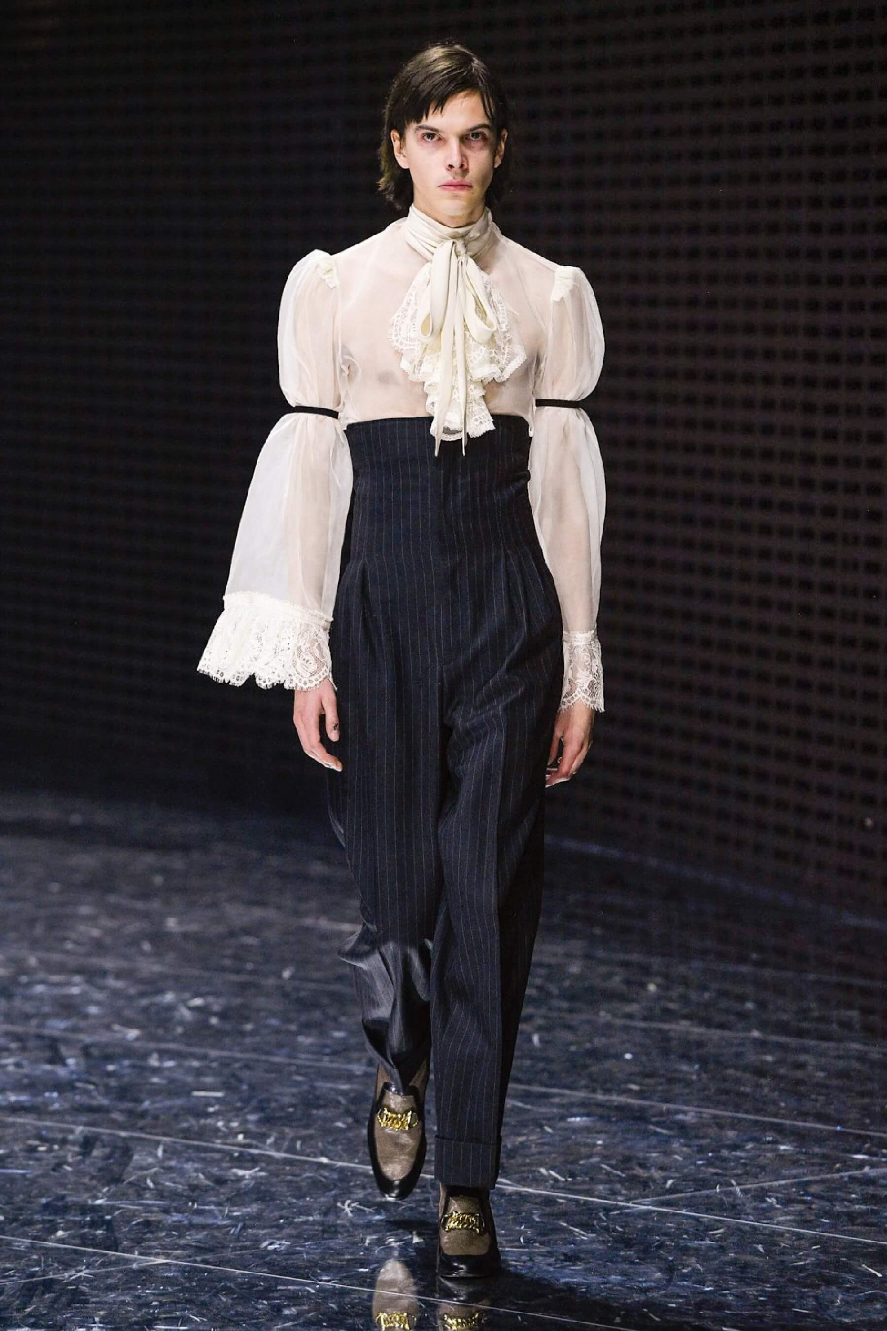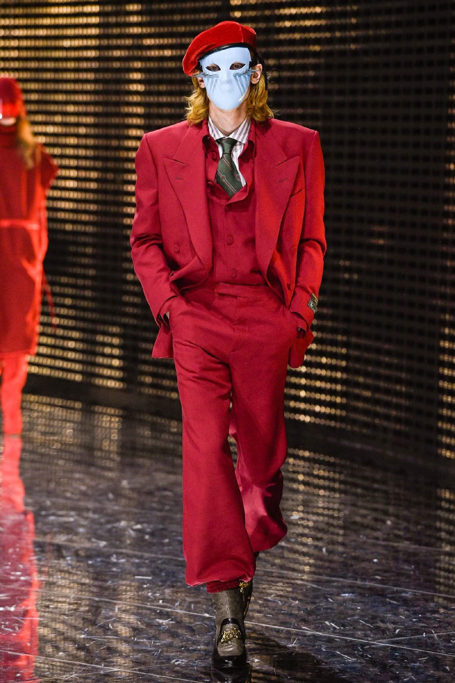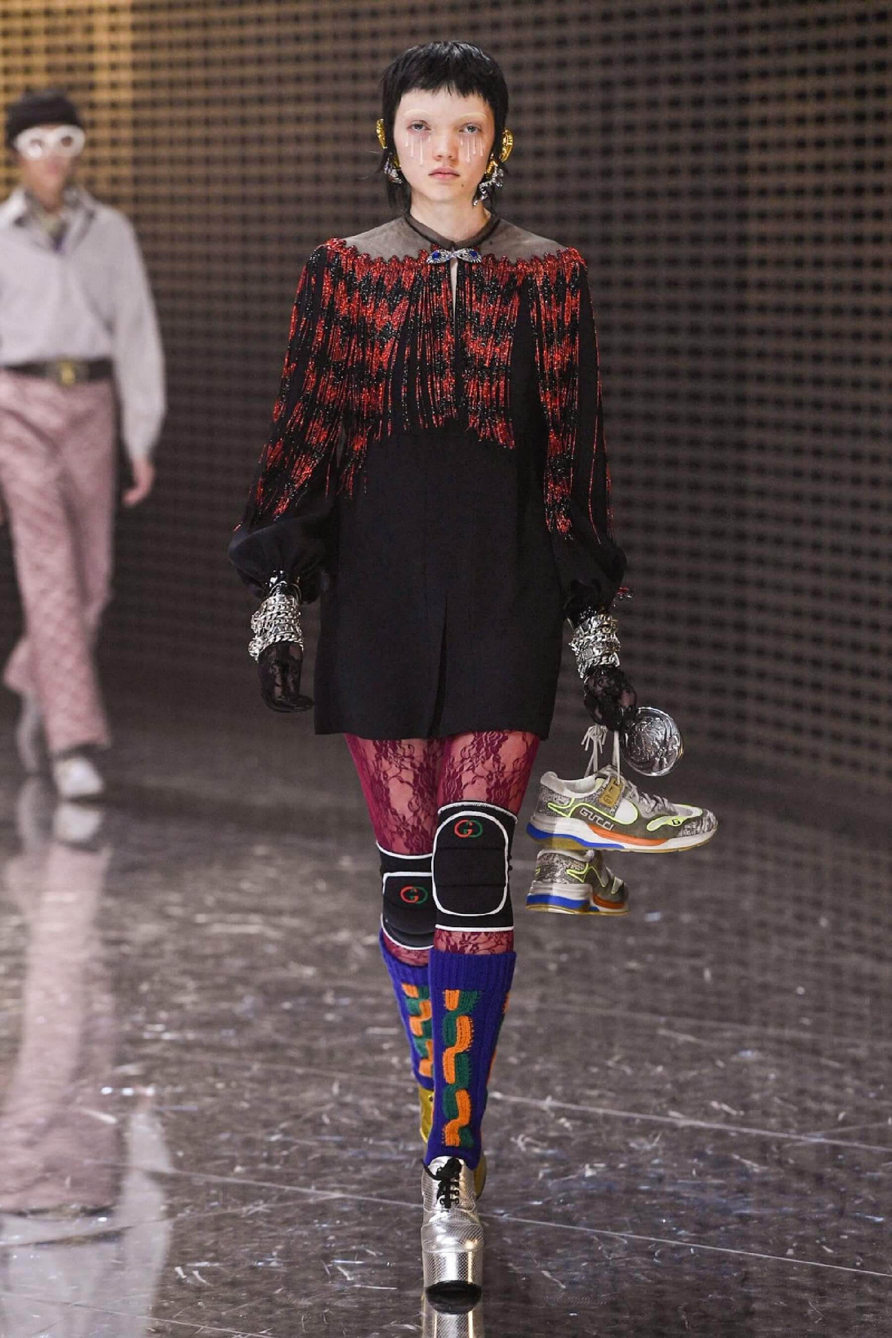 Свою новую (весьма скромную – 87 образов вместо привычных 120) коллекцию для Gucci Алессандро Микеле посвятил античной красоте, фетишизму и маскам, которые олицетворяют дуальность человеческой природы согласно философии Ханны Арендт, чьё мнение созвучно с восприятием самого дизайнера.